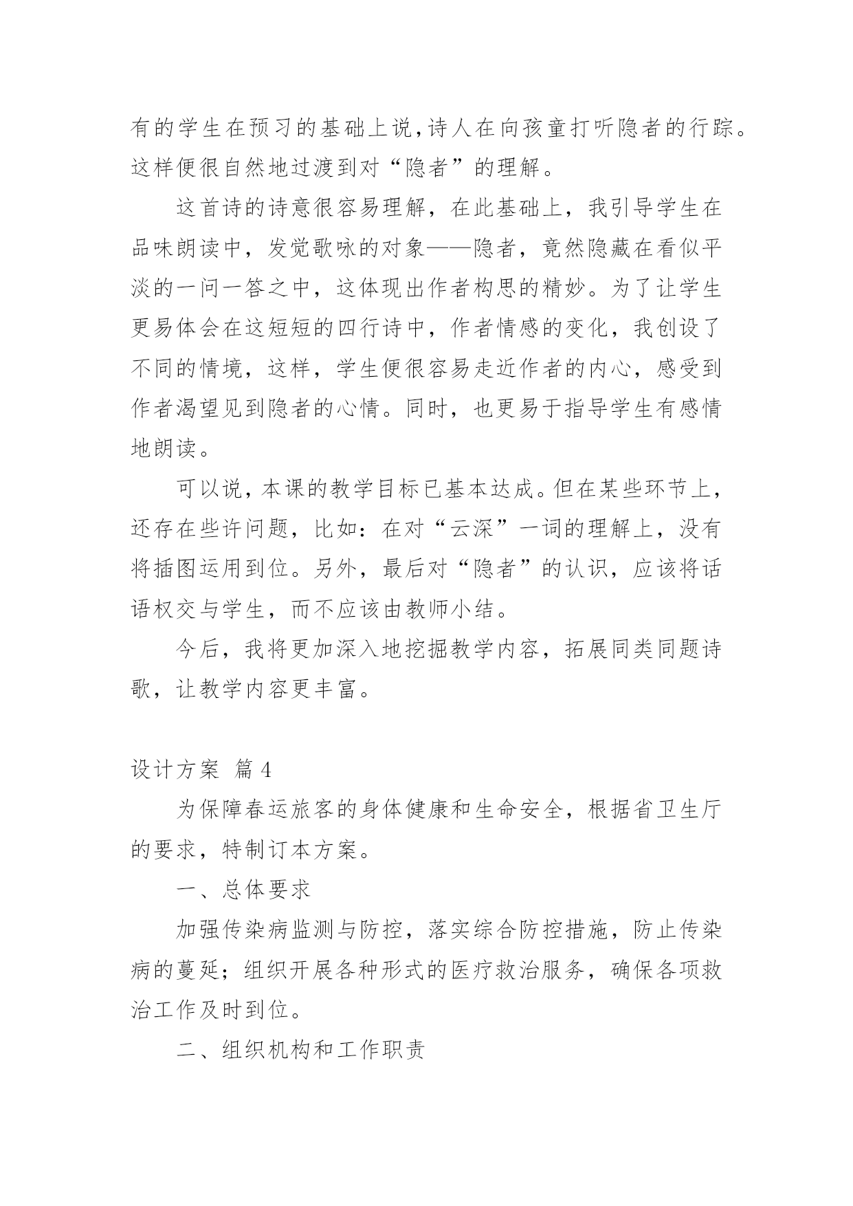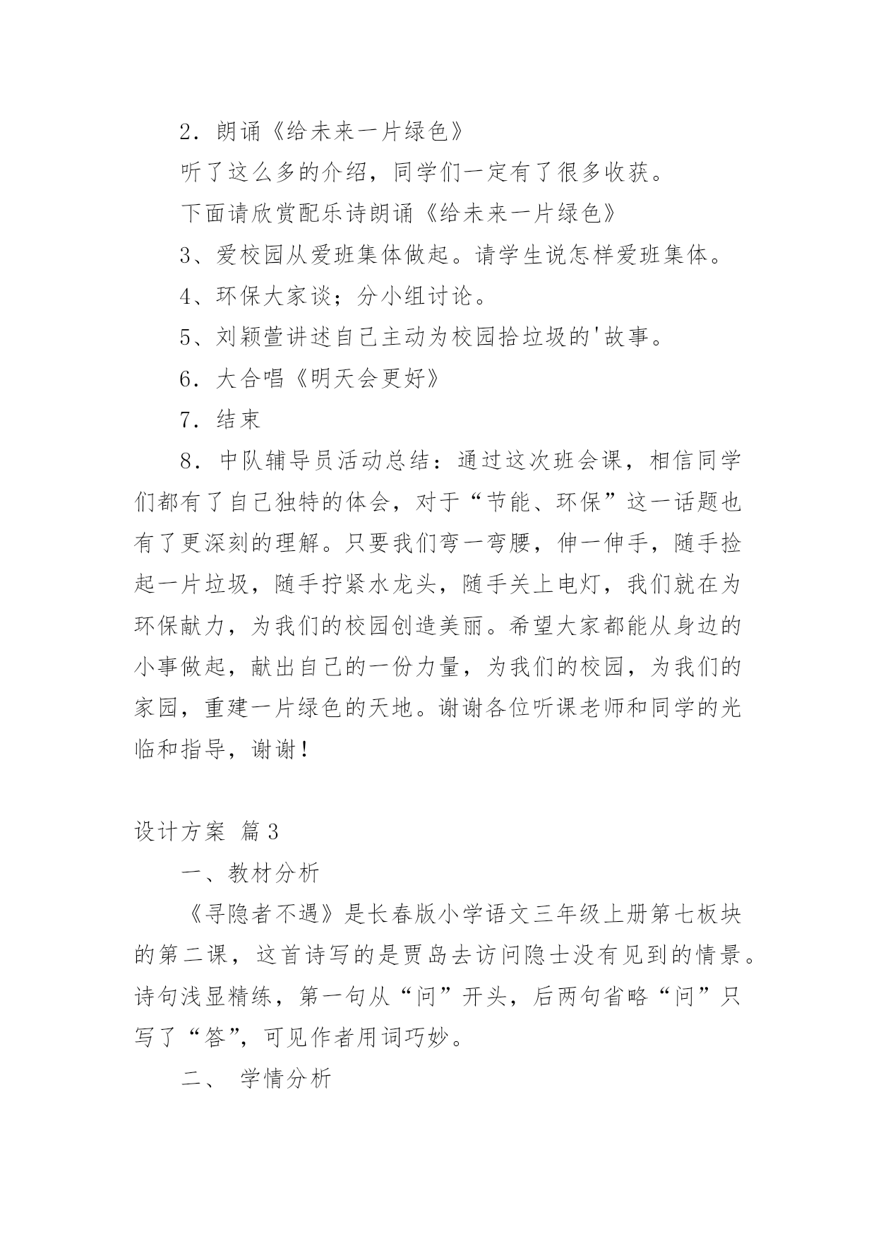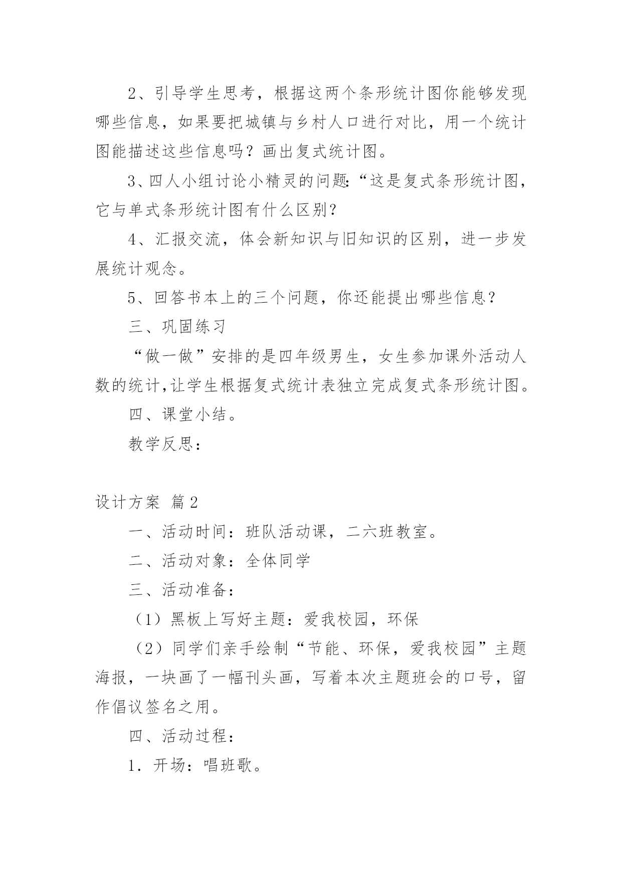 设计方案设计方案[集合]为了保障事情或工作顺利、圆满进行,常常需要提前准备一份具体、详细、针对性强的方案,方案是计划中内容最为复杂的一种。方案应该怎么制定呢?下面是小编精心整理的设计方案8篇,欢迎大家分享。设计方案篇1教学内容:课标实验教材第七册99页例1及相应练习教学目标:1、让学生在已有的知识和经验基础上自主探索复式条形统计图。2、联系实际生活,让学生体会统计的功能。3、培养学生数感。教学过程:一、回顾二年级时学过以一当二的条形统计图,复式统计表与以一当五的`条形统计图,三年级时还学过了两种不种形式的条形统计图与平均数。二、新授1、出示某地区城乡统计表引导学生理解该地区1985年至20xx年每隔5年城乡人口数量变化情况。分别画出2个纵向单式条形统计图。2、引导学生思考,根据这两个条形统计图你能够发现哪些信息,如果要把城镇与乡村人口进行对比,用一个统计图能描述这些信息吗?画出复式统计图。3、四人小组讨论小精灵的问题:“这是复式条形统计图,它与单式条形统计图有什么区别?4、汇报交流,体会新知识与旧知识的区别,进一步发展统计观念。5、回答书本上的三个问题,你还能提出哪些信息?三、巩固练习“做一做”安排的是四年级男生,女生参加课外活动人数的统计,让学生根据复式统计表独立完成复式条形统计图。四、课堂小结。教学反思:设计方案篇2一、活动时间:班队活动课,二六班教室。二、活动对象:全体同学三、活动准备:(1)黑板上写好主题:爱我校园,环保(2)同学们亲手绘制“节能、环保,爱我校园”主题海报,一块画了一幅刊头画,写着本次主题班会的口号,留作倡议签名之用。四、活动过程:1.开场:唱班歌。2.朗诵《给未来一片绿色》听了这么多的介绍,同学们一定有了很多收获。下面请欣赏配乐诗朗诵《给未来一片绿色》3、爱校园从爱班集体做起。请学生说怎样爱班集体。4、环保大家谈;分小组讨论。5、刘颖萱讲述自己主动为校园拾垃圾的'故事。6.大合唱《明天会更好》7.结束8.中队辅导员活动总结:通过这次班会课,相信同学们都有了自己独特的体会,对于“节能、环保”这一话题也有了更深刻的理解。只要我们弯一弯腰,伸一伸手,随手捡起一片垃圾,随手拧紧水龙头,随手关上电灯,我们就在为环保献力,为我们的校园创造美丽。希望大家都能从身边的小事做起,献出自己的一份力量,为我们的校园,为我们的家园,重建一片绿色的天地。谢谢各位听课老师和同学的光临和指导,谢谢!设计方案篇3一、教材分析《寻隐者不遇》是长春版小学语文三年级上册第七板块的第二课,这首诗写的是贾岛去访问隐士没有见到的情景。诗句浅显精练,第一句从“问”开头,后两句省略“问”只写了“答”,可见作者用词巧妙。二、学情分析教学对象是三年级的学生,他们虽然初步掌握了理解古诗的方法,但这首诗每句都有省略,这对学生理解诗句造成一定困难,教师要通过提示帮助学生理解。本班学生好奇心强,为此要创设一定的故事情境来协助教学。三、教学目标知识与技能目标:认识两个生字,能正确流利有感情地朗读古诗并背诵,理解重点字词,进而理解诗意。培养学生想象能力,把诗的语言转化成生动形象画面,会用自己语言讲述。过程与方法目标:随文识字,鼓励用多种方法识记生字,引导学生通过合作交流解决问题,鼓励学生朗读、感悟、想象,进而使学生在头脑中再现画面。情感态度价值观目标:理解诗意,体会诗人感情变化。四、教学策略本首古诗诗句自然质朴,通俗明快,为此在教学中努力渲染诗境,在教师生动的故事情境描述中、在古典的乐曲演奏中,学生随同教师一起走进文本、一起探索感悟文本。由于三年级学生自主学习能力差,为此在理解古诗时我采用合作探究的方式,不仅可培养学生合作意识,更能达到预期目标。为更深一步感悟古诗内容、意境、情感,我鼓励学生大胆想象、大胆填说,再现画面、大胆吟诵,再悟情感,进而升华情感,给学生一种身临其境之感。五、教学准备1、教学环境:多媒体环境。2、资源准备:自制教学课件。六、教学过程(一)、谈话导入1、同学们,长大后想做一个什么样的人?(教师针对不同的价值观进行评价)老师今天向大家介绍一种人----隐者(板书隐者)2、体会隐者含义请学生自由谈对隐者的理解。可以结合注释,教师适时引导。(隐者一般隐居在风景优美、环境幽雅的深山中。一般是有学问有品德的人。3、引出诗人有一位大诗人要寻找一位隐者(板书寻)。大家知道他是谁吗?板书贾岛。(指生介绍诗人)教师:贾岛是一个读书刻苦的人,但经过几年都没考中,他心想一定是自己在某一方面做的不好,于是要请教高人。有一天他打听到大山深处住着一位以采药为生的高隐士这位隐士很有学问,正是贾岛要找的人,于是他打听好住址准备好干粮,上了路。(二)、展开想象,创设诗境。教师一边播放优美民乐及山水图片,一边叙述引导学生进入情境。(三)、初读古诗,明诗意。过渡:我们随同贾岛跋
