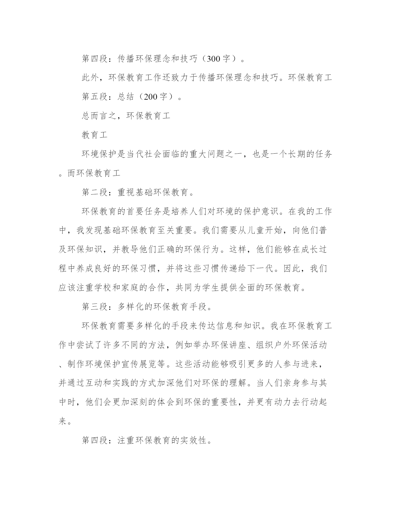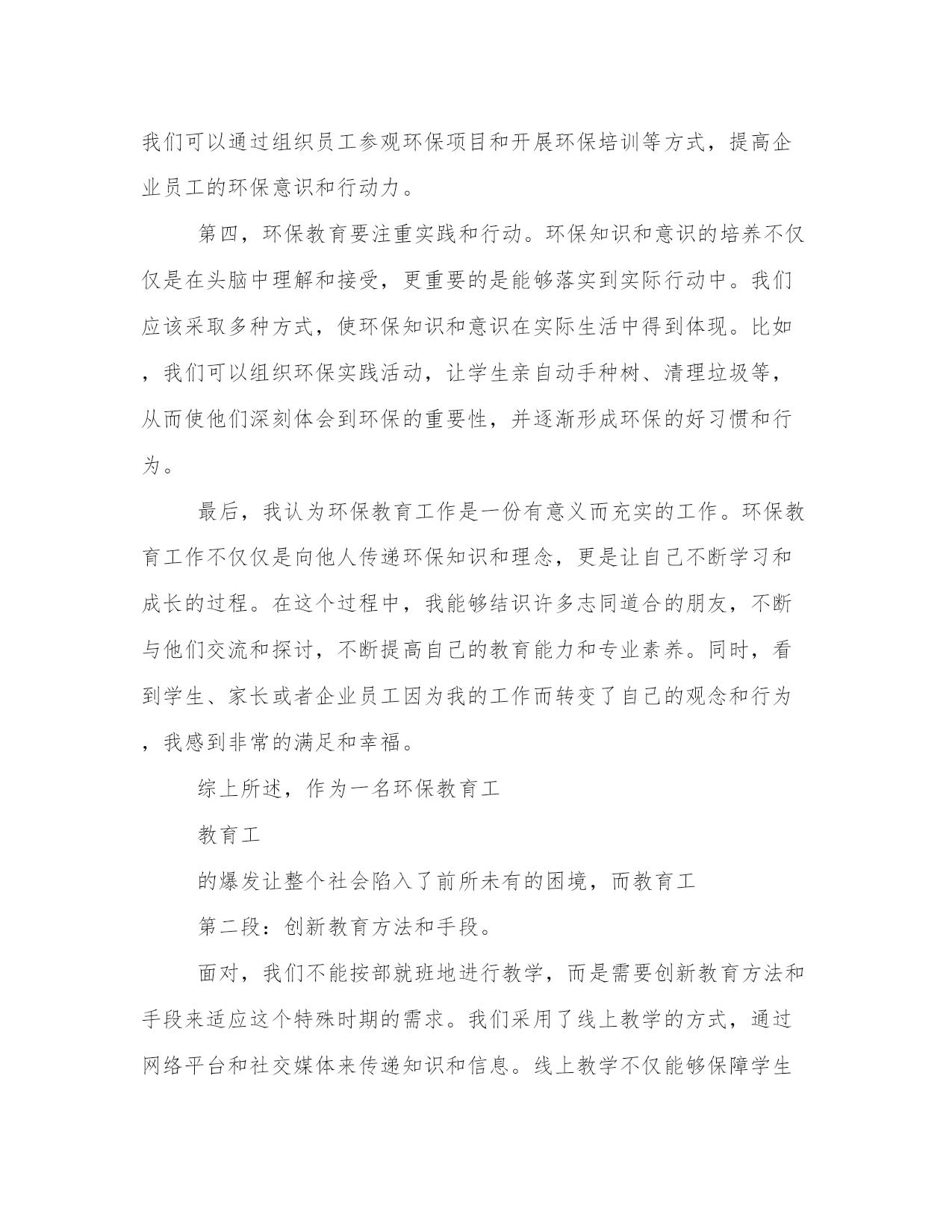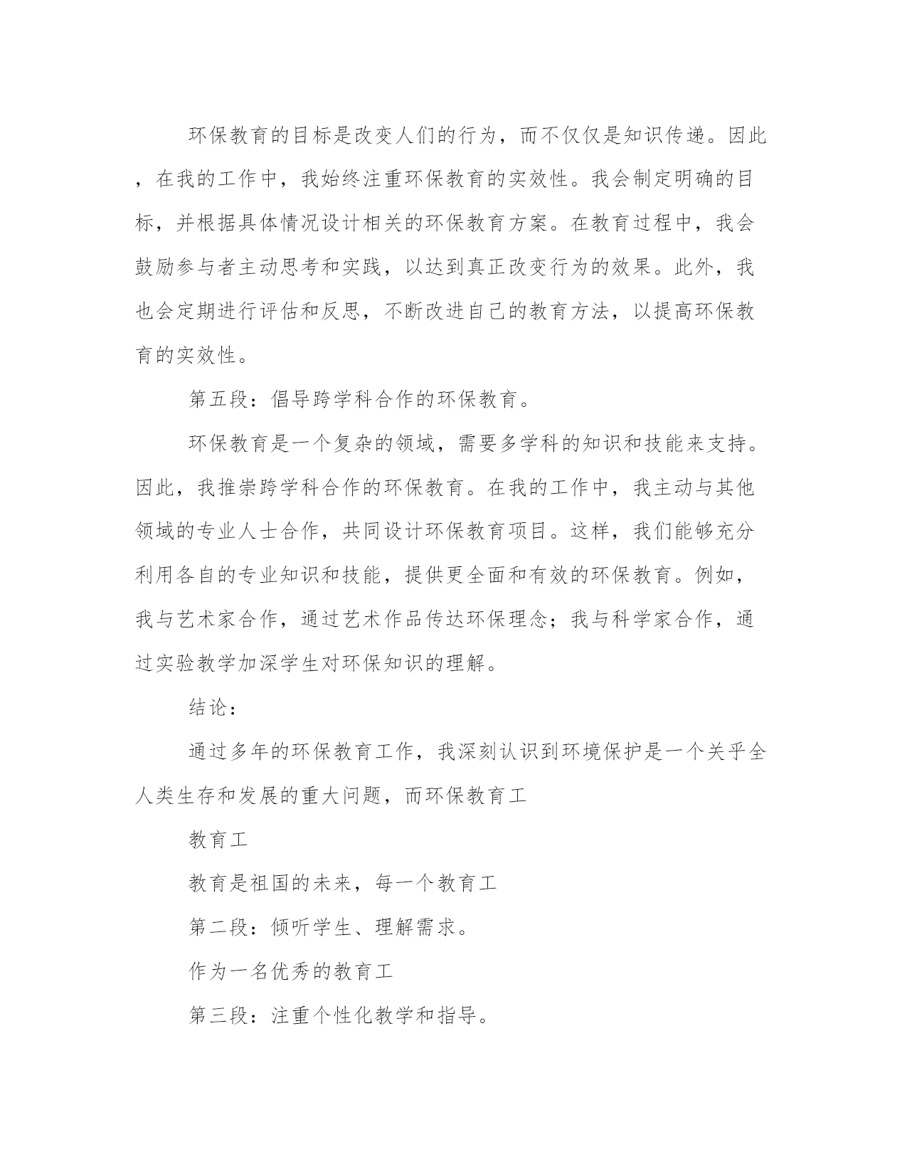 教育工作者的教师工作心得(模板15篇)思考和总结,是对自己成长的一种责任和尊重。写总结要注意语言的准确性和表达的精炼性。接下来为大家呈现一些精选总结范文,欢迎大家一起来借鉴和学习。教育工随着环境问题的日益突出,环保教育成为了社会发展的重要一环。作为环保教育工首先,环保教育工作是长期而艰巨的。环保涉及到人类的生存与发展,它不是一时一刻就能收到明显效果的工作。我们需要通过开展系列的活动和项目,来激发大众的环保意识和行动力。这需要我们付出长时间的努力,并且持之以恒。在这个过程中,我们不可避免地会面临挫折和瓶颈,但只要我们坚定信念,不断努力,就一定能够取得成果。其次,环保教育工作需要多方合作。环保问题是一个系统性的问题,它需要社会各方的共同努力才能解决。作为环保教育工第三,有效的环保教育需要针对不同对象定制。不同的人有不同的认知水平和行为习惯,因此我们不能一刀切地将相同的教育方法应用于所有的对象中。我们需要根据受众的特点,精心设计符合其需求和接受程度的教育内容和方式。比如,在学校里,我们可以通过课堂讲座和实地考察等方式,向学生灌输环保知识和意识;而在企业里,我们可以通过组织员工参观环保项目和开展环保培训等方式,提高企业员工的环保意识和行动力。第四,环保教育要注重实践和行动。环保知识和意识的培养不仅仅是在头脑中理解和接受,更重要的是能够落实到实际行动中。我们应该采取多种方式,使环保知识和意识在实际生活中得到体现。比如,我们可以组织环保实践活动,让学生亲自动手种树、清理垃圾等,从而使他们深刻体会到环保的重要性,并逐渐形成环保的好习惯和行为。最后,我认为环保教育工作是一份有意义而充实的工作。环保教育工作不仅仅是向他人传递环保知识和理念,更是让自己不断学习和成长的过程。在这个过程中,我能够结识许多志同道合的朋友,不断与他们交流和探讨,不断提高自己的教育能力和专业素养。同时,看到学生、家长或者企业员工因为我的工作而转变了自己的观念和行为,我感到非常的满足和幸福。综上所述,作为一名环保教育工教育工的爆发让整个社会陷入了前所未有的困境,而教育工第二段:创新教育方法和手段。面对,我们不能按部就班地进行教学,而是需要创新教育方法和手段来适应这个特殊时期的需求。我们采用了线上教学的方式,通过网络平台和社交媒体来传递知识和信息。线上教学不仅能够保障学生的学习进度,还可以避免人员聚集,减少传染风险。同时,我们也积极探索线上互动教学的方式,让学生在家中感受到课堂的温暖和交流的乐趣。第三段:提高教育内容的实效性和针对性。在抗疫教育中,只有提高教育内容的实效性和针对性,才能更好地为学生服务。我们对的最新动态进行了及时的收集和整理,并将其融入到教育内容中,让学生了解的发展和应对措施。同时,我们还针对不同年龄段的学生,量身定制了相应的教育方案,让他们能够更好地理解和应对当前的状况。通过提供实用的知识和技巧,我们帮助学生提高了应对的能力和意识。第四段:加强心理辅导和关爱服务。给学生的心理健康带来了很大的冲击,而作为教育工第五段:总结与展望。通过抗疫教育工作,我们深刻体会到教育工(注:本文为AI生成文章,仅供参考。)。教育工现代社会,教育工教育工虽然教育工虽然教育工作为社会的一员,我们要关注教育工第五段:结语。教育工教育工第一段:引言(100字)。出处FaNWen.CHaZIdiAN.COm环保教育工作,被广大群众认为是一项重要的任务。作为一名环保教育工第二段:提出环境问题的重要性(200字)。首先,我认为环保教育工作的重要性在于提醒人们关注环境问题。随着工业化的发展和人口的增加,环境问题成为我们现代社会亟待解决的重要问题。然而,由于经济发展的驱动,很多人对环境问题的认识还停留在表面,甚至完全忽视了环境的重要性。环保教育工作通过向学生和社区居民宣传环境问题,鼓励他们采取行动保护环境,从而提高人们对环境问题的意识和重视程度。第三段:培养环境保护意识和行动(300字)。其次,环保教育工作的目标之一是培养人们的环保意识和行动。通过在学校开展环保教育课程、社区举办环保活动等形式,使学生和社区居民了解环境问题,学习环保知识,并鼓励他们主动采取行动保护环境。在我多年的工作中,我发现通过直接的实践活动,如植树、垃圾分类和节约用水等,可以增强学生和社区居民的环保意识,并改变他们的行为习惯,形成良好的环保习惯。第四段:传播环保理念和技巧(300字)。此外,环保教育工作还致力于传播环保理念和技巧。环保教育工第五段:总结(200字)。总而言之,环保教育工教育工环境保护是当代社会面临的重大问题之一,也是一个长期的任务。而环保教育工第二段:重视基础环保教育。环保教育的首要任务是培养人们对环境的保护意识。在我的
