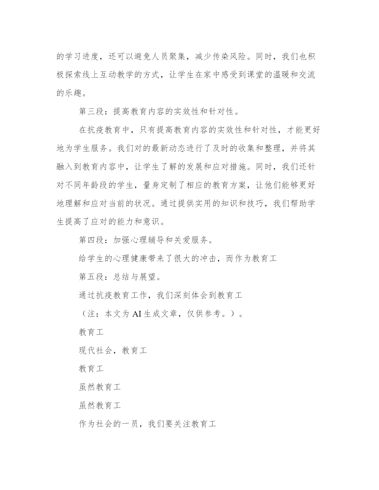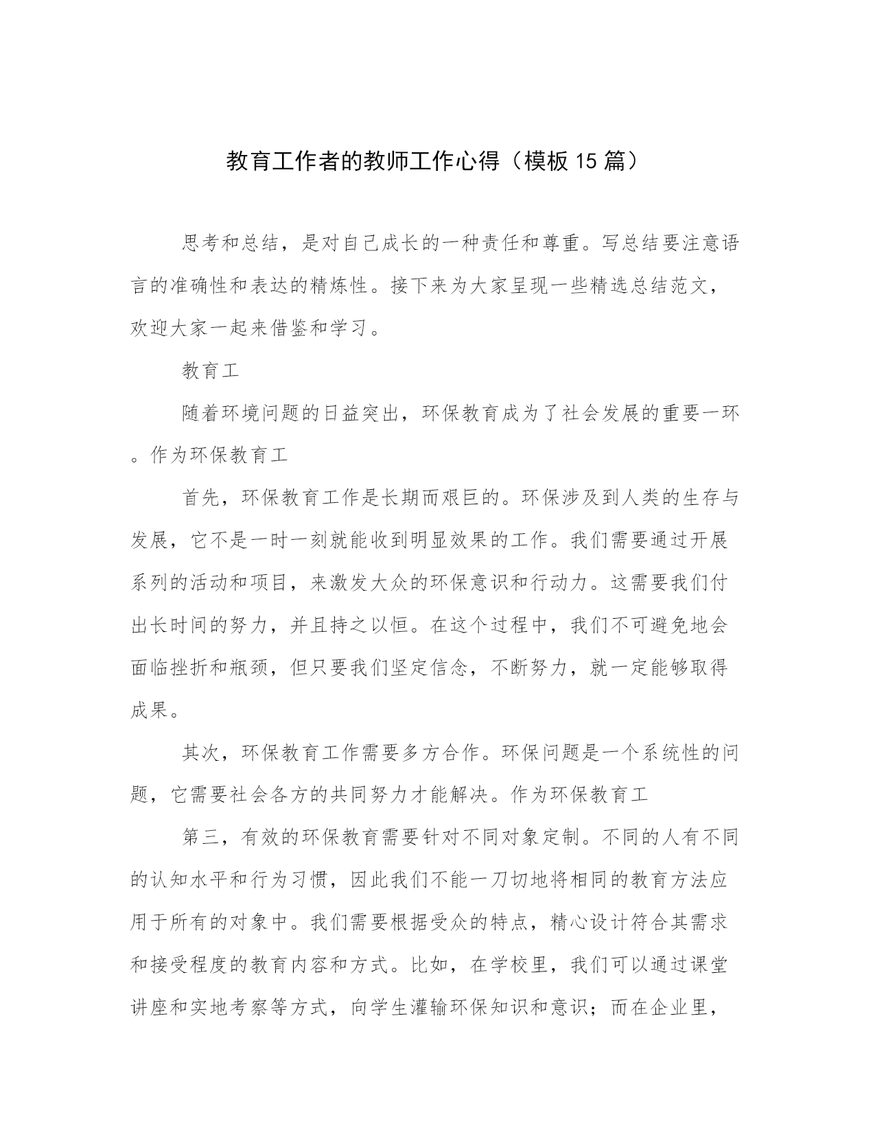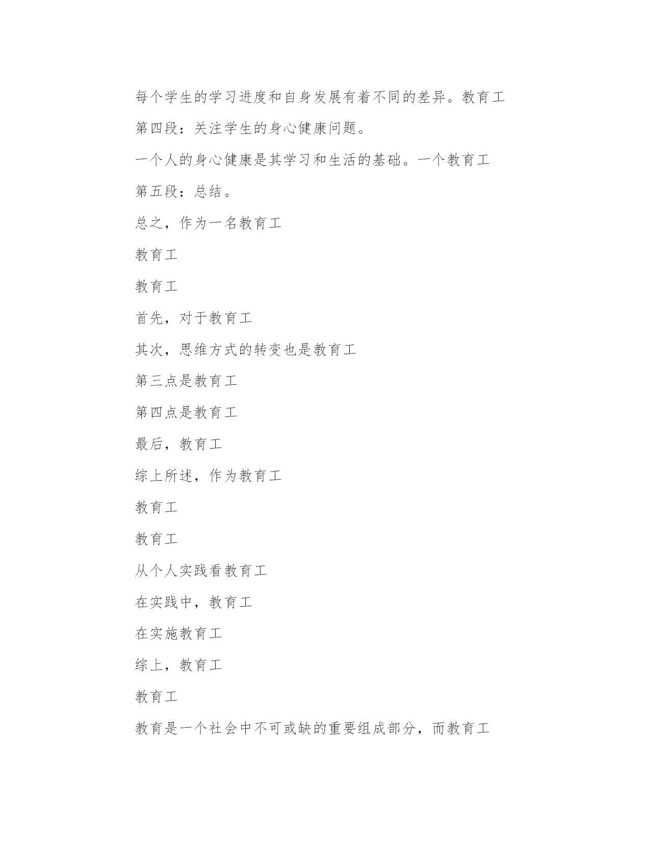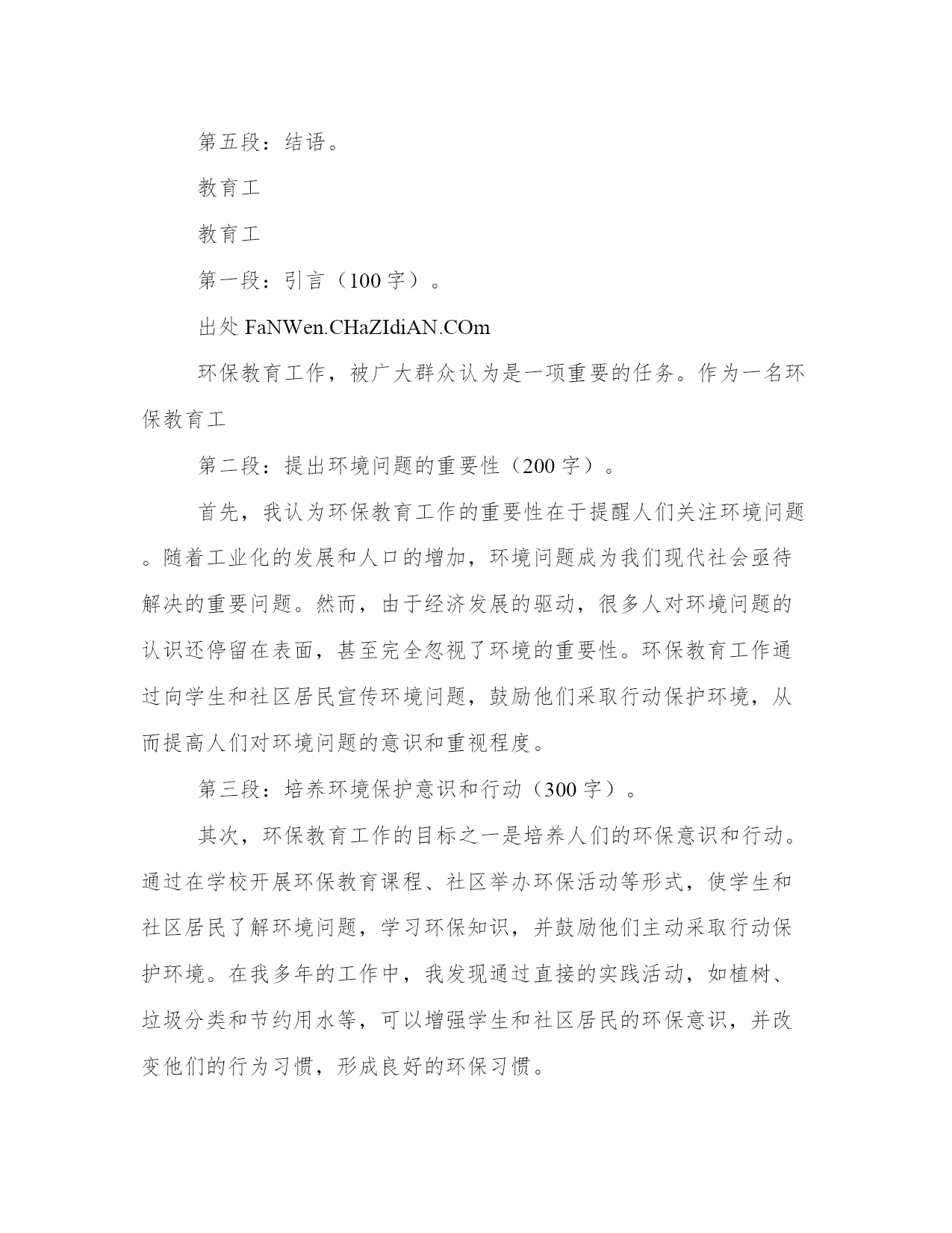 教育工作者的教师工作心得(模板15篇)思考和总结,是对自己成长的一种责任和尊重。写总结要注意语言的准确性和表达的精炼性。接下来为大家呈现一些精选总结范文,欢迎大家一起来借鉴和学习。教育工随着环境问题的日益突出,环保教育成为了社会发展的重要一环。作为环保教育工首先,环保教育工作是长期而艰巨的。环保涉及到人类的生存与发展,它不是一时一刻就能收到明显效果的工作。我们需要通过开展系列的活动和项目,来激发大众的环保意识和行动力。这需要我们付出长时间的努力,并且持之以恒。在这个过程中,我们不可避免地会面临挫折和瓶颈,但只要我们坚定信念,不断努力,就一定能够取得成果。其次,环保教育工作需要多方合作。环保问题是一个系统性的问题,它需要社会各方的共同努力才能解决。作为环保教育工第三,有效的环保教育需要针对不同对象定制。不同的人有不同的认知水平和行为习惯,因此我们不能一刀切地将相同的教育方法应用于所有的对象中。我们需要根据受众的特点,精心设计符合其需求和接受程度的教育内容和方式。比如,在学校里,我们可以通过课堂讲座和实地考察等方式,向学生灌输环保知识和意识;而在企业里,我们可以通过组织员工参观环保项目和开展环保培训等方式,提高企业员工的环保意识和行动力。第四,环保教育要注重实践和行动。环保知识和意识的培养不仅仅是在头脑中理解和接受,更重要的是能够落实到实际行动中。我们应该采取多种方式,使环保知识和意识在实际生活中得到体现。比如,我们可以组织环保实践活动,让学生亲自动手种树、清理垃圾等,从而使他们深刻体会到环保的重要性,并逐渐形成环保的好习惯和行为。最后,我认为环保教育工作是一份有意义而充实的工作。环保教育工作不仅仅是向他人传递环保知识和理念,更是让自己不断学习和成长的过程。在这个过程中,我能够结识许多志同道合的朋友,不断与他们交流和探讨,不断提高自己的教育能力和专业素养。同时,看到学生、家长或者企业员工因为我的工作而转变了自己的观念和行为,我感到非常的满足和幸福。综上所述,作为一名环保教育工教育工的爆发让整个社会陷入了前所未有的困境,而教育工第二段:创新教育方法和手段。面对,我们不能按部就班地进行教学,而是需要创新教育方法和手段来适应这个特殊时期的需求。我们采用了线上教学的方式,通过网络平台和社交媒体来传递知识和信息。线上教学不仅能够保障学生的学习进度,还可以避免人员聚集,减少传染风险。同时,我们也积极探索线上互动教学的方式,让学生在家中感受到课堂的温暖和交流的乐趣。第三段:提高教育内容的实效性和针对性。在抗疫教育中,只有提高教育内容的实效性和针对性,才能更好地为学生服务。我们对的最新动态进行了及时的收集和整理,并将其融入到教育内容中,让学生了解的发展和应对措施。同时,我们还针对不同年龄段的学生,量身定制了相应的教育方案,让他们能够更好地理解和应对当前的状况。通过提供实用的知识和技巧,我们帮助学生提高了应对的能力和意识。第四段:加强心理辅导和关爱服务。给学生的心理健康带来了很大的冲击,而作为教育工第五段:总结与展望。通过抗疫教育工作,我们深刻体会到教育工(注:本文为AI生成文章,仅供参考。)。教育工现代社会,教育工教育工虽然教育工虽然教育工作为社会的一员,我们要关注教育工第五段:结语。教育工教育工第一段:引言(100字)。出处FaNWen.CHaZIdiAN.COm环保教育工作,被广大群众认为是一项重要的任务。作为一名环保教育工第二段:提出环境问题的重要性(200字)。首先,我认为环保教育工作的重要性在于提醒人们关注环境问题。随着工业化的发展和人口的增加,环境问题成为我们现代社会亟待解决的重要问题。然而,由于经济发展的驱动,很多人对环境问题的认识还停留在表面,甚至完全忽视了环境的重要性。环保教育工作通过向学生和社区居民宣传环境问题,鼓励他们采取行动保护环境,从而提高人们对环境问题的意识和重视程度。第三段:培养环境保护意识和行动(300字)。其次,环保教育工作的目标之一是培养人们的环保意识和行动。通过在学校开展环保教育课程、社区举办环保活动等形式,使学生和社区居民了解环境问题,学习环保知识,并鼓励他们主动采取行动保护环境。在我多年的工作中,我发现通过直接的实践活动,如植树、垃圾分类和节约用水等,可以增强学生和社区居民的环保意识,并改变他们的行为习惯,形成良好的环保习惯。第四段:传播环保理念和技巧(300字)。此外,环保教育工作还致力于传播环保理念和技巧。环保教育工第五段:总结(200字)。总而言之,环保教育工教育工环境保护是当代社会面临的重大问题之一,也是一个长期的任务。而环保教育工第二段:重视基础环保教育。环保教育的首要任务是培养人们对环境的保护意识。在我的