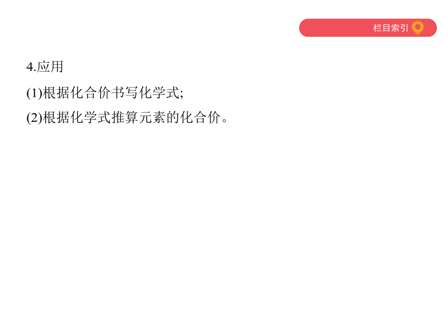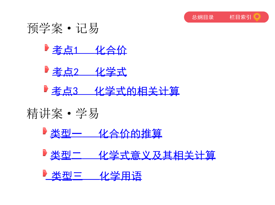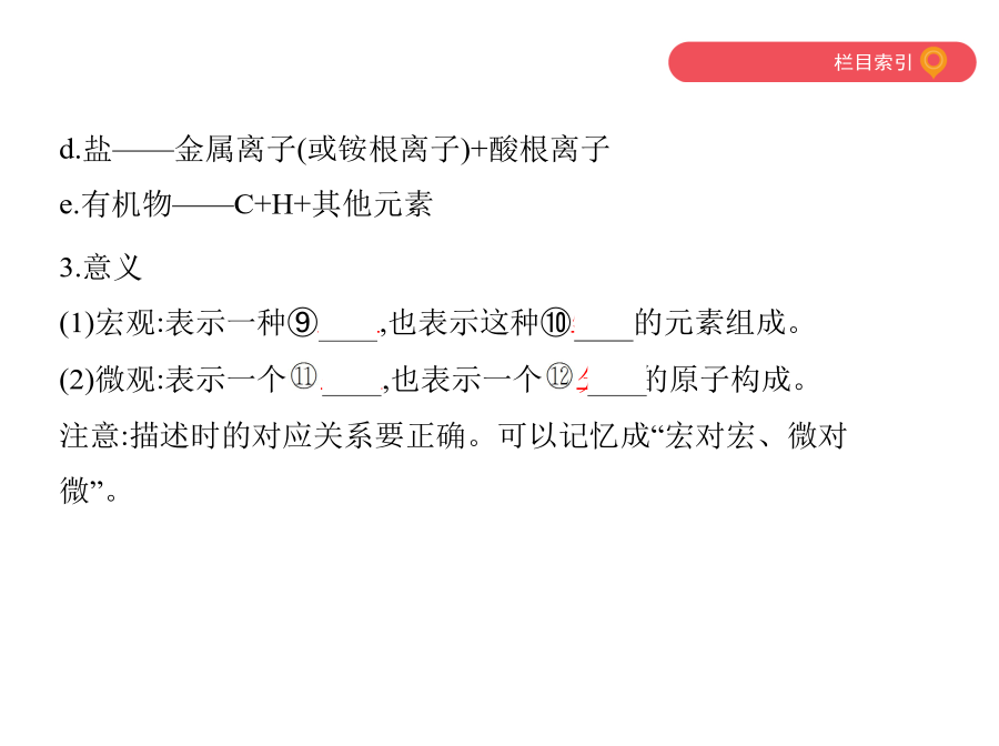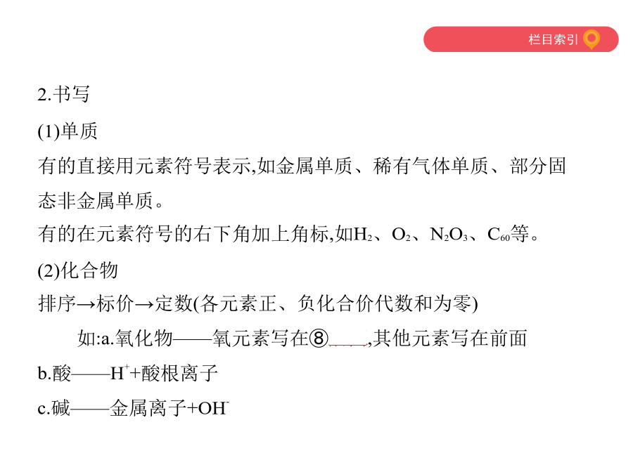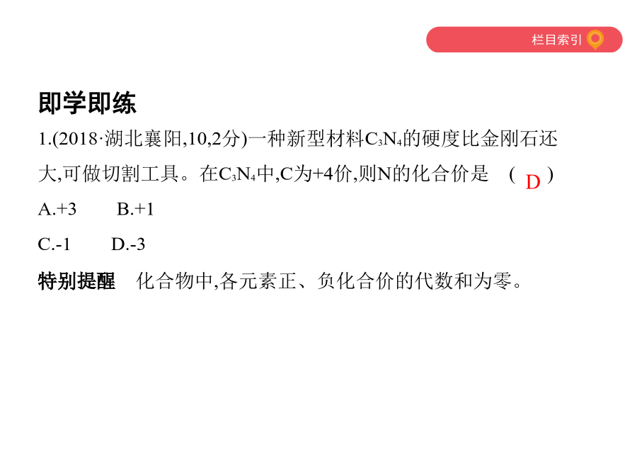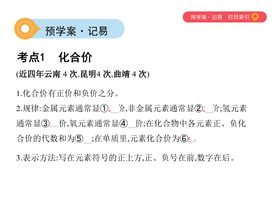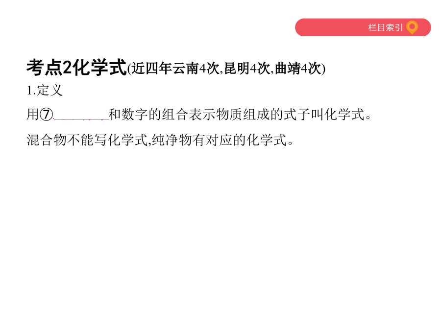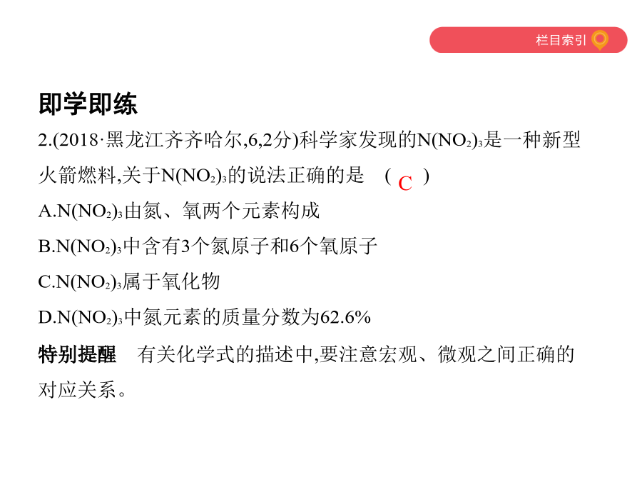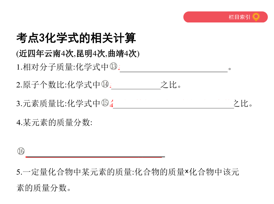 第6讲化学式与化合价类型一化合价的推算考点1化合价4.应用(1)根据化合价书写化学式;(2)根据化学式推算元素的化合价。即学即练1.(2018·湖北襄阳,10,2分)一种新型材料C3N4的硬度比金刚石还大,可做切割工具。在C3N4中,C为+4价,则N的化合价是 ()A.+3B.+1C.-1D.-3特别提醒化合物中,各元素正、负化合价的代数和为零。1.定义用⑦元素符号和数字的组合表示物质组成的式子叫化学式。混合物不能写化学式,纯净物有对应的化学式。2.书写(1)单质有的直接用元素符号表示,如金属单质、稀有气体单质、部分固态非金属单质。有的在元素符号的右下角加上角标,如H2、O2、N2O3、C60等。(2)化合物排序→标价→定数(各元素正、负化合价代数和为零)如:a.氧化物——氧元素写在⑧后面,其他元素写在前面b.酸——H++酸根离子c.碱——金属离子+OH-d.盐——金属离子(或铵根离子)+酸根离子e.有机物——C+H+其他元素即学即练2.(2018·黑龙江齐齐哈尔,6,2分)科学家发现的N(NO2)3是一种新型火箭燃料,关于N(NO2)3的说法正确的是 ()A.N(NO2)3由氮、氧两个元素构成B.N(NO2)3中含有3个氮原子和6个氧原子C.N(NO2)3属于氧化物D.N(NO2)3中氮元素的质量分数为62.6%特别提醒有关化学式的描述中,要注意宏观、微观之间正确的对应关系。1.相对分子质量:化学式中 各原子的相对原子质量的总和。即学即练3.(2019·原创预测)乙硫醇(化学式为C2H6S)易挥发,有蒜臭味,人对该气味极其敏感,下列有关乙硫醇的说法不正确的是 ()A.乙硫醇的相对分子质量为62B.乙硫醇中C、H、S三种元素的质量比是2∶6∶1C.乙硫醇中硫元素的质量分数是 ×100%D.在管道煤气中添加微量乙硫醇,目的是及时发现煤气泄漏特别提醒注意元素质量比与原子个数比的区别。例1(2018·云南,12,2分)MnO2中Mn元素的化合价为 ()A.+2B.+3C.+4D.-4命题思路考查化合物中元素化合价的推算。失分警示化合物中,各元素正、负化合价的代数和为零。命题规律结合日常生活、生产中常见的化合物,进行化合物中化合价的推算。实战预测1.下列物质中,N元素的化合价为0价的是 ()A.NO2B.N2C.NOD.HNO32.我国颁布的《饮用天然矿泉水标准》严格规定了饮用天然矿泉水中的溴酸盐指标限量,过量添加溴酸钾(KBrO3)会致癌,其中溴元素(Br)的化合价为 ()A.+1B.+3C.+5D.+6例2(2018·云南,18,3分)吸烟有害健康,香烟产生的烟气中含有尼古丁(化学式为C10H14N2),下列有关尼古丁的说法正确的是()A.尼古丁由26个原子构成B.尼古丁中氢元素的质量分数最大C.尼古丁由碳、氢、氮三种元素组成D.尼古丁中碳、氢、氮三种元素的质量比为10∶14∶2命题思路考查化合物中某元素的质量分数、各元素质量比的计算。失分警示化合物化学式的微观与宏观的描述,元素质量比不是原子个数比。命题规律给出陌生化合物的化学式,考查化合物化学式的意义、相对分子质量、各元素质量比、元素质量分数的计算等。实战预测3.科学家研制出一种代号为DEPA的安全驱蚊剂,其化学式为C12H17NO。下列有关该物质的说法正确的是 ()A.属于无机物B.碳、氢元素质量比为12∶17C.由4种元素组成D.由31个原子构成4.维生素C(C6H8O6)是人体不可或缺的营养物质,下列说法错误的是 ()A.维生素C由6个碳原子、8个氢原子、6个氧原子构成B.维生素C由碳、氢、氧三种元素组成C.维生素C可以预防坏血病D.维生素C属于有机物例3(2018·云南,21,6分)化学用语是国际通用语言,是学习化学的重要工具。(1)用化学用语填空。①钾元素K。②2个氮原子2N。③2个水分子2H2O。④铵根离子N 。⑤标出“MgO”中镁元素的化合价 O。(2)写出“3CH4”中“4”的含义每个甲烷分子中含有4个氢原子。命题思路考查元素符号、化学式、离子符号、化合价的书写,元素符号与化学式周围数字的意义。失分警示元素符号与化学式混淆,离子符号中的电荷与化合价混淆,化学式周围数字的意义混淆。命题规律结合教材中常见物质考查元素符号、化学式、离子符号、化合价的书写,元素符号、化学式周围数字的意义。实战预测5.用适当的化学符号填空。(1)自然界中硬度最大的金刚石C。(2)硫酸亚铁中的亚铁离子Fe2+。(3)使无色酚酞试液变为红色的离子OH-。(4)保持氢气化学性质的最小微粒H2。6.用适当的化学符号和数字回答:(1)氧