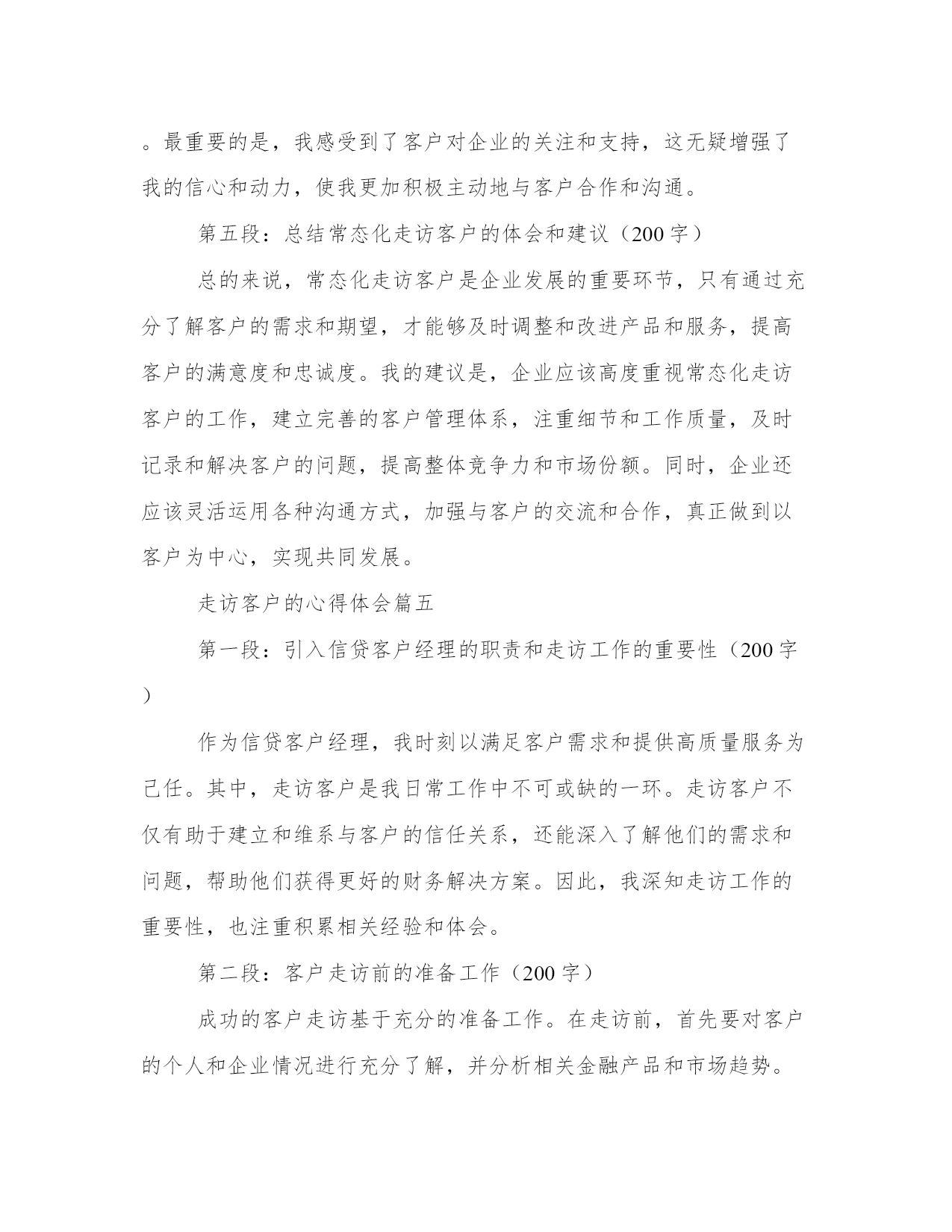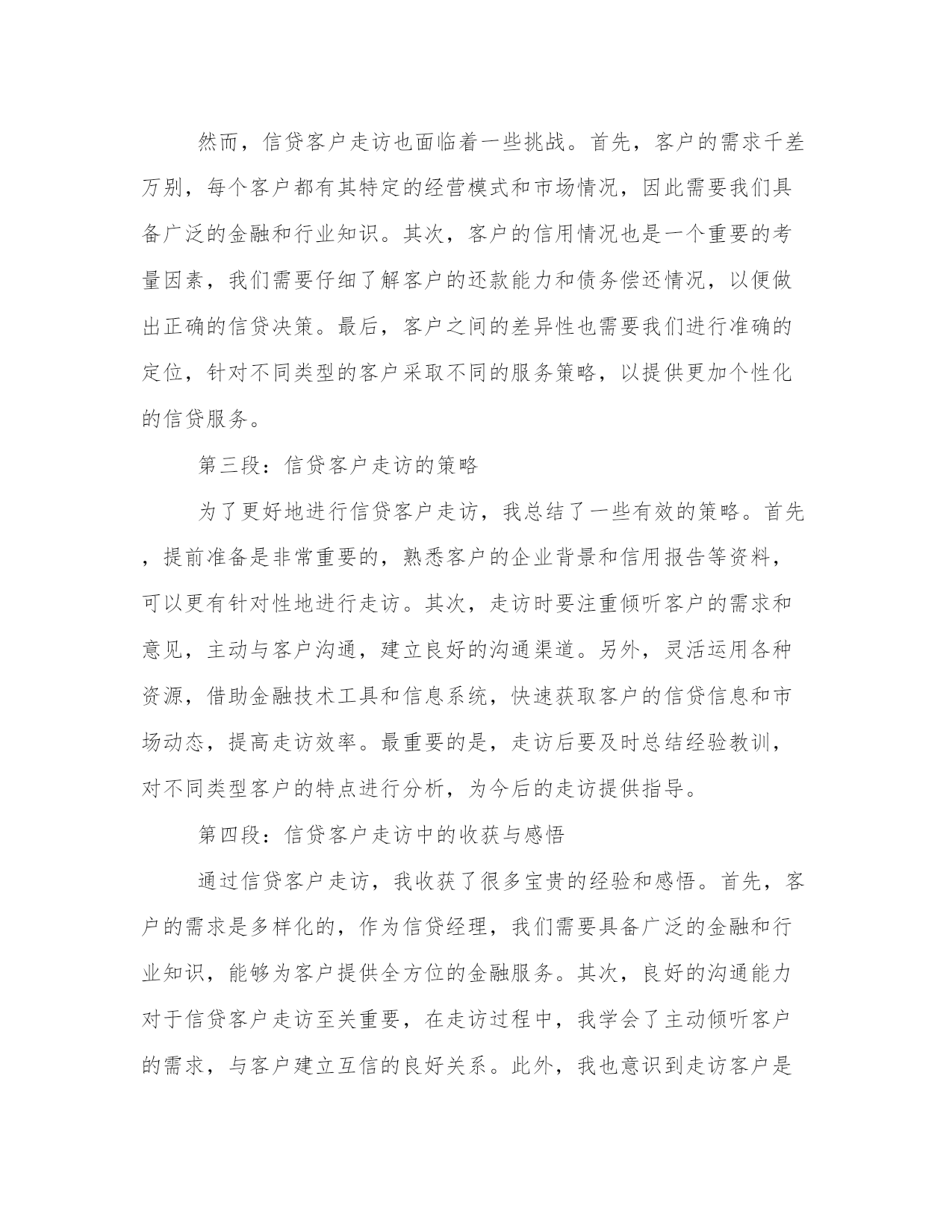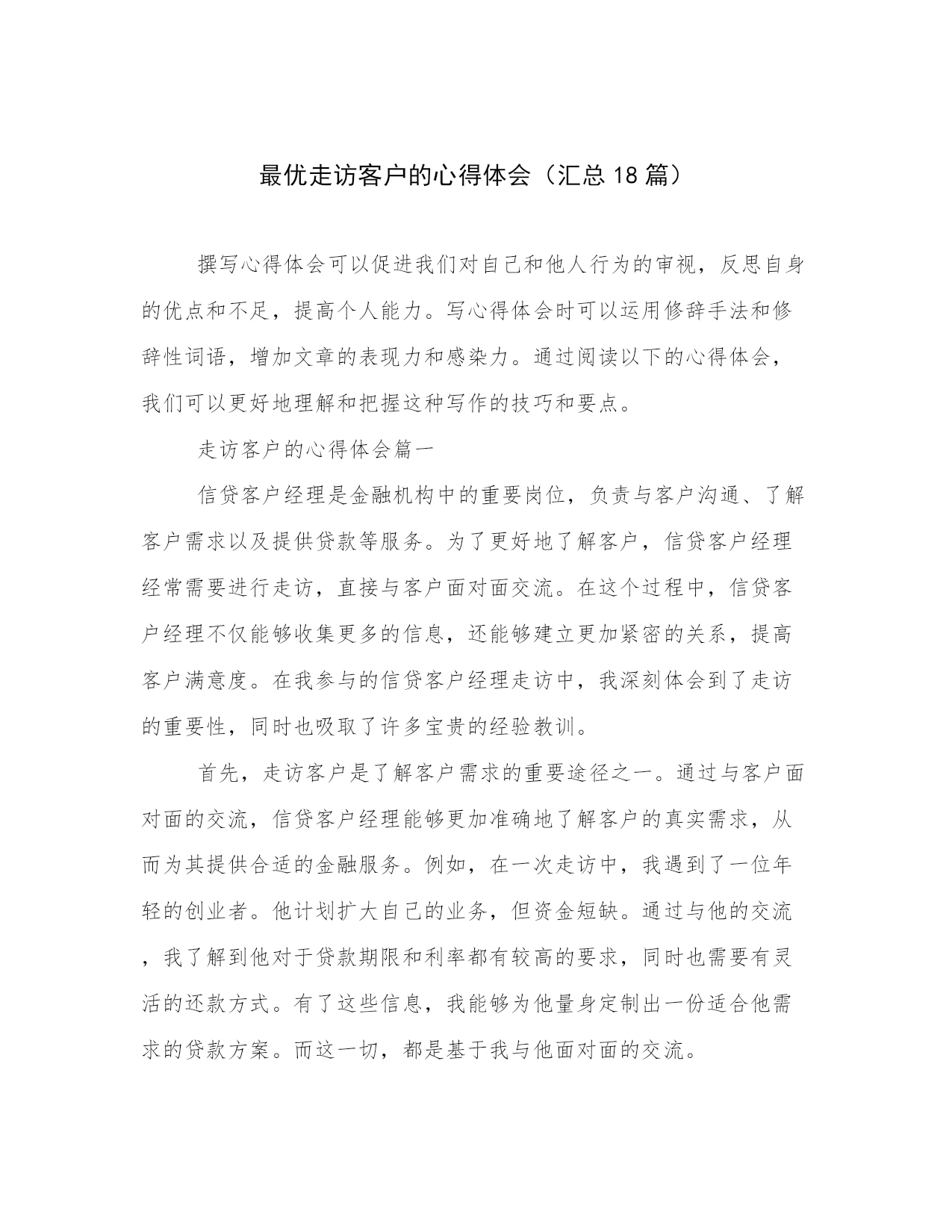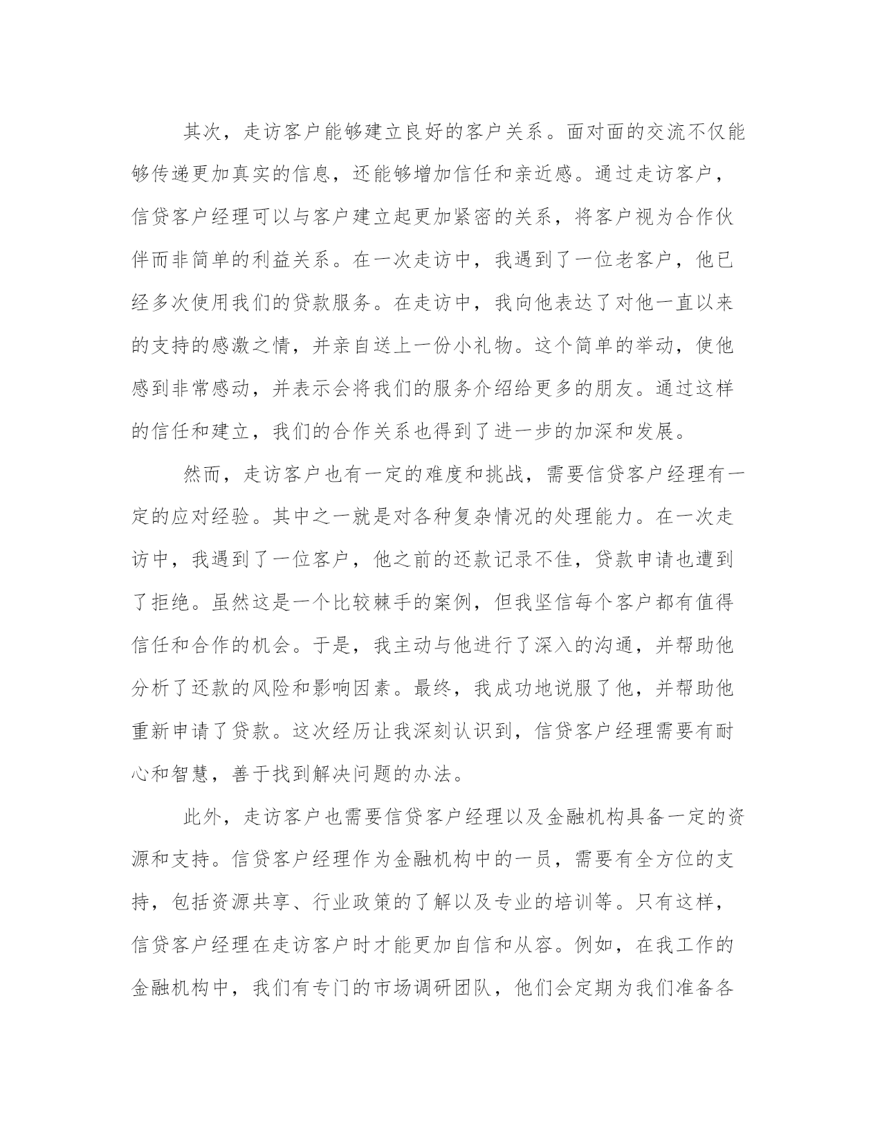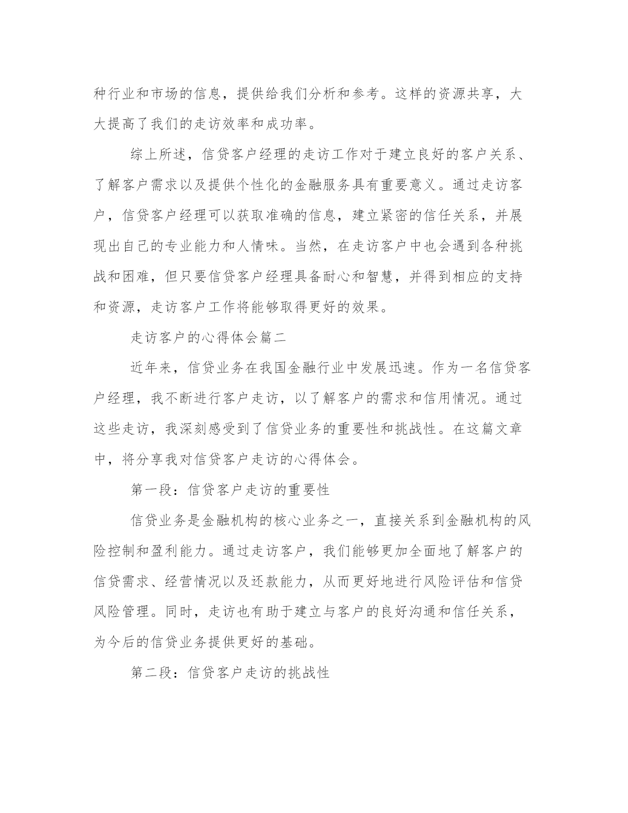 最优走访客户的心得体会(汇总18篇)撰写心得体会可以促进我们对自己和他人行为的审视,反思自身的优点和不足,提高个人能力。写心得体会时可以运用修辞手法和修辞性词语,增加文章的表现力和感染力。通过阅读以下的心得体会,我们可以更好地理解和把握这种写作的技巧和要点。走访客户的心得体会篇一信贷客户经理是金融机构中的重要岗位,负责与客户沟通、了解客户需求以及提供贷款等服务。为了更好地了解客户,信贷客户经理经常需要进行走访,直接与客户面对面交流。在这个过程中,信贷客户经理不仅能够收集更多的信息,还能够建立更加紧密的关系,提高客户满意度。在我参与的信贷客户经理走访中,我深刻体会到了走访的重要性,同时也吸取了许多宝贵的经验教训。首先,走访客户是了解客户需求的重要途径之一。通过与客户面对面的交流,信贷客户经理能够更加准确地了解客户的真实需求,从而为其提供合适的金融服务。例如,在一次走访中,我遇到了一位年轻的创业者。他计划扩大自己的业务,但资金短缺。通过与他的交流,我了解到他对于贷款期限和利率都有较高的要求,同时也需要有灵活的还款方式。有了这些信息,我能够为他量身定制出一份适合他需求的贷款方案。而这一切,都是基于我与他面对面的交流。其次,走访客户能够建立良好的客户关系。面对面的交流不仅能够传递更加真实的信息,还能够增加信任和亲近感。通过走访客户,信贷客户经理可以与客户建立起更加紧密的关系,将客户视为合作伙伴而非简单的利益关系。在一次走访中,我遇到了一位老客户,他已经多次使用我们的贷款服务。在走访中,我向他表达了对他一直以来的支持的感激之情,并亲自送上一份小礼物。这个简单的举动,使他感到非常感动,并表示会将我们的服务介绍给更多的朋友。通过这样的信任和建立,我们的合作关系也得到了进一步的加深和发展。然而,走访客户也有一定的难度和挑战,需要信贷客户经理有一定的应对经验。其中之一就是对各种复杂情况的处理能力。在一次走访中,我遇到了一位客户,他之前的还款记录不佳,贷款申请也遭到了拒绝。虽然这是一个比较棘手的案例,但我坚信每个客户都有值得信任和合作的机会。于是,我主动与他进行了深入的沟通,并帮助他分析了还款的风险和影响因素。最终,我成功地说服了他,并帮助他重新申请了贷款。这次经历让我深刻认识到,信贷客户经理需要有耐心和智慧,善于找到解决问题的办法。此外,走访客户也需要信贷客户经理以及金融机构具备一定的资源和支持。信贷客户经理作为金融机构中的一员,需要有全方位的支持,包括资源共享、行业政策的了解以及专业的培训等。只有这样,信贷客户经理在走访客户时才能更加自信和从容。例如,在我工作的金融机构中,我们有专门的市场调研团队,他们会定期为我们准备各种行业和市场的信息,提供给我们分析和参考。这样的资源共享,大大提高了我们的走访效率和成功率。综上所述,信贷客户经理的走访工作对于建立良好的客户关系、了解客户需求以及提供个性化的金融服务具有重要意义。通过走访客户,信贷客户经理可以获取准确的信息,建立紧密的信任关系,并展现出自己的专业能力和人情味。当然,在走访客户中也会遇到各种挑战和困难,但只要信贷客户经理具备耐心和智慧,并得到相应的支持和资源,走访客户工作将能够取得更好的效果。走访客户的心得体会篇二近年来,信贷业务在我国金融行业中发展迅速。作为一名信贷客户经理,我不断进行客户走访,以了解客户的需求和信用情况。通过这些走访,我深刻感受到了信贷业务的重要性和挑战性。在这篇文章中,将分享我对信贷客户走访的心得体会。第一段:信贷客户走访的重要性信贷业务是金融机构的核心业务之一,直接关系到金融机构的风险控制和盈利能力。通过走访客户,我们能够更加全面地了解客户的信贷需求、经营情况以及还款能力,从而更好地进行风险评估和信贷风险管理。同时,走访也有助于建立与客户的良好沟通和信任关系,为今后的信贷业务提供更好的基础。第二段:信贷客户走访的挑战性然而,信贷客户走访也面临着一些挑战。首先,客户的需求千差万别,每个客户都有其特定的经营模式和市场情况,因此需要我们具备广泛的金融和行业知识。其次,客户的信用情况也是一个重要的考量因素,我们需要仔细了解客户的还款能力和债务偿还情况,以便做出正确的信贷决策。最后,客户之间的差异性也需要我们进行准确的定位,针对不同类型的客户采取不同的服务策略,以提供更加个性化的信贷服务。第三段:信贷客户走访的策略为了更好地进行信贷客户走访,我总结了一些有效的策略。首先,提前准备是非常重要的,熟悉客户的企业背景和信用报告等资料,可以更有针对性地进行走访。其次,走访时要注重倾听客户的需求和意见,主动与客户沟通,建立良好的沟通渠道。另外,灵活运用各种资源,借助金融技术工具和信息系统,快速获取客户的信贷信息和市场动态,提高走访效率。最重要的是,走访后要