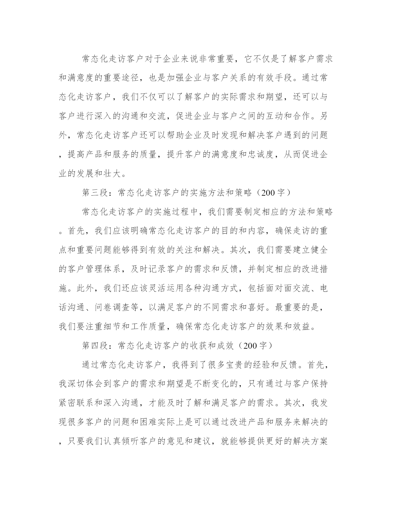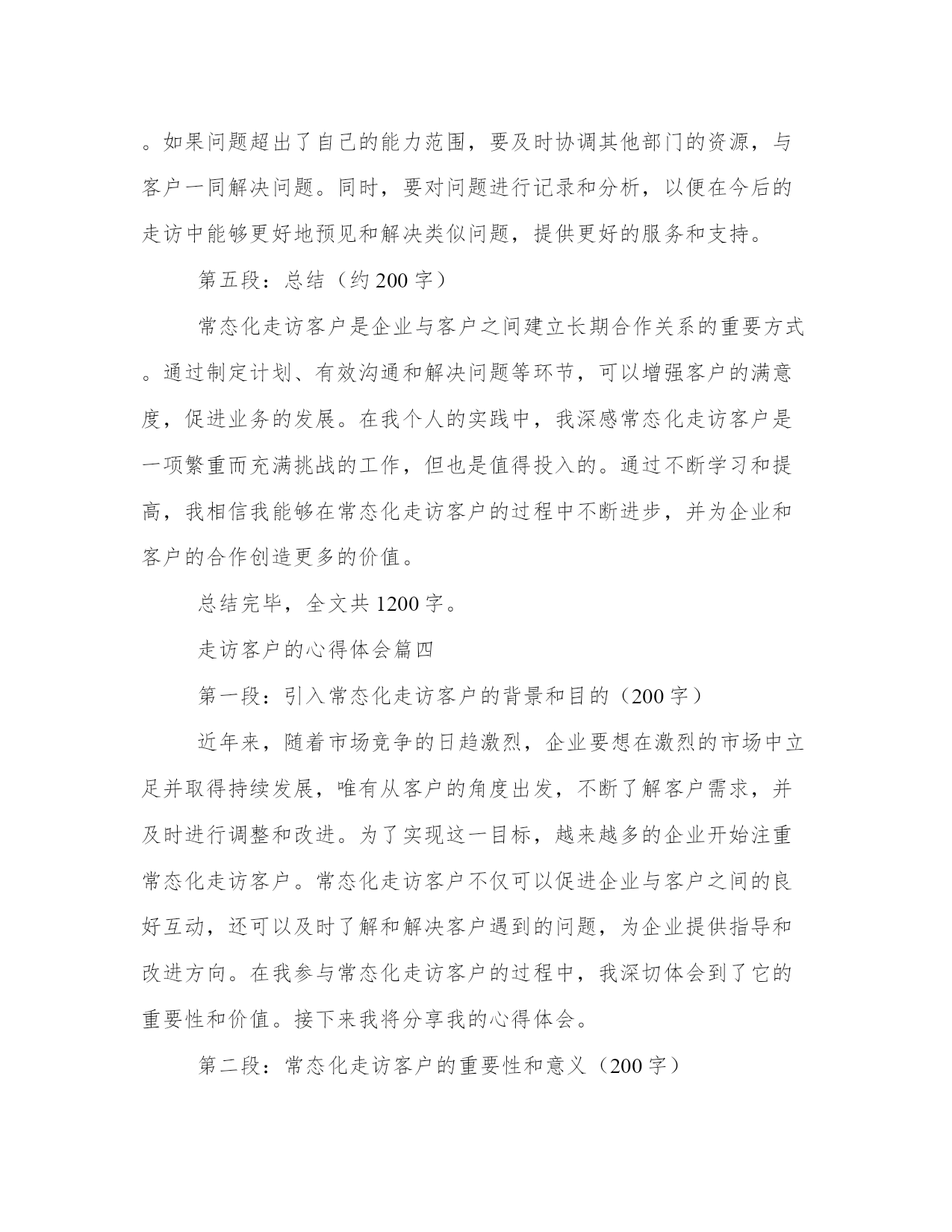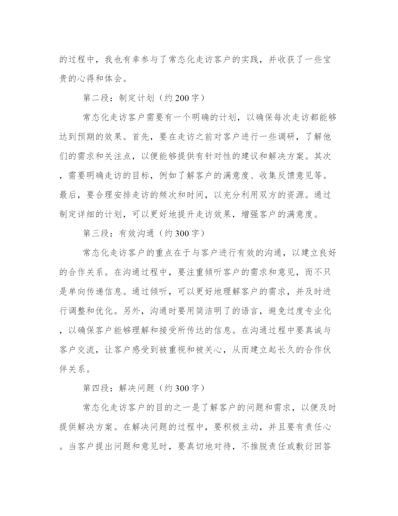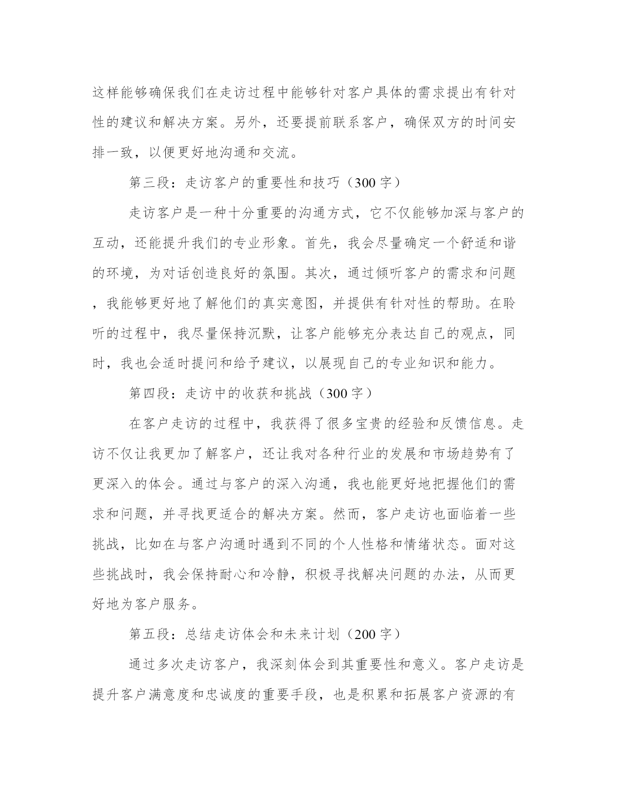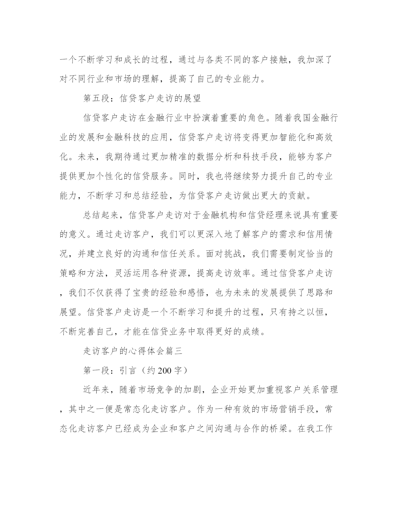 最优走访客户的心得体会(汇总18篇)撰写心得体会可以促进我们对自己和他人行为的审视,反思自身的优点和不足,提高个人能力。写心得体会时可以运用修辞手法和修辞性词语,增加文章的表现力和感染力。通过阅读以下的心得体会,我们可以更好地理解和把握这种写作的技巧和要点。走访客户的心得体会篇一信贷客户经理是金融机构中的重要岗位,负责与客户沟通、了解客户需求以及提供贷款等服务。为了更好地了解客户,信贷客户经理经常需要进行走访,直接与客户面对面交流。在这个过程中,信贷客户经理不仅能够收集更多的信息,还能够建立更加紧密的关系,提高客户满意度。在我参与的信贷客户经理走访中,我深刻体会到了走访的重要性,同时也吸取了许多宝贵的经验教训。首先,走访客户是了解客户需求的重要途径之一。通过与客户面对面的交流,信贷客户经理能够更加准确地了解客户的真实需求,从而为其提供合适的金融服务。例如,在一次走访中,我遇到了一位年轻的创业者。他计划扩大自己的业务,但资金短缺。通过与他的交流,我了解到他对于贷款期限和利率都有较高的要求,同时也需要有灵活的还款方式。有了这些信息,我能够为他量身定制出一份适合他需求的贷款方案。而这一切,都是基于我与他面对面的交流。其次,走访客户能够建立良好的客户关系。面对面的交流不仅能够传递更加真实的信息,还能够增加信任和亲近感。通过走访客户,信贷客户经理可以与客户建立起更加紧密的关系,将客户视为合作伙伴而非简单的利益关系。在一次走访中,我遇到了一位老客户,他已经多次使用我们的贷款服务。在走访中,我向他表达了对他一直以来的支持的感激之情,并亲自送上一份小礼物。这个简单的举动,使他感到非常感动,并表示会将我们的服务介绍给更多的朋友。通过这样的信任和建立,我们的合作关系也得到了进一步的加深和发展。然而,走访客户也有一定的难度和挑战,需要信贷客户经理有一定的应对经验。其中之一就是对各种复杂情况的处理能力。在一次走访中,我遇到了一位客户,他之前的还款记录不佳,贷款申请也遭到了拒绝。虽然这是一个比较棘手的案例,但我坚信每个客户都有值得信任和合作的机会。于是,我主动与他进行了深入的沟通,并帮助他分析了还款的风险和影响因素。最终,我成功地说服了他,并帮助他重新申请了贷款。这次经历让我深刻认识到,信贷客户经理需要有耐心和智慧,善于找到解决问题的办法。此外,走访客户也需要信贷客户经理以及金融机构具备一定的资源和支持。信贷客户经理作为金融机构中的一员,需要有全方位的支持,包括资源共享、行业政策的了解以及专业的培训等。只有这样,信贷客户经理在走访客户时才能更加自信和从容。例如,在我工作的金融机构中,我们有专门的市场调研团队,他们会定期为我们准备各种行业和市场的信息,提供给我们分析和参考。这样的资源共享,大大提高了我们的走访效率和成功率。综上所述,信贷客户经理的走访工作对于建立良好的客户关系、了解客户需求以及提供个性化的金融服务具有重要意义。通过走访客户,信贷客户经理可以获取准确的信息,建立紧密的信任关系,并展现出自己的专业能力和人情味。当然,在走访客户中也会遇到各种挑战和困难,但只要信贷客户经理具备耐心和智慧,并得到相应的支持和资源,走访客户工作将能够取得更好的效果。走访客户的心得体会篇二近年来,信贷业务在我国金融行业中发展迅速。作为一名信贷客户经理,我不断进行客户走访,以了解客户的需求和信用情况。通过这些走访,我深刻感受到了信贷业务的重要性和挑战性。在这篇文章中,将分享我对信贷客户走访的心得体会。第一段:信贷客户走访的重要性信贷业务是金融机构的核心业务之一,直接关系到金融机构的风险控制和盈利能力。通过走访客户,我们能够更加全面地了解客户的信贷需求、经营情况以及还款能力,从而更好地进行风险评估和信贷风险管理。同时,走访也有助于建立与客户的良好沟通和信任关系,为今后的信贷业务提供更好的基础。第二段:信贷客户走访的挑战性然而,信贷客户走访也面临着一些挑战。首先,客户的需求千差万别,每个客户都有其特定的经营模式和市场情况,因此需要我们具备广泛的金融和行业知识。其次,客户的信用情况也是一个重要的考量因素,我们需要仔细了解客户的还款能力和债务偿还情况,以便做出正确的信贷决策。最后,客户之间的差异性也需要我们进行准确的定位,针对不同类型的客户采取不同的服务策略,以提供更加个性化的信贷服务。第三段:信贷客户走访的策略为了更好地进行信贷客户走访,我总结了一些有效的策略。首先,提前准备是非常重要的,熟悉客户的企业背景和信用报告等资料,可以更有针对性地进行走访。其次,走访时要注重倾听客户的需求和意见,主动与客户沟通,建立良好的沟通渠道。另外,灵活运用各种资源,借助金融技术工具和信息系统,快速获取客户的信贷信息和市场动态,提高走访效率。最重要的是,走访后要