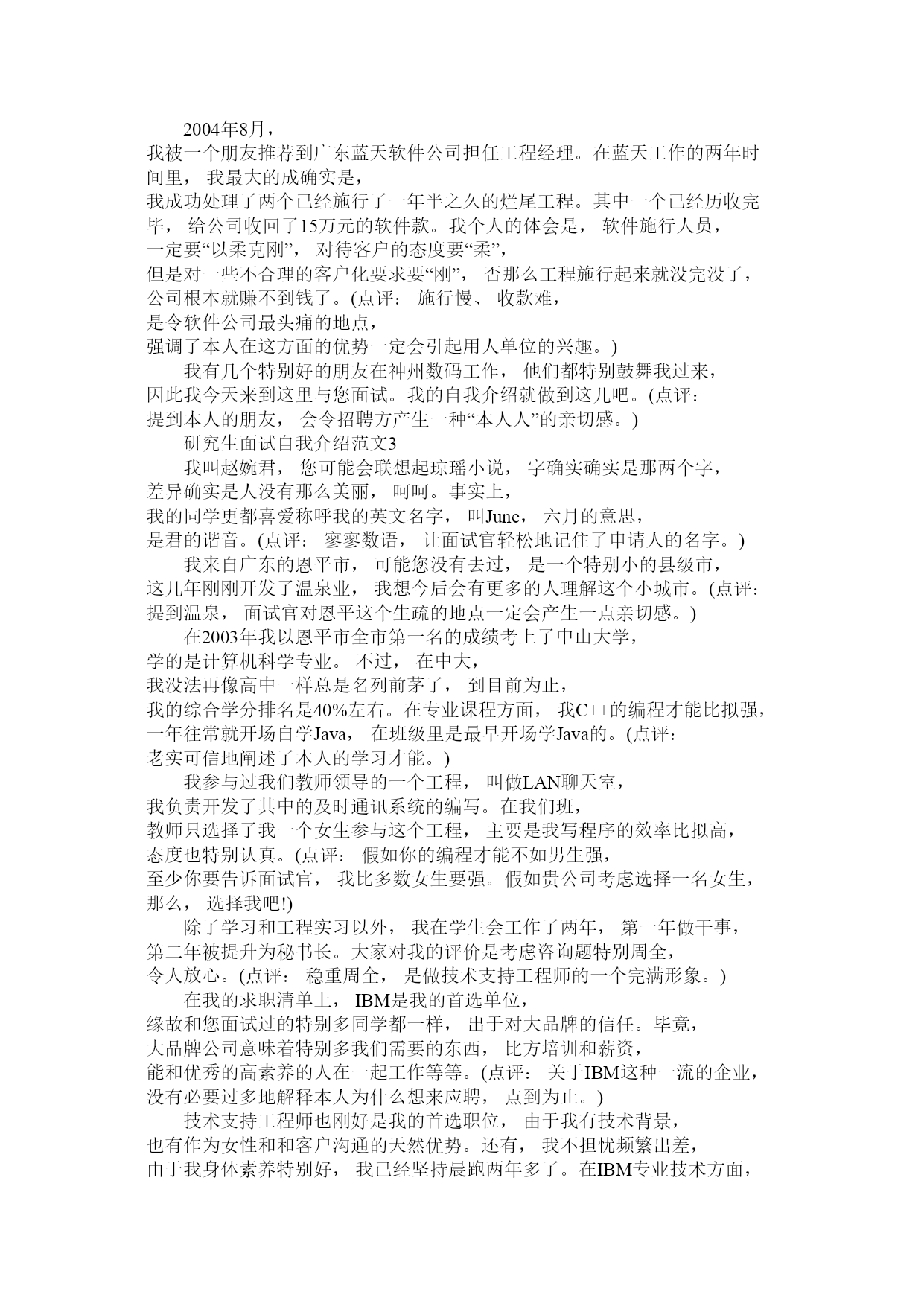 研究生面试时自我介绍范文研究生面试自我介绍范文1各位教师你们好:我特别荣幸能参加这次面试,我渴望在各位教师的指导下进一步成长。我叫XXX,XXX人,XXX大学XXX专业应届本科生,大学四年的本科课程以XXX为核心开展。我认真负责,吃苦耐劳,对生活充满热情,业余爱好:写作、篮球、羽毛球和旅行。为了感受东部的繁荣,2008年暑假经历了南京、上海、杭州、厦门和深圳的东部之旅。我选择XXX的理由:1.XXX大学是一所历史悠久、学术气氛浓重的学校,作为我国最著名的大学,她能为学生进一步成长提供宽阔的开展空间。学生以务实创新而出名海内外。XXX学系创始于1936年,历经XXX等老一代和在座各位教师一代代的传承发扬,已成为我国顶尖的XXX系。2.我对XX研究具有浓重的兴趣。(跨考建议考生这里能够自由扩散一些)3.我渴望进一步深造,深化理论,更多实践,实现本身价值。假如我有幸录用,我将全力以赴学习。首先,我夯实根底,学好英语,大量阅读英文原版教材。其次,我将努力强化实践,将理论与实际结合起来。最后,我注重团队合作精神。我相信,通过两年的学习,我一定会实现我的理想。感谢各位教师!研究生面试自我介绍范文2我叫萧峰,山峰的峰。我是山东人,身材特别“山东”,性格也特别“山东”,呵呵。(点评:假如面试官是个矮小的男子,这个身材特别“山东”的幽默就必须删除,否那么确实是把本人的欢乐建立在人家的痛苦之上喽!)2000年我从兰州铁道学院毕业,所学的专业叫火车头,但实际上我们的学习内容是用计算机软件来设计火车头。(点评:申请技术类岗位的申请人,假如能略微幽默一些,立即就会和别的候选人拉开档次。)毕业后我首先从事了两年的火车头设计工作,然后从2002年开场转行从事软件开发工作。从2002到2004年,我在徐州天润软件公司工作近两年。可能您没有听说过这家公司,天润是一个专业性特别强的公司,是在几年往常由几个博士后创办起来的,我们主要效劳的对象确实是铁路系统。我最初担任的是C++程序员,在工作了三个月之后被升职为工程经理,主要负责到客户所在单位进展驻点式软件施行。由于我带的小组施行速度比拟快,我带队负责了公司三个合同额最大的工程,总计合同额约占公司全年营业额的30%。(点评:以数字来说明本人的才能永远是最上乘的自诩技巧。)2004年8月,我被一个朋友推荐到广东蓝天软件公司担任工程经理。在蓝天工作的两年时间里,我最大的成确实是,我成功处理了两个已经施行了一年半之久的烂尾工程。其中一个已经历收完毕,给公司收回了15万元的软件款。我个人的体会是,软件施行人员,一定要“以柔克刚”,对待客户的态度要“柔”,但是对一些不合理的客户化要求要“刚”,否那么工程施行起来就没完没了,公司根本就赚不到钱了。(点评:施行慢、收款难,是令软件公司最头痛的地点,强调了本人在这方面的优势一定会引起用人单位的兴趣。)我有几个特别好的朋友在神州数码工作,他们都特别鼓舞我过来,因此我今天来到这里与您面试。我的自我介绍就做到这儿吧。(点评:提到本人的朋友,会令招聘方产生一种“本人人”的亲切感。)研究生面试自我介绍范文3我叫赵婉君,您可能会联想起琼瑶小说,字确实确实是那两个字,差异确实是人没有那么美丽,呵呵。事实上,我的同学更都喜爱称呼我的英文名字,叫June,六月的意思,是君的谐音。(点评:寥寥数语,让面试官轻松地记住了申请人的名字。)我来自广东的恩平市,可能您没有去过,是一个特别小的县级市,这几年刚刚开发了温泉业,我想今后会有更多的人理解这个小城市。(点评:提到温泉,面试官对恩平这个生疏的地点一定会产生一点亲切感。)在2003年我以恩平市全市第一名的成绩考上了中山大学,学的是计算机科学专业。不过,在中大,我没法再像高中一样总是名列前茅了,到目前为止,我的综合学分排名是40%左右。在专业课程方面,我C++的编程才能比拟强,一年往常就开场自学Java,在班级里是最早开场学Java的。(点评:老实可信地阐述了本人的学习才能。)我参与过我们教师领导的一个工程,叫做LAN聊天室,我负责开发了其中的及时通讯系统的编写。在我们班,教师只选择了我一个女生参与这个工程,主要是我写程序的效率比拟高,态度也特别认真。(点评:假如你的编程才能不如男生强,至少你要告诉面试官,我比多数女生要强。假如贵公司考虑选择一名女生,那么,选择我吧!)除了学习和工程实习以外,我在学生会工作了两年,第一年做干事,第二年被提升为秘书长。大家对我的评价是考虑咨询题特别周全,令人放心。(点评:稳重周全,是做技术支持工程师的一个完满形象。)在我的求职清单上,IBM是我的首选单位,缘故和您面试过的特别多同学都一样,出于对大品牌的信任。毕竟,大品牌公司意味着特别多我们需要的东西,比方培训和薪资,能和优秀的高素养的