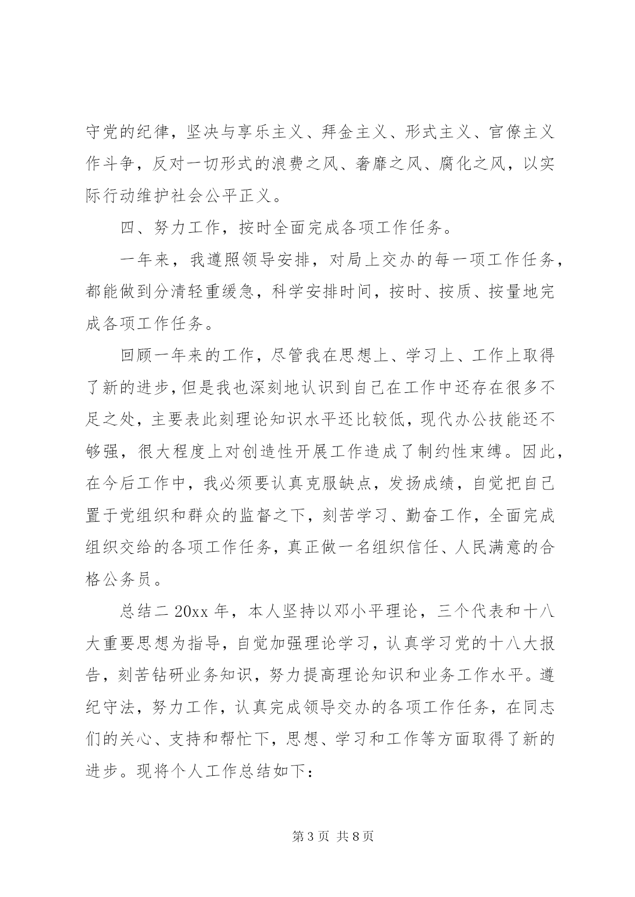 第PAGE\*Arabic\*MERGEFORMAT8页共NUMPAGES\*MERGEFORMAT8页公务员个人年度总结三篇总结一一年来,在局领导班子的正确领导下,在同志们的大力支持帮忙下,我始终坚持把学习建设具有中国特色社会主义创新理论作为提高自身政治素质的主要途径,认真学习和领会邓小平理论、三个代表重要思想及科学发展观深刻内涵,全面了解掌握了党的十八届三中、四中全会精神及加强以法治国、以宪治国等方面的重大理论知识,不断提高自身政策理论水平,以增强自身在实际工作中发现问题、分析问题、解决问题的潜力。与此同时,我用心参与党的群众路线教育实践活动及局上组织的各类学习教育活动,主动分析查找本人在思想认识、工作作风等方面存在的不足和问题,认真开展批评与自我批评,解放思想,转变观念,用心整改,力求实效,从根本上改变以往自由散漫、思想保守、爱发牢骚等不良习惯,真正做到大事讲原则,小事讲风格,使自己的党性和人品得到很好锻炼。透过不懈努力,较好地完成了局上交办的各项工作任务,现将20xx年个人工作总结如下:一、内强素质,外树形象。一年来,我始终坚持马列主义立场和观点,熟练掌握科学发展观的方*,灵活应用辩证唯物主义与历史唯物主义去分析和发现解决工作中遇到的新状况、新问题,明辨是非,坚持真理,坚持用正确的世界观、人生观、价值观指导自己的学习、工作和生活实践,在思想上用心构筑抵御一切腐朽思想侵蚀的坚固道德防线,全面提升自身综合素质。自觉服从组织工作安排,严格遵守工作纪律,顾大局、识大体,克己奉公,按章办事,作风正派,团结同志,从不计较个人得失。在实际工作中,始终坚持以人民群众根本利益为本的思想路线,一切从实际出发,讲实话,办实事,求实效,真抓实干,真正按照人民群众的意愿依法履行好自己的职责,用心参与各种形式的社会救助实践活动,以实际行动兑现自己作为一名构建社会主义和谐社会的坚定拥护者、执政为民的实践者、遵纪守法的倡导者的庄严承诺。二、强化理论和业务学习,不断提高自身综合素质。在实际工作中,我始终坚持把理论学习作为提高自身综合素质的最有效途径抓实抓好,抓出成效。一方面我用心参与局上组织各类学习教育活动,不断积累理论知识、努力提高工作技能的同时,踊跃报名参加省、市、县组织的各类业务技能知识培训,有针对性地重点学习掌握了公文写作、电脑操作技能及法律法规知识,使自己在实际工作技能上有较大提高和进步,真正做到学习工作两不误、两促进、两提高。三、努力加强党性锻炼,不断增强拒腐防变潜力。多年来,我用心倡导勤政廉洁的优良作风。无论在生活上还是在工作上,我始终持续着节俭习惯,慎细慎微,从不大意,时刻检点着自己的言行,严格执行卫生干部工作纪律,从不向被下属单位吃拿卡要,并自觉理解社会监督;时刻牢记党的宗旨,严守党的纪律,坚决与享乐主义、拜金主义、形式主义、官僚主义作斗争,反对一切形式的浪费之风、奢靡之风、腐化之风,以实际行动维护社会公平正义。四、努力工作,按时全面完成各项工作任务。一年来,我遵照领导安排,对局上交办的每一项工作任务,都能做到分清轻重缓急,科学安排时间,按时、按质、按量地完成各项工作任务。回顾一年来的工作,尽管我在思想上、学习上、工作上取得了新的进步,但是我也深刻地认识到自己在工作中还存在很多不足之处,主要表此刻理论知识水平还比较低,现代办公技能还不够强,很大程度上对创造性开展工作造成了制约性束缚。因此,在今后工作中,我必须要认真克服缺点,发扬成绩,自觉把自己置于党组织和群众的监督之下,刻苦学习、勤奋工作,全面完成组织交给的各项工作任务,真正做一名组织信任、人民满意的合格公务员。总结二20xx年,本人坚持以邓小平理论,三个代表和十八大重要思想为指导,自觉加强理论学习,认真学习党的十八大报告,刻苦钻研业务知识,努力提高理论知识和业务工作水平。遵纪守法,努力工作,认真完成领导交办的各项工作任务,在同志们的关心、支持和帮忙下,思想、学习和工作等方面取得了新的进步。现将个人工作总结如下:一、自觉学习党的精神,用先进政治思想武装自己的头脑这一年来,我始终坚持运用马克思列宁主义的立场、观点,运用辩证唯物主义与历史唯物主义去分析和观察事物,明辨是非,坚持真理,坚持正确的世界观、人生观、价值观,用正确的世界观、人生观、价值观指导自己的学习、工作和生活实践,在思想上用心构筑抵御资产阶级民主和自由化、拜金主义、自由主义等一切腐朽思想侵蚀的坚固防线。热爱祖国,热爱中国*,热爱社会主义,拥护改革开放,坚信社会主义最终必然战胜资本主义,对社会主义充满必胜的信心。认真贯彻执行党的路线、方针、政策,为加快社会主义建设事业认真做好本职工作。工作用心主动,勤奋努力,不畏艰难,尽职尽责,在平凡的工作岗位上作出力所能及的贡献。二、强化理论和业务学习,不断提高自身