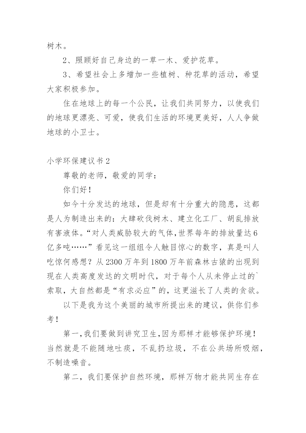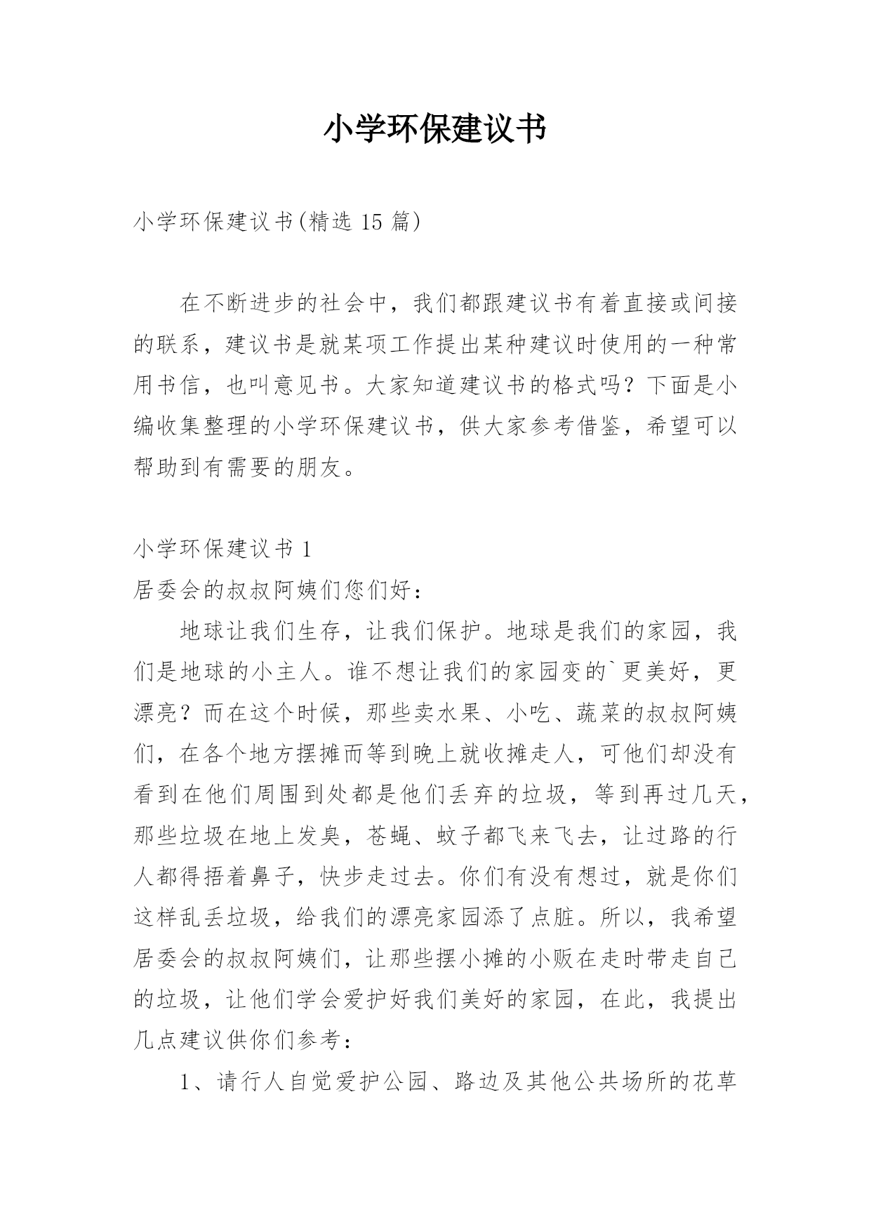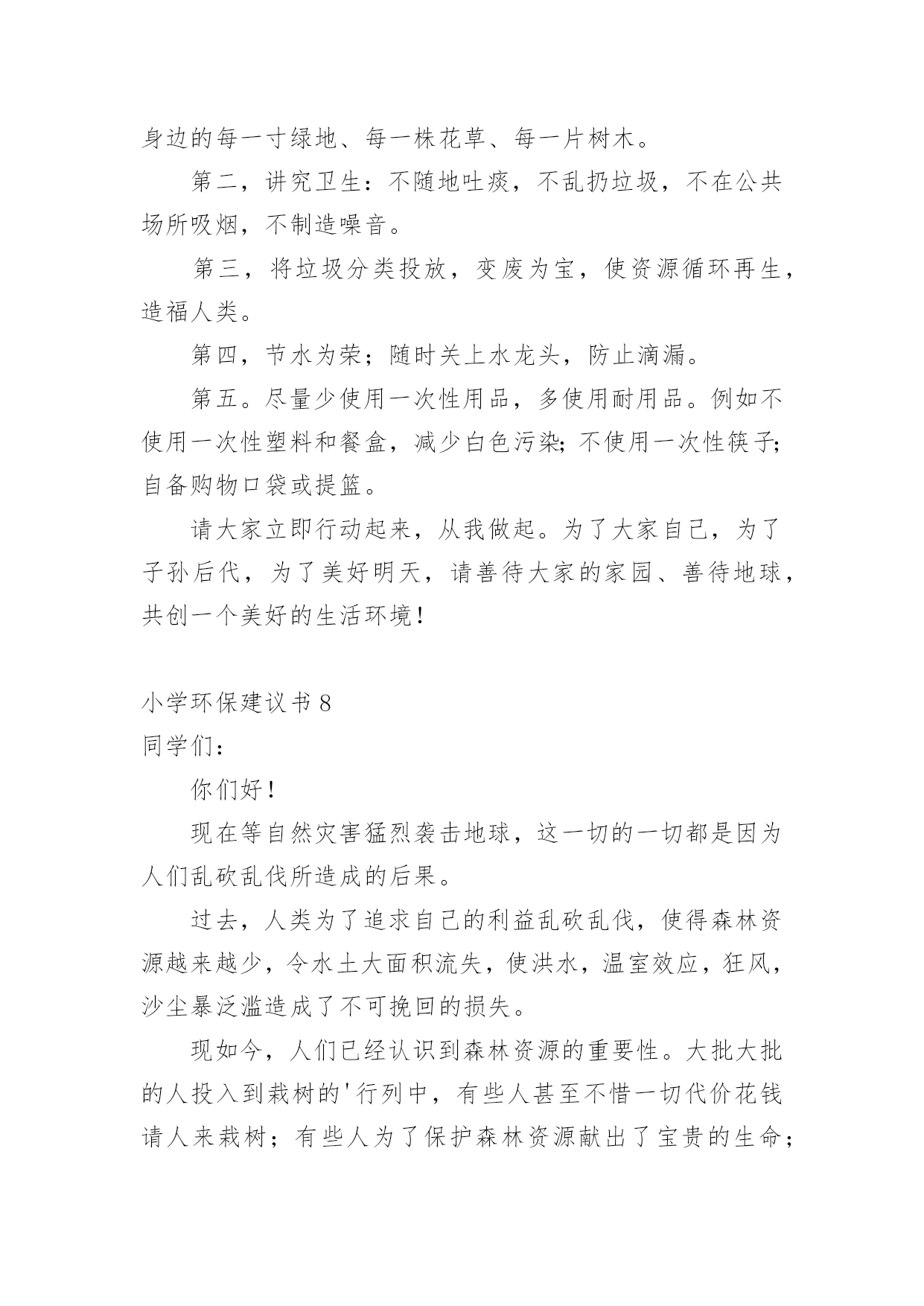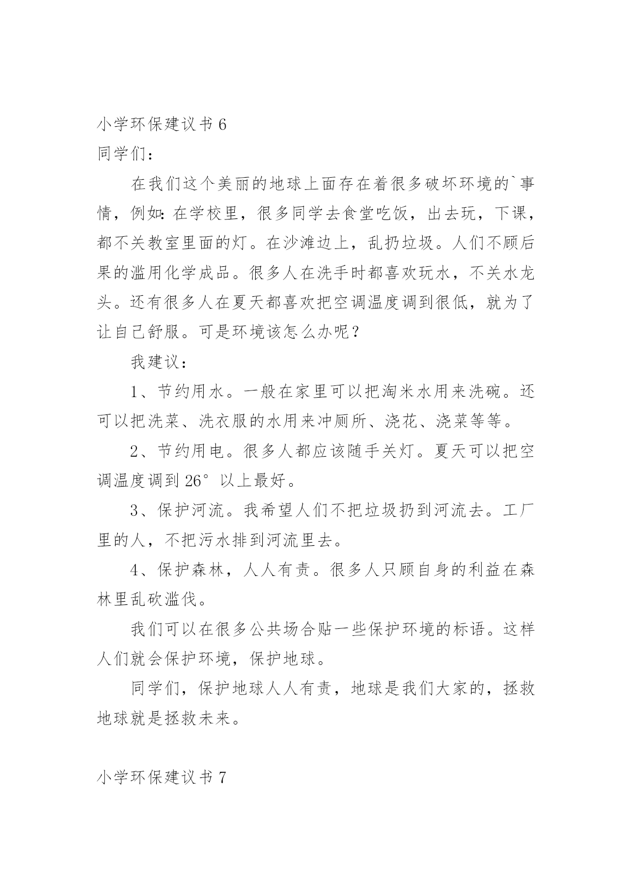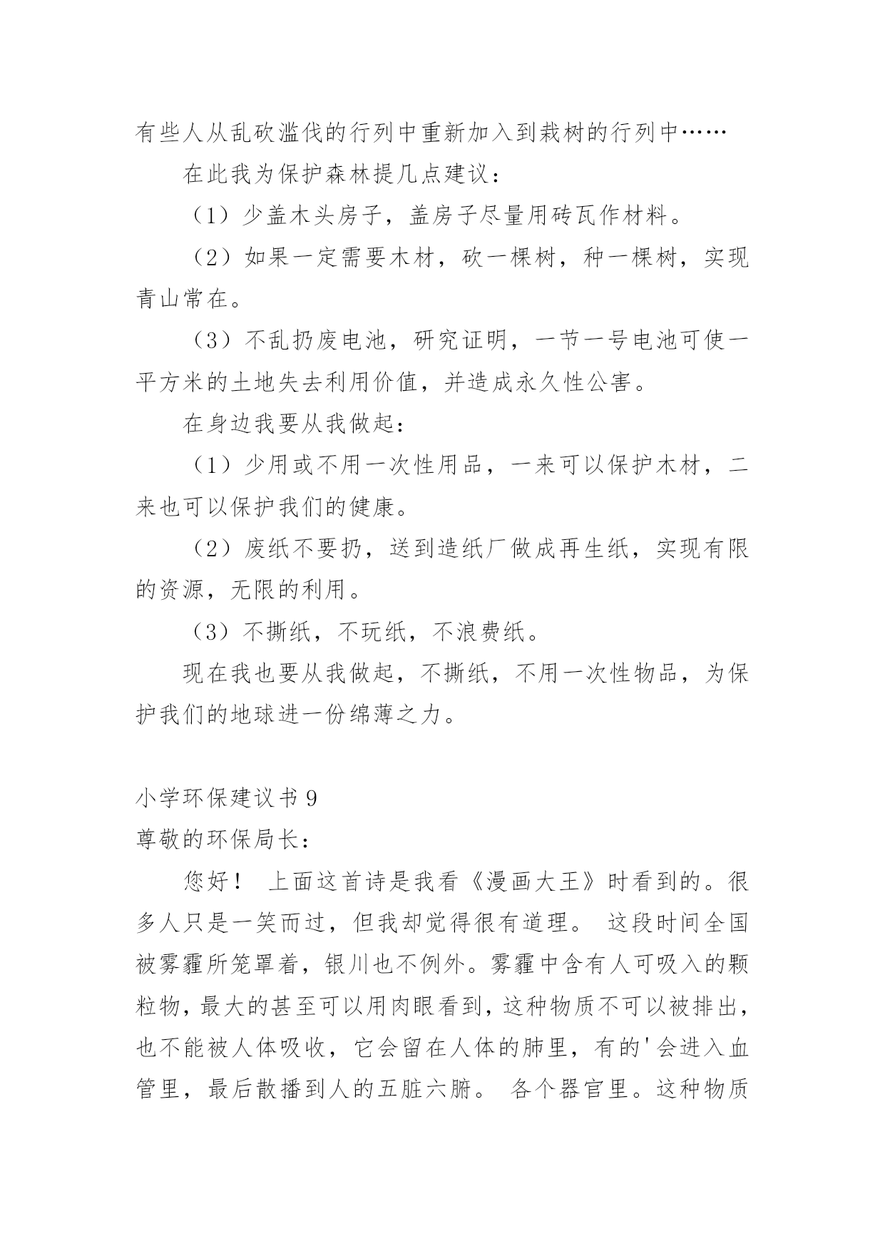 小学环保建议书小学环保建议书(精选15篇)在不断进步的社会中,我们都跟建议书有着直接或间接的联系,建议书是就某项工作提出某种建议时使用的一种常用书信,也叫意见书。大家知道建议书的格式吗?下面是小编收集整理的小学环保建议书,供大家参考借鉴,希望可以帮助到有需要的朋友。小学环保建议书1居委会的叔叔阿姨们您们好:地球让我们生存,让我们保护。地球是我们的家园,我们是地球的小主人。谁不想让我们的家园变的`更美好,更漂亮?而在这个时候,那些卖水果、小吃、蔬菜的叔叔阿姨们,在各个地方摆摊而等到晚上就收摊走人,可他们却没有看到在他们周围到处都是他们丢弃的垃圾,等到再过几天,那些垃圾在地上发臭,苍蝇、蚊子都飞来飞去,让过路的行人都得捂着鼻子,快步走过去。你们有没有想过,就是你们这样乱丢垃圾,给我们的漂亮家园添了点脏。所以,我希望居委会的叔叔阿姨们,让那些摆小摊的小贩在走时带走自己的垃圾,让他们学会爱护好我们美好的家园,在此,我提出几点建议供你们参考:1、请行人自觉爱护公园、路边及其他公共场所的花草树木。2、照顾好自己身边的一草一木、爱护花草。3、希望社会上多增加一些植树、种花草的活动,希望大家积极参加。住在地球上的每一个公民,让我们共同努力,以使我们的地球更漂亮、可爱,使我们生活的环境更美好,人人争做地球的小卫士。小学环保建议书2尊敬的老师,敬爱的同学:你们好!如今十分发达的地球,但是却有十分重大的隐患,这都是人为制造出来的:大肆砍伐树木、建立化工厂、胡乱排放有害液体。“对人类威胁较大的气体,世界每年的排放量达6亿多吨……”看见这一组组令人触目惊心的数字,真是叫人吃惊何感想?从2300万年到1800万年前森林古猿的出现到现在人类高度发达的文明时代,对于每个人从未停止过的`索取,大自然都是“有求必应”的,这更滋长了人类的贪欲。以下是我为这个美丽的城市所提出来的建议,供你们参考!第一,我们要做到讲究卫生,因为那样才能够保护环境!当然就是不能随地吐痰,不乱扔垃圾,不在公共场所吸烟,不制造噪音。第二,我们要保护自然环境,那样万物才能共同生存在一个美好的家园。我们不但自己要做到,而且还得以自己的力量来提倡身边的人不猎杀、不使用珍稀动物和受保护的动物,关爱与保护野生动植物;植树造林,爱护我们身边的每一寸绿地、每一株花草、每一片树木!现在我们部分地方已经做起了这个活动项目:“分类回收循环再用”。我们不能乱丢弃废电池、废塑料等垃圾、废物;而是要将垃圾分类投放,变废为宝,使资源循环再生,造福人类!大学排名第三,我们一定要做到最重要的一个:节约资源减少污染!!节水为荣,随时关上水龙头,千万不能浪费我们的水资源!希望我们的城市能越来越美丽!望各位网友给予修改!小学环保建议书3尊敬的环保局长:您好!我是本市一名六年级的学生,已经在这个气候宜人、温暖湿润、终年鲜花争艳、四季佳果飘香,有着闻名遐迩的湄洲岛,有着福建三绝的九鲤湖……的莆田市里生活了整整十二年,当我们走出家门时,留心观察身边。不免会发现这美中不足之处。这不足之处可使本市中的美丽大打折扣。市中菜市场里的小贩们,每天都要出去摆摊。所以,不免会看见东西乱扔在地,这不仅给市中的坏境打了个折扣,还给我们的地球增加了负担,比如:不要的垃圾袋;试吃完后的水果皮;不要的鸭毛……。小贩们总是随地乱扔垃圾,没有环保意识。收摊时更是没有带走。到中午时,被堆成小山一样的垃圾臭气冲天,苍蝇、蚊子,满天飞。过路的行人总是捂在鼻子,慌忙逃走。给坏境带来了严重的伤害。保护环境就是保护我们的家园。这不仅仅是一就口号,更是我们每一个人都应该都遵守,去做到的事情。我们应该保护我们身边的一花一木,一草一石。时时刻刻要注意保护环境,作为本市的'一名小学声我提出以下建议:1、让小贩们临走时把垃圾自觉收起来,扔到附近的垃圾桶里。并让环保车冲洗一遍。2、每个月展开一次保护环境的活动,让人人都有环保意识。3、多贴一些广告标语,这样人们看见自然也会行动。4、多植树,绿化城市。保护环境需要大家的努力,希望环保局局长能够实行我的建议,从小处做起,共同行动,保护我们的家园。小学环保建议书4尊敬的市长伯伯,您好!市长伯伯您知道吗?我们生活的环境已经遭到了严重破坏。大街上,随地吐痰,乱扔果皮杂物的现象随处可见。有的人把垃圾随手一扔。可是前面明明就有一个离自己只有几米远的垃圾桶,他们也不肯往前多走一步。在回家路上,常常可以看见许多摆摊的小贩在卖烧烤等小吃。一缕缕的烟,蔓延到马路上,使得行人纷纷捂住口鼻行走。这些摊贩只顾个人利益,却浑然不知自己已经污染了环境。市长伯伯,我向您提出几点建议:一、多植树,少伐木。树能够净化空气,吸收对人体有害的.二氧化碳,为我们提供更多的氧气。二、少用一次性用品。一次性筷子,一次性餐盒等一次性物品都是用大量树木制造而成的。没有了树木,人类会