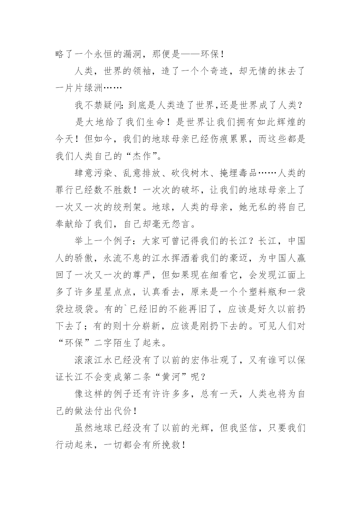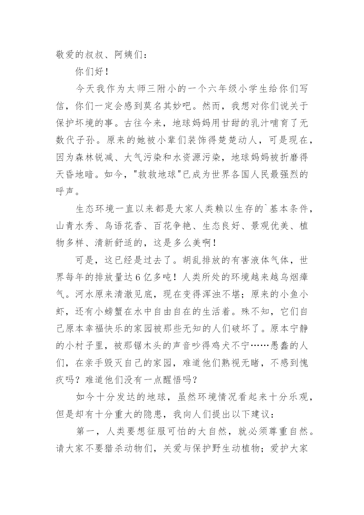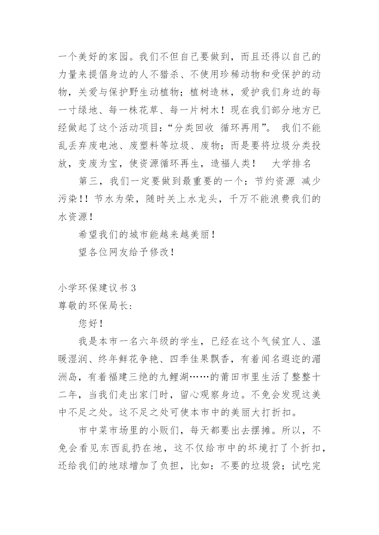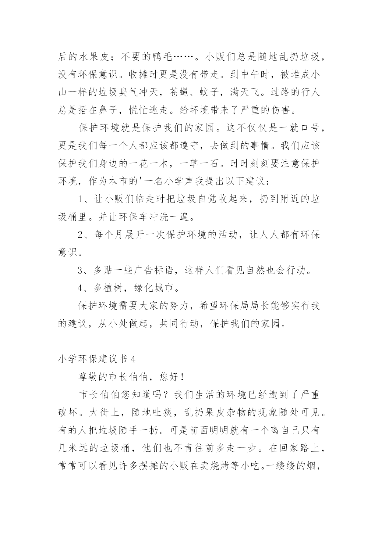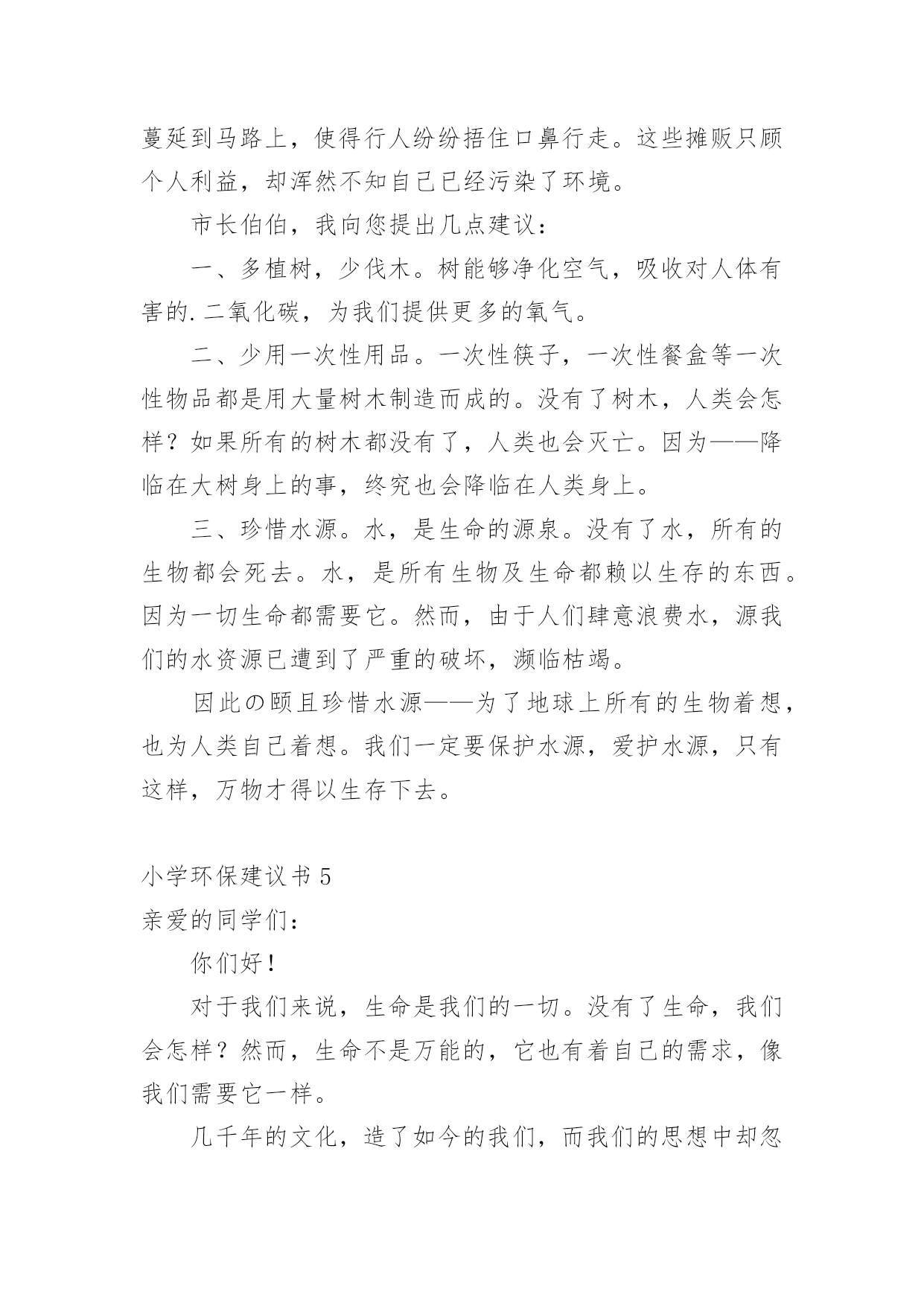 小学环保建议书小学环保建议书(精选15篇)在不断进步的社会中,我们都跟建议书有着直接或间接的联系,建议书是就某项工作提出某种建议时使用的一种常用书信,也叫意见书。大家知道建议书的格式吗?下面是小编收集整理的小学环保建议书,供大家参考借鉴,希望可以帮助到有需要的朋友。小学环保建议书1居委会的叔叔阿姨们您们好:地球让我们生存,让我们保护。地球是我们的家园,我们是地球的小主人。谁不想让我们的家园变的`更美好,更漂亮?而在这个时候,那些卖水果、小吃、蔬菜的叔叔阿姨们,在各个地方摆摊而等到晚上就收摊走人,可他们却没有看到在他们周围到处都是他们丢弃的垃圾,等到再过几天,那些垃圾在地上发臭,苍蝇、蚊子都飞来飞去,让过路的行人都得捂着鼻子,快步走过去。你们有没有想过,就是你们这样乱丢垃圾,给我们的漂亮家园添了点脏。所以,我希望居委会的叔叔阿姨们,让那些摆小摊的小贩在走时带走自己的垃圾,让他们学会爱护好我们美好的家园,在此,我提出几点建议供你们参考:1、请行人自觉爱护公园、路边及其他公共场所的花草树木。2、照顾好自己身边的一草一木、爱护花草。3、希望社会上多增加一些植树、种花草的活动,希望大家积极参加。住在地球上的每一个公民,让我们共同努力,以使我们的地球更漂亮、可爱,使我们生活的环境更美好,人人争做地球的小卫士。小学环保建议书2尊敬的老师,敬爱的同学:你们好!如今十分发达的地球,但是却有十分重大的隐患,这都是人为制造出来的:大肆砍伐树木、建立化工厂、胡乱排放有害液体。“对人类威胁较大的气体,世界每年的排放量达6亿多吨……”看见这一组组令人触目惊心的数字,真是叫人吃惊何感想?从2300万年到1800万年前森林古猿的出现到现在人类高度发达的文明时代,对于每个人从未停止过的`索取,大自然都是“有求必应”的,这更滋长了人类的贪欲。以下是我为这个美丽的城市所提出来的建议,供你们参考!第一,我们要做到讲究卫生,因为那样才能够保护环境!当然就是不能随地吐痰,不乱扔垃圾,不在公共场所吸烟,不制造噪音。第二,我们要保护自然环境,那样万物才能共同生存在一个美好的家园。我们不但自己要做到,而且还得以自己的力量来提倡身边的人不猎杀、不使用珍稀动物和受保护的动物,关爱与保护野生动植物;植树造林,爱护我们身边的每一寸绿地、每一株花草、每一片树木!现在我们部分地方已经做起了这个活动项目:“分类回收循环再用”。我们不能乱丢弃废电池、废塑料等垃圾、废物;而是要将垃圾分类投放,变废为宝,使资源循环再生,造福人类!大学排名第三,我们一定要做到最重要的一个:节约资源减少污染!!节水为荣,随时关上水龙头,千万不能浪费我们的水资源!希望我们的城市能越来越美丽!望各位网友给予修改!小学环保建议书3尊敬的环保局长:您好!我是本市一名六年级的学生,已经在这个气候宜人、温暖湿润、终年鲜花争艳、四季佳果飘香,有着闻名遐迩的湄洲岛,有着福建三绝的九鲤湖……的莆田市里生活了整整十二年,当我们走出家门时,留心观察身边。不免会发现这美中不足之处。这不足之处可使本市中的美丽大打折扣。市中菜市场里的小贩们,每天都要出去摆摊。所以,不免会看见东西乱扔在地,这不仅给市中的坏境打了个折扣,还给我们的地球增加了负担,比如:不要的垃圾袋;试吃完后的水果皮;不要的鸭毛……。小贩们总是随地乱扔垃圾,没有环保意识。收摊时更是没有带走。到中午时,被堆成小山一样的垃圾臭气冲天,苍蝇、蚊子,满天飞。过路的行人总是捂在鼻子,慌忙逃走。给坏境带来了严重的伤害。保护环境就是保护我们的家园。这不仅仅是一就口号,更是我们每一个人都应该都遵守,去做到的事情。我们应该保护我们身边的一花一木,一草一石。时时刻刻要注意保护环境,作为本市的'一名小学声我提出以下建议:1、让小贩们临走时把垃圾自觉收起来,扔到附近的垃圾桶里。并让环保车冲洗一遍。2、每个月展开一次保护环境的活动,让人人都有环保意识。3、多贴一些广告标语,这样人们看见自然也会行动。4、多植树,绿化城市。保护环境需要大家的努力,希望环保局局长能够实行我的建议,从小处做起,共同行动,保护我们的家园。小学环保建议书4尊敬的市长伯伯,您好!市长伯伯您知道吗?我们生活的环境已经遭到了严重破坏。大街上,随地吐痰,乱扔果皮杂物的现象随处可见。有的人把垃圾随手一扔。可是前面明明就有一个离自己只有几米远的垃圾桶,他们也不肯往前多走一步。在回家路上,常常可以看见许多摆摊的小贩在卖烧烤等小吃。一缕缕的烟,蔓延到马路上,使得行人纷纷捂住口鼻行走。这些摊贩只顾个人利益,却浑然不知自己已经污染了环境。市长伯伯,我向您提出几点建议:一、多植树,少伐木。树能够净化空气,吸收对人体有害的.二氧化碳,为我们提供更多的氧气。二、少用一次性用品。一次性筷子,一次性餐盒等一次性物品都是用大量树木制造而成的。没有了树木,人类会