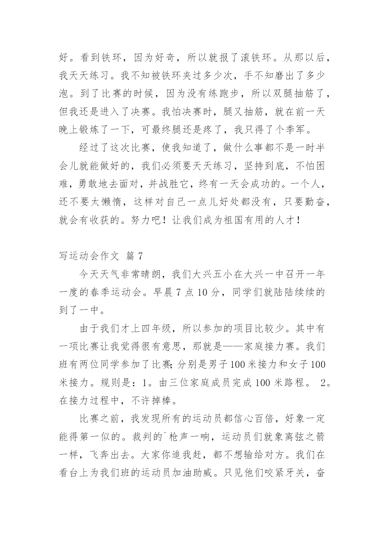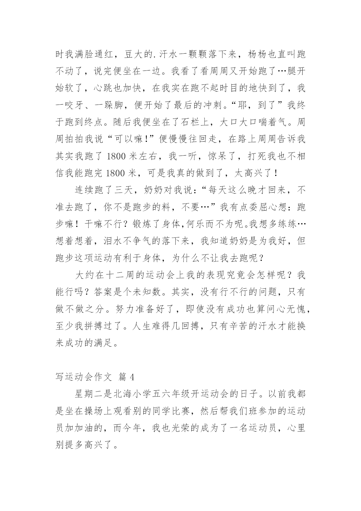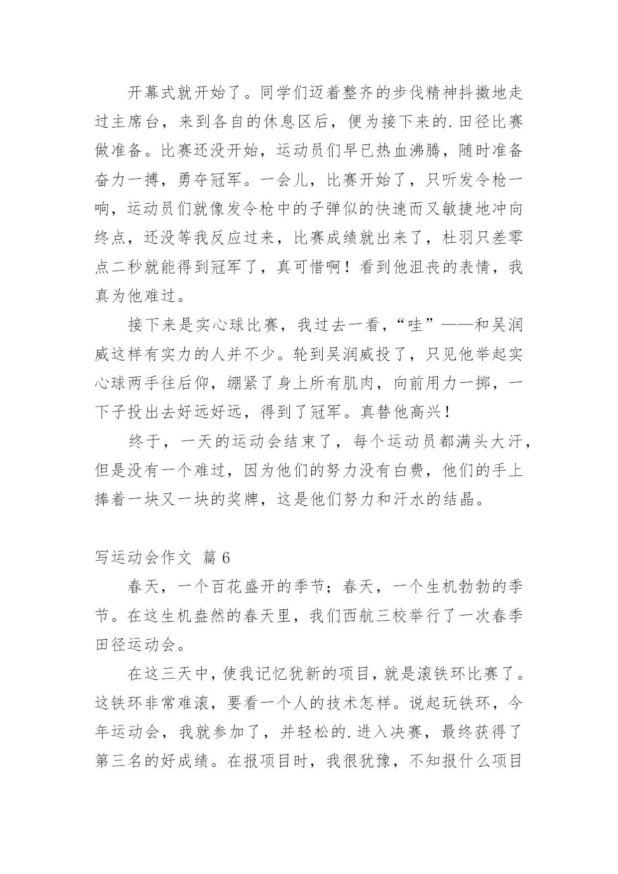 写运动会作文篇1精选写运动会作文汇编七篇在学习、工作乃至生活中,大家总免不了要接触或使用作文吧,作文是通过文字来表达一个主题意义的记叙方法。为了让您在写作文时更加简单方便,下面是小编收集整理的写运动会作文7篇,希望对大家有所帮助。写运动会作文篇1每当我看到鲜艳的五星红旗一次次升起时;每当我听到雄壮的国歌一次次奏响时;每当我看到我国健儿在冠军领奖台上热泪盈眶时,我就热血沸腾。这时,我的理想就是当一名运动员。现在我终于梦想成真了,我是西南八小的一名学生,我为此而骄傲。所谓“台上三分钟,台下十年功”,运动员的生活是艰苦的。除学习、训练,还是训练、学习;冒着严寒,顶着酷暑;风里来,雨里去;拖着疲倦的身子,忍着全身伤疼。我曾经为此而害怕过,动摇过。谁不想过无忧无虑、舒舒服服的生活,然而每当想到“梅花香自苦寒来”,我就咬紧牙关挺过去,投身到火热的训练中去,激烈比赛中去。肉体上的磨练使我越来越强壮,精神上的磨练使我越来越坚强。作为一名运动员,面对的只有成功和失败,然而又有几个是常胜将军呢?记得在校运动会上,我赛前训练和感觉都良好,但在比赛中却因紧张而失败,失败后压力很大,紧接着是节节失败。失败使我不知所措,那种失落和沮丧无法用言语来形容。教练没有责备我,而是跟我讲容国团的故事。当我听到容国团那“人生能有几回搏”的铿锵壮语时,我被震撼了。是呀,人生本身就是进击与退却、振奋与消沉、坚强与懦弱的角逐和竞争,我这小小的失败又算得了什么?在以后的日子里,我胜不骄,败不馁,化压力为动力,顽强拼搏,终于取得了好的'成绩。这时我已知道:人生为何而博,为理想而博,为体育腾飞而博,为祖国富强而博。朋友们,你们看:排球场上,队员们奋力扣杀、飞身救球;足球场上,队员们顽强防守,积极进攻;田径场上,队员们拼命向前,奋力冲刺,这些无疑都是拼搏。正是拼搏,我国的乒乓球才长盛不衰;正是拼搏,我国的羽毛球才成为世界强队;正是拼搏,我们的体操队才长期保持较大的优势。正是拼搏,我国的体育事业才得以蓬勃发展,中国才跻身世界体育强国之列。写运动会作文篇2今天,我们学校在操场上举行了一年一度的运动会。同学们个个都高兴,操场上彩旗飘扬。首先是开幕式,会场上响起了雄壮的运动会进行曲,我们三年级的运动员方队喊着口号紧跟在四年级的'后面昂首挺胸地走进会场,我们立刻报以热烈的掌声。开幕式结束后,运动会的比赛正式开始了。比赛的项目多得数不清,有立跳远、赛跑、投实心球、踢键、跳绳……我参加了立定跳远。信心十足的我看到了四年级三班的李文思就想投降,但是想到赢了就可以为班上挣点分,于是我只下定决心,决不放弃。李文思往前一跳1。75米,啊,这个成绩真叫我忐忑不安。我学着李文思的步法跳,用手甩一甩,然后,再弓身弹腿往前用力一跳1.73,我真不敢相信我能跳得这么远!第三回又要开始了,令我生气的是李文思的眼神好象在说:我是冠军,你跟我斗,门都没有。她慢慢的走到了原地,用力跳上去,我也紧跟着跳上去,我居然比她多1厘米!我高兴地把这一个好消息告诉了我的好朋友,最后我获得了第2名的成绩,我也觉得很满意。不久,紧张、快乐的运动会结束了,我真希望每天都能开展运动会。写运动会作文篇3这学期第十二周也许要开运动会吧!我被周周逼着报了800米。每当有人知道这个消息,都大吃一惊。也是,像我这样瘦弱的女生耐力又不怎么好,怎么能跑完800米呢?我自己心里也没底。报了名的第二天晚上,我和周周、杨杨来到了西林大桥。我们的计划是从西林大桥跑到三桥(大约1500米),抱着试试看的心理。我们三个跑开了,才跑一会我就气喘吁吁,我的鞋带也不争气的时不时散开,我死死的拉了一下,深深的吸了一口气对自己说:“加油”!然后又开跑了,当跑到一半时我满脸通红,豆大的.汗水一颗颗落下来,杨杨也直叫跑不动了,说完便坐在一边。我看了看周周又开始跑了…腿开始软了,心跳也加快,在我实在跑不起时目的地快到了,我一咬牙、一跺脚,便开始了最后的冲刺。“耶,到了”我终于跑到终点。随后我便坐在了石栏上,大口大口喘着气。周周拍拍我说“可以嘛!”便慢慢往回走,在路上周周告诉我其实我跑了1800米左右,我一听,惊呆了,打死我也不相信我能跑完1800米,可是我真的做到了,太高兴了!连续跑了三天,奶奶对我说:“每天这么晚才回来,不准去跑了,你不是跑步的料,不要…”我有点委屈心想:跑步嘛!干嘛不行?锻炼了身体,何乐而不为呢。我想多练练…想着想着,泪水不争气的落下来,我知道奶奶是为我好,但跑步这项运动有利于身体,为什么不让我去跑呢?大约在十二周的运动会上我的表现究竟会怎样呢?我能行吗?答案是个未知数。其实,没有行不行的问题,只有做不做之分。努力准备好了,即使没有成功也算问心无愧,至少我拼搏过了。人生难得几回搏,只有辛苦的汗水才能换来成功的满足。写运动会作文篇4星期二是北海小学五六年级开