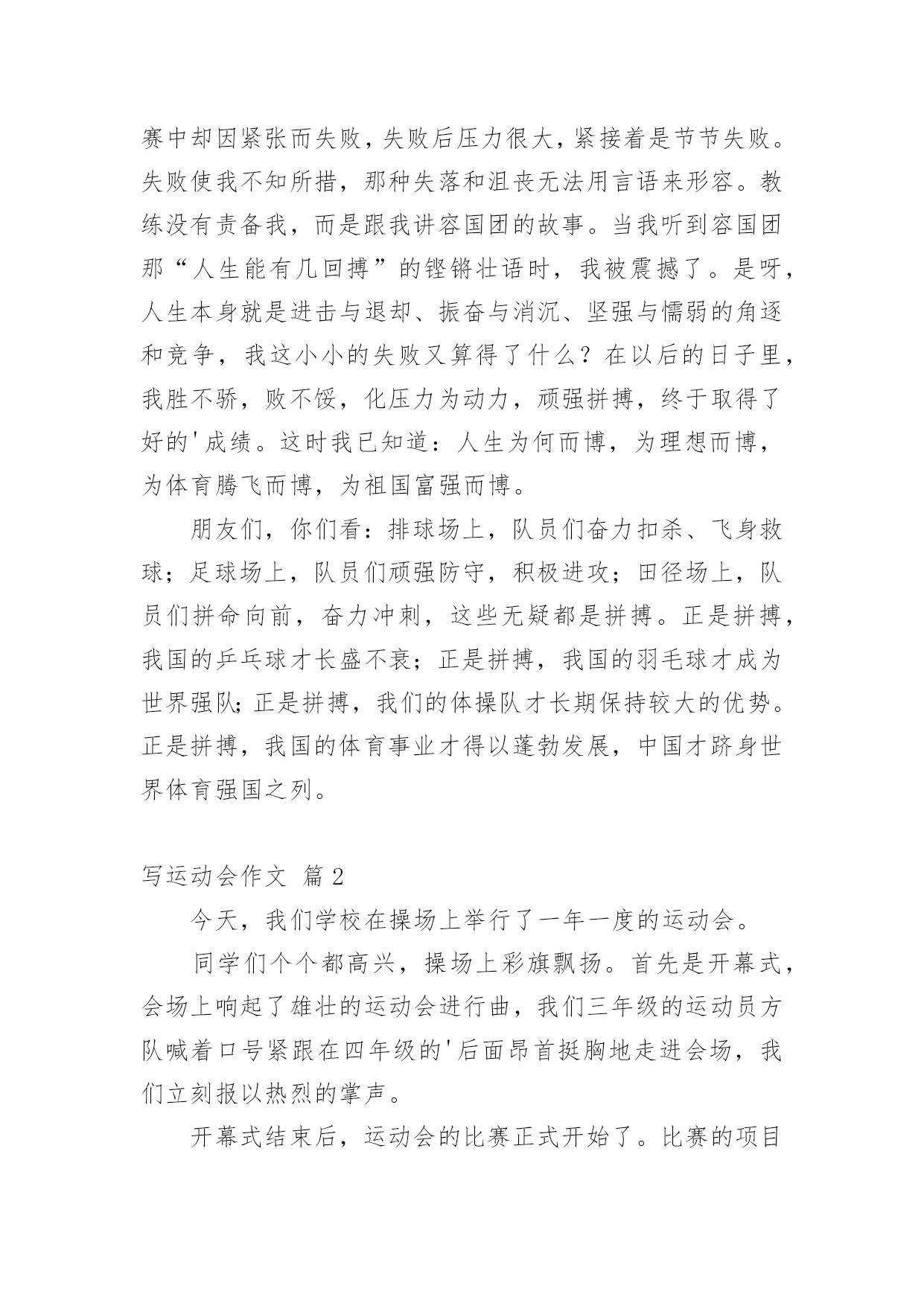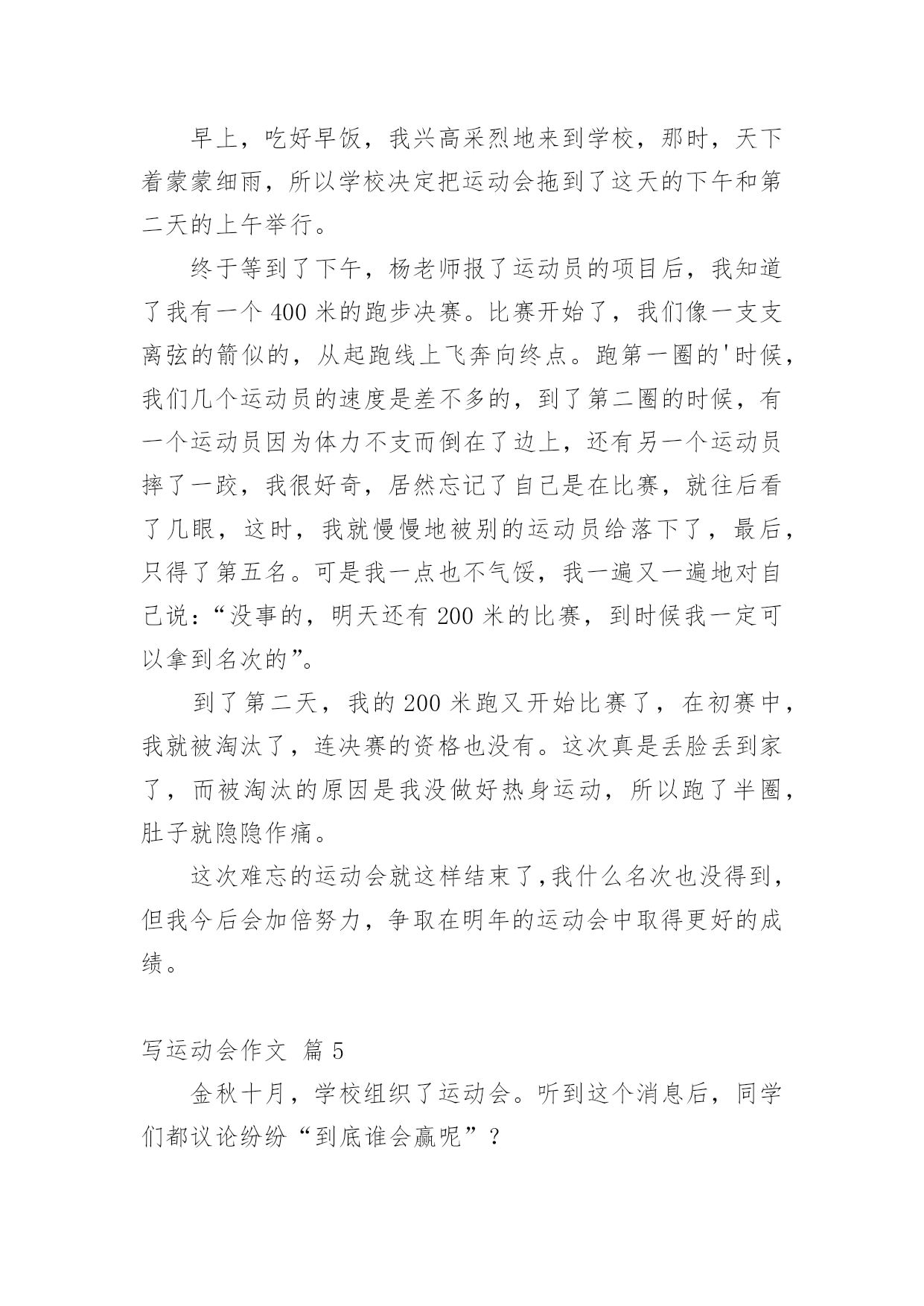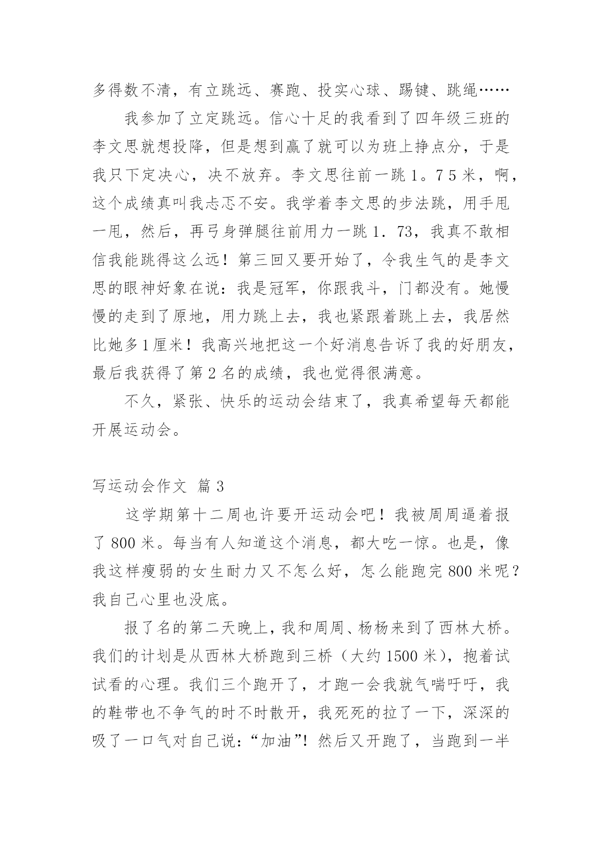 写运动会作文篇1精选写运动会作文汇编七篇在学习、工作乃至生活中,大家总免不了要接触或使用作文吧,作文是通过文字来表达一个主题意义的记叙方法。为了让您在写作文时更加简单方便,下面是小编收集整理的写运动会作文7篇,希望对大家有所帮助。写运动会作文篇1每当我看到鲜艳的五星红旗一次次升起时;每当我听到雄壮的国歌一次次奏响时;每当我看到我国健儿在冠军领奖台上热泪盈眶时,我就热血沸腾。这时,我的理想就是当一名运动员。现在我终于梦想成真了,我是西南八小的一名学生,我为此而骄傲。所谓“台上三分钟,台下十年功”,运动员的生活是艰苦的。除学习、训练,还是训练、学习;冒着严寒,顶着酷暑;风里来,雨里去;拖着疲倦的身子,忍着全身伤疼。我曾经为此而害怕过,动摇过。谁不想过无忧无虑、舒舒服服的生活,然而每当想到“梅花香自苦寒来”,我就咬紧牙关挺过去,投身到火热的训练中去,激烈比赛中去。肉体上的磨练使我越来越强壮,精神上的磨练使我越来越坚强。作为一名运动员,面对的只有成功和失败,然而又有几个是常胜将军呢?记得在校运动会上,我赛前训练和感觉都良好,但在比赛中却因紧张而失败,失败后压力很大,紧接着是节节失败。失败使我不知所措,那种失落和沮丧无法用言语来形容。教练没有责备我,而是跟我讲容国团的故事。当我听到容国团那“人生能有几回搏”的铿锵壮语时,我被震撼了。是呀,人生本身就是进击与退却、振奋与消沉、坚强与懦弱的角逐和竞争,我这小小的失败又算得了什么?在以后的日子里,我胜不骄,败不馁,化压力为动力,顽强拼搏,终于取得了好的'成绩。这时我已知道:人生为何而博,为理想而博,为体育腾飞而博,为祖国富强而博。朋友们,你们看:排球场上,队员们奋力扣杀、飞身救球;足球场上,队员们顽强防守,积极进攻;田径场上,队员们拼命向前,奋力冲刺,这些无疑都是拼搏。正是拼搏,我国的乒乓球才长盛不衰;正是拼搏,我国的羽毛球才成为世界强队;正是拼搏,我们的体操队才长期保持较大的优势。正是拼搏,我国的体育事业才得以蓬勃发展,中国才跻身世界体育强国之列。写运动会作文篇2今天,我们学校在操场上举行了一年一度的运动会。同学们个个都高兴,操场上彩旗飘扬。首先是开幕式,会场上响起了雄壮的运动会进行曲,我们三年级的运动员方队喊着口号紧跟在四年级的'后面昂首挺胸地走进会场,我们立刻报以热烈的掌声。开幕式结束后,运动会的比赛正式开始了。比赛的项目多得数不清,有立跳远、赛跑、投实心球、踢键、跳绳……我参加了立定跳远。信心十足的我看到了四年级三班的李文思就想投降,但是想到赢了就可以为班上挣点分,于是我只下定决心,决不放弃。李文思往前一跳1。75米,啊,这个成绩真叫我忐忑不安。我学着李文思的步法跳,用手甩一甩,然后,再弓身弹腿往前用力一跳1.73,我真不敢相信我能跳得这么远!第三回又要开始了,令我生气的是李文思的眼神好象在说:我是冠军,你跟我斗,门都没有。她慢慢的走到了原地,用力跳上去,我也紧跟着跳上去,我居然比她多1厘米!我高兴地把这一个好消息告诉了我的好朋友,最后我获得了第2名的成绩,我也觉得很满意。不久,紧张、快乐的运动会结束了,我真希望每天都能开展运动会。写运动会作文篇3这学期第十二周也许要开运动会吧!我被周周逼着报了800米。每当有人知道这个消息,都大吃一惊。也是,像我这样瘦弱的女生耐力又不怎么好,怎么能跑完800米呢?我自己心里也没底。报了名的第二天晚上,我和周周、杨杨来到了西林大桥。我们的计划是从西林大桥跑到三桥(大约1500米),抱着试试看的心理。我们三个跑开了,才跑一会我就气喘吁吁,我的鞋带也不争气的时不时散开,我死死的拉了一下,深深的吸了一口气对自己说:“加油”!然后又开跑了,当跑到一半时我满脸通红,豆大的.汗水一颗颗落下来,杨杨也直叫跑不动了,说完便坐在一边。我看了看周周又开始跑了…腿开始软了,心跳也加快,在我实在跑不起时目的地快到了,我一咬牙、一跺脚,便开始了最后的冲刺。“耶,到了”我终于跑到终点。随后我便坐在了石栏上,大口大口喘着气。周周拍拍我说“可以嘛!”便慢慢往回走,在路上周周告诉我其实我跑了1800米左右,我一听,惊呆了,打死我也不相信我能跑完1800米,可是我真的做到了,太高兴了!连续跑了三天,奶奶对我说:“每天这么晚才回来,不准去跑了,你不是跑步的料,不要…”我有点委屈心想:跑步嘛!干嘛不行?锻炼了身体,何乐而不为呢。我想多练练…想着想着,泪水不争气的落下来,我知道奶奶是为我好,但跑步这项运动有利于身体,为什么不让我去跑呢?大约在十二周的运动会上我的表现究竟会怎样呢?我能行吗?答案是个未知数。其实,没有行不行的问题,只有做不做之分。努力准备好了,即使没有成功也算问心无愧,至少我拼搏过了。人生难得几回搏,只有辛苦的汗水才能换来成功的满足。写运动会作文篇4星期二是北海小学五六年级开
