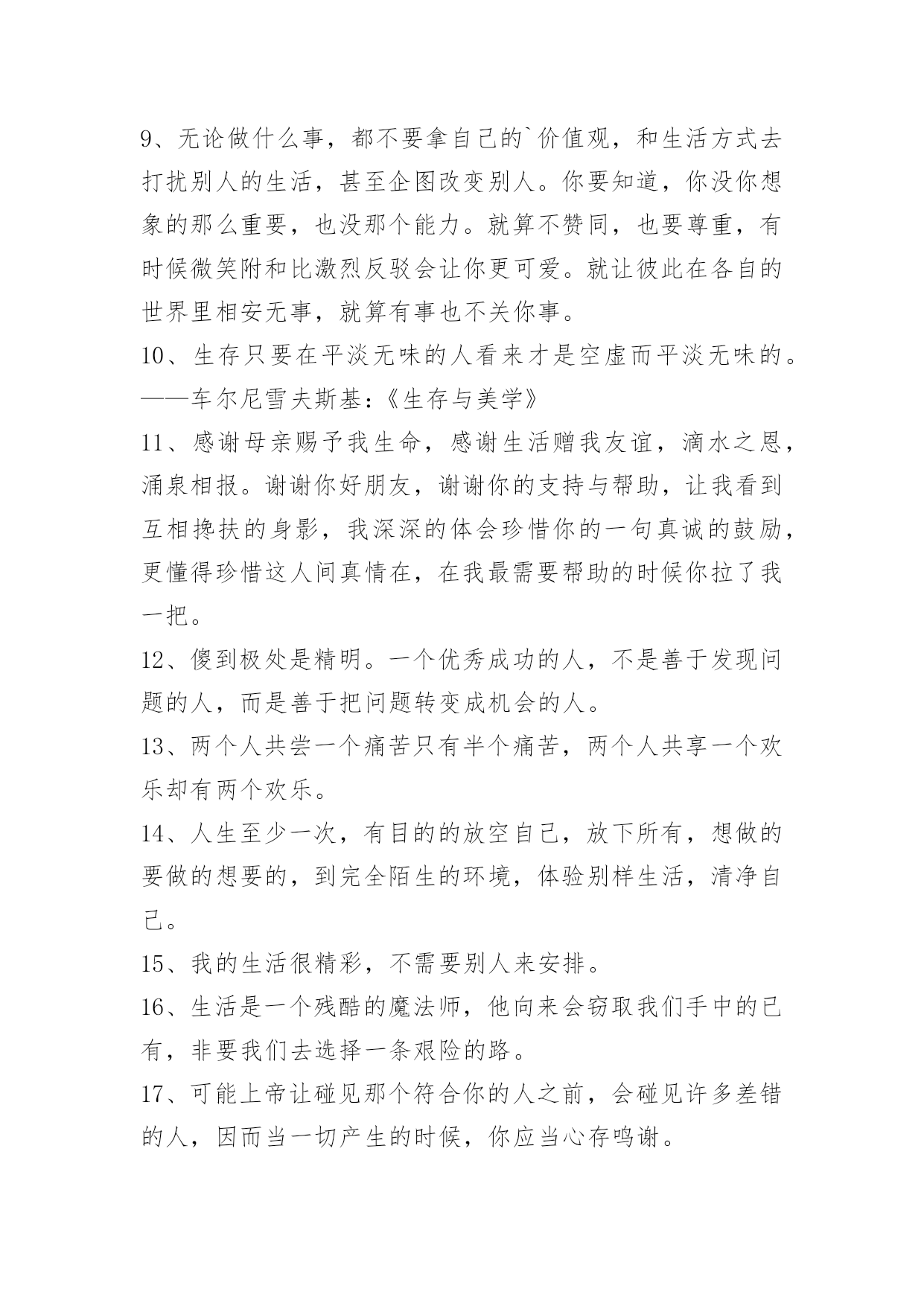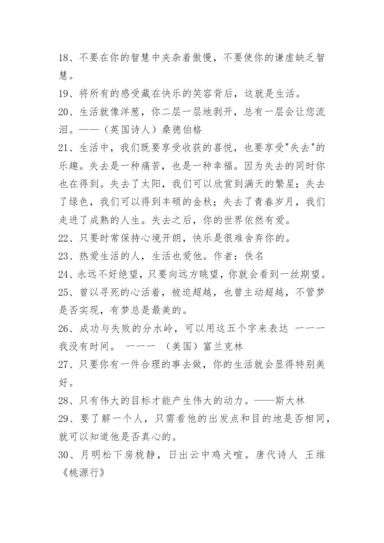 生活唯美名句说说生活唯美名句说说(通用30句)人的生活不但活命而已,而且要活得好,不但物质方面要好,精神方面也要好。——[中国]叶圣陶下面是小编特意为各位读者收集的生活唯美名句说说,供大家参考。1、去追求你的巅峰、你的目标、你的奖赏。2、什么才是真正的朋友:是不一定要门当户对,但一定要同舟共济;不一定要形影不离,但一定要心心相惜;不一定要锦上添花,但一定要雪中送炭;不一定要天天见面,但一定要放在心里。3、你不得不随遇而安,但是,你应该努力按照你向往的方式去生活。——坎贝尔4、走自己的路,让人家去说吧!——但丁5、黑夜的转弯是白天,愤怒的转弯是快乐,有时候让心情转个弯就好。6、每一个人的生活都应该像河水一样——开始是细小的,被限制在狭窄的两岸之间,然后热烈地冲过巨石,滑下瀑布。渐渐地,河道变宽了,河岸扩展了,河水流得平稳了。最后河水流入了海洋,不再有明显的间断和停顿,而后便毫无痛苦地摆脱了自身的存在。7、百里不同风,千里不同俗。8、只有生活中的弱者才会这样祈祷:"把我这满是烦恼的爱情熄灭了吧!"——佚名9、无论做什么事,都不要拿自己的`价值观,和生活方式去打扰别人的生活,甚至企图改变别人。你要知道,你没你想象的那么重要,也没那个能力。就算不赞同,也要尊重,有时候微笑附和比激烈反驳会让你更可爱。就让彼此在各自的世界里相安无事,就算有事也不关你事。10、生存只要在平淡无味的人看来才是空虚而平淡无味的。——车尔尼雪夫斯基:《生存与美学》11、感谢母亲赐予我生命,感谢生活赠我友谊,滴水之恩,涌泉相报。谢谢你好朋友,谢谢你的支持与帮助,让我看到互相搀扶的身影,我深深的体会珍惜你的一句真诚的鼓励,更懂得珍惜这人间真情在,在我最需要帮助的时候你拉了我一把。12、傻到极处是精明。一个优秀成功的人,不是善于发现问题的人,而是善于把问题转变成机会的人。13、两个人共尝一个痛苦只有半个痛苦,两个人共享一个欢乐却有两个欢乐。14、人生至少一次,有目的的放空自己,放下所有,想做的要做的想要的,到完全陌生的环境,体验别样生活,清净自己。15、我的生活很精彩,不需要别人来安排。16、生活是一个残酷的魔法师,他向来会窃取我们手中的已有,非要我们去选择一条艰险的路。17、可能上帝让碰见那个符合你的人之前,会碰见许多差错的人,因而当一切产生的时候,你应当心存鸣谢。18、不要在你的智慧中夹杂着傲慢,不要使你的谦虚缺乏智慧。19、将所有的感受藏在快乐的笑容背后,这就是生活。20、生活就像洋葱,你二层一层地剥开,总有一层会让您流泪。——(英国诗人)桑德伯格21、生活中,我们既要享受收获的喜悦,也要享受"失去"的乐趣。失去是一种痛苦,也是一种幸福。因为失去的同时你也在得到。失去了太阳,我们可以欣赏到满天的繁星;失去了绿色,我们可以得到丰硕的金秋;失去了青春岁月,我们走进了成熟的人生。失去之后,你的世界依然有爱。22、只要时常保持心境开朗,快乐是很难舍弃你的。23、热爱生活的人,生活也爱他。作者:佚名24、永远不好绝望,只要向远方眺望,你就会看到一丝期望。25、曾以寻死的心活着,被迫超越,也曾主动超越,不管梦是否实现,有梦总是最美的。26、成功与失败的分水岭,可以用这五个字来表达一一一我没有时间。一一一(美国)富兰克林27、只要你有一件合理的事去做,你的生活就会显得特别美好。28、只有伟大的目标才能产生伟大的动力。——斯大林29、要了解一个人,只需看他的出发点和目的地是否相同,就可以知道他是否真心的。30、月明松下房栊静,日出云中鸡犬喧。唐代诗人王维《桃源行》