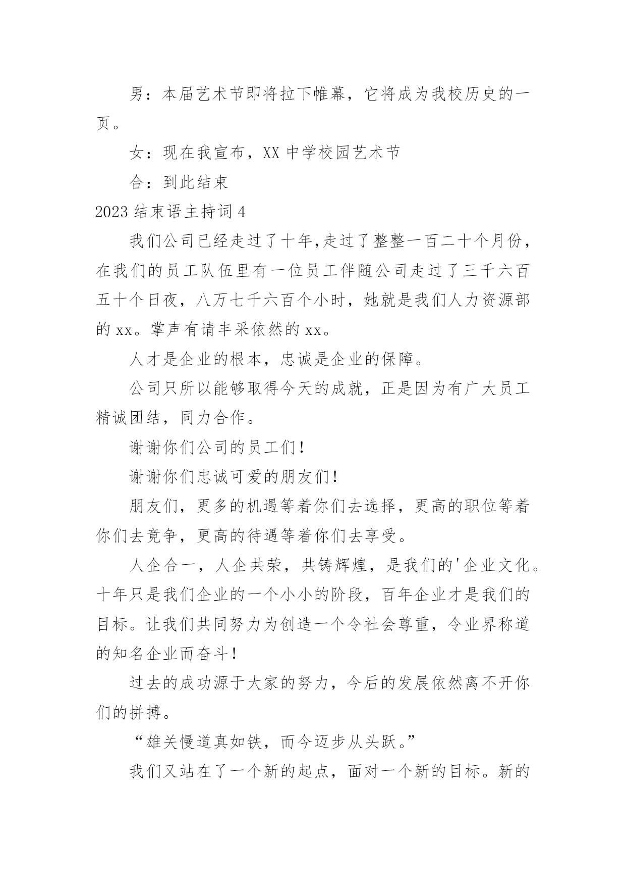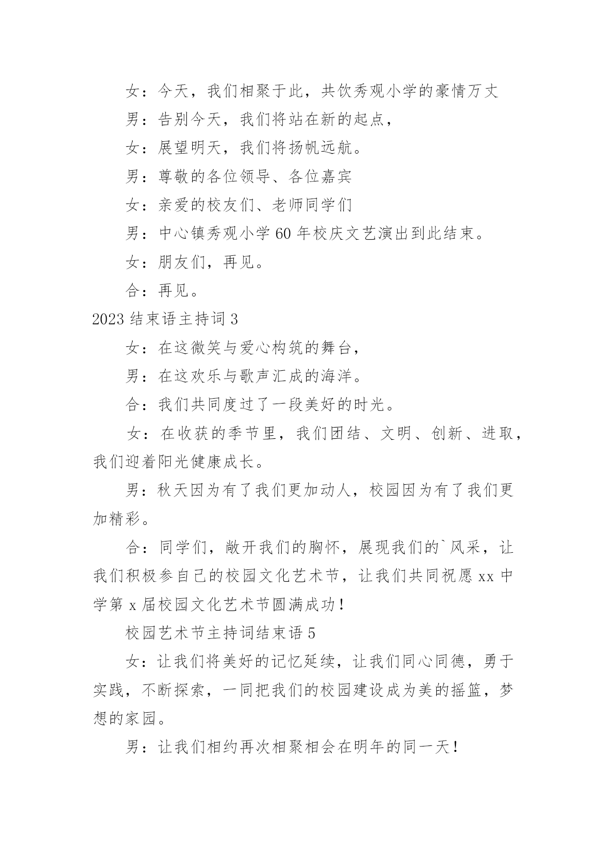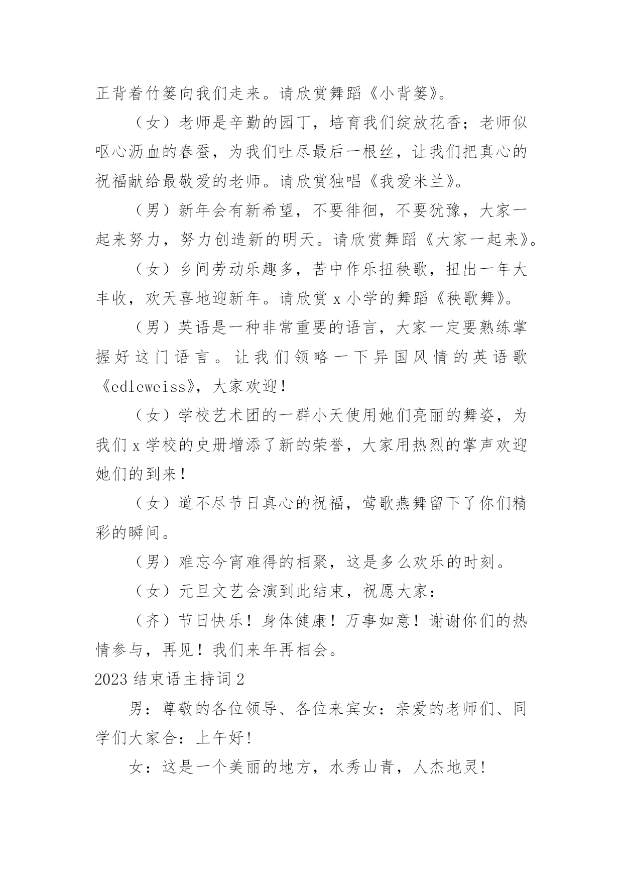 结束语主持词2023结束语主持词主持词要尽量增加文化内涵、寓教于乐,不断提高观众的文化知识和素养。在人们越来越多的参与各种活动的今天,司仪等是很多场合都需要的角色,现在你是否对主持词一筹莫展呢?以下是小编帮大家整理的2023结束语主持词,欢迎大家借鉴与参考,希望对大家有所帮助。2023结束语主持词1(男)新年的钟声将即将响起,我们又将迎来万象更新的春天。(女)回首逝去的一年,我们有收获的喜悦,在我们的肩上承载着新的希望。(男)今天,我们欢聚一堂,共同庆祝20xx年的元旦。(女)今天,我们载歌载舞,一起憧憬20xx年的辉煌。(男)现在我宣布,xx学校20xx年度元旦文艺会演——(齐)现在开始!(女)胸前飘扬鲜红的领巾,塑造出我们虞城少年飒爽的英姿;脚下飞舞的七彩花毽,谱写出我们健康向上新的诗篇。请欣赏舞蹈《虞城脚下踢花毽》。(男)欢庆的锣鼓敲起来吧,欢乐的歌儿唱起来吧,请欣赏x小学带来的热闹非凡的舞蹈《欢庆》,掌声欢迎!(女)共产党像太阳,照得我们心里亮,伸伸手,摇一摇,摇碎点点的金黄。请欣赏舞蹈《摇太阳》。(男)听,琴声多悠扬,在x同学灵巧的双指间,弹奏出的是跳动的音符,大家一起来欣赏她的'电子琴独奏《在五月》。(女)红星闪闪放光彩,红星闪闪暖人心,党的关怀说不尽,社会主义明媚光。请欣赏x小学的歌舞表演《红星歌》。(男)欢乐生活蹦蹦跳,欢声笑语此文来源于是就文齐飞扬,少先队员挥挥手,舞出幸福又一年,请欣赏舞蹈《蹦蹦蹦》。(女)《二泉映月》被千古传诵,《十面埋伏》被精彩演绎,古筝之音如潺潺溪水,下面由x同学为大家献上一曲古筝独奏,大家欢迎。(男)火辣辣的日子火辣辣的心,火辣辣的音乐里走来一群火辣辣的妹子。请欣赏x小学的舞蹈《辣妹子》。(女)少林武功木兰拳,武当昆仑显神威,中国功夫不得了,世界各国刮目看。请欣赏舞蹈《功夫》。(男)《回家》之声拨动心弦,《好一朵茉莉花》魅力四射,萨克斯的西洋风情一定值得留恋。大家欢迎x同学为大家演奏一段萨克斯独奏《雪绒花》。(女)爱我中华,炎黄子孙热血相融;爱我中华,千万儿女纵情呼唤。请欣赏x小学的舞蹈《爱我中华》。(男)踏着灿烂的朝霞,穿过苍翠的竹林,一群小姑娘正背着竹篓向我们走来。请欣赏舞蹈《小背篓》。(女)老师是辛勤的园丁,培育我们绽放花香;老师似呕心沥血的春蚕,为我们吐尽最后一根丝,让我们把真心的祝福献给最敬爱的老师。请欣赏独唱《我爱米兰》。(男)新年会有新希望,不要徘徊,不要犹豫,大家一起来努力,努力创造新的明天。请欣赏舞蹈《大家一起来》。(女)乡间劳动乐趣多,苦中作乐扭秧歌,扭出一年大丰收,欢天喜地迎新年。请欣赏x小学的舞蹈《秧歌舞》。(男)英语是一种非常重要的语言,大家一定要熟练掌握好这门语言。让我们领略一下异国风情的英语歌《edleweiss》,大家欢迎!(女)学校艺术团的一群小天使用她们亮丽的舞姿,为我们x学校的史册增添了新的荣誉,大家用热烈的掌声欢迎她们的到来!(女)道不尽节日真心的祝福,莺歌燕舞留下了你们精彩的瞬间。(男)难忘今宵难得的相聚,这是多么欢乐的时刻。(女)元旦文艺会演到此结束,祝愿大家:(齐)节日快乐!身体健康!万事如意!谢谢你们的热情参与,再见!我们来年再相会。2023结束语主持词2男:尊敬的各位领导、各位来宾女:亲爱的老师们、同学们大家合:上午好!女:这是一个美丽的地方,水秀山青,人杰地灵!男:这是一个神奇的地方,令人魂牵梦萦,绽放理想!女:历经半个多世纪的岁月流金,秀小与共和国一同成长男:历经半个多世纪的风霜洗礼,我们在此共同回望女:60个岁月,峥嵘如歌。男:60年征途,风雨如磐。女:60载春秋,成绩斐然。男:60年历史,桃李芬芳!女:60年啊,多少青丝染银霜,昔日的莘莘学子,今天的国家栋梁男:扎根祖国的四面八方,贡献着自己的青春和力量女:是你们延伸了母校的天空男:是你们铸就了母校的辉煌女:带着青春的活力和时代的气息,奏响了校园的旋律男:秀观小学与时俱进,和时代的脉搏跳在一起,“三立教育”、“感恩教育”、“德文基金”独领风x:60年的'酿造,秀观小学如一坛散发着醇香的老酒,还未品尝,已然心醉男:请欣赏云鹏基点校的孩子们给我们带来的《春天的故事》《越走路越宽》秀小60年的历史,是一部辉煌的创业发展史,在这60年中,老师们甘受清贫,励精图治,默默奉献。培养出无数国家栋梁,社会精英。正是因为有了他们的这种精神,才使得秀小从无到有,越来越好。相信有了他们的这种精神,秀小以后会更加的辉煌,道路越走越宽。下面请欣赏杨银给我们带来的《越走路越宽》《太极拳》男:注目金灿灿的奖牌,每一项殊荣都显示出秀小前进的足迹。翻开厚厚的纪念册,每一个称号都体现出秀小教师的品牌。60年精髓造就秀小风采。60年辉煌谱写华丽乐章。请欣赏秀观初中的同学们为大家献上的太极拳。《秀观小学我一生的骄
