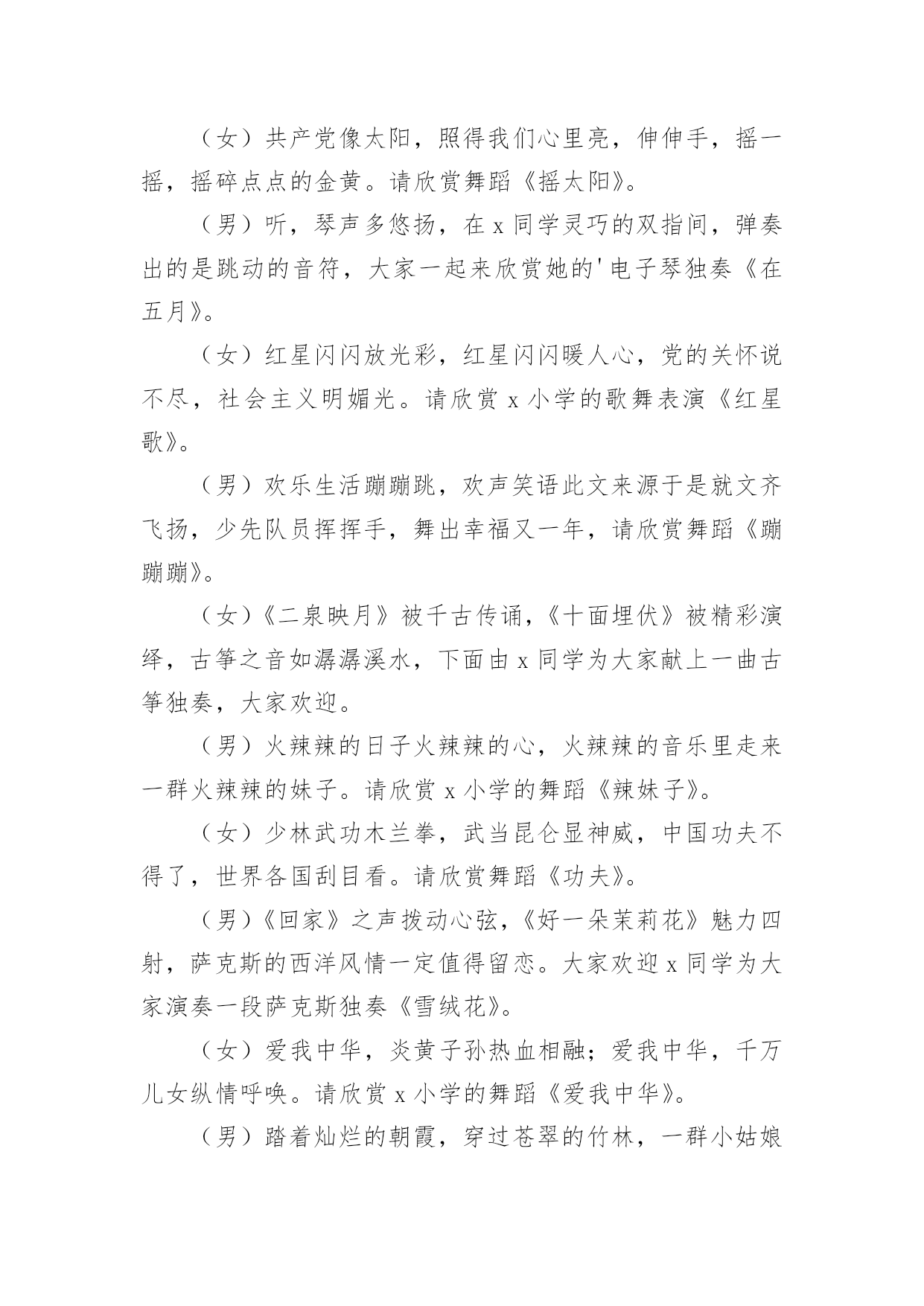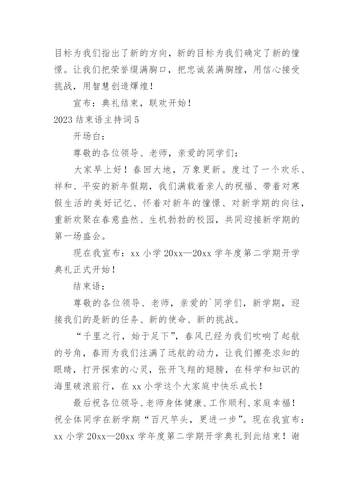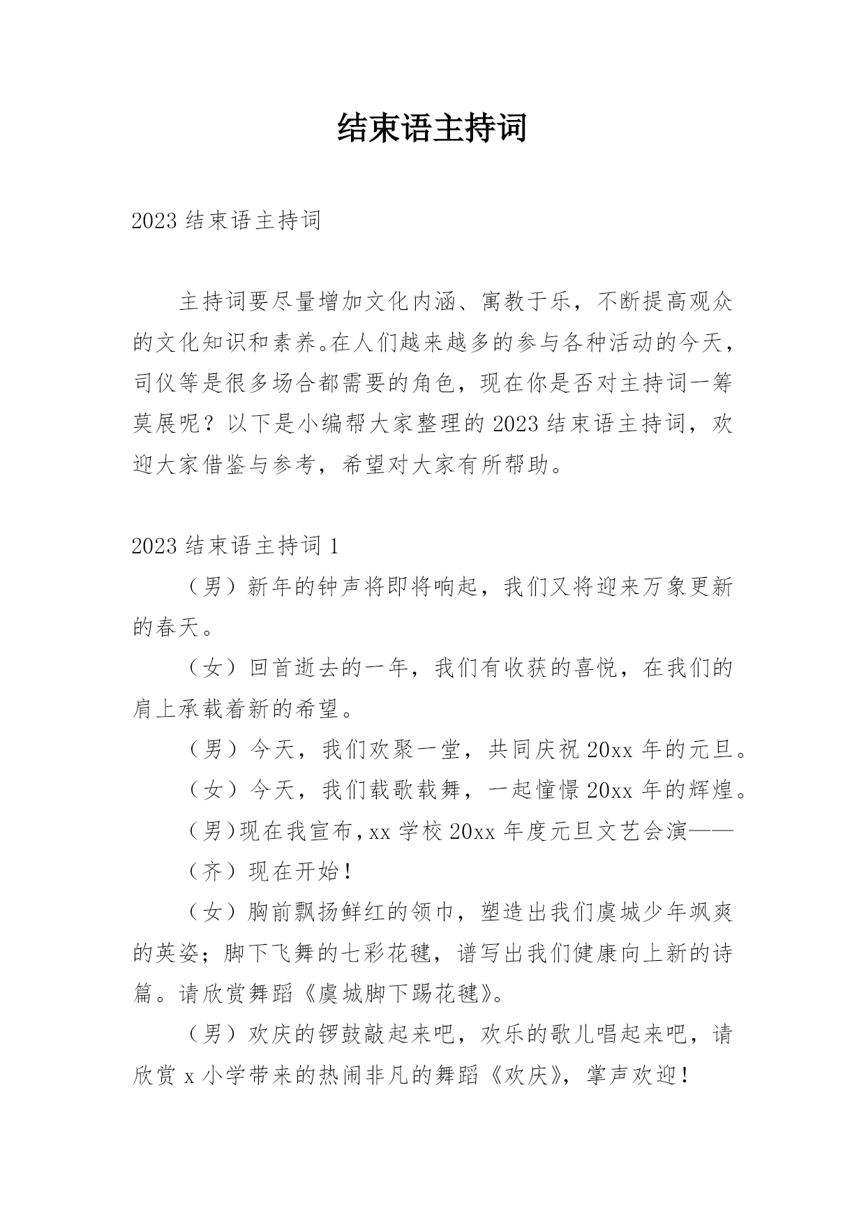 结束语主持词2023结束语主持词主持词要尽量增加文化内涵、寓教于乐,不断提高观众的文化知识和素养。在人们越来越多的参与各种活动的今天,司仪等是很多场合都需要的角色,现在你是否对主持词一筹莫展呢?以下是小编帮大家整理的2023结束语主持词,欢迎大家借鉴与参考,希望对大家有所帮助。2023结束语主持词1(男)新年的钟声将即将响起,我们又将迎来万象更新的春天。(女)回首逝去的一年,我们有收获的喜悦,在我们的肩上承载着新的希望。(男)今天,我们欢聚一堂,共同庆祝20xx年的元旦。(女)今天,我们载歌载舞,一起憧憬20xx年的辉煌。(男)现在我宣布,xx学校20xx年度元旦文艺会演——(齐)现在开始!(女)胸前飘扬鲜红的领巾,塑造出我们虞城少年飒爽的英姿;脚下飞舞的七彩花毽,谱写出我们健康向上新的诗篇。请欣赏舞蹈《虞城脚下踢花毽》。(男)欢庆的锣鼓敲起来吧,欢乐的歌儿唱起来吧,请欣赏x小学带来的热闹非凡的舞蹈《欢庆》,掌声欢迎!(女)共产党像太阳,照得我们心里亮,伸伸手,摇一摇,摇碎点点的金黄。请欣赏舞蹈《摇太阳》。(男)听,琴声多悠扬,在x同学灵巧的双指间,弹奏出的是跳动的音符,大家一起来欣赏她的'电子琴独奏《在五月》。(女)红星闪闪放光彩,红星闪闪暖人心,党的关怀说不尽,社会主义明媚光。请欣赏x小学的歌舞表演《红星歌》。(男)欢乐生活蹦蹦跳,欢声笑语此文来源于是就文齐飞扬,少先队员挥挥手,舞出幸福又一年,请欣赏舞蹈《蹦蹦蹦》。(女)《二泉映月》被千古传诵,《十面埋伏》被精彩演绎,古筝之音如潺潺溪水,下面由x同学为大家献上一曲古筝独奏,大家欢迎。(男)火辣辣的日子火辣辣的心,火辣辣的音乐里走来一群火辣辣的妹子。请欣赏x小学的舞蹈《辣妹子》。(女)少林武功木兰拳,武当昆仑显神威,中国功夫不得了,世界各国刮目看。请欣赏舞蹈《功夫》。(男)《回家》之声拨动心弦,《好一朵茉莉花》魅力四射,萨克斯的西洋风情一定值得留恋。大家欢迎x同学为大家演奏一段萨克斯独奏《雪绒花》。(女)爱我中华,炎黄子孙热血相融;爱我中华,千万儿女纵情呼唤。请欣赏x小学的舞蹈《爱我中华》。(男)踏着灿烂的朝霞,穿过苍翠的竹林,一群小姑娘正背着竹篓向我们走来。请欣赏舞蹈《小背篓》。(女)老师是辛勤的园丁,培育我们绽放花香;老师似呕心沥血的春蚕,为我们吐尽最后一根丝,让我们把真心的祝福献给最敬爱的老师。请欣赏独唱《我爱米兰》。(男)新年会有新希望,不要徘徊,不要犹豫,大家一起来努力,努力创造新的明天。请欣赏舞蹈《大家一起来》。(女)乡间劳动乐趣多,苦中作乐扭秧歌,扭出一年大丰收,欢天喜地迎新年。请欣赏x小学的舞蹈《秧歌舞》。(男)英语是一种非常重要的语言,大家一定要熟练掌握好这门语言。让我们领略一下异国风情的英语歌《edleweiss》,大家欢迎!(女)学校艺术团的一群小天使用她们亮丽的舞姿,为我们x学校的史册增添了新的荣誉,大家用热烈的掌声欢迎她们的到来!(女)道不尽节日真心的祝福,莺歌燕舞留下了你们精彩的瞬间。(男)难忘今宵难得的相聚,这是多么欢乐的时刻。(女)元旦文艺会演到此结束,祝愿大家:(齐)节日快乐!身体健康!万事如意!谢谢你们的热情参与,再见!我们来年再相会。2023结束语主持词2男:尊敬的各位领导、各位来宾女:亲爱的老师们、同学们大家合:上午好!女:这是一个美丽的地方,水秀山青,人杰地灵!男:这是一个神奇的地方,令人魂牵梦萦,绽放理想!女:历经半个多世纪的岁月流金,秀小与共和国一同成长男:历经半个多世纪的风霜洗礼,我们在此共同回望女:60个岁月,峥嵘如歌。男:60年征途,风雨如磐。女:60载春秋,成绩斐然。男:60年历史,桃李芬芳!女:60年啊,多少青丝染银霜,昔日的莘莘学子,今天的国家栋梁男:扎根祖国的四面八方,贡献着自己的青春和力量女:是你们延伸了母校的天空男:是你们铸就了母校的辉煌女:带着青春的活力和时代的气息,奏响了校园的旋律男:秀观小学与时俱进,和时代的脉搏跳在一起,“三立教育”、“感恩教育”、“德文基金”独领风x:60年的'酿造,秀观小学如一坛散发着醇香的老酒,还未品尝,已然心醉男:请欣赏云鹏基点校的孩子们给我们带来的《春天的故事》《越走路越宽》秀小60年的历史,是一部辉煌的创业发展史,在这60年中,老师们甘受清贫,励精图治,默默奉献。培养出无数国家栋梁,社会精英。正是因为有了他们的这种精神,才使得秀小从无到有,越来越好。相信有了他们的这种精神,秀小以后会更加的辉煌,道路越走越宽。下面请欣赏杨银给我们带来的《越走路越宽》《太极拳》男:注目金灿灿的奖牌,每一项殊荣都显示出秀小前进的足迹。翻开厚厚的纪念册,每一个称号都体现出秀小教师的品牌。60年精髓造就秀小风采。60年辉煌谱写华丽乐章。请欣赏秀观初中的同学们为大家献上的太极拳。《秀观小学我一生的骄