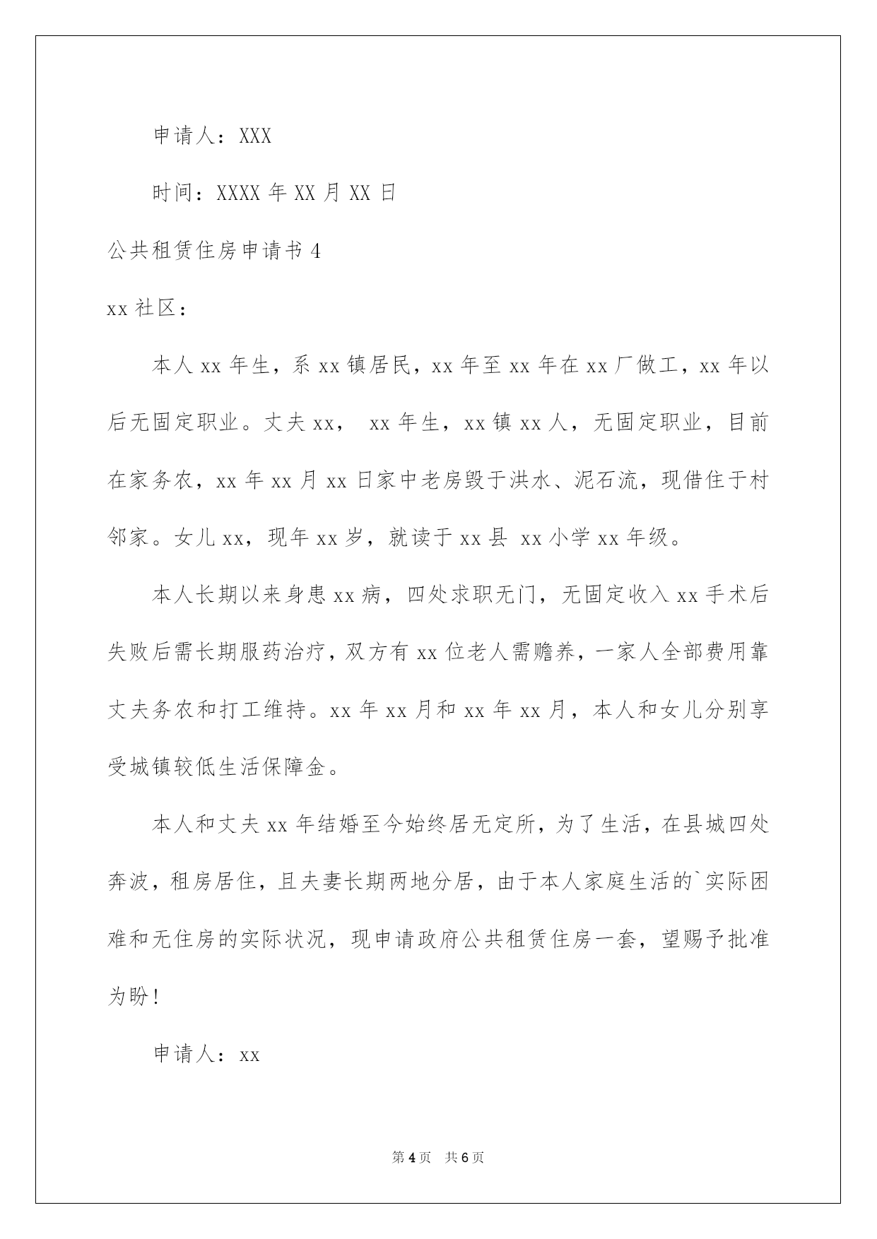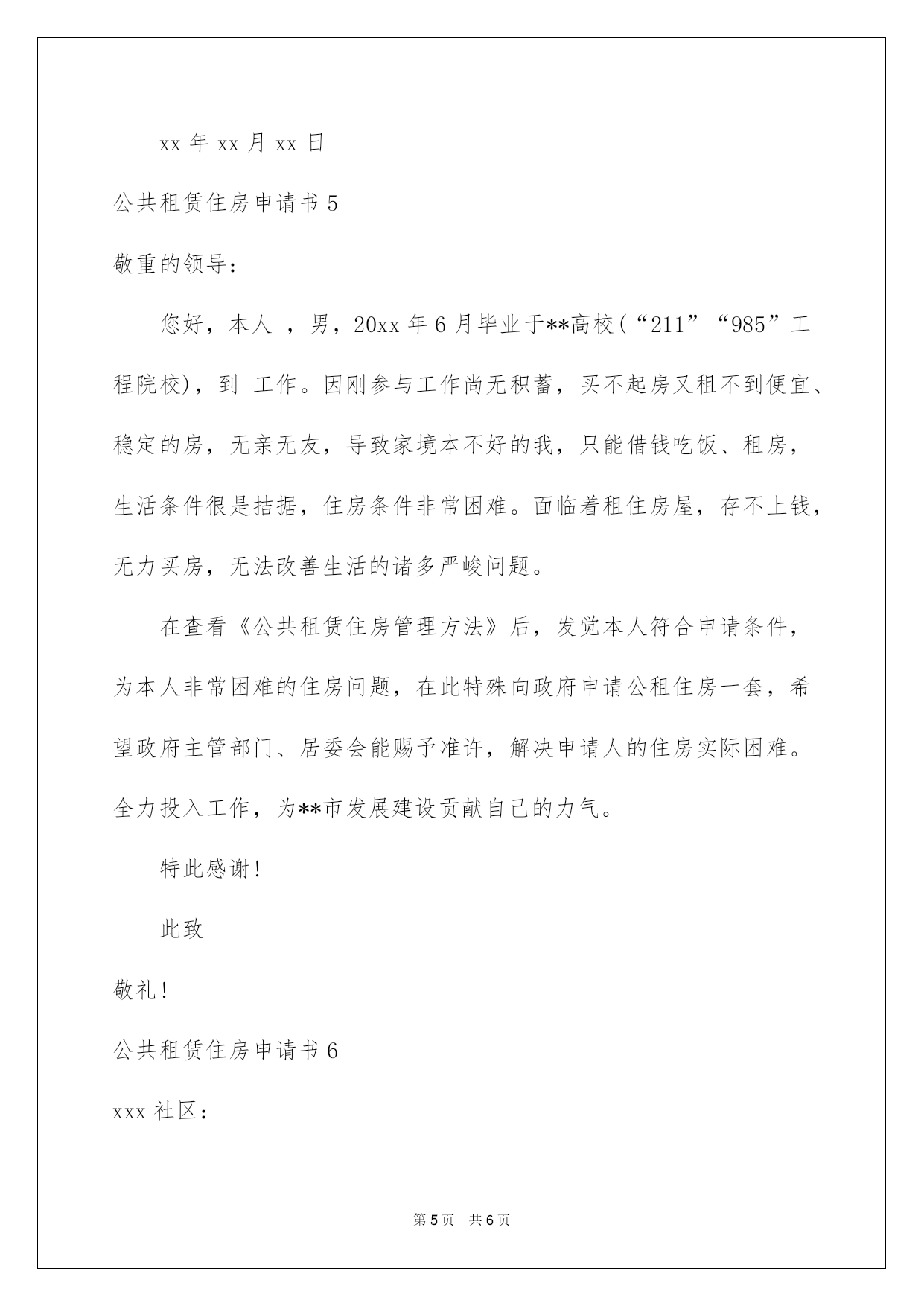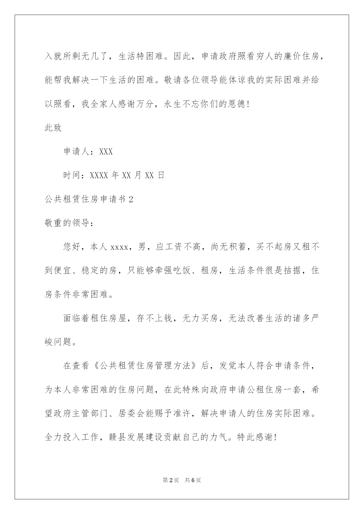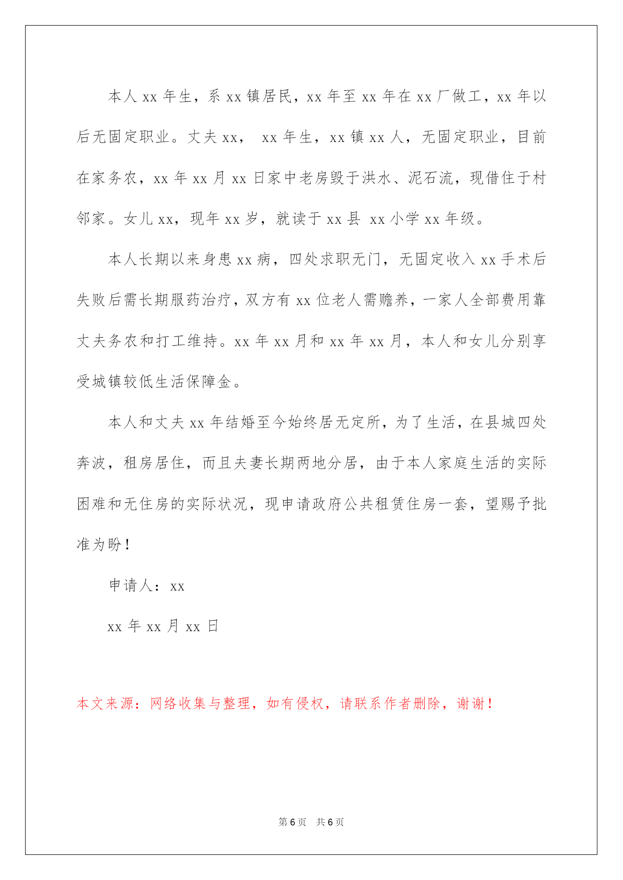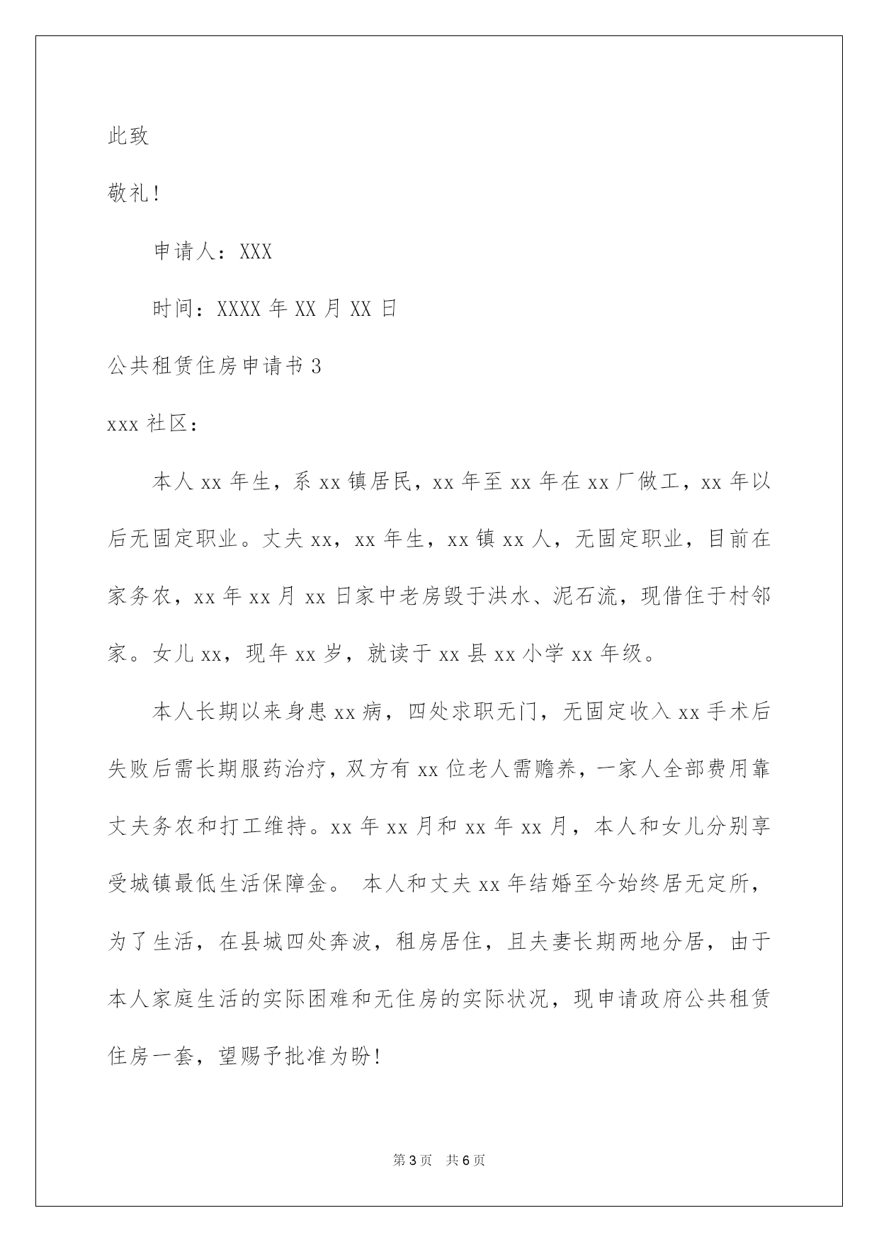 第PAGE\*Arabic\*MERGEFORMAT6页共NUMPAGES\*Arabic\*MERGEFORMAT6页第PAGE\*MERGEFORMAT6页共NUMPAGES\*MERGEFORMAT6页第PAGE\*MERGEFORMAT6页共NUMPAGES\*MERGEFORMAT6页第PAGE\*MERGEFORMAT6页共NUMPAGES\*MERGEFORMAT6页第PAGE\*MERGEFORMAT6页共NUMPAGES\*MERGEFORMAT6页第PAGE\*MERGEFORMAT6页共NUMPAGES\*MERGEFORMAT6页第PAGE\*MERGEFORMAT6页共NUMPAGES\*MERGEFORMAT6页第PAGE\*MERGEFORMAT6页共NUMPAGES\*MERGEFORMAT6页第PAGE\*MERGEFORMAT6页共NUMPAGES\*MERGEFORMAT6页第PAGE\*MERGEFORMAT6页共NUMPAGES\*MERGEFORMAT6页第PAGE\*MERGEFORMAT6页共NUMPAGES\*MERGEFORMAT6页2022公共租赁住房申请书公共租赁住房申请书我们眼下的社会,我们会常常运用申请书,请留意不同的对象有不同的申请书。但是你知道怎样才能写的好吗?以下是我为大家收集的公共租赁住房申请书,仅供参考,大家一起来看看吧。公共租赁住房申请书1街道办事处各位领导:我叫邢利国,男,汉族。现年三十九岁,妻吴红英,女,蒙族,三十八岁。女儿娜日松,蒙族,三岁。现租房住在玉泉区县府街花园11号楼2单元6层西户。我和爱人吴红英长期以来都没有正式工作。靠临时打工维持生活,工作又常常失业,收入不稳定,由于二人都没有技术特长,又不同程度患有疾病(本人有风湿性关节病,爱人有心脏病)因此打工的工资都不多,每月收入1500左右。以前在什拉门更租平房住,现在由于城中村改造工程,城四周的平房已很难租到,又生了小孩,故从前年冬天起先租现住房到现在。每月房租1000元,因此,除去房租,二人的收入就所剩无几了,生活特困难。因此,申请政府照看穷人的廉价住房,能帮我解决一下生活的困难。敬请各位领导能体谅我的实际困难并给以照看,我全家人感谢万分,永生不忘你们的恩德!此致申请人:XXX时间:XXXX年XX月XX日公共租赁住房申请书2敬重的领导:您好,本人xxxx,男,应工资不高,尚无积蓄,买不起房又租不到便宜、稳定的房,只能够牵强吃饭、租房,生活条件很是拮据,住房条件非常困难。面临着租住房屋,存不上钱,无力买房,无法改善生活的诸多严峻问题。在查看《公共租赁住房管理方法》后,发觉本人符合申请条件,为本人非常困难的住房问题,在此特殊向政府申请公租住房一套,希望政府主管部门、居委会能赐予准许,解决申请人的住房实际困难。全力投入工作,赣县发展建设贡献自己的力气。特此感谢!此致敬礼!申请人:XXX时间:XXXX年XX月XX日公共租赁住房申请书3xxx社区:本人xx年生,系xx镇居民,xx年至xx年在xx厂做工,xx年以后无固定职业。丈夫xx,xx年生,xx镇xx人,无固定职业,目前在家务农,xx年xx月xx日家中老房毁于洪水、泥石流,现借住于村邻家。女儿xx,现年xx岁,就读于xx县xx小学xx年级。本人长期以来身患xx病,四处求职无门,无固定收入xx手术后失败后需长期服药治疗,双方有xx位老人需赡养,一家人全部费用靠丈夫务农和打工维持。xx年xx月和xx年xx月,本人和女儿分别享受城镇最低生活保障金。本人和丈夫xx年结婚至今始终居无定所,为了生活,在县城四处奔波,租房居住,且夫妻长期两地分居,由于本人家庭生活的实际困难和无住房的实际状况,现申请政府公共租赁住房一套,望赐予批准为盼!申请人:XXX时间:XXXX年XX月XX日公共租赁住房申请书4xx社区:本人xx年生,系xx镇居民,xx年至xx年在xx厂做工,xx年以后无固定职业。丈夫xx,xx年生,xx镇xx人,无固定职业,目前在家务农,xx年xx月xx日家中老房毁于洪水、泥石流,现借住于村邻家。女儿xx,现年xx岁,就读于xx县xx小学xx年级。本人长期以来身患xx病,四处求职无门,无固定收入xx手术后失败后需长期服药治疗,双方有xx位老人需赡养,一家人全部费用靠丈夫务农和打工维持。xx年xx月和xx年xx月,本人和女儿分别享受城镇较低生活保障金。本人和丈夫xx年结婚至今始终居无定所,为了生活,在县城四处奔波,租房居住,且夫妻长期两地分居,由于本人家庭生活的`实际困难和无住房的实际状况,现申请政府公共租