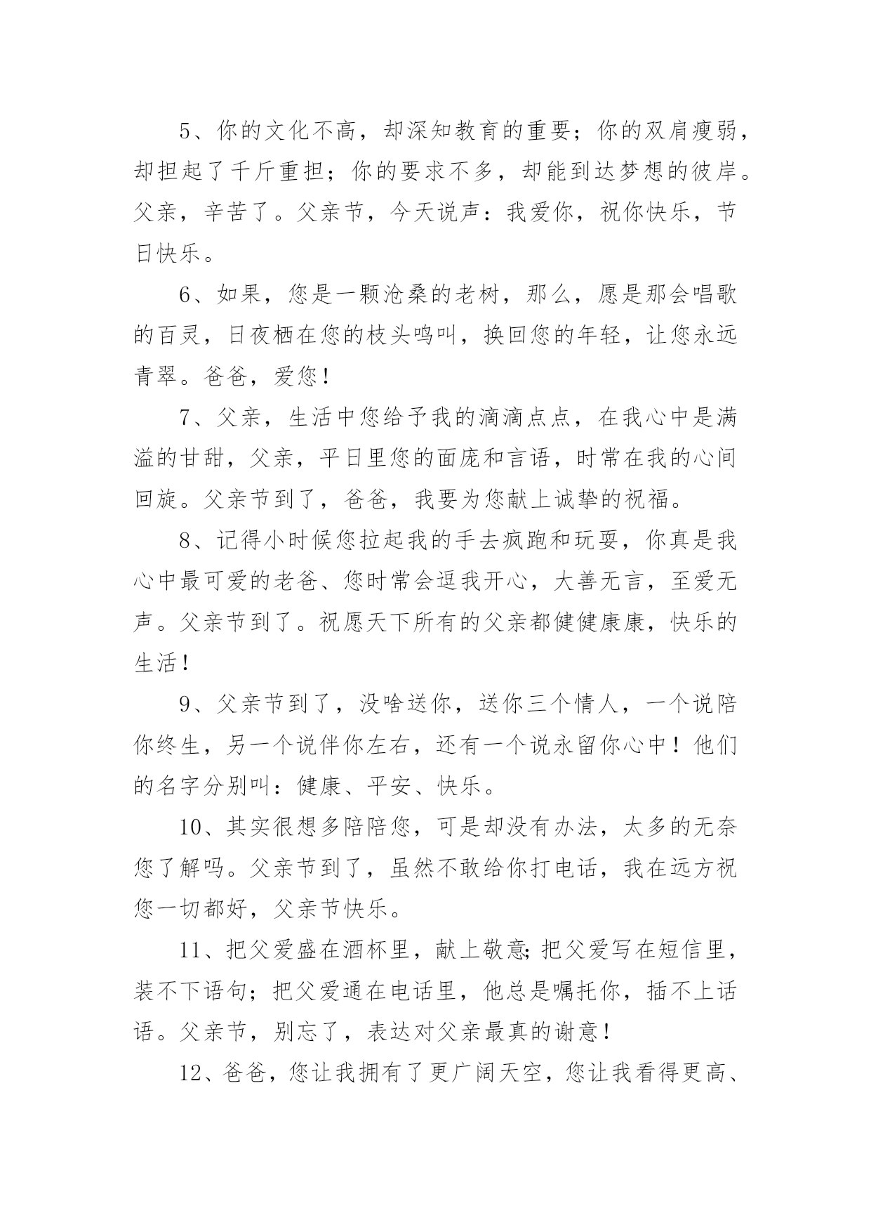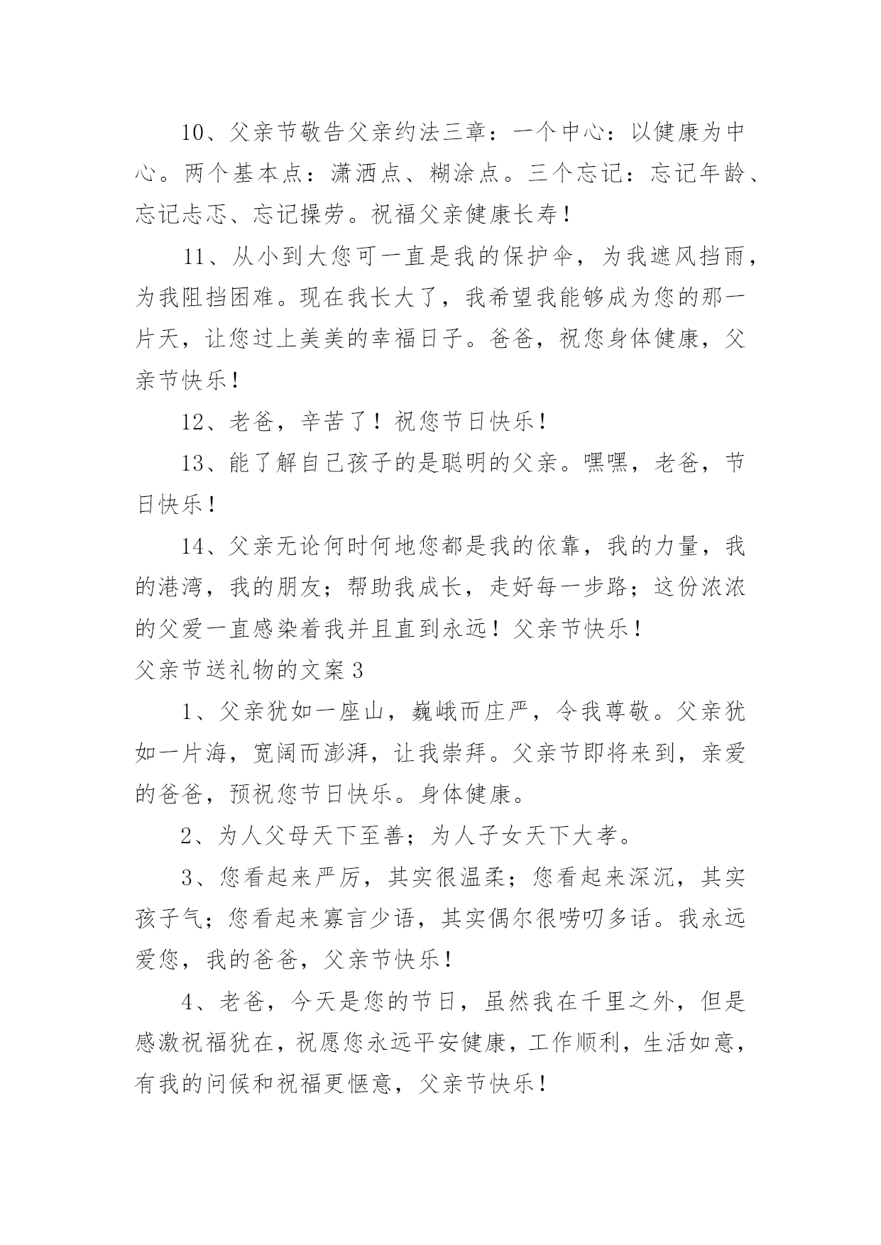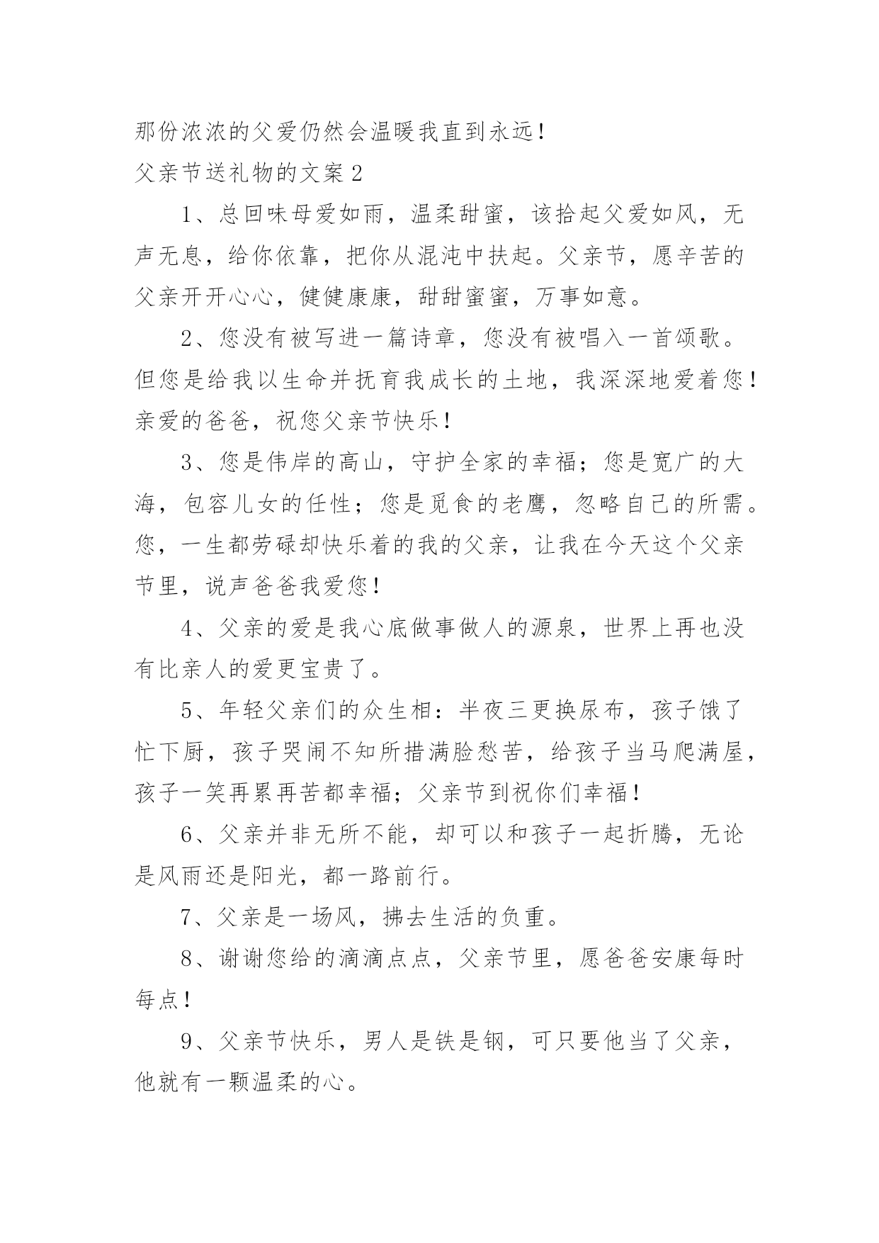 父亲节送礼物的文案父亲节送礼物的文案在日常的学习、工作、生活中,越来越多人钟情于在朋友圈发布文案,文案用以分享生活日常和自己的感悟。那什么样的文案才具有启发意义呢?以下是小编精心整理的父亲节送礼物的文案,欢迎大家分享。父亲节送礼物的文案11、父亲汗水流身上,辛劳藏心里,总说不累;父亲胆量扛肩上,情感融骨子里,总说没事;父亲岁月写脸上,沧桑背背上,总说不老。父亲节来临,儿女祝福您,青松般的身体,鲜花般的心境,天天快乐,永远年轻。2、父之美德,儿之遗产。3、为了娶到老妈,你曾拼命地追;为了维持一个家,你曾忙着发达;为了养活我长大,你又操心受累失去了潇洒。父亲节到,愿我最可爱的老爸,休息一下,简便一下歇歇吧!4、人生可是几十年,成败荣辱都在天,是非恩怨莫在意,健康快乐最值钱,自古人间苦无边,看得高远境如仙,轻简便松每一天,父亲节快乐!5、女儿对父亲的感激是无法言语的,多谢你,爸爸!6、儿时的我,并不怎麽了解父爱,只知道,妈妈总是围绕在我的身边,疼我,爱我。直到今日,我才发现父爱同样时时刻刻围绕在我的身边,只可是和我玩了一个捉迷藏而已。无言的父爱就像暖暖的春风抚摸着我稚幼的身体,那藏在刷牙杯子里的爱满满的呈此刻我的面前。7、你是雄鹰,我是小鸟;你是大树,我是小草;你是我老爸,我是你那位特调皮捣蛋的孩子,今日特意发信息给您过节呢!8、爸爸不论何时你都是我的拐杖,给我支持,给我方向,给我力量,让我能够走好今后的每一段路。也许有一天,你老到无法再给我支持,但在我心里那份浓浓的父爱仍然会帮忙我直到永远!9、最宽广的,是你的胸怀;最粗糙的,是你的手掌;最有力的,是你的臂膀;最沧桑的,是你的面庞。你最疼爱的,是我和妈妈。亲爱的爸爸,父亲节快乐!10、找一湖碧水,钓几尾闲鱼,回忆人生得失,心游凡尘。喝一壶老酒,交一群朋友,笑谈人间得失,虽说人在江湖身不由己,但千万别累着自我,父亲节快乐!11、献给您无限感激和温馨的祝愿,还有那许多回忆和深情的思念。因为您慈祥无比,难以言表,祝父亲节快乐!12、一声“爸爸”,是快乐的`呼唤;一声“爸爸”,是幸福的挂牵;一声“爸爸”,是纠结的思念;一声“爸爸”,是父亲节里对您的祝愿,叫一声老爸吧,祝愿天下父亲一生快乐平安!13、您是一棵大树,春天倚着您幻想,夏天倚着你繁茂,秋天倚着您成熟,冬天倚着您沉思。14、岁月的沧桑刻在脸上,目光中充满严厉和慈祥,黑黑的脊梁大山一样,坚实的胸膛高原般宽广,双肩挑起太阳和月亮。父亲,我为你歌唱,为你祝福,父亲节快乐。15、年少的青春,未完的旅程,是你带着我勇敢地看人生;无悔的关怀,无怨的真爱,而我又能还给你几分,祝父亲永远快乐!16、有时我忙,有时我忘;有时我累,有时我懒!但怎样我也会记得想你,想你这个好朋友!记住:你微笑时我的世界也微笑,祝父亲节快乐!17、您的眼光中虽有严厉,但更多的是温暖,是爱护。多谢您,爸爸。祝您父亲节快乐!18、送您一条围巾,愿能帮您阻止寒冷的入侵,请缠绕在您衣襟,让您的世界永远喜悦温馨。爸爸,我爱您。19、您的手,拉着我走过春秋冬夏,爱的风景里有酸甜苦辣;您的眼,望着我走向挺拔,爱的气息里有关怀备至;儿时在您的背上长大,年少有您的深深教诲。父亲节到了,永远记得您的爱,爸爸,我爱您!节日快乐!20、爸爸的教诲像一盏明灯,指明方向;爸爸的关怀像一把雨伞,遮风挡雨;爸爸的叮咛像一丝细雨,润物无声,爸爸的后背像一座高山,威严伟岸。21、爸,您最近身体还好吗年纪大了,就别太操劳了,儿女们的事会自我处理的,您要多保重身体。今日是父亲节,祝您节日快乐!22、愿你在生活中:十分热情,九分优雅,八分聪慧,七分敏锐,六分风趣,五分温柔,四个密友,三分豪放,二分含蓄,一分浪漫,祝父亲节快乐。23、三八没咱份,咱不是妇女;五一没咱份,咱充其量算个准劳动者;接下来的六母亲父亲节都没咱份;好在五四来了。朋友,咱的节日不多,必须要快乐哦!24、牵挂,是一束美丽的鲜花;思念,是情感的升华;送上我的祝福:愿今日你是快乐的,今年你是顺利的,今生你是幸福的,祝父亲节好运!25、如果,您是一颗沧桑的老树,那么,我愿是那会唱歌的百灵,日夜栖在您的枝头鸣叫,换回您的年轻,让您永远青翠。爸爸,我爱您!26、如果父亲是一棵沧桑的老树,那么,我愿是那会唱歌的百灵,日夜栖在父亲的枝头鸣叫,换回父亲的年轻,让父亲永远青翠。父亲节到了,祝节日快乐!27、只顾着对您无穷无尽的依靠,却忘了咀嚼憨您几十年无私的奉献,父亲,是您给我一双翅膀,让我飞向广阔的蓝天,是您给我无穷的信心,让我飞向入云的高山,是您给我无尽的支撑,让我飞的更高更远。您表达爱的方式朴素平淡,但您的形象绝不平凡!父亲节,爸爸,您必须要快快乐乐,平平安安!28、圣旨到!奉天承运,皇帝诏曰:父亲节将至,特赐红包一个,内有问候多多,幸福无数,健康无限,