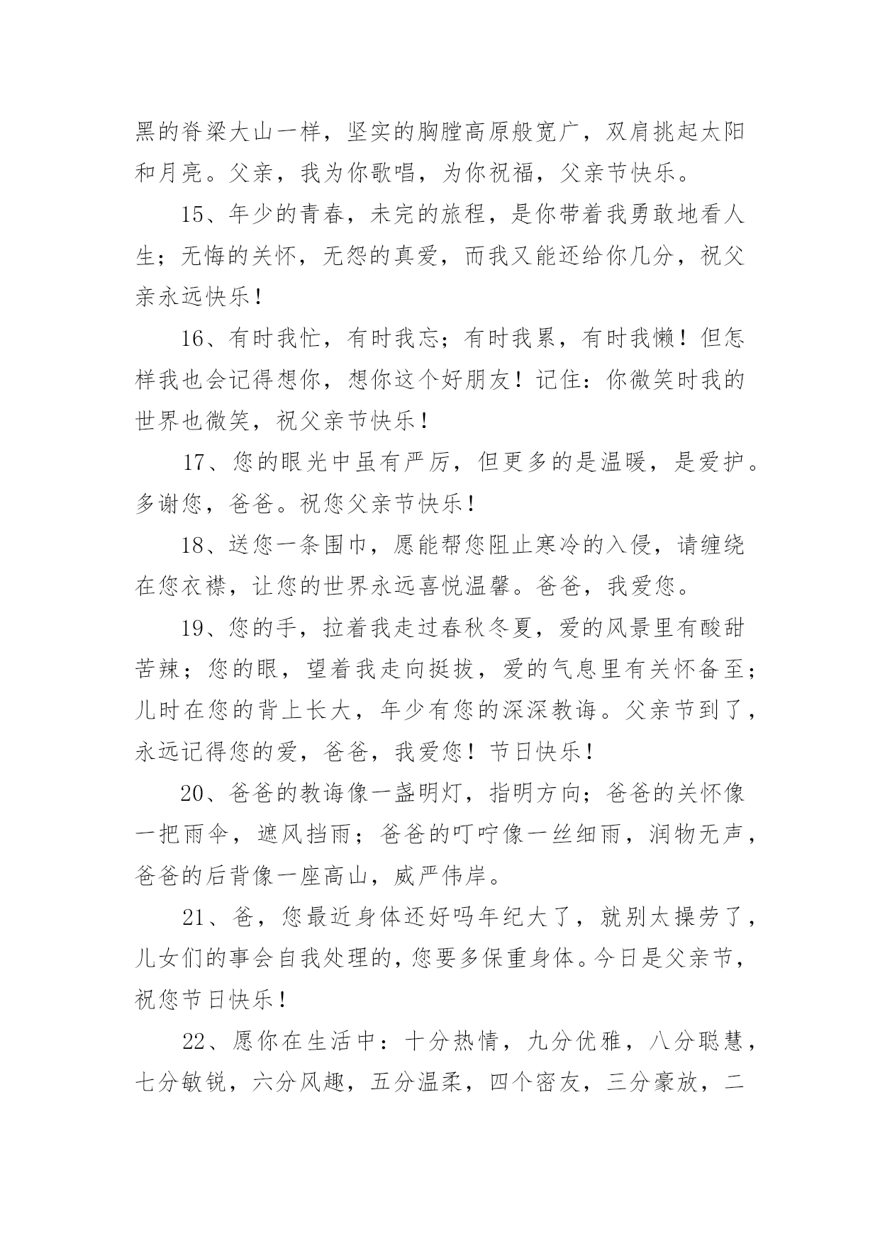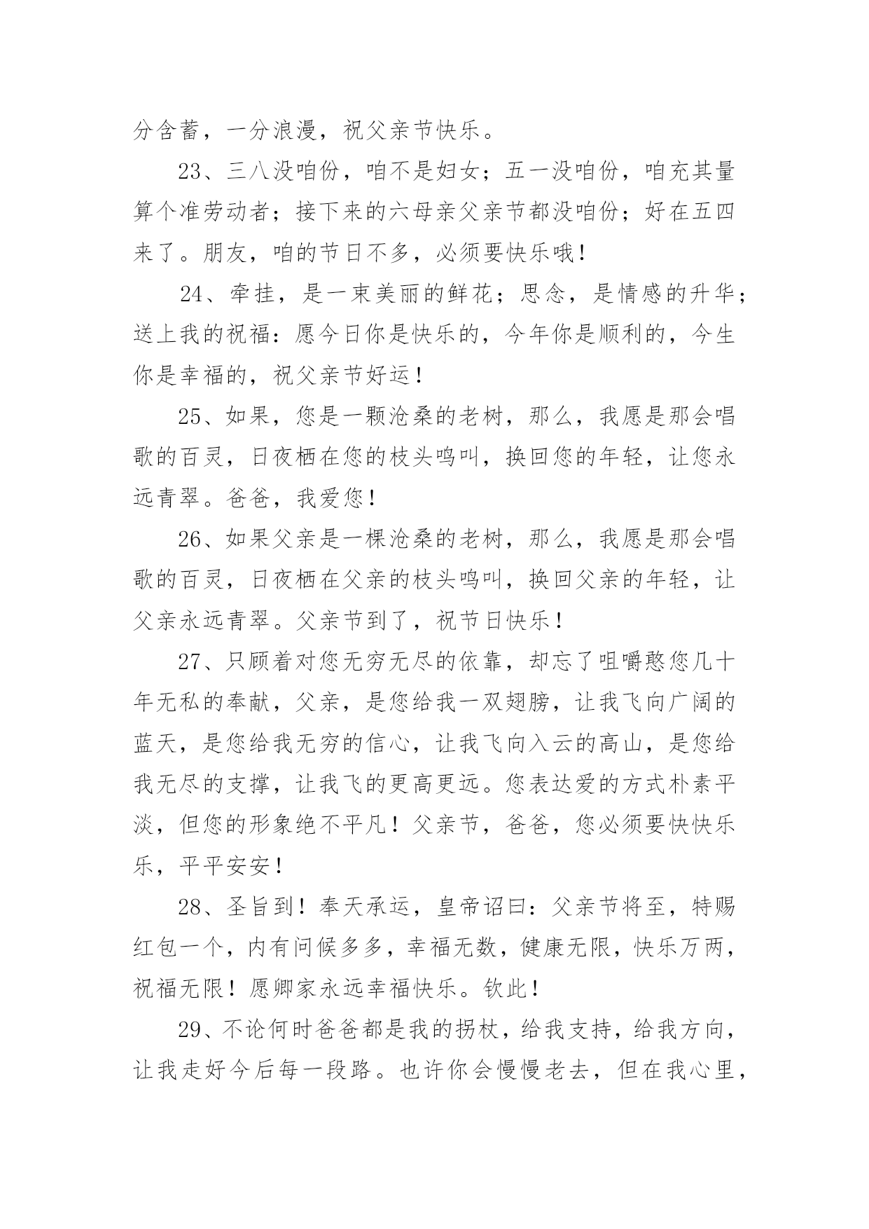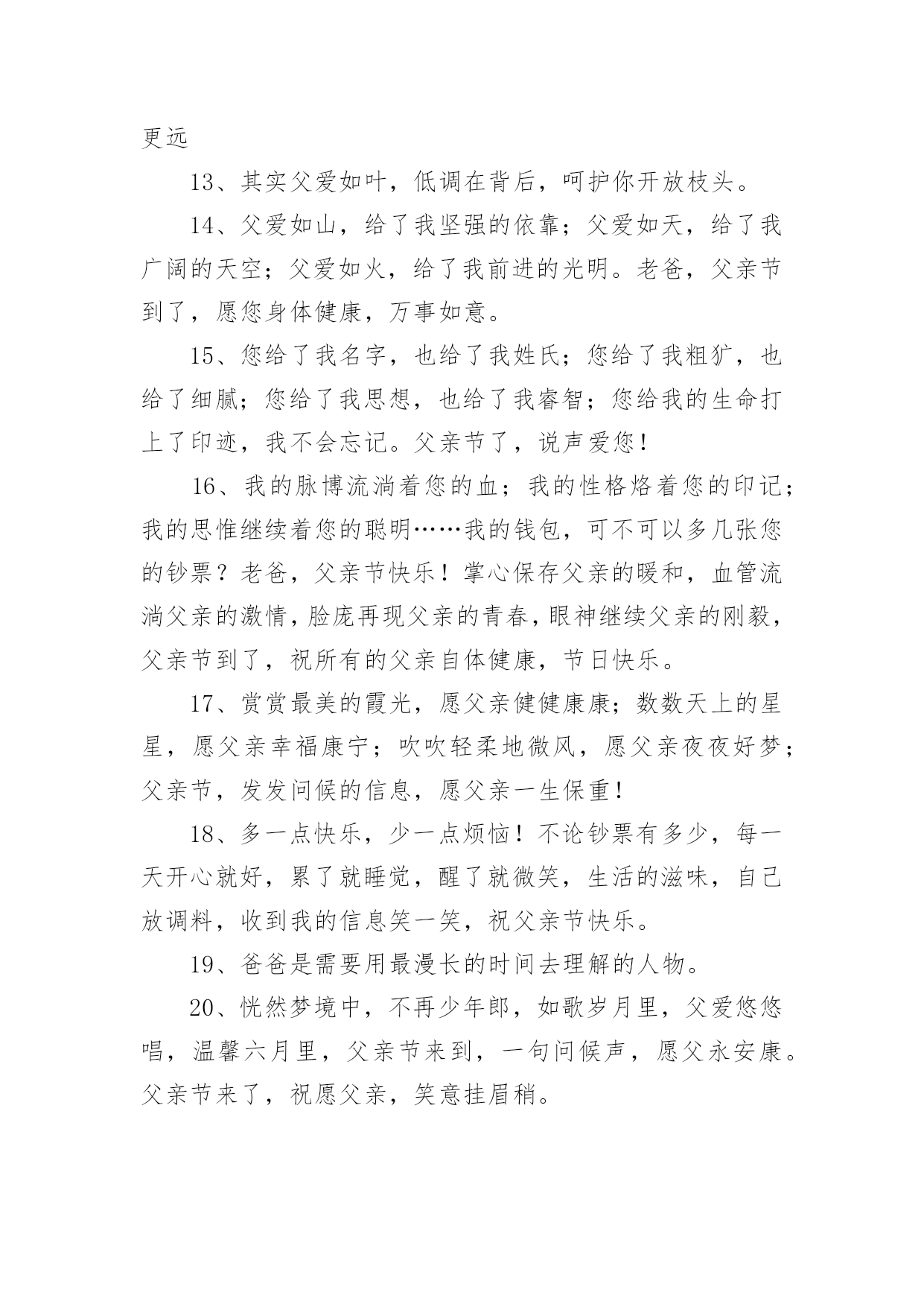 父亲节送礼物的文案父亲节送礼物的文案在日常的学习、工作、生活中,越来越多人钟情于在朋友圈发布文案,文案用以分享生活日常和自己的感悟。那什么样的文案才具有启发意义呢?以下是小编精心整理的父亲节送礼物的文案,欢迎大家分享。父亲节送礼物的文案11、父亲汗水流身上,辛劳藏心里,总说不累;父亲胆量扛肩上,情感融骨子里,总说没事;父亲岁月写脸上,沧桑背背上,总说不老。父亲节来临,儿女祝福您,青松般的身体,鲜花般的心境,天天快乐,永远年轻。2、父之美德,儿之遗产。3、为了娶到老妈,你曾拼命地追;为了维持一个家,你曾忙着发达;为了养活我长大,你又操心受累失去了潇洒。父亲节到,愿我最可爱的老爸,休息一下,简便一下歇歇吧!4、人生可是几十年,成败荣辱都在天,是非恩怨莫在意,健康快乐最值钱,自古人间苦无边,看得高远境如仙,轻简便松每一天,父亲节快乐!5、女儿对父亲的感激是无法言语的,多谢你,爸爸!6、儿时的我,并不怎麽了解父爱,只知道,妈妈总是围绕在我的身边,疼我,爱我。直到今日,我才发现父爱同样时时刻刻围绕在我的身边,只可是和我玩了一个捉迷藏而已。无言的父爱就像暖暖的春风抚摸着我稚幼的身体,那藏在刷牙杯子里的爱满满的呈此刻我的面前。7、你是雄鹰,我是小鸟;你是大树,我是小草;你是我老爸,我是你那位特调皮捣蛋的孩子,今日特意发信息给您过节呢!8、爸爸不论何时你都是我的拐杖,给我支持,给我方向,给我力量,让我能够走好今后的每一段路。也许有一天,你老到无法再给我支持,但在我心里那份浓浓的父爱仍然会帮忙我直到永远!9、最宽广的,是你的胸怀;最粗糙的,是你的手掌;最有力的,是你的臂膀;最沧桑的,是你的面庞。你最疼爱的,是我和妈妈。亲爱的爸爸,父亲节快乐!10、找一湖碧水,钓几尾闲鱼,回忆人生得失,心游凡尘。喝一壶老酒,交一群朋友,笑谈人间得失,虽说人在江湖身不由己,但千万别累着自我,父亲节快乐!11、献给您无限感激和温馨的祝愿,还有那许多回忆和深情的思念。因为您慈祥无比,难以言表,祝父亲节快乐!12、一声“爸爸”,是快乐的`呼唤;一声“爸爸”,是幸福的挂牵;一声“爸爸”,是纠结的思念;一声“爸爸”,是父亲节里对您的祝愿,叫一声老爸吧,祝愿天下父亲一生快乐平安!13、您是一棵大树,春天倚着您幻想,夏天倚着你繁茂,秋天倚着您成熟,冬天倚着您沉思。14、岁月的沧桑刻在脸上,目光中充满严厉和慈祥,黑黑的脊梁大山一样,坚实的胸膛高原般宽广,双肩挑起太阳和月亮。父亲,我为你歌唱,为你祝福,父亲节快乐。15、年少的青春,未完的旅程,是你带着我勇敢地看人生;无悔的关怀,无怨的真爱,而我又能还给你几分,祝父亲永远快乐!16、有时我忙,有时我忘;有时我累,有时我懒!但怎样我也会记得想你,想你这个好朋友!记住:你微笑时我的世界也微笑,祝父亲节快乐!17、您的眼光中虽有严厉,但更多的是温暖,是爱护。多谢您,爸爸。祝您父亲节快乐!18、送您一条围巾,愿能帮您阻止寒冷的入侵,请缠绕在您衣襟,让您的世界永远喜悦温馨。爸爸,我爱您。19、您的手,拉着我走过春秋冬夏,爱的风景里有酸甜苦辣;您的眼,望着我走向挺拔,爱的气息里有关怀备至;儿时在您的背上长大,年少有您的深深教诲。父亲节到了,永远记得您的爱,爸爸,我爱您!节日快乐!20、爸爸的教诲像一盏明灯,指明方向;爸爸的关怀像一把雨伞,遮风挡雨;爸爸的叮咛像一丝细雨,润物无声,爸爸的后背像一座高山,威严伟岸。21、爸,您最近身体还好吗年纪大了,就别太操劳了,儿女们的事会自我处理的,您要多保重身体。今日是父亲节,祝您节日快乐!22、愿你在生活中:十分热情,九分优雅,八分聪慧,七分敏锐,六分风趣,五分温柔,四个密友,三分豪放,二分含蓄,一分浪漫,祝父亲节快乐。23、三八没咱份,咱不是妇女;五一没咱份,咱充其量算个准劳动者;接下来的六母亲父亲节都没咱份;好在五四来了。朋友,咱的节日不多,必须要快乐哦!24、牵挂,是一束美丽的鲜花;思念,是情感的升华;送上我的祝福:愿今日你是快乐的,今年你是顺利的,今生你是幸福的,祝父亲节好运!25、如果,您是一颗沧桑的老树,那么,我愿是那会唱歌的百灵,日夜栖在您的枝头鸣叫,换回您的年轻,让您永远青翠。爸爸,我爱您!26、如果父亲是一棵沧桑的老树,那么,我愿是那会唱歌的百灵,日夜栖在父亲的枝头鸣叫,换回父亲的年轻,让父亲永远青翠。父亲节到了,祝节日快乐!27、只顾着对您无穷无尽的依靠,却忘了咀嚼憨您几十年无私的奉献,父亲,是您给我一双翅膀,让我飞向广阔的蓝天,是您给我无穷的信心,让我飞向入云的高山,是您给我无尽的支撑,让我飞的更高更远。您表达爱的方式朴素平淡,但您的形象绝不平凡!父亲节,爸爸,您必须要快快乐乐,平平安安!28、圣旨到!奉天承运,皇帝诏曰:父亲节将至,特赐红包一个,内有问候多多,幸福无数,健康无限,