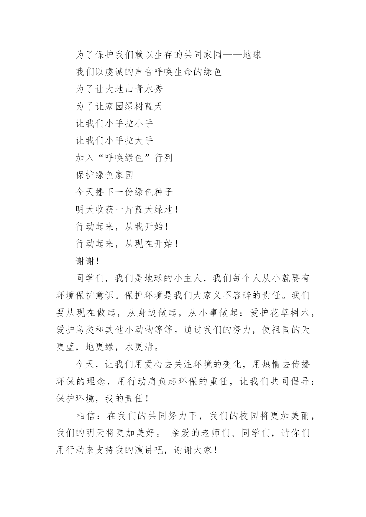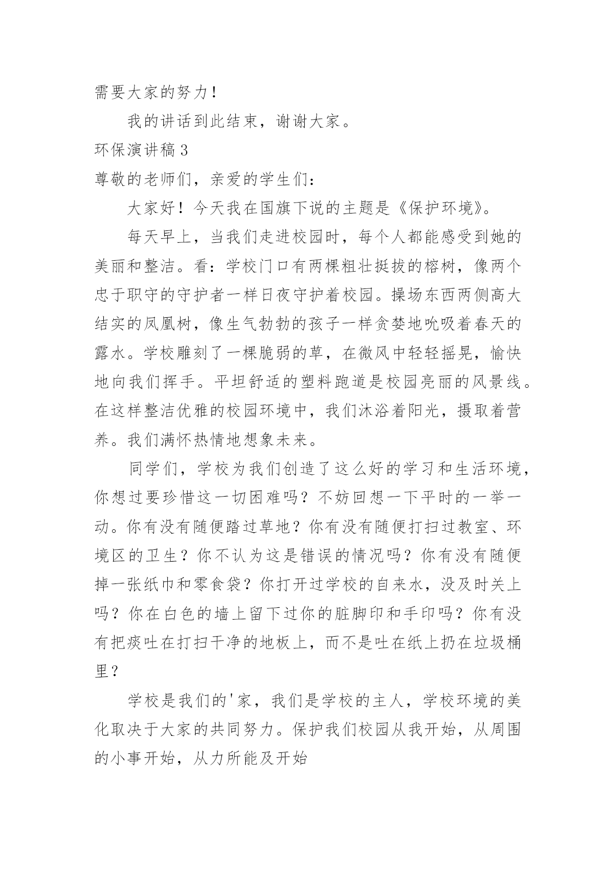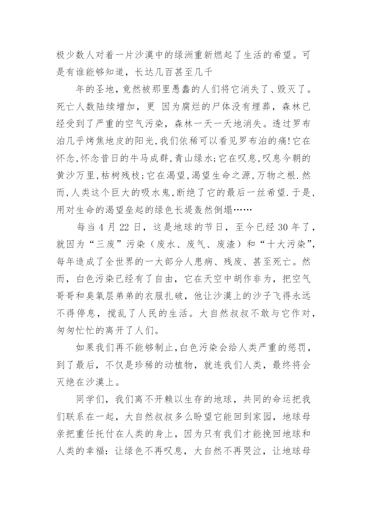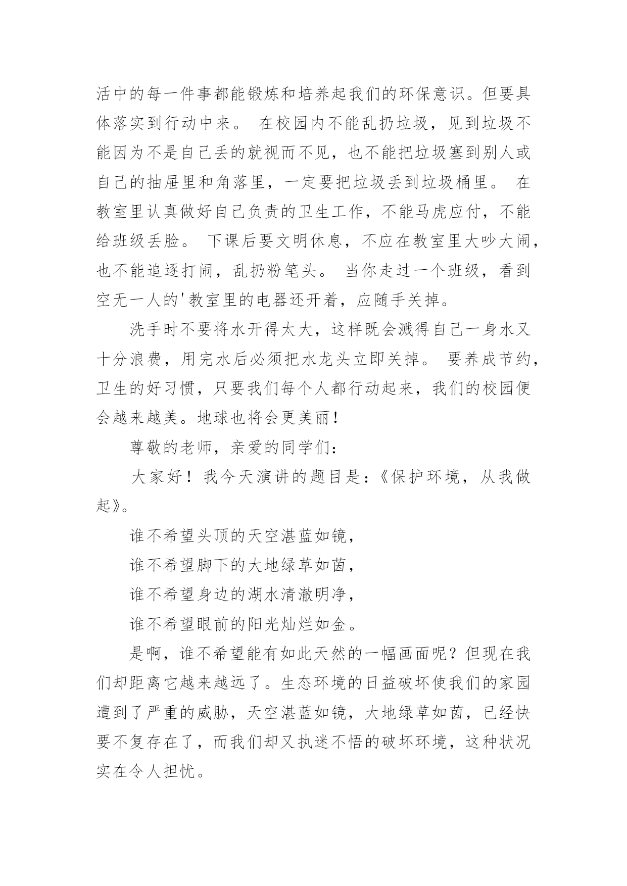 环保演讲稿环保演讲稿(必备)演讲稿可以帮助发言者更好的表达。随着社会一步步向前发展,演讲稿在我们的视野里出现的频率越来越高,写起演讲稿来就毫无头绪?下面是小编整理的环保演讲稿,希望对大家有所帮助。环保演讲稿1敬爱的老师同学们:你们好!环保是我们每个人都该负起的责任,我们每个人都要拥有环保意识。因为地球是大家的,我们都是地球人。环保意识每个人都不尽相同,但我们可以慢慢地培养起来。其实生活中的每一件事都能锻炼和培养起我们的环保意识。但要具体落实到行动中来。在校园内不能乱扔垃圾,见到垃圾不能因为不是自己丢的就视而不见,也不能把垃圾塞到别人或自己的抽屉里和角落里,一定要把垃圾丢到垃圾桶里。在教室里认真做好自己负责的卫生工作,不能马虎应付,不能给班级丢脸。下课后要文明休息,不应在教室里大吵大闹,也不能追逐打闹,乱扔粉笔头。当你走过一个班级,看到空无一人的教室里的电器还开着,应随手关掉。洗手时不要将水开得太大,这样既会溅得自己一身水又十分浪费,用完水后必须把水龙头立即关掉。要养成节约,卫生的好习惯,只要我们每个人都行动起来,我们的校园便会越来越美。地球也将会更美丽!养成良好卫生习惯,共创美好校园环境校园是我们共同生活的地方,所以养成良好的卫生习惯,共创美好校园环境是我们每个同学的责任。什么叫习惯呢?所谓的“习惯”是指长期重复地做并逐渐养成的不自觉活动。习惯的力量很大。培养良好的卫生习惯首先应从我做起,我们应该时时刻刻提醒自己,不要随地吐痰,不要随地乱扔废物………那些看似无关紧要的“小恶”可能造成的后果就是使我们的校园变得丑陋、肮脏。我们还要制止其他同学不讲卫生的行为,看到地上有果皮纸屑主动捡起。这些似乎让人不屑一顾的“小善”可以互相促进良好卫生习惯的养成,让我们的校园更加干净整洁。其次是:我们每位同学都应该自觉地保护教室及其所在班的周围的环境卫生.通过上一周的督促检查.我们发现各班级环境卫生都做得比较好,但要坚持养成这一良好的习惯.每天走进班级里,你都会看到桌窗明净,桌凳摆放整齐,地面无纸屑.我想在这样干净整洁的环境里,就会心情舒畅,身心健康.同学们,校园是我们的家,让我们自觉维护校园环境。努力养成不乱扔废纸、粉笔头、;不向楼下扔任何杂物;不随地吐痰等良好习惯。同时把班级和清洁区的卫生认认真真做好,并且时时刻刻保持;做到有人检查和没人检查一样干净,一样整洁。一份耕耘一份收获,只要我们共同努力,坚持不懈,我们的校园就会像花园一样一尘不染,空气清新,令人精神爽朗。让我们在飘扬的红旗下作出我们庄严的承诺:从现在开始,养成良好的卫生习惯,共创美好校园环境!保护环境,从我做起保护环境从我做起地球是我们的家园,我们人类应该保护地球。可是如今,由于经济利益的吸引,人们不顾一切地开采地球上的宝贵资源,违背自然规律,破坏生态平衡,我们已经不断遭受来自大自然的惩罚。今年3月,我看了一个电视专题片《沙尘暴》,讲述了我国西部甘肃武威1995年5月5日遭受到百年不遇的强烈黑风暴的袭击,造成巨大损失,大面积农田绝收,基础设施遭到严重破坏,人员伤亡惨重。其中有15名小学生在放学路上被风卷入水渠中冲走。近几天,我又看到报道,甘肃民勤县也遭受了与1995年武威黑风暴同样的厄运。这两件事给我们人类敲响了警钟,我们再也不能迟疑了。全人类应该立即行动起来,保护我们的家园,再也不要出现在武威、民勤的这种危害人类的事发生。作为一名小学生,我们怎样才能保护我们的家园呢?我认为,要从小事做起,从我做起。首先,保护我们周围的环境,讲究卫生,不乱扔废弃物,不乱倒垃圾,爱护花草树木,保持校园环境干净整洁。其次,保护我们周围的环境,建立“绿色环保”少年岗,植树造林,控制土地沙漠化,扩大绿地面积。再次,制止滥砍滥伐,保护植被,防风固沙,保护野生动物,合理开发利用水资源。只有每个人都齐心协力,齐抓共管,才能使明天的家园,变得更加美丽环保知识:这些年来。我们国家受到了严重的环境污染,特大沙尘暴在我国一次又一次发生,它将会掩埋草地、吞毁家园,严重地影响了人民的生活,使我们难以生存。绿色的草地将会变成沙漠,大树将会永远卧倒在地,而我们也不会快乐生活:幸福没有了,亲人没有了,连我们赖以生存的地球也会在茫茫宇宙中粉碎,就像玻璃摔在地上一样。然而这不仅是沙尘暴带来的灾难。现在,连南极也遭到了污染破坏。因此,地球上失去了最后一块净土。泰山原来是被人们观赏的好地方,居然也成了保护区。而我们,难道就只能袖手旁观吗,难道我们只能看着这美丽而脆弱的地球永远消失在人间吗?从此,我们能看到风吹草地见牛羊,白云下面马儿跑的那种景象吗?虽然我们只是小学生,但是我们还可以为家乡做出一点贡献,让定西在希望中崛起。有些同学可能知道在塔克拉玛干沙漠边缘有个罗布泊,那是一个生机勃勃的绿洲,一年四季都会有新鲜的空气,令人向往的环境,绿