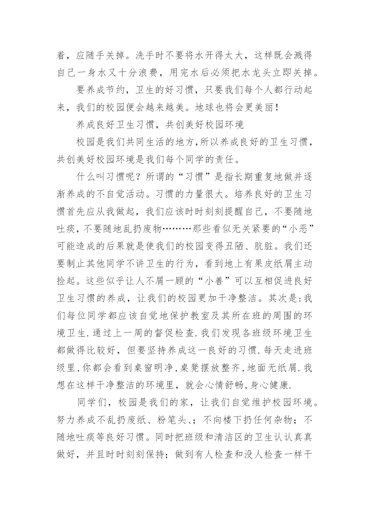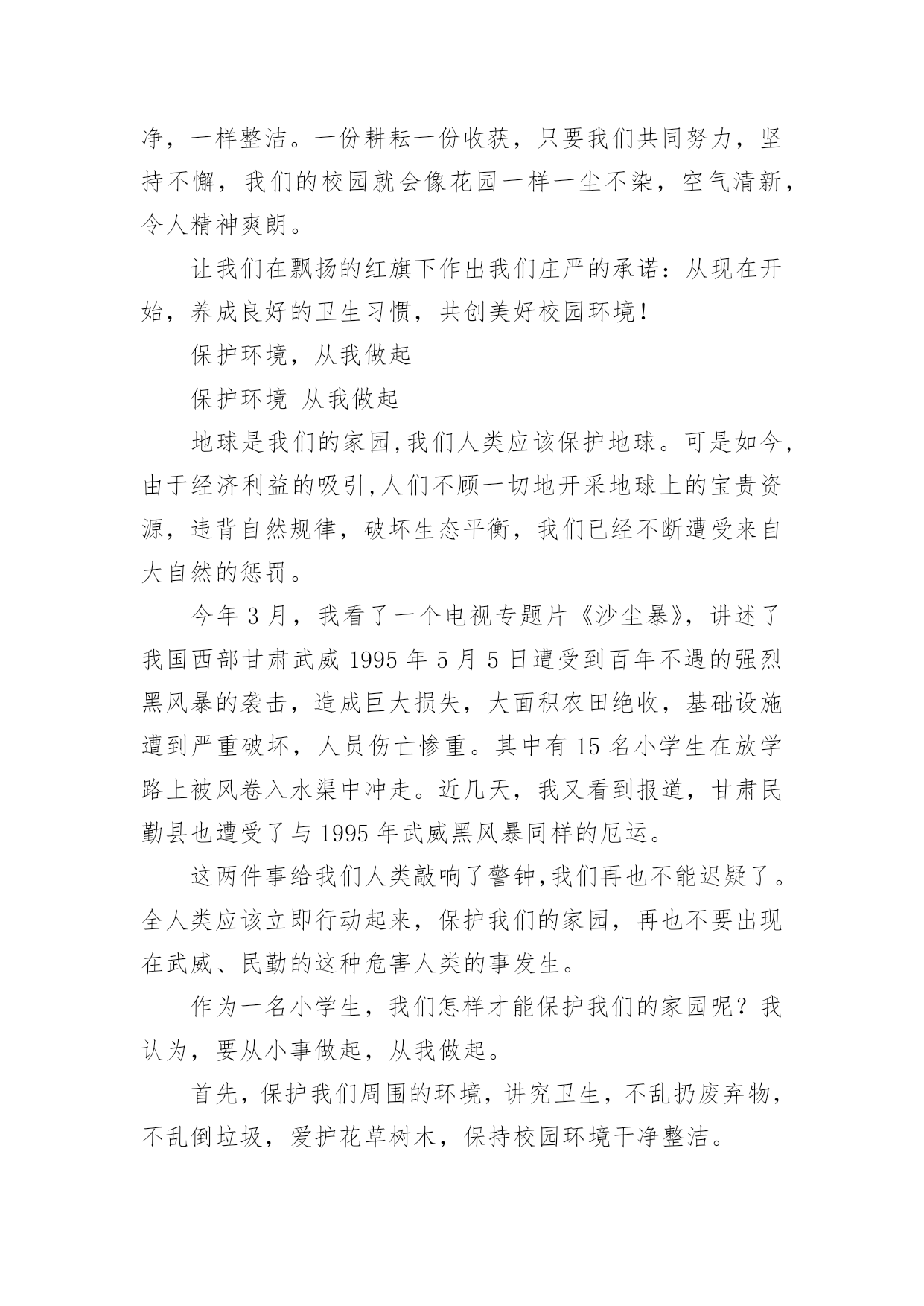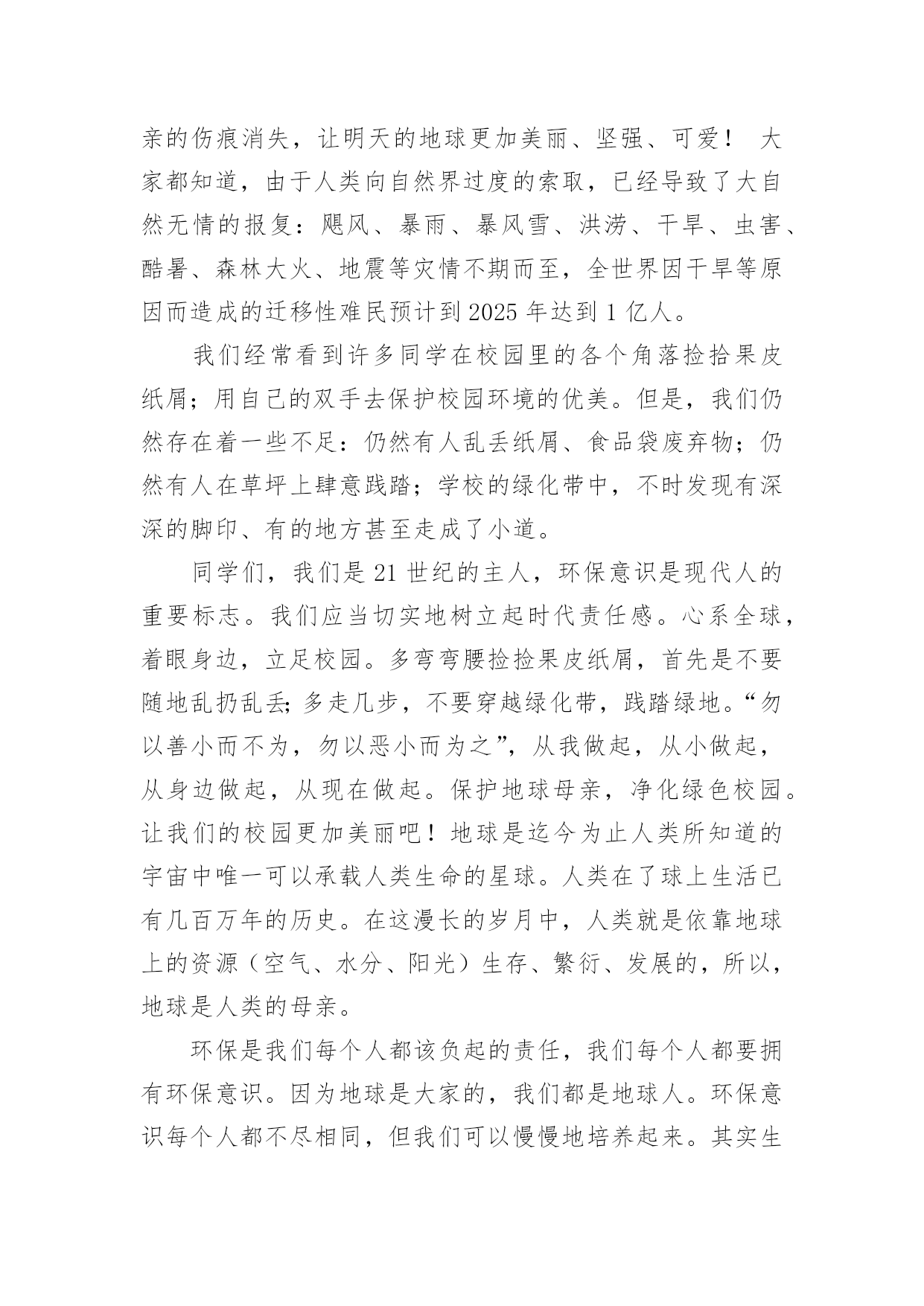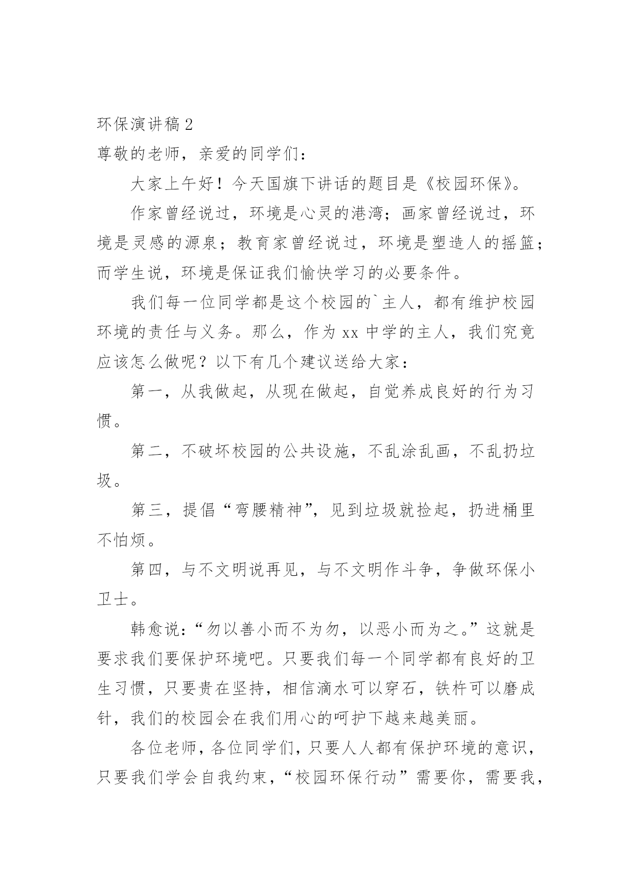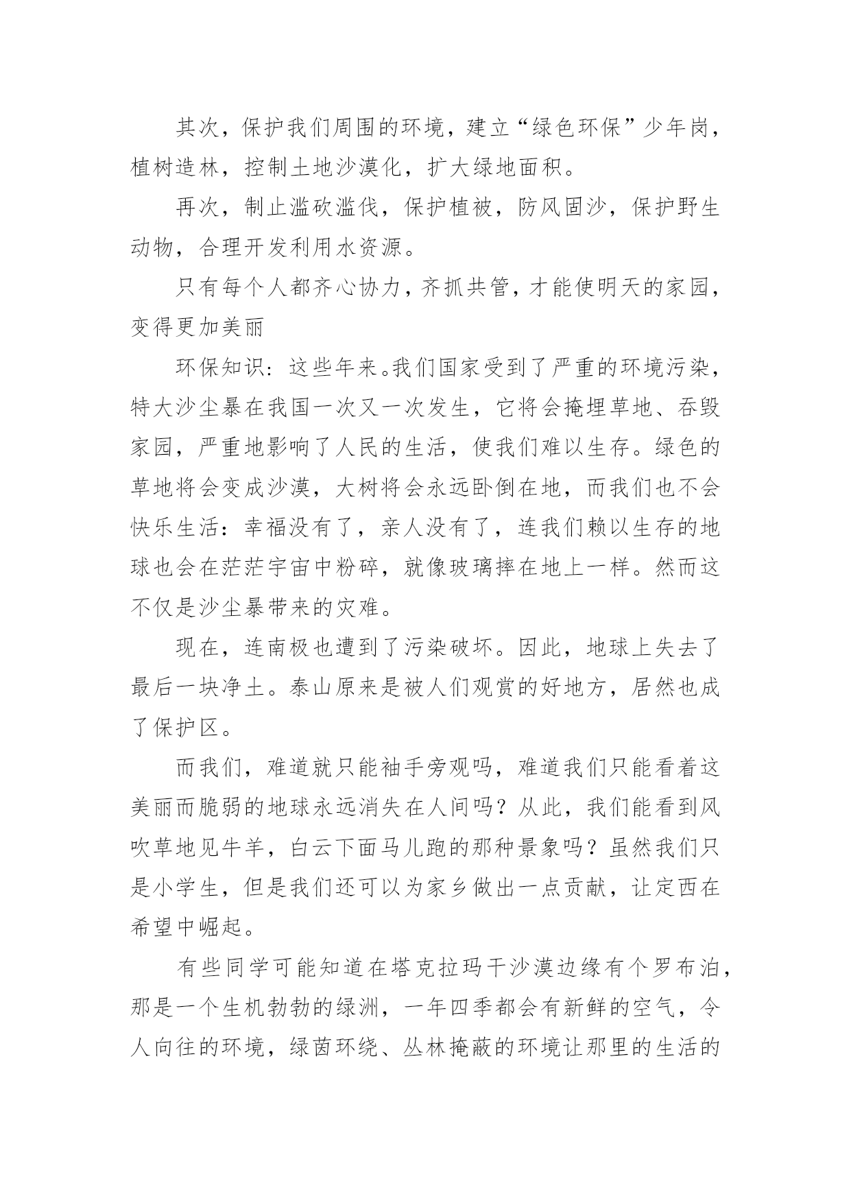 环保演讲稿环保演讲稿(必备)演讲稿可以帮助发言者更好的表达。随着社会一步步向前发展,演讲稿在我们的视野里出现的频率越来越高,写起演讲稿来就毫无头绪?下面是小编整理的环保演讲稿,希望对大家有所帮助。环保演讲稿1敬爱的老师同学们:你们好!环保是我们每个人都该负起的责任,我们每个人都要拥有环保意识。因为地球是大家的,我们都是地球人。环保意识每个人都不尽相同,但我们可以慢慢地培养起来。其实生活中的每一件事都能锻炼和培养起我们的环保意识。但要具体落实到行动中来。在校园内不能乱扔垃圾,见到垃圾不能因为不是自己丢的就视而不见,也不能把垃圾塞到别人或自己的抽屉里和角落里,一定要把垃圾丢到垃圾桶里。在教室里认真做好自己负责的卫生工作,不能马虎应付,不能给班级丢脸。下课后要文明休息,不应在教室里大吵大闹,也不能追逐打闹,乱扔粉笔头。当你走过一个班级,看到空无一人的教室里的电器还开着,应随手关掉。洗手时不要将水开得太大,这样既会溅得自己一身水又十分浪费,用完水后必须把水龙头立即关掉。要养成节约,卫生的好习惯,只要我们每个人都行动起来,我们的校园便会越来越美。地球也将会更美丽!养成良好卫生习惯,共创美好校园环境校园是我们共同生活的地方,所以养成良好的卫生习惯,共创美好校园环境是我们每个同学的责任。什么叫习惯呢?所谓的“习惯”是指长期重复地做并逐渐养成的不自觉活动。习惯的力量很大。培养良好的卫生习惯首先应从我做起,我们应该时时刻刻提醒自己,不要随地吐痰,不要随地乱扔废物………那些看似无关紧要的“小恶”可能造成的后果就是使我们的校园变得丑陋、肮脏。我们还要制止其他同学不讲卫生的行为,看到地上有果皮纸屑主动捡起。这些似乎让人不屑一顾的“小善”可以互相促进良好卫生习惯的养成,让我们的校园更加干净整洁。其次是:我们每位同学都应该自觉地保护教室及其所在班的周围的环境卫生.通过上一周的督促检查.我们发现各班级环境卫生都做得比较好,但要坚持养成这一良好的习惯.每天走进班级里,你都会看到桌窗明净,桌凳摆放整齐,地面无纸屑.我想在这样干净整洁的环境里,就会心情舒畅,身心健康.同学们,校园是我们的家,让我们自觉维护校园环境。努力养成不乱扔废纸、粉笔头、;不向楼下扔任何杂物;不随地吐痰等良好习惯。同时把班级和清洁区的卫生认认真真做好,并且时时刻刻保持;做到有人检查和没人检查一样干净,一样整洁。一份耕耘一份收获,只要我们共同努力,坚持不懈,我们的校园就会像花园一样一尘不染,空气清新,令人精神爽朗。让我们在飘扬的红旗下作出我们庄严的承诺:从现在开始,养成良好的卫生习惯,共创美好校园环境!保护环境,从我做起保护环境从我做起地球是我们的家园,我们人类应该保护地球。可是如今,由于经济利益的吸引,人们不顾一切地开采地球上的宝贵资源,违背自然规律,破坏生态平衡,我们已经不断遭受来自大自然的惩罚。今年3月,我看了一个电视专题片《沙尘暴》,讲述了我国西部甘肃武威1995年5月5日遭受到百年不遇的强烈黑风暴的袭击,造成巨大损失,大面积农田绝收,基础设施遭到严重破坏,人员伤亡惨重。其中有15名小学生在放学路上被风卷入水渠中冲走。近几天,我又看到报道,甘肃民勤县也遭受了与1995年武威黑风暴同样的厄运。这两件事给我们人类敲响了警钟,我们再也不能迟疑了。全人类应该立即行动起来,保护我们的家园,再也不要出现在武威、民勤的这种危害人类的事发生。作为一名小学生,我们怎样才能保护我们的家园呢?我认为,要从小事做起,从我做起。首先,保护我们周围的环境,讲究卫生,不乱扔废弃物,不乱倒垃圾,爱护花草树木,保持校园环境干净整洁。其次,保护我们周围的环境,建立“绿色环保”少年岗,植树造林,控制土地沙漠化,扩大绿地面积。再次,制止滥砍滥伐,保护植被,防风固沙,保护野生动物,合理开发利用水资源。只有每个人都齐心协力,齐抓共管,才能使明天的家园,变得更加美丽环保知识:这些年来。我们国家受到了严重的环境污染,特大沙尘暴在我国一次又一次发生,它将会掩埋草地、吞毁家园,严重地影响了人民的生活,使我们难以生存。绿色的草地将会变成沙漠,大树将会永远卧倒在地,而我们也不会快乐生活:幸福没有了,亲人没有了,连我们赖以生存的地球也会在茫茫宇宙中粉碎,就像玻璃摔在地上一样。然而这不仅是沙尘暴带来的灾难。现在,连南极也遭到了污染破坏。因此,地球上失去了最后一块净土。泰山原来是被人们观赏的好地方,居然也成了保护区。而我们,难道就只能袖手旁观吗,难道我们只能看着这美丽而脆弱的地球永远消失在人间吗?从此,我们能看到风吹草地见牛羊,白云下面马儿跑的那种景象吗?虽然我们只是小学生,但是我们还可以为家乡做出一点贡献,让定西在希望中崛起。有些同学可能知道在塔克拉玛干沙漠边缘有个罗布泊,那是一个生机勃勃的绿洲,一年四季都会有新鲜的空气,令人向往的环境,绿