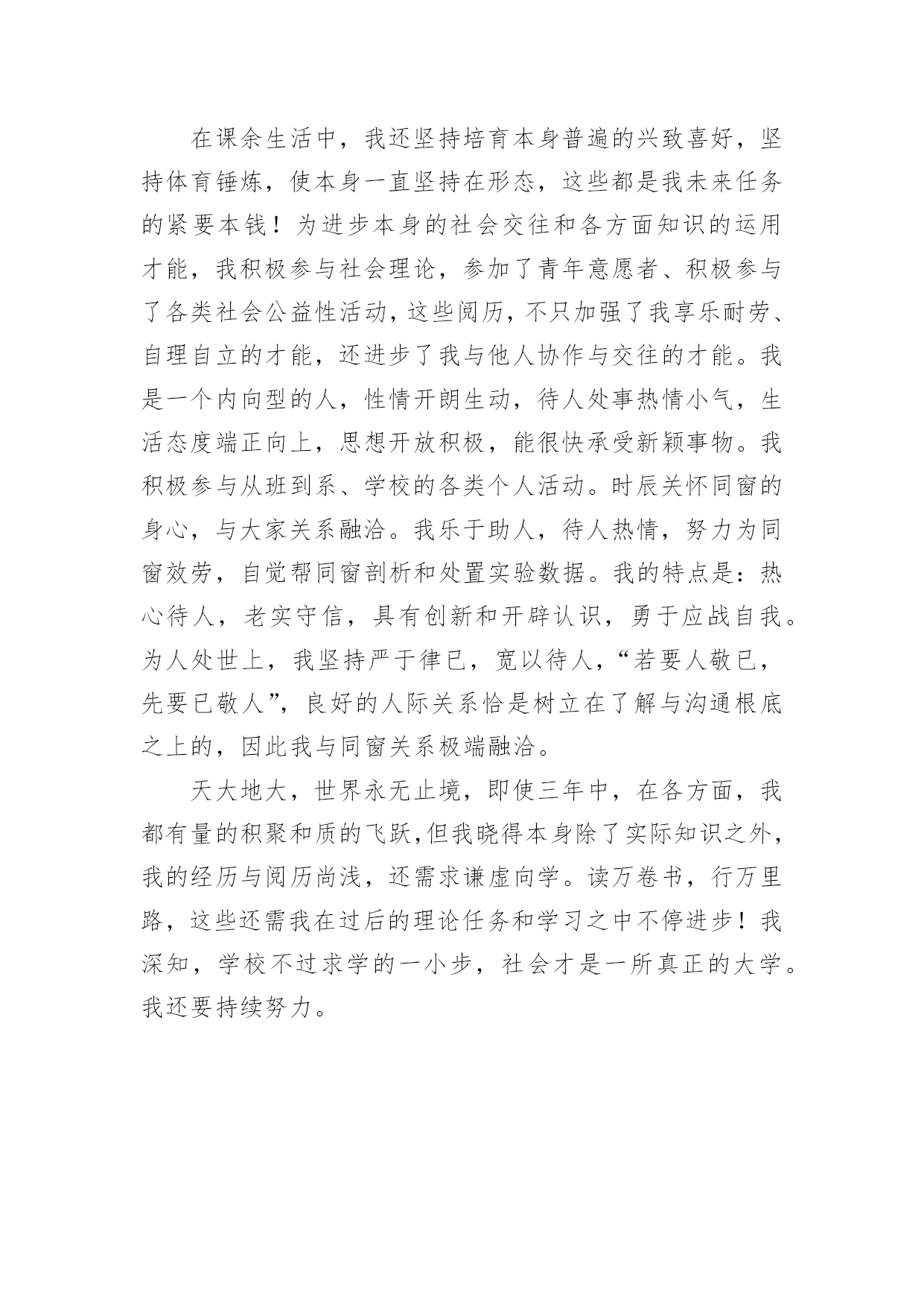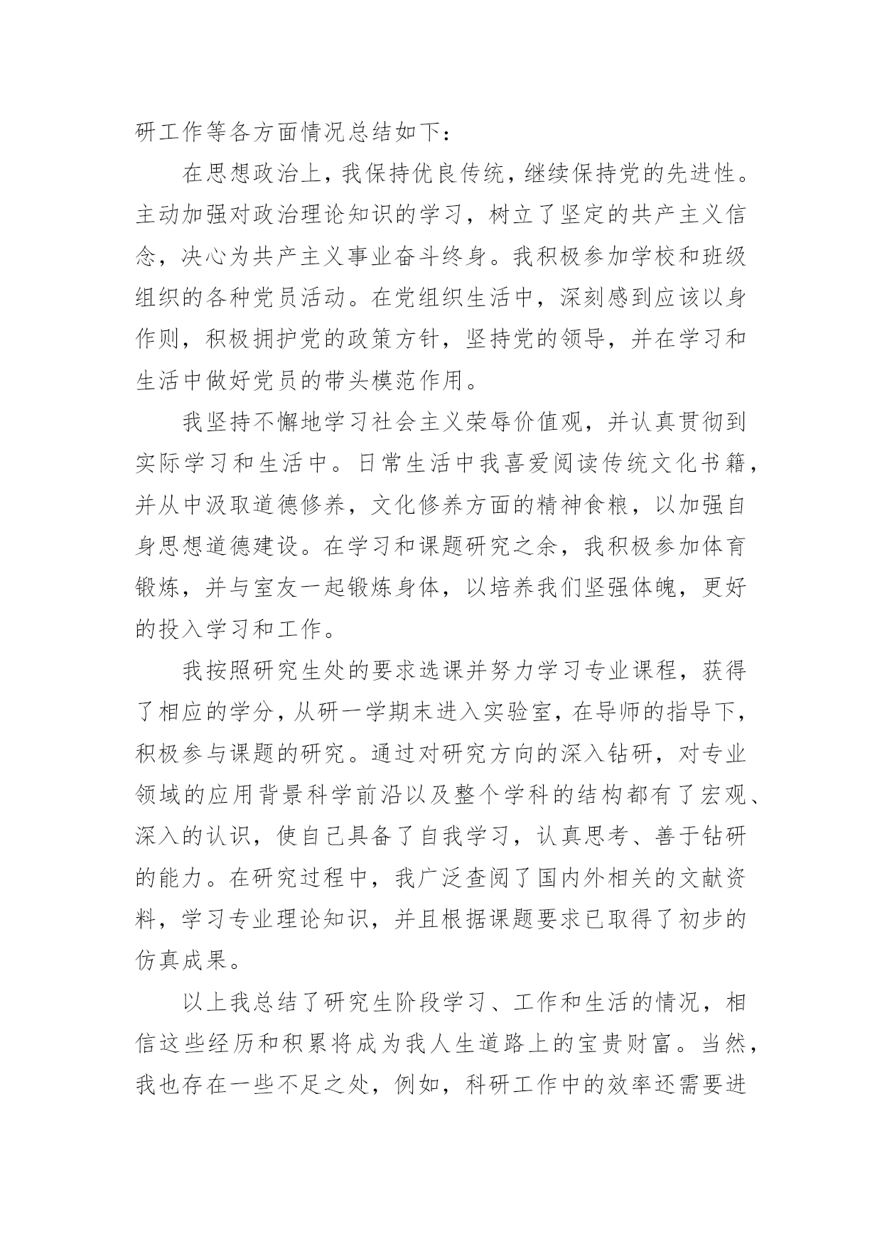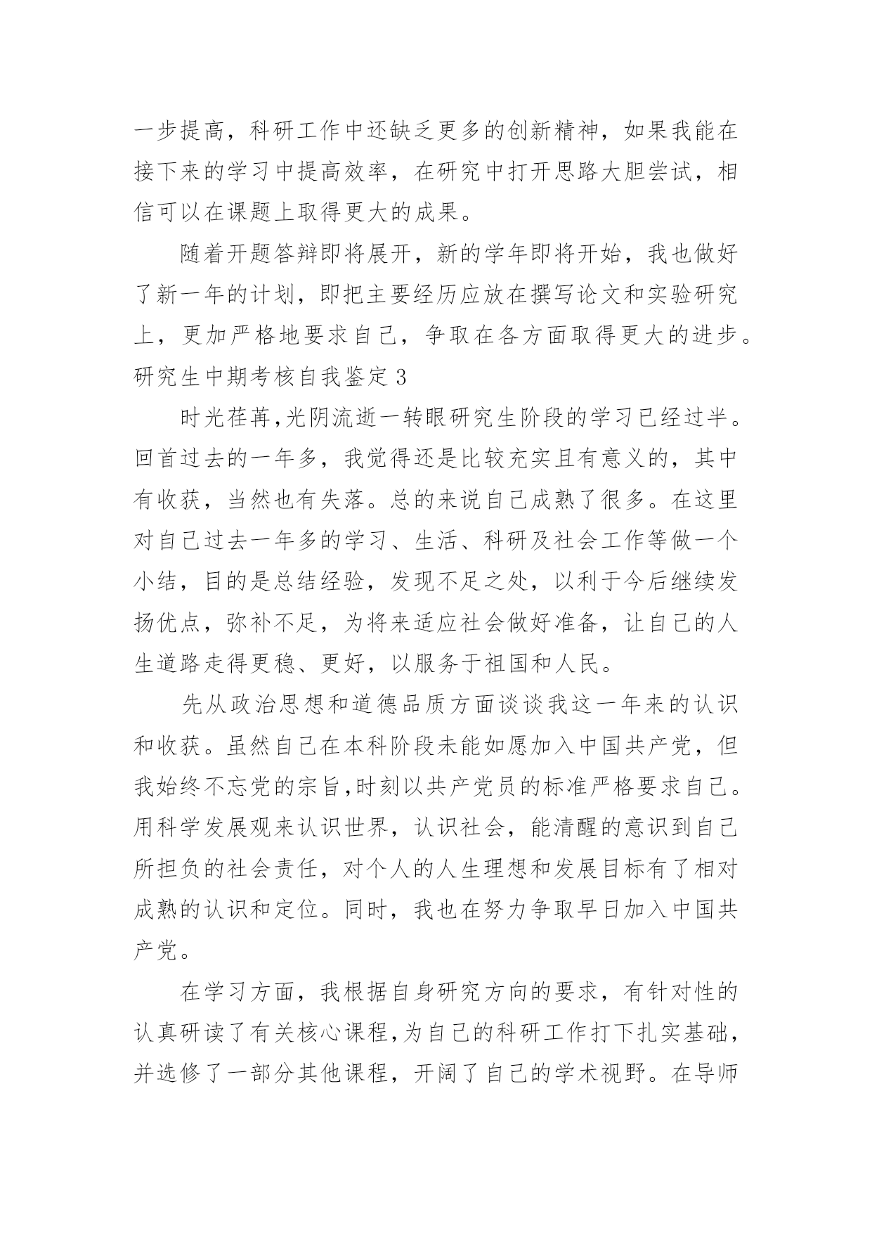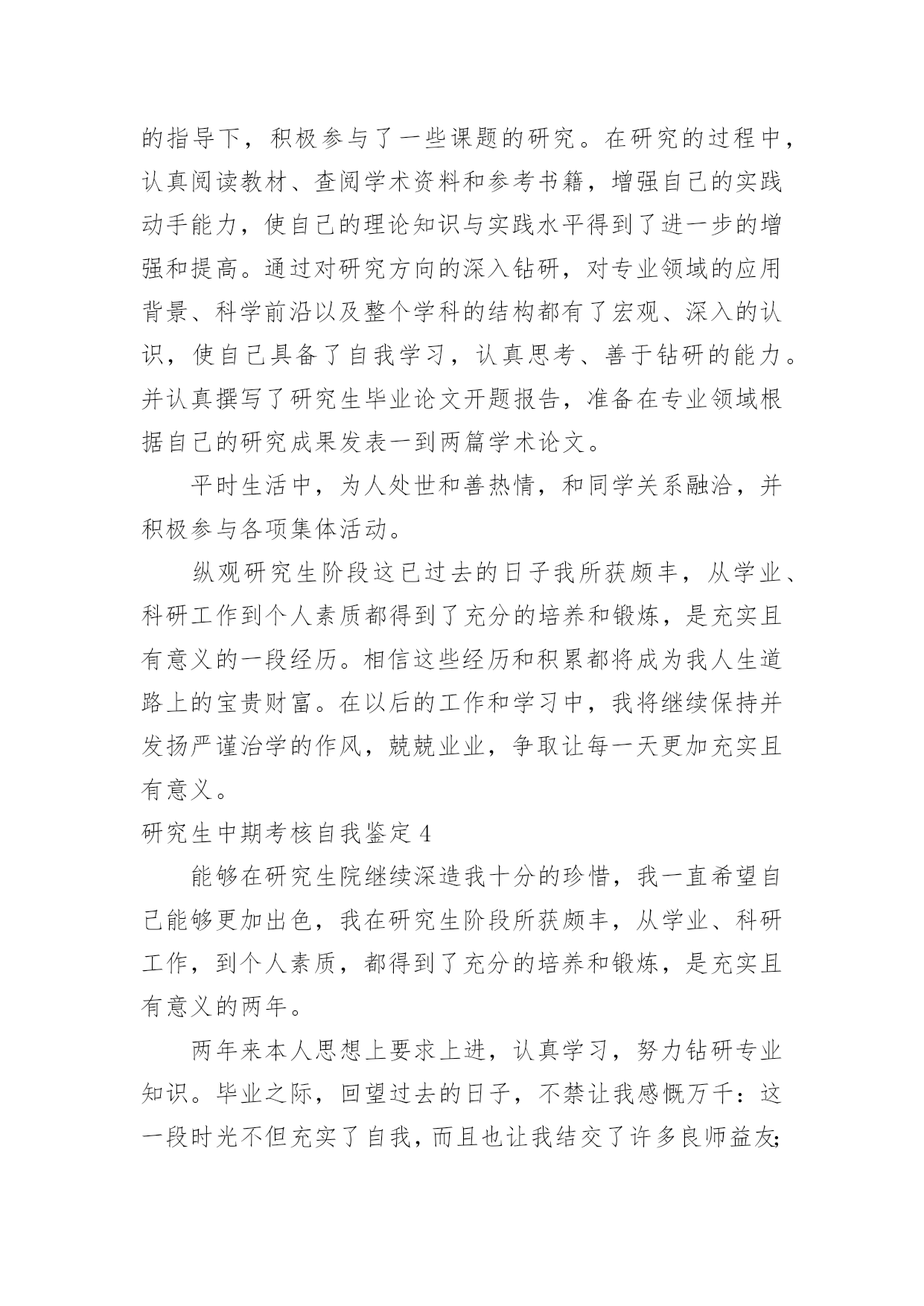 研究生中期考核自我鉴定研究生中期考核自我鉴定自我鉴定是个人对一个时间段的自我总结,自我鉴定可以总结出具体的经验,不如静下心来好好写写自我鉴定吧。那么你真的懂得怎么写自我鉴定吗?以下是小编精心整理的研究生中期考核自我鉴定,仅供参考,大家一起来看看吧。研究生中期考核自我鉴定1一转眼研究生的生活已经过去了一半,回首过去的一年多的时间,我觉得过的还是比较有意义,有很多收获。在研二进入下半年的时候,为了使自己的工作能够顺利有序的进展下去,我想对前面的工作、生活及学习的方面进行一个小的总结,目的就是总结经验,发现不足,以利于今后继续发扬优点,补足缺点,为将来适应社会做好充分的准备,把自己的人生道路走得更稳、更好。下面我准备从以下几个方面分别对自己的这一段时间的经历进行总结。一、在思想上。进入研究生阶段,继续保持优良的传统,继续保持党的先进性。在认真学习理论知识的同时,积极关注国家的大事,积极向周围的优秀的同学学习,积极的向周围优秀的党员学习,一直以党员的标准严格要求自己,并向党支部递交了入党申请书,成为一名入党积极分子。二、在学习方面。深入学习专业知识,研一期间,完成各门必修和选修课程并顺利通过了期末考试。完成课程论文的过程中阅读的大量参考文献拓宽了我的专业知识面,同时培养了收集资料及对资料进行归纳总结的能力。三、在撰写开题报告的过程中。阅读了大量的中外文献,获益颇多。此外,我积极参加本科室定期举行的学术讨论会,并参加学院举办的各类学术交流会。总的来说,在各种学习机会中给我的知识库增加了很多的存储。在确定了选题后,积极调研,对于将遇到的困难将积极向各位师兄师姐及老师请教,以保证顺利完成课题,及早撰写论文。以上我总结了前阶段研究生阶段的生活,对各方面的成长做了真实的评价。当然,存在一些不足之处,做事不够自信;全面性思考和综合分析能力有待提高,这些都是我在日后工作学习中要特别注意的地方。马上就进入第四学期了,在这承前启后,继往开来的时刻,对于我,下阶段任务更加重大,在撰写发表论文上,要付出更大的努力。在余下的研究生生涯中,努力再努力,给导师、家人和朋友交出一份满意的答卷。研究生中期考核自我鉴定2在过去一年半的研究生生活里,我度过了充实而快乐的学习时光,收获了扎实的专业知识,在学习的理论研究方面取得了显著的进步。现将我一年半以来的`学习、生活、科研工作等各方面情况总结如下:在思想政治上,我保持优良传统,继续保持党的先进性。主动加强对政治理论知识的学习,树立了坚定的共产主义信念,决心为共产主义事业奋斗终身。我积极参加学校和班级组织的各种党员活动。在党组织生活中,深刻感到应该以身作则,积极拥护党的政策方针,坚持党的领导,并在学习和生活中做好党员的带头模范作用。我坚持不懈地学习社会主义荣辱价值观,并认真贯彻到实际学习和生活中。日常生活中我喜爱阅读传统文化书籍,并从中汲取道德修养,文化修养方面的精神食粮,以加强自身思想道德建设。在学习和课题研究之余,我积极参加体育锻炼,并与室友一起锻炼身体,以培养我们坚强体魄,更好的投入学习和工作。我按照研究生处的要求选课并努力学习专业课程,获得了相应的学分,从研一学期末进入实验室,在导师的指导下,积极参与课题的研究。通过对研究方向的深入钻研,对专业领域的应用背景科学前沿以及整个学科的结构都有了宏观、深入的认识,使自己具备了自我学习,认真思考、善于钻研的能力。在研究过程中,我广泛查阅了国内外相关的文献资料,学习专业理论知识,并且根据课题要求已取得了初步的仿真成果。以上我总结了研究生阶段学习、工作和生活的情况,相信这些经历和积累将成为我人生道路上的宝贵财富。当然,我也存在一些不足之处,例如,科研工作中的效率还需要进一步提高,科研工作中还缺乏更多的创新精神,如果我能在接下来的学习中提高效率,在研究中打开思路大胆尝试,相信可以在课题上取得更大的成果。随着开题答辩即将展开,新的学年即将开始,我也做好了新一年的计划,即把主要经历应放在撰写论文和实验研究上,更加严格地要求自己,争取在各方面取得更大的进步。研究生中期考核自我鉴定3时光荏苒,光阴流逝一转眼研究生阶段的学习已经过半。回首过去的一年多,我觉得还是比较充实且有意义的,其中有收获,当然也有失落。总的来说自己成熟了很多。在这里对自己过去一年多的学习、生活、科研及社会工作等做一个小结,目的是总结经验,发现不足之处,以利于今后继续发扬优点,弥补不足,为将来适应社会做好准备,让自己的人生道路走得更稳、更好,以服务于祖国和人民。先从政治思想和道德品质方面谈谈我这一年来的认识和收获。虽然自己在本科阶段未能如愿加入中国共产党,但我始终不忘党的宗旨,时刻以共产党员的标准严格要求自己。用科学发展观来认识世界,认识社会,能清醒的意识到自己所担负的社会责任,对个人的人生理想和发展目标有了相对成