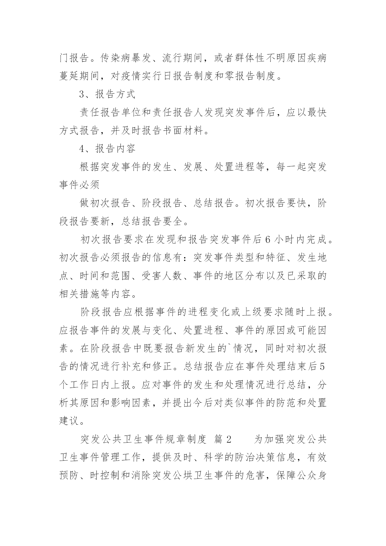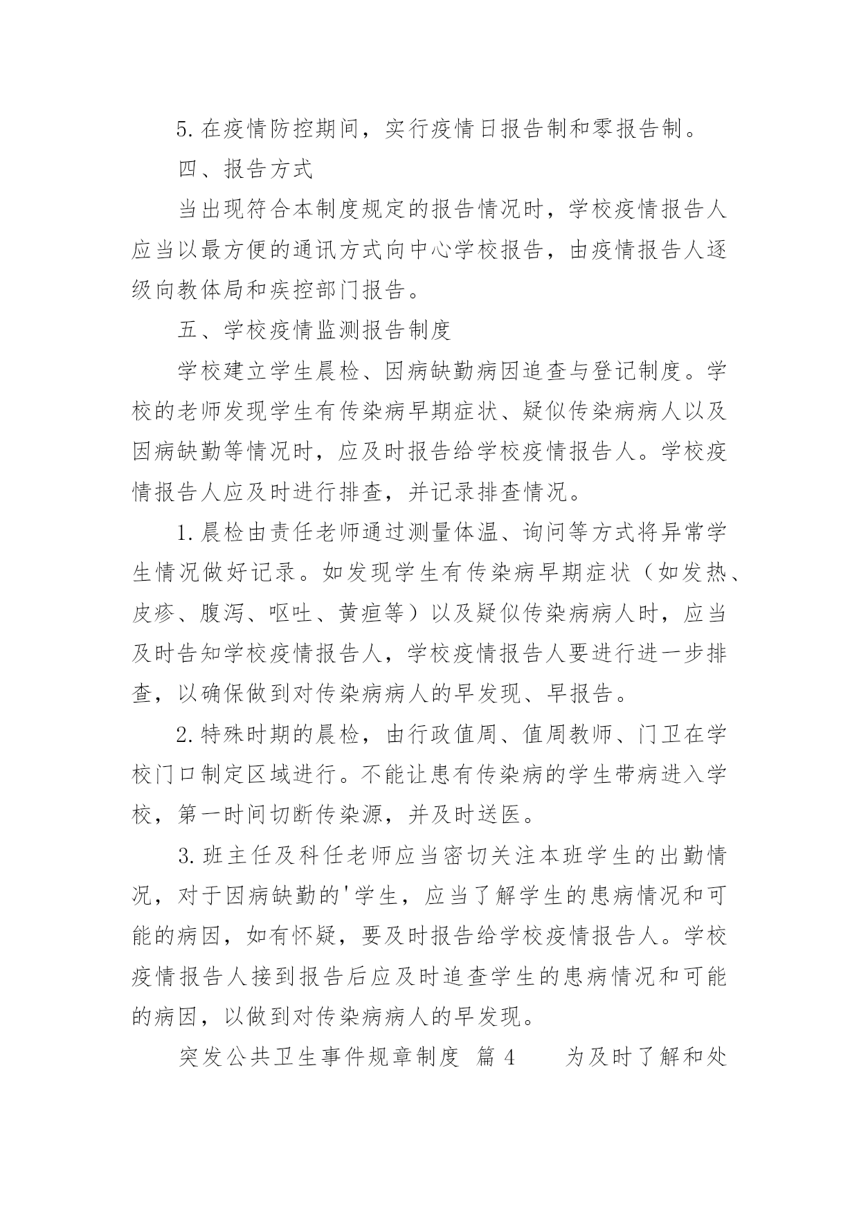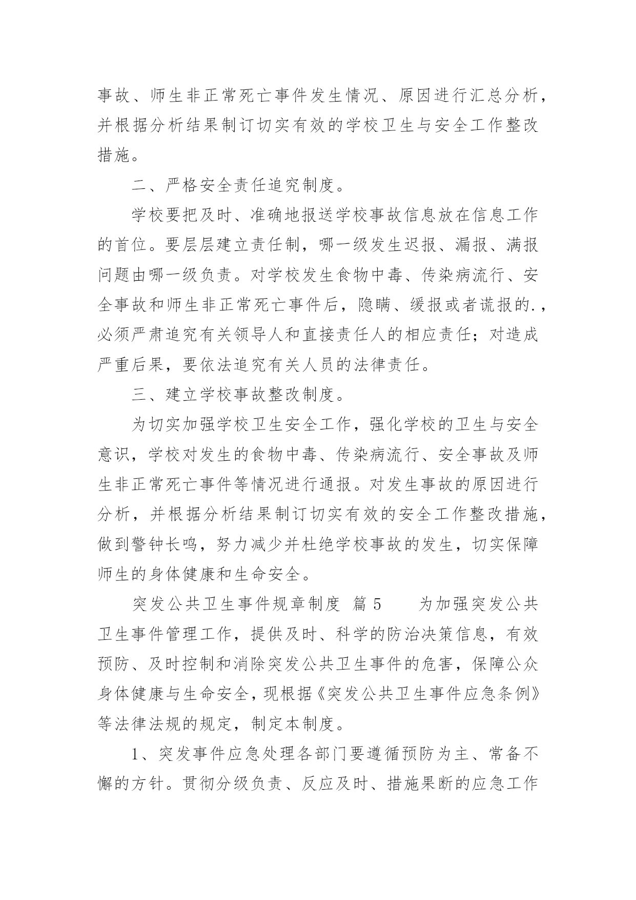 突发公共卫生事件规章制度突发公共卫生事件规章制度(精选10篇)在快速变化和不断变革的今天,制度的使用频率呈上升趋势,制度是国家法律、法令、政策的具体化,是人们行动的准则和依据。到底应如何拟定制度呢?下面是小编帮大家整理的突发公共卫生事件规章制度,仅供参考,大家一起来看看吧。突发公共卫生事件规章制度篇1突发事件发生后,要按《突发公共卫生事件应急条例》、《突发公共卫生事件与传染病疫情监测信息报告管理办法》和师有关部门规定的程序和时限报告,同时启动《突发公共卫生事件报告管理信息系统》报告相关信息。1、责任报告单位和报告人责任报告单位:三十团医院、疾控中心全体职工。任何单位和个人对突发事件,不得隐瞒、缓报、谎报或授意他人隐瞒、缓报、谎报。2、报告程序和时限医疗卫生机构、有关单位和个人发现突发事件,应在2小时内向所在地突发事件监测机构报告,同时向区卫生行政部门报告。突发事件监测机构接到或发现突发事件,应在2小时内向上级突发事件监测报告机构报告,同时向上级卫生行政部门报告。传染病暴发、流行期间,或者群体性不明原因疾病蔓延期间,对疫情实行日报告制度和零报告制度。3、报告方式责任报告单位和责任报告人发现突发事件后,应以最快方式报告,并及时报告书面材料。4、报告内容根据突发事件的发生、发展、处置进程等,每一起突发事件必须做初次报告、阶段报告、总结报告。初次报告要快,阶段报告要新,总结报告要全。初次报告要求在发现和报告突发事件后6小时内完成。初次报告必须报告的信息有:突发事件类型和特征、发生地点、时间和范围、受害人数、事件的地区分布以及已采取的相关措施等内容。阶段报告应根据事件的进程变化或上级要求随时上报。应报告事件的发展与变化、处置进程、事件的原因或可能因素。在阶段报告中既要报告新发生的`情况,同时对初次报告的情况进行补充和修正。总结报告应在事件处理结束后5个工作日内上报。应对事件的发生和处理情况进行总结,分析其原因和影响因素,并提出今后对类似事件的防范和处置建议。突发公共卫生事件规章制度篇2为加强突发公共卫生事件管理工作,提供及时、科学的防治决策信息,有效预防、时控制和消除突发公垬卫生事件的危害,保障公众身体健康与生命安全,现根据《突发公共卫生事件应急条例》等法律法规的规定,制定本制度。1、突发事件应急处理各部门要遵循预防为主、常备不阿尔及利亚的方针。贯彻批应及时、措施果断的应急工作原则,建立应急管理网络,并行使相应的权力和职责,各级有关科室和相关人员应勇力合作,保证各项应急工作的顺利执行。加强法制观念,依法应对突发事件。一旦突发事件发生,立即启动应急系统。2、各有关部门应首先保证突发事件应急处理所需的'、合格的通讯设备、医疗救护备、救治药品、医疗器械、防护物品等物资的调配和储备,做好后勤保障工作。服卫生主管部门突发事件应急处理指挥部的统一指挥3、医疗组在中心主任的领导下要组织相关科室,建立流行病学调查队伍,负责开展现场流行病学调查与处理,搜索密切接触者、追踪传染源,必要时进行隔离观察;进行疫点消毒及其技术指导。4、按照法律要求实行首诊医生负责制,发现疑似的突发公共卫生事件疫情时,应即用电话通知疫情管理人员,疫情管理人员要立即报告中心主任,同时向辖区疾病预防控制机构进行报告。任何单位和个人不得隐瞒、缓报、谎报或授意他人隐瞒、缓报,谎报。5、中心对因突发事件致病的人员提供医疗救护和现场救援,对就书写详细、完整的病历刻录对需要转送的病人,应当按照规定将病人及其病历记录的复印转送至接诊的或者指定的医疗机构。有权要求在突发事件中需要接受隔离治疗、医学观察的病人、疑似病人和传染病人密切得在釆取医学措施时予以配合。拒绝配合报公安机关依法协助强制执行,并配合卫生行政主管部门进入突发事件现场进行调查釆样、技术分析和检验,不得以任何理由予以拒绝。6、对传染病要按《传染病防治法》等相关的法律法规要求,做到早发现、早报告、早隔离、早治疗,切断传播途径,防止扩散。严格执行各项消毒隔离、医各项制度和措施,做好人员防护,防止交叉感染和院內慼染的发生,倣好污物、污水的无害化处理7、中心承担责任范围内突发公共卫生事件和疫情信息监测报告任务,建立突发公共卫生事件疫情信息监测报告制度并定期对医生和实习生进行有关突发公共卫生事件和传染病疫情监测信息报告工作的培训。8、发现人畜垬患传染病时,疾病预防控制机构和农、林部门应当互相通报疫情。9、发现瞒报、缓报、谎报或授意他人不报告突发性公共卫生事件或传染病疫情拒绝接诊病人的,拒不服从突发事件应急处理指挥部高度的对其主要领导、主管人员直接责任人给予行政处分,造成疫情播散或事态恶化等严重后果的,由司法机关追案其刑事责任。突发公共卫生事件规章制度篇3为了及时有效遏制传染病的发生和蔓延,保障师生的身体健康和生命安全,根据《传染病防治法》和《