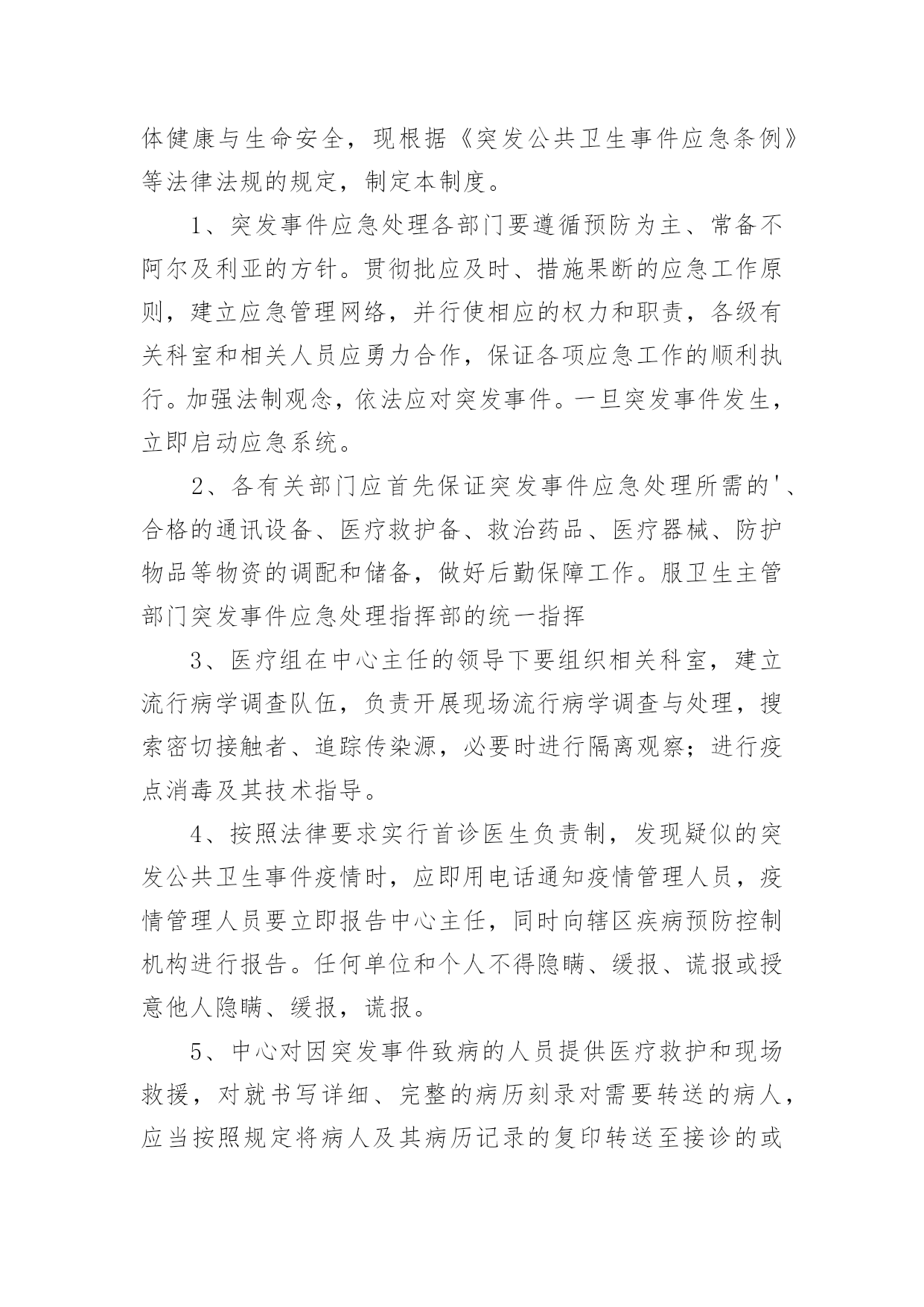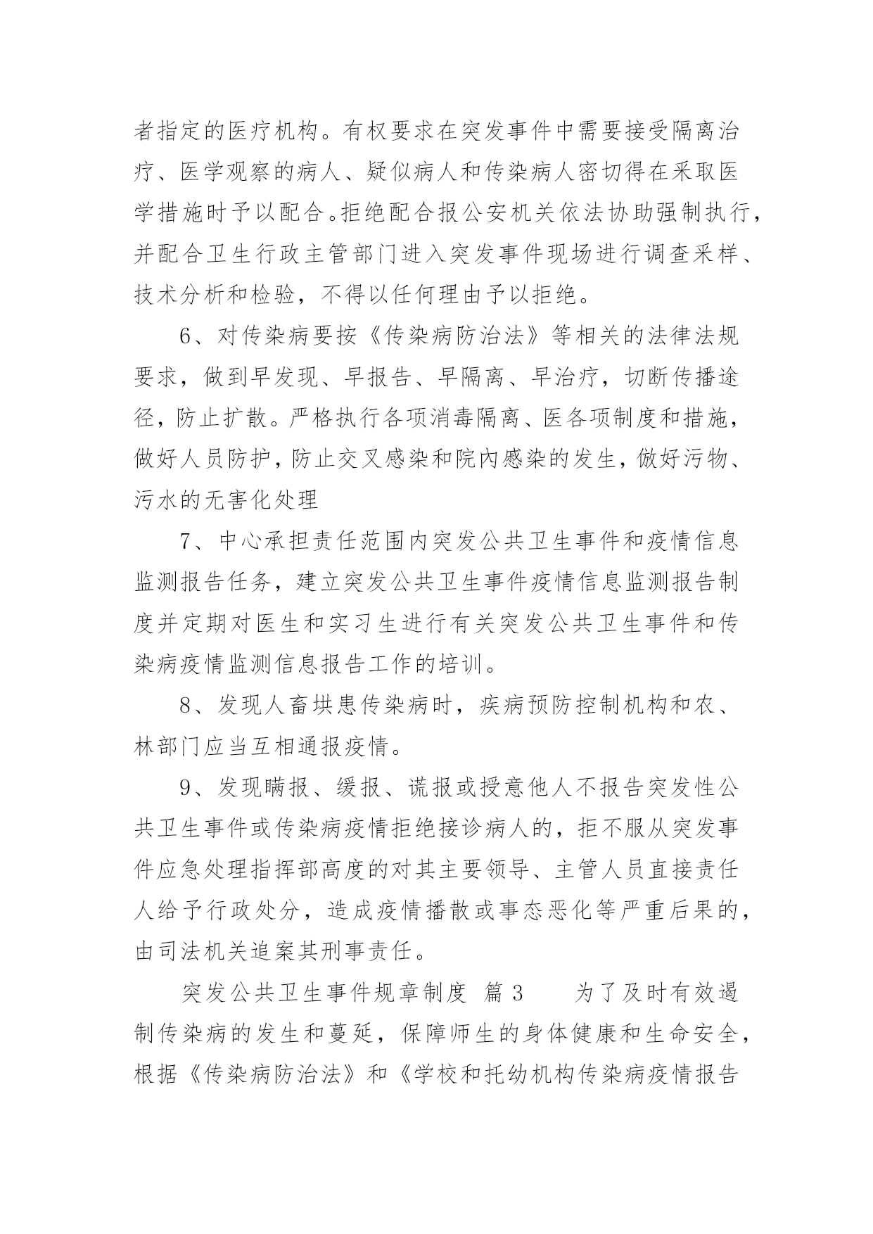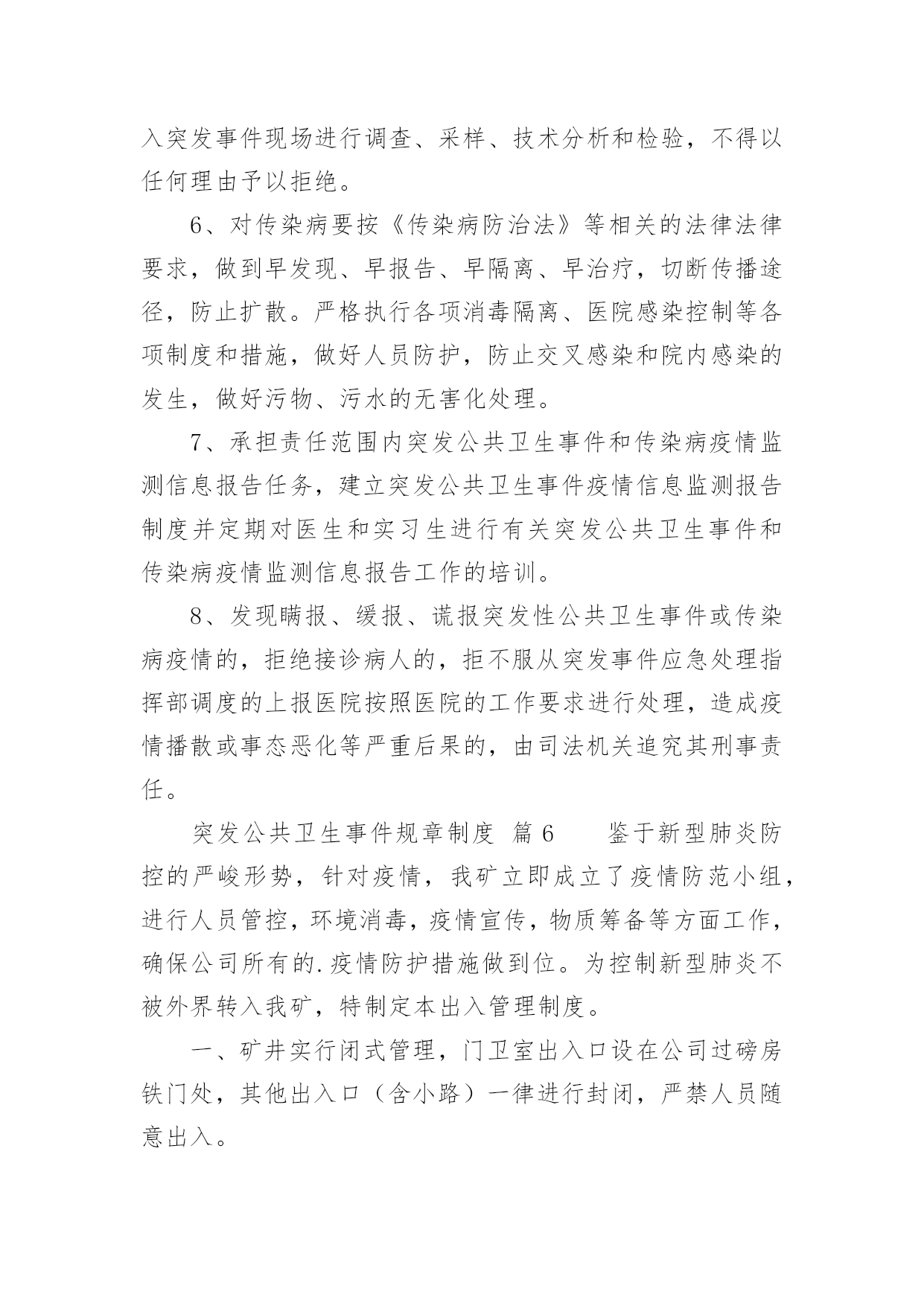 突发公共卫生事件规章制度突发公共卫生事件规章制度(精选10篇)在快速变化和不断变革的今天,制度的使用频率呈上升趋势,制度是国家法律、法令、政策的具体化,是人们行动的准则和依据。到底应如何拟定制度呢?下面是小编帮大家整理的突发公共卫生事件规章制度,仅供参考,大家一起来看看吧。突发公共卫生事件规章制度篇1突发事件发生后,要按《突发公共卫生事件应急条例》、《突发公共卫生事件与传染病疫情监测信息报告管理办法》和师有关部门规定的程序和时限报告,同时启动《突发公共卫生事件报告管理信息系统》报告相关信息。1、责任报告单位和报告人责任报告单位:三十团医院、疾控中心全体职工。任何单位和个人对突发事件,不得隐瞒、缓报、谎报或授意他人隐瞒、缓报、谎报。2、报告程序和时限医疗卫生机构、有关单位和个人发现突发事件,应在2小时内向所在地突发事件监测机构报告,同时向区卫生行政部门报告。突发事件监测机构接到或发现突发事件,应在2小时内向上级突发事件监测报告机构报告,同时向上级卫生行政部门报告。传染病暴发、流行期间,或者群体性不明原因疾病蔓延期间,对疫情实行日报告制度和零报告制度。3、报告方式责任报告单位和责任报告人发现突发事件后,应以最快方式报告,并及时报告书面材料。4、报告内容根据突发事件的发生、发展、处置进程等,每一起突发事件必须做初次报告、阶段报告、总结报告。初次报告要快,阶段报告要新,总结报告要全。初次报告要求在发现和报告突发事件后6小时内完成。初次报告必须报告的信息有:突发事件类型和特征、发生地点、时间和范围、受害人数、事件的地区分布以及已采取的相关措施等内容。阶段报告应根据事件的进程变化或上级要求随时上报。应报告事件的发展与变化、处置进程、事件的原因或可能因素。在阶段报告中既要报告新发生的`情况,同时对初次报告的情况进行补充和修正。总结报告应在事件处理结束后5个工作日内上报。应对事件的发生和处理情况进行总结,分析其原因和影响因素,并提出今后对类似事件的防范和处置建议。突发公共卫生事件规章制度篇2为加强突发公共卫生事件管理工作,提供及时、科学的防治决策信息,有效预防、时控制和消除突发公垬卫生事件的危害,保障公众身体健康与生命安全,现根据《突发公共卫生事件应急条例》等法律法规的规定,制定本制度。1、突发事件应急处理各部门要遵循预防为主、常备不阿尔及利亚的方针。贯彻批应及时、措施果断的应急工作原则,建立应急管理网络,并行使相应的权力和职责,各级有关科室和相关人员应勇力合作,保证各项应急工作的顺利执行。加强法制观念,依法应对突发事件。一旦突发事件发生,立即启动应急系统。2、各有关部门应首先保证突发事件应急处理所需的'、合格的通讯设备、医疗救护备、救治药品、医疗器械、防护物品等物资的调配和储备,做好后勤保障工作。服卫生主管部门突发事件应急处理指挥部的统一指挥3、医疗组在中心主任的领导下要组织相关科室,建立流行病学调查队伍,负责开展现场流行病学调查与处理,搜索密切接触者、追踪传染源,必要时进行隔离观察;进行疫点消毒及其技术指导。4、按照法律要求实行首诊医生负责制,发现疑似的突发公共卫生事件疫情时,应即用电话通知疫情管理人员,疫情管理人员要立即报告中心主任,同时向辖区疾病预防控制机构进行报告。任何单位和个人不得隐瞒、缓报、谎报或授意他人隐瞒、缓报,谎报。5、中心对因突发事件致病的人员提供医疗救护和现场救援,对就书写详细、完整的病历刻录对需要转送的病人,应当按照规定将病人及其病历记录的复印转送至接诊的或者指定的医疗机构。有权要求在突发事件中需要接受隔离治疗、医学观察的病人、疑似病人和传染病人密切得在釆取医学措施时予以配合。拒绝配合报公安机关依法协助强制执行,并配合卫生行政主管部门进入突发事件现场进行调查釆样、技术分析和检验,不得以任何理由予以拒绝。6、对传染病要按《传染病防治法》等相关的法律法规要求,做到早发现、早报告、早隔离、早治疗,切断传播途径,防止扩散。严格执行各项消毒隔离、医各项制度和措施,做好人员防护,防止交叉感染和院內慼染的发生,倣好污物、污水的无害化处理7、中心承担责任范围内突发公共卫生事件和疫情信息监测报告任务,建立突发公共卫生事件疫情信息监测报告制度并定期对医生和实习生进行有关突发公共卫生事件和传染病疫情监测信息报告工作的培训。8、发现人畜垬患传染病时,疾病预防控制机构和农、林部门应当互相通报疫情。9、发现瞒报、缓报、谎报或授意他人不报告突发性公共卫生事件或传染病疫情拒绝接诊病人的,拒不服从突发事件应急处理指挥部高度的对其主要领导、主管人员直接责任人给予行政处分,造成疫情播散或事态恶化等严重后果的,由司法机关追案其刑事责任。突发公共卫生事件规章制度篇3为了及时有效遏制传染病的发生和蔓延,保障师生的身体健康和生命安全,根据《传染病防治法》和《