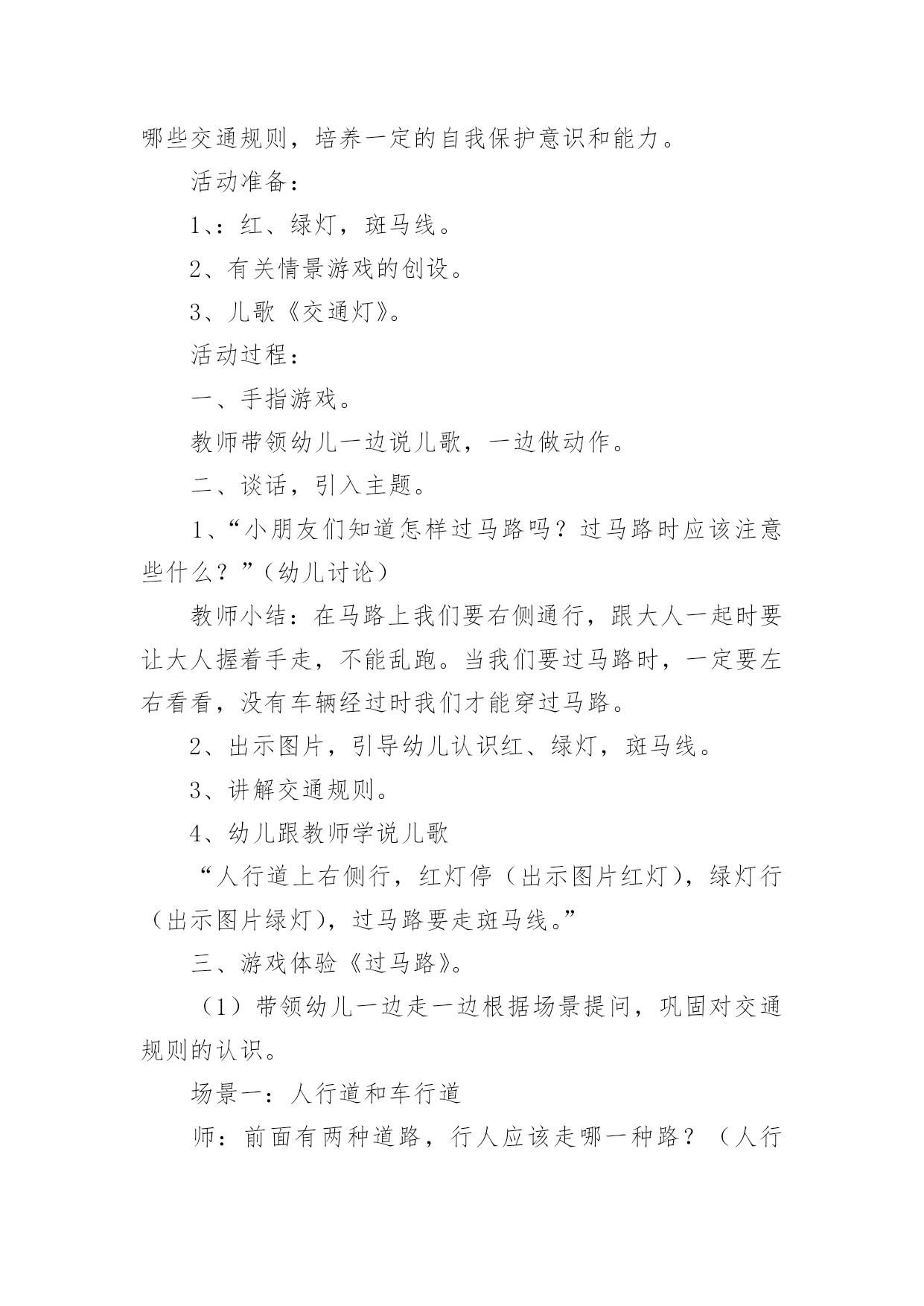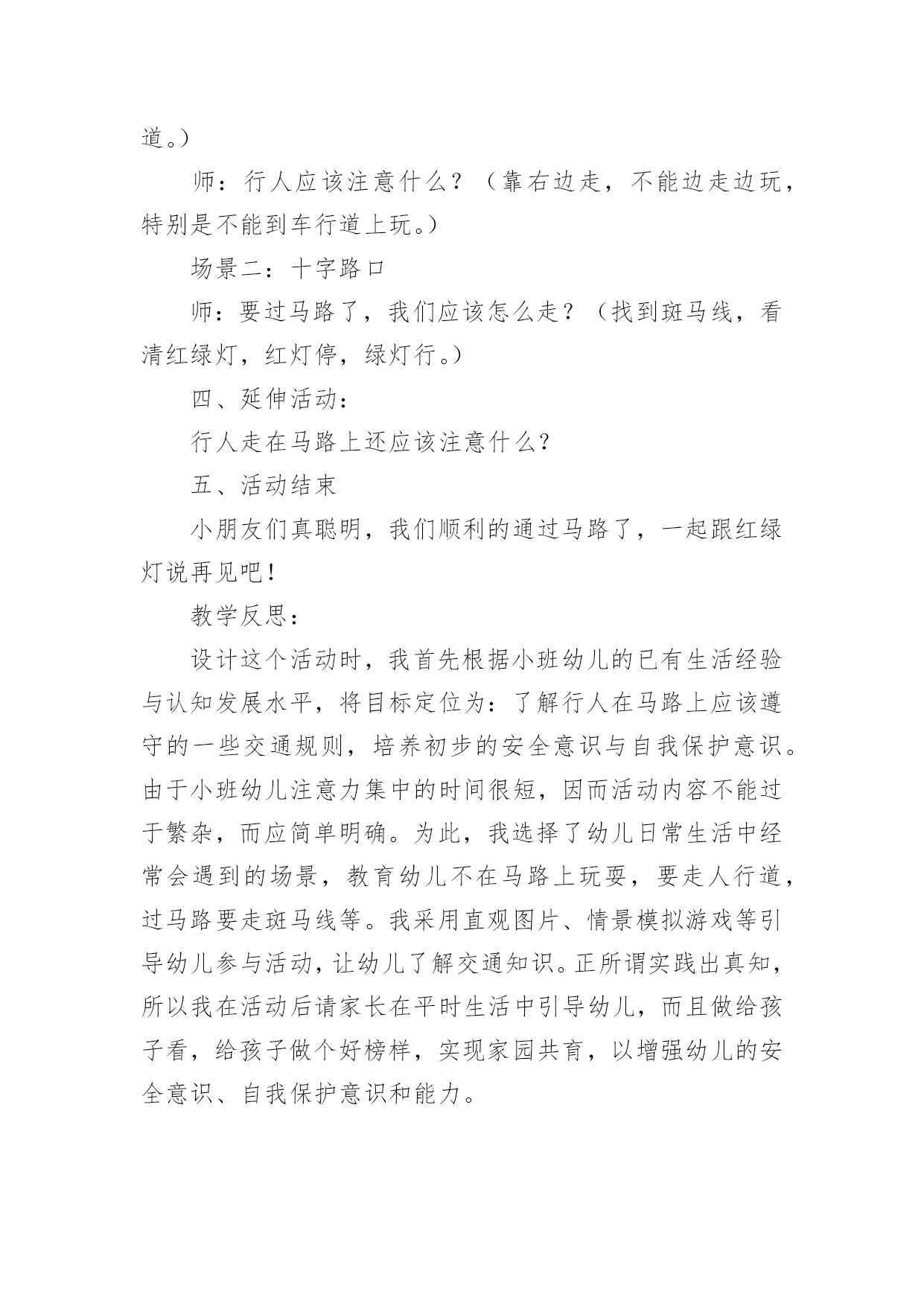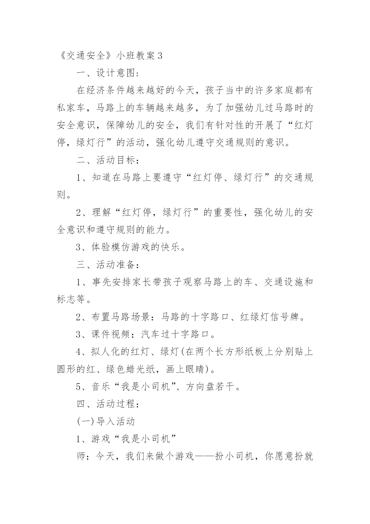 《交通安全》小班教案作为一名专为他人授业解惑的人民教师,就难以避免地要准备教案,教案是实施教学的主要依据,有着至关重要的作用。那么写教案需要注意哪些问题呢?下面是小编帮大家整理的《交通安全》小班教案,仅供参考,希望能够帮助到大家。《交通安全》小班教案1活动目标:1.幼儿了解一些基本的道路交通安全知识,认识一些常见的交通标志。2.幼儿能积极参与到活动中来,在游戏活动中体验交通规则的重要性,懂得如何在实际情景中运用所知道的交通安全知识。3.幼儿养成自觉地遵守交通规则的好习惯。活动重点:幼儿了解一些基本的道路交通安全知识,认识一些常见的交通标志。活动难点:幼儿在游戏活动中体验交通规则的重要性,懂得如何在实际情景中运用所知道的交通安全知识。活动准备:物质准备:课件,儿童自行车两辆,小汽车(扭扭车)两辆,红绿信号灯标志,汽车方向盘4个,一顶警帽,交通安全小卫士的贴纸。经验准备:幼儿知道一些简单的道路交通安全知识。场地准备:布置好活动场景(模拟十字路口),画好机动车道、非机动车道、人行横道。活动过程:一、幼儿观看课件,教师引导幼儿讨论:1.幼儿观看课件1――《上学路上》,教师提问:刚才的动画片告诉我们上学路上应该注意些什么?哪些行为是违反交通规则的?正确的应该怎么做?对回答问题的小朋友进行鼓励,把交通安全小卫士的贴片贴在小朋友的胸前。2.幼儿观看课件2――认识一些常见的交通标志,教师提问:你认识这些标志吗?你知道它们是什么意思吗?(禁止非机动车行驶,行人走道,禁止行人通过,减速慢行、注意行人)二、设置情境,幼儿模拟过十字路口:1.组织幼儿按十字型分组坐在画好的场地上。幼儿认识斑马线、非机动车道,机动车道。2.幼儿游戏,模拟看信号灯过马路:两个小朋友开扭扭车当司机,两个小朋友骑单车以及四个行人模拟过十字路口。幼儿在没有指挥的情况下过十字路口,车辆和行人任意穿行。引导幼儿讨论:小朋友,刚才你们看到了什么?他们做得对吗?他们应该怎么做?教师小结幼儿讲述,出示红绿信号灯,请出一位幼儿来当指挥,幼儿再次有序地过马路。3.幼儿模拟看现场指挥过十字路口刚才我们认识的红绿灯和交通标志对维护交通安全起着重要的作用。但不是每个路口都有红绿灯,没有红绿灯的路口由谁来指挥交通呢?(交通警察)交通警察怎么指挥交通呢?你们想学交通指挥手势吗?幼儿学习几种简单的交通指挥手势。请一名幼儿戴上警帽当交警,幼儿模拟看现场指挥过十字路口。三、创设游戏情境:去郊游现在,我们开车去郊游吧!请一名幼儿戴上警帽当交警,其他幼儿分为四组,前面的小朋友当司机(每人一个方向盘),后面的'小朋友依次抱着前一位小朋友的腰,做成开公共汽车的样子。教师提示:在没有任何交通标志的马路上,大家应该靠右边行走,过马路时,应看看两边没有车辆时再过马路。幼儿看交通警察指挥手势,教师播放课件,幼儿在交通安全童谣的音乐中模拟过十字路口(幼儿轮流当司机)。教师进行活动总结,鼓励幼儿养成自觉地遵守交通规则的好习惯:今天大家表现得都很出色,都可以成为一名合格的交通安全小卫士(给没有得到贴片的幼儿贴上小贴片)。希望小朋友从小养成遵守交通规则的好习惯,并告诉我们的爸爸妈妈及身边所有的人,自觉维护交通安全,让更多的孩子安安全全到家。《交通安全》小班教案2设计意图:《幼儿教育纲要》指出:要为幼儿提供健康、丰富的学习和生活活动,满足幼儿各方面发展的需要,要让幼儿知道必要的安全保健知识,学习保护自己。小班孩子由于年龄特点,对于保护自己,珍惜生命的意识是极其缺乏的,我班不少家长特别是爷爷奶奶反映,孩子一出幼儿园就跑开了,过马路也不肯拉着大人。为了让孩子感悟到生命的珍贵,萌发保护自己的安全意识,减少幼儿身心受到意外伤害的可能性。让幼儿在有安全意识的基础上,时时提醒自己或他人注意交通安全。为此我班开展了系列交通安全教育的活动。活动目标:1、让幼儿了解一些基本的交通安全知识,知道红灯停,绿灯行的道理。2、知道过马路时要注意自己的'安全,让幼儿知道不走斑马线的危险性。3、让幼儿学会念儿歌,进一步培养幼儿的幼儿的语言表达能力。4、遵守社会行为规则,不做“禁止”的事。5、加强幼儿的安全意识。活动重难点:1、了解基本的交通知识,知道红灯停,绿灯行的道理。2、在游戏活动中体验交通规则,知道行走时具体遵守哪些交通规则,培养一定的自我保护意识和能力。活动准备:1、:红、绿灯,斑马线。2、有关情景游戏的创设。3、儿歌《交通灯》。活动过程:一、手指游戏。教师带领幼儿一边说儿歌,一边做动作。二、谈话,引入主题。1、“小朋友们知道怎样过马路吗?过马路时应该注意些什么?”(幼儿讨论)教师小结:在马路上我们要右侧通行,跟大人一起时要让大人握着手走,不能乱跑。当我们要过马路时,一定要左右看看,没有车辆经过时我们才能穿过马路。2、出示图片,引导幼儿认识红、绿灯,