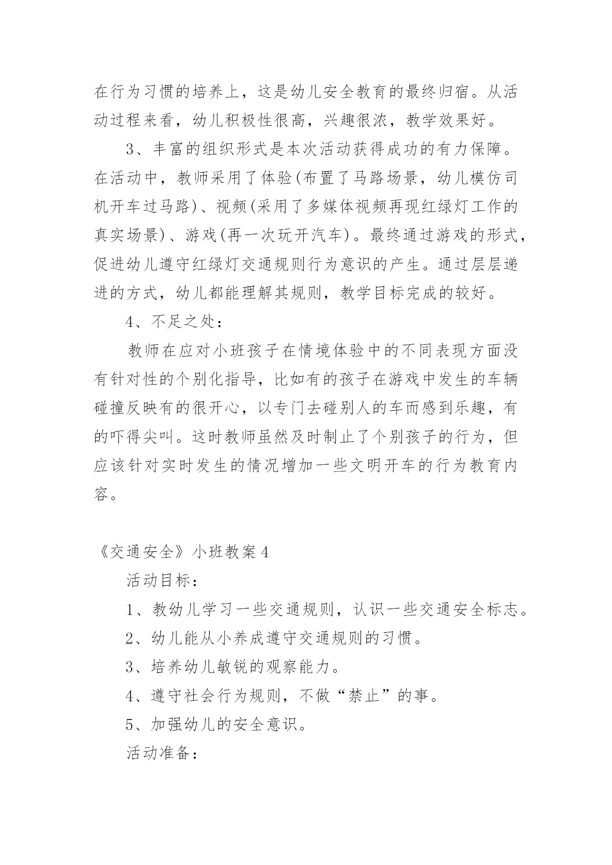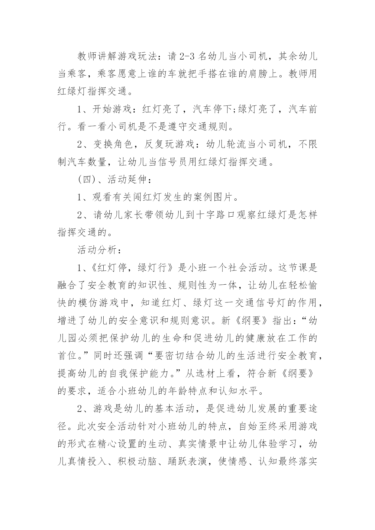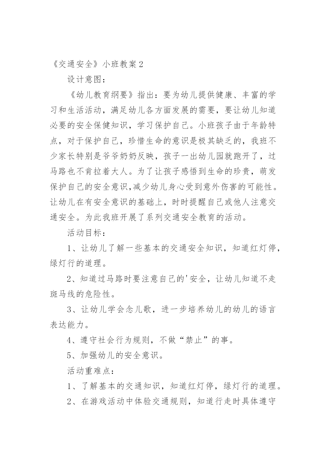 《交通安全》小班教案作为一名专为他人授业解惑的人民教师,就难以避免地要准备教案,教案是实施教学的主要依据,有着至关重要的作用。那么写教案需要注意哪些问题呢?下面是小编帮大家整理的《交通安全》小班教案,仅供参考,希望能够帮助到大家。《交通安全》小班教案1活动目标:1.幼儿了解一些基本的道路交通安全知识,认识一些常见的交通标志。2.幼儿能积极参与到活动中来,在游戏活动中体验交通规则的重要性,懂得如何在实际情景中运用所知道的交通安全知识。3.幼儿养成自觉地遵守交通规则的好习惯。活动重点:幼儿了解一些基本的道路交通安全知识,认识一些常见的交通标志。活动难点:幼儿在游戏活动中体验交通规则的重要性,懂得如何在实际情景中运用所知道的交通安全知识。活动准备:物质准备:课件,儿童自行车两辆,小汽车(扭扭车)两辆,红绿信号灯标志,汽车方向盘4个,一顶警帽,交通安全小卫士的贴纸。经验准备:幼儿知道一些简单的道路交通安全知识。场地准备:布置好活动场景(模拟十字路口),画好机动车道、非机动车道、人行横道。活动过程:一、幼儿观看课件,教师引导幼儿讨论:1.幼儿观看课件1――《上学路上》,教师提问:刚才的动画片告诉我们上学路上应该注意些什么?哪些行为是违反交通规则的?正确的应该怎么做?对回答问题的小朋友进行鼓励,把交通安全小卫士的贴片贴在小朋友的胸前。2.幼儿观看课件2――认识一些常见的交通标志,教师提问:你认识这些标志吗?你知道它们是什么意思吗?(禁止非机动车行驶,行人走道,禁止行人通过,减速慢行、注意行人)二、设置情境,幼儿模拟过十字路口:1.组织幼儿按十字型分组坐在画好的场地上。幼儿认识斑马线、非机动车道,机动车道。2.幼儿游戏,模拟看信号灯过马路:两个小朋友开扭扭车当司机,两个小朋友骑单车以及四个行人模拟过十字路口。幼儿在没有指挥的情况下过十字路口,车辆和行人任意穿行。引导幼儿讨论:小朋友,刚才你们看到了什么?他们做得对吗?他们应该怎么做?教师小结幼儿讲述,出示红绿信号灯,请出一位幼儿来当指挥,幼儿再次有序地过马路。3.幼儿模拟看现场指挥过十字路口刚才我们认识的红绿灯和交通标志对维护交通安全起着重要的作用。但不是每个路口都有红绿灯,没有红绿灯的路口由谁来指挥交通呢?(交通警察)交通警察怎么指挥交通呢?你们想学交通指挥手势吗?幼儿学习几种简单的交通指挥手势。请一名幼儿戴上警帽当交警,幼儿模拟看现场指挥过十字路口。三、创设游戏情境:去郊游现在,我们开车去郊游吧!请一名幼儿戴上警帽当交警,其他幼儿分为四组,前面的小朋友当司机(每人一个方向盘),后面的'小朋友依次抱着前一位小朋友的腰,做成开公共汽车的样子。教师提示:在没有任何交通标志的马路上,大家应该靠右边行走,过马路时,应看看两边没有车辆时再过马路。幼儿看交通警察指挥手势,教师播放课件,幼儿在交通安全童谣的音乐中模拟过十字路口(幼儿轮流当司机)。教师进行活动总结,鼓励幼儿养成自觉地遵守交通规则的好习惯:今天大家表现得都很出色,都可以成为一名合格的交通安全小卫士(给没有得到贴片的幼儿贴上小贴片)。希望小朋友从小养成遵守交通规则的好习惯,并告诉我们的爸爸妈妈及身边所有的人,自觉维护交通安全,让更多的孩子安安全全到家。《交通安全》小班教案2设计意图:《幼儿教育纲要》指出:要为幼儿提供健康、丰富的学习和生活活动,满足幼儿各方面发展的需要,要让幼儿知道必要的安全保健知识,学习保护自己。小班孩子由于年龄特点,对于保护自己,珍惜生命的意识是极其缺乏的,我班不少家长特别是爷爷奶奶反映,孩子一出幼儿园就跑开了,过马路也不肯拉着大人。为了让孩子感悟到生命的珍贵,萌发保护自己的安全意识,减少幼儿身心受到意外伤害的可能性。让幼儿在有安全意识的基础上,时时提醒自己或他人注意交通安全。为此我班开展了系列交通安全教育的活动。活动目标:1、让幼儿了解一些基本的交通安全知识,知道红灯停,绿灯行的道理。2、知道过马路时要注意自己的'安全,让幼儿知道不走斑马线的危险性。3、让幼儿学会念儿歌,进一步培养幼儿的幼儿的语言表达能力。4、遵守社会行为规则,不做“禁止”的事。5、加强幼儿的安全意识。活动重难点:1、了解基本的交通知识,知道红灯停,绿灯行的道理。2、在游戏活动中体验交通规则,知道行走时具体遵守哪些交通规则,培养一定的自我保护意识和能力。活动准备:1、:红、绿灯,斑马线。2、有关情景游戏的创设。3、儿歌《交通灯》。活动过程:一、手指游戏。教师带领幼儿一边说儿歌,一边做动作。二、谈话,引入主题。1、“小朋友们知道怎样过马路吗?过马路时应该注意些什么?”(幼儿讨论)教师小结:在马路上我们要右侧通行,跟大人一起时要让大人握着手走,不能乱跑。当我们要过马路时,一定要左右看看,没有车辆经过时我们才能穿过马路。2、出示图片,引导幼儿认识红、绿灯,