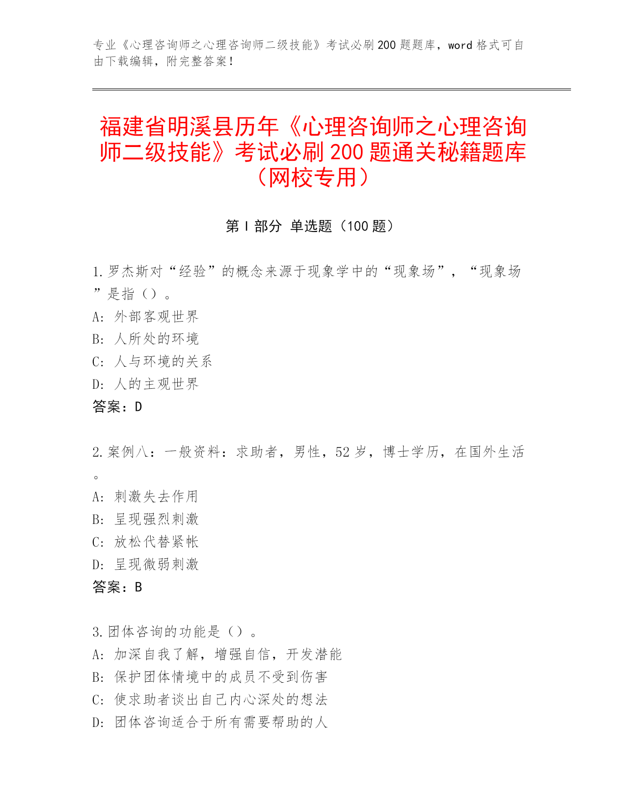 福建省明溪县历年《心理咨询师之心理咨询师二级技能》考试必刷200题通关秘籍题库(网校专用)
