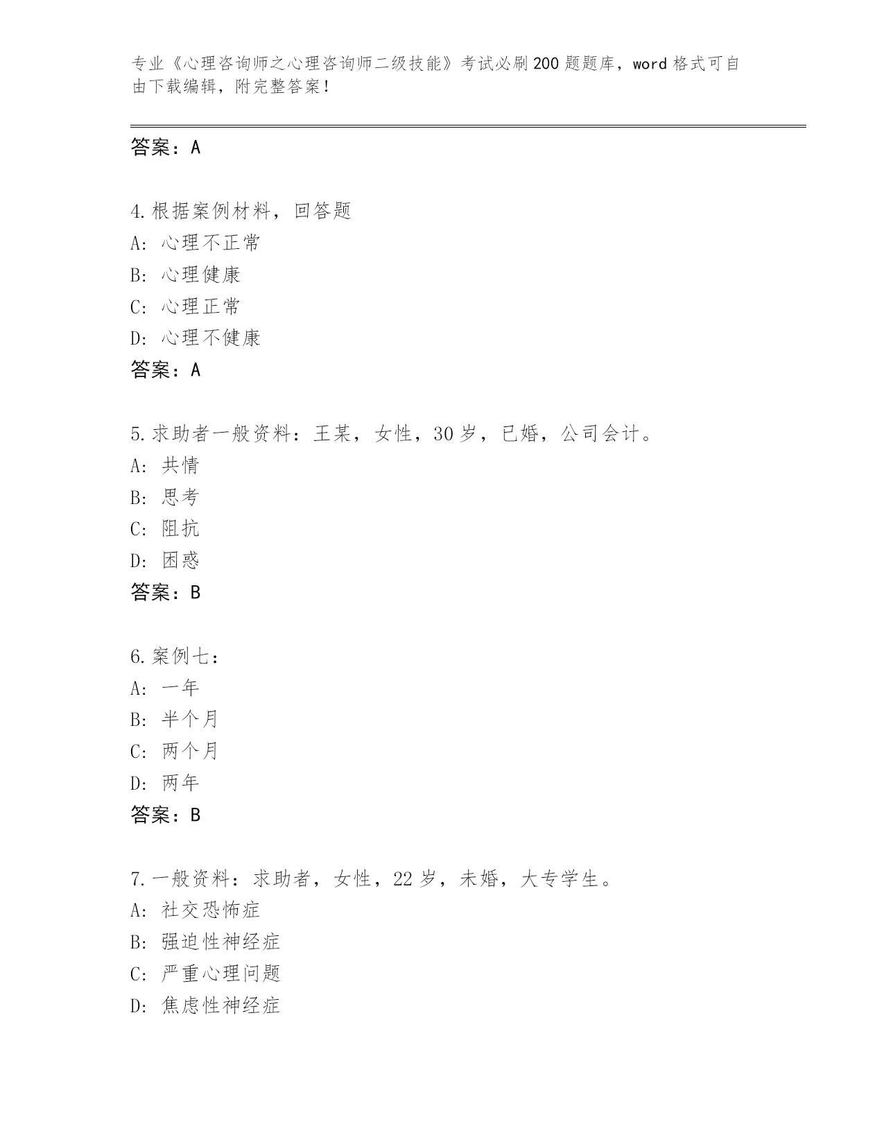 陕西省佳县历年《心理咨询师之心理咨询师二级技能》考试必刷200题通关秘籍题库及下载答案