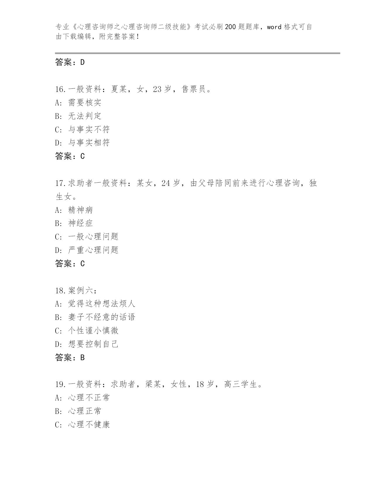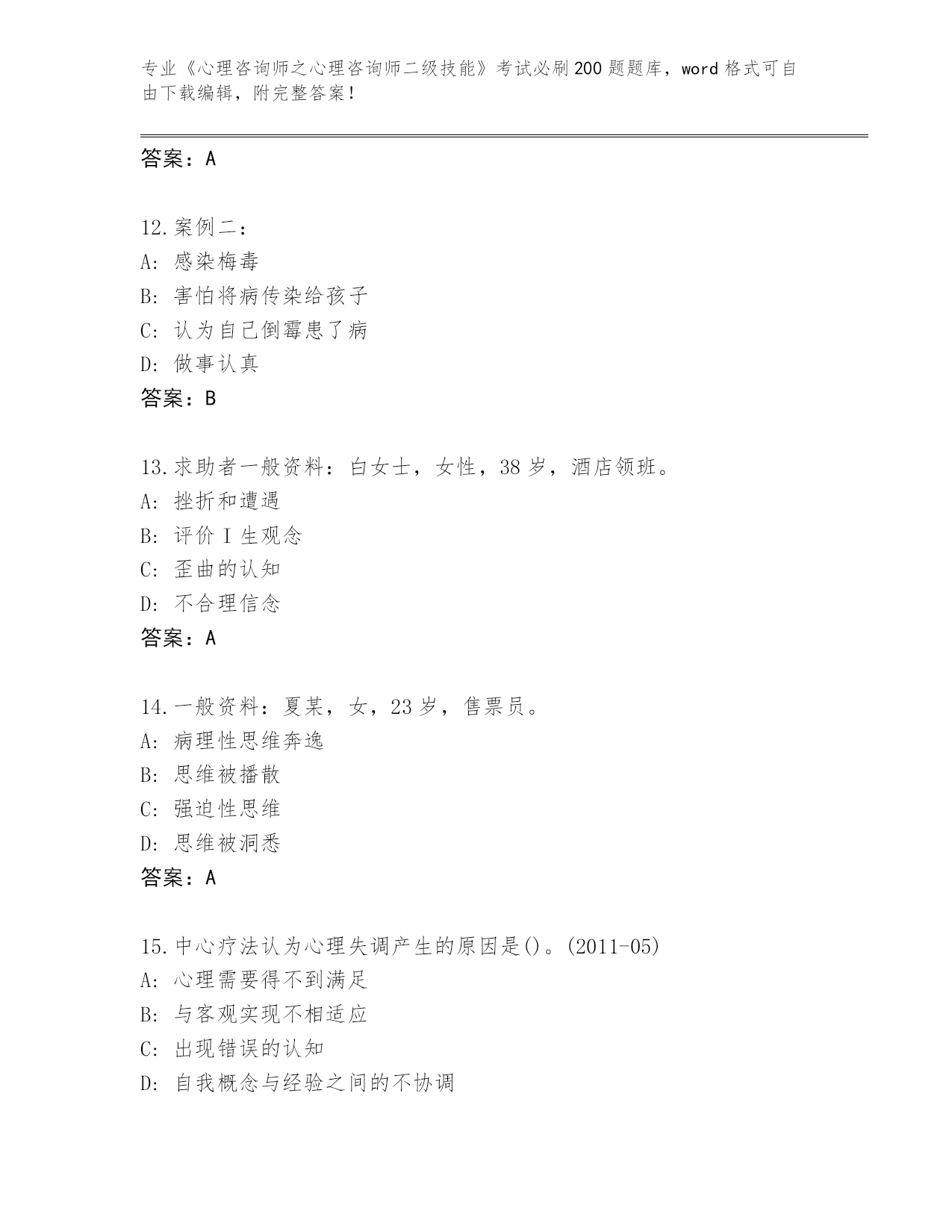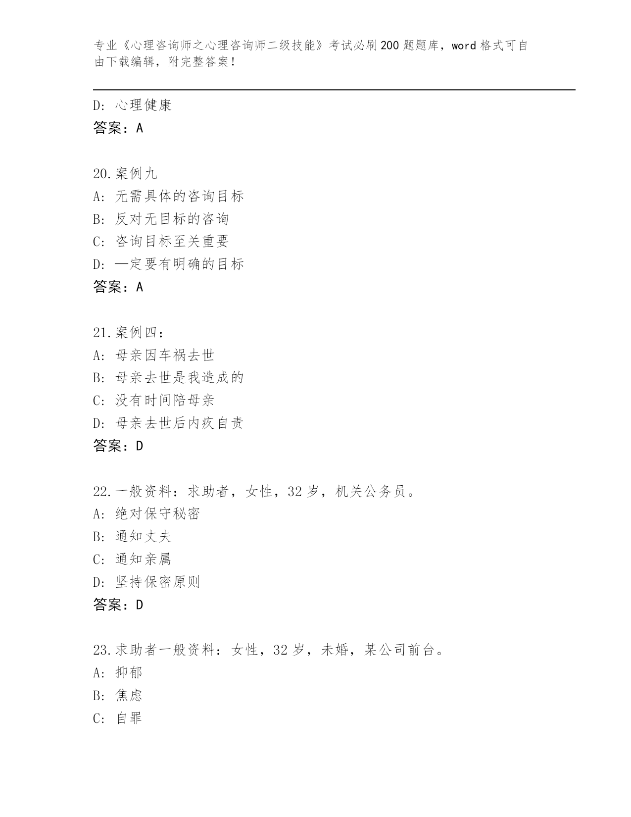 山西省历年《心理咨询师之心理咨询师二级技能》考试必刷200题通关秘籍题库带答案