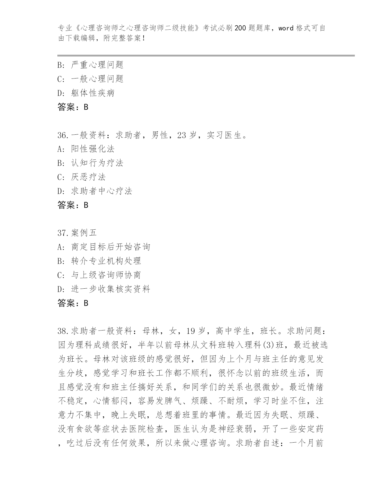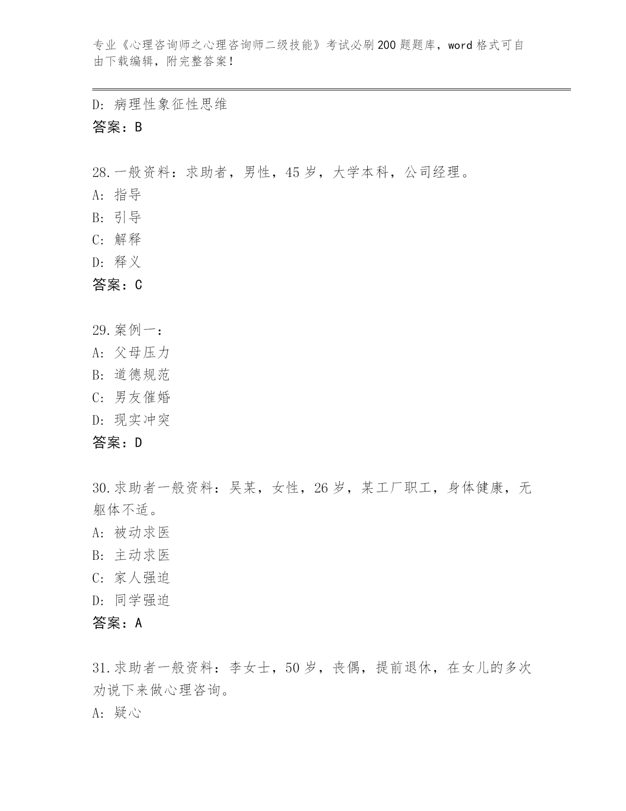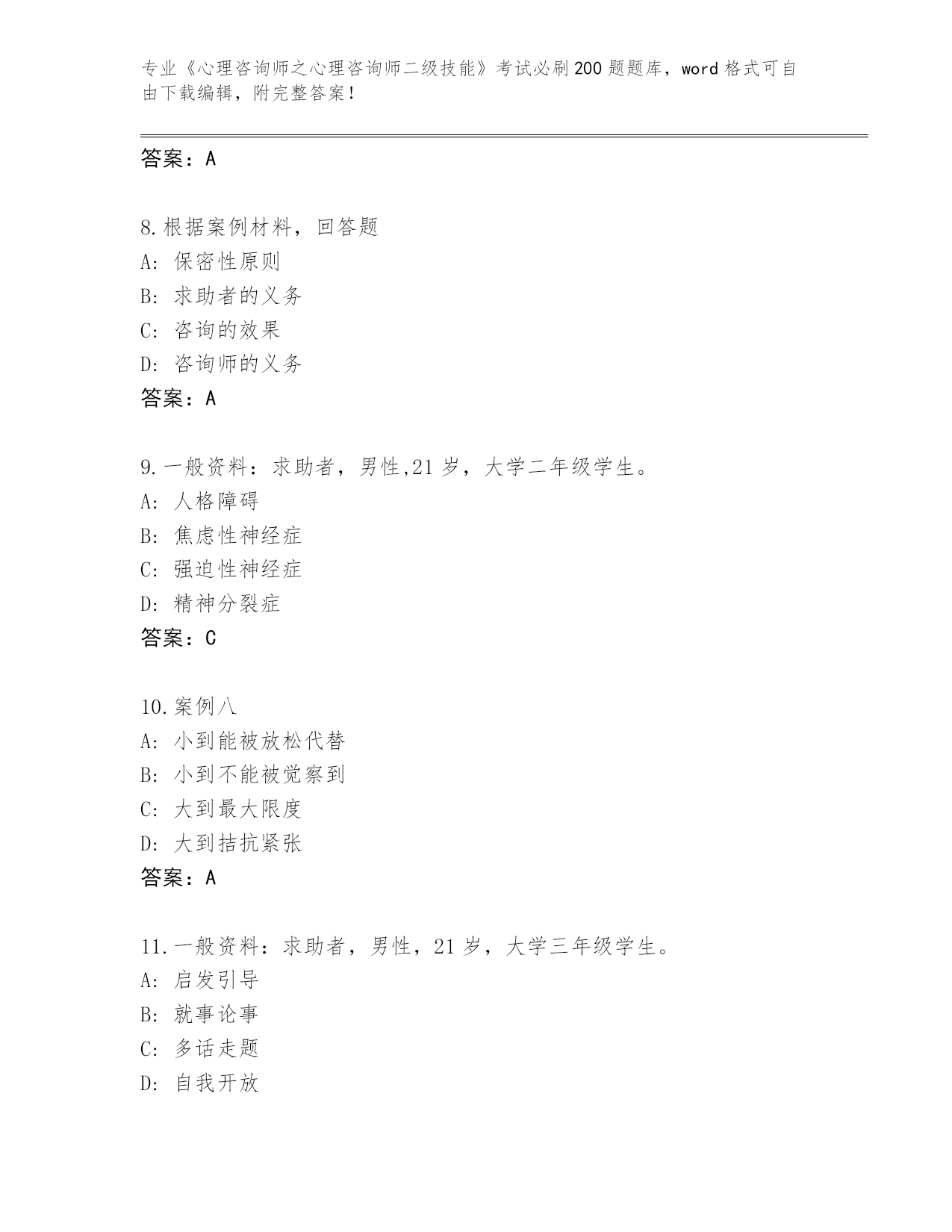 山西省历年《心理咨询师之心理咨询师二级技能》考试必刷200题通关秘籍题库带答案
