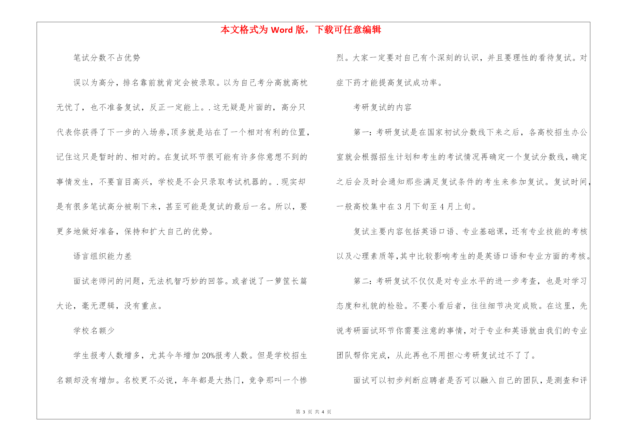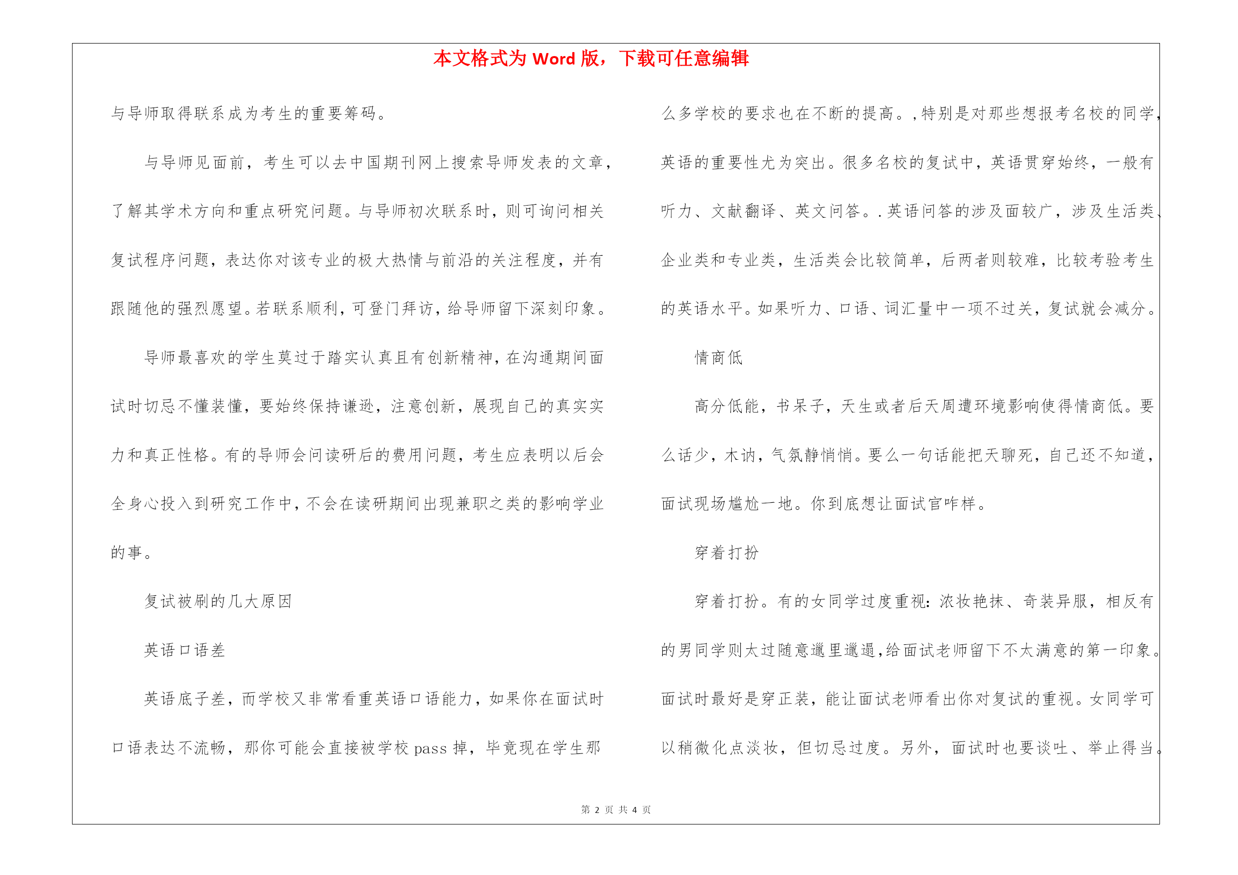 本文格式为Word版,下载可任意编辑第PAGE\*MERGEFORMAT4页共NUMPAGES\*MERGEFORMAT4页2021年研究生复试策略分享研究生复试不容易过的,复试分为两个部分分别为笔试和面试。笔试对于考生来说是非常简单的,难就难在面试上面。下面我给大家带来关于研究生复试策略分享,方便大家学习,希望会对大家的工作与学习有所帮助。研究生复试策略1、把握调剂黄金时期广泛撒网初试过后,考生应积极打听分数以及自己的排名情况。尽早确定自己是否能进入复试,以免贻误调剂时间。每年都有一些同学自认为自己分数不错,没有考虑复试问题,更没有调剂的打算,当排挤出列后连调剂都来不及了。一般三四月份许多网站上会有专门发布调剂信息,如果你符合一些学校的调剂条件,就可以马上电话咨询或信件联系,向所报考学校研招办问询他们是否可以推荐调剂。广泛撒网,就会多点机会。2、尽快掌握报考学校复试情况如果觉得自己能进入复试的同学,那就一定要赶紧做两件事来准备复试了。第一是买参考书和历年真题,第二是上网找信息。信息是非常重要的,尤其是面试,考什么,怎么考,都只有通过往届生才能了解。考生要尽早登录报考学校的网站,关注该校的复试办法,包括复试时间、地点、考官和复试细则等。大部分学校的复试办法一般在每年国家复试分数线公布前后出台。考生可以参考报考学校去年的复试办法做相应准备。考生还要明确该校复试的指定书目,可向上届师兄师姐询问复试范围,并到所报考学校的网站论坛及研究生考试类的网站论坛搜集相关信息。3、了解导师学术方向上门拜访复试中至关重要的一环是综合面试,面试中导师组会考察考生的专业知识与思维能力,这往往决定对一个人的取舍,因此在复试之前与导师取得联系成为考生的重要筹码。与导师见面前,考生可以去中国期刊网上搜索导师发表的文章,了解其学术方向和重点研究问题。与导师初次联系时,则可询问相关复试程序问题,表达你对该专业的极大热情与前沿的关注程度,并有跟随他的强烈愿望。若联系顺利,可登门拜访,给导师留下深刻印象。导师最喜欢的学生莫过于踏实认真且有创新精神,在沟通期间面试时切忌不懂装懂,要始终保持谦逊,注意创新,展现自己的真实实力和真正性格。有的导师会问读研后的费用问题,考生应表明以后会全身心投入到研究工作中,不会在读研期间出现兼职之类的影响学业的事。复试被刷的几大原因英语口语差英语底子差,而学校又非常看重英语口语能力,如果你在面试时口语表达不流畅,那你可能会直接被学校pass掉,毕竟现在学生那么多学校的要求也在不断的提高。,特别是对那些想报考名校的同学,英语的重要性尤为突出。很多名校的复试中,英语贯穿始终,一般有听力、文献翻译、英文问答。.英语问答的涉及面较广,涉及生活类、企业类和专业类,生活类会比较简单,后两者则较难,比较考验考生的英语水平。如果听力、口语、词汇量中一项不过关,复试就会减分。情商低高分低能,书呆子,天生或者后天周遭环境影响使得情商低。要么话少,木讷,气氛静悄悄。要么一句话能把天聊死,自己还不知道,面试现场尴尬一地。你到底想让面试官咋样。穿着打扮穿着打扮。有的女同学过度重视:浓妆艳抹、奇装异服,相反有的男同学则太过随意邋里邋遢,给面试老师留下不太满意的第一印象。面试时最好是穿正装,能让面试老师看出你对复试的重视。女同学可以稍微化点淡妆,但切忌过度。另外,面试时也要谈吐、举止得当。笔试分数不占优势误以为高分,排名靠前就肯定会被录取。以为自己考分高就高枕无忧了,也不准备复试,反正一定能上。.这无疑是片面的,高分只代表你获得了下一步的入场券,顶多就是站在了一个相对有利的位置,记住这只是暂时的、相对的。在复试环节很可能有许多你意想不到的事情发生,不要盲目高兴,学校是不会只录取考试机器的。.现实却是有很多笔试高分被刷下来,甚至可能是复试的最后一名。所以,要更多地做好准备,保持和扩大自己的优势。语言组织能力差面试老师问的问题,无法机智巧妙的回答。或者说了一箩筐长篇大论,毫无逻辑,没有重点。学校名额少学生报考人数增多,尤其今年增加20%报考人数。但是学校招生名额却没有增加。名校更不必说,年年都是大热门,竞争那叫一个惨烈。大家一定要对自己有个深刻的认识,并且要理性的看待复试。对症下药才能提高复试成功率。考研复试的内容第一:考研复试是在国家初试分数线下来之后,各高校招生办公室就会根据招生计划和考生的考试情况再确定一个复试分数线,确定之后会及时会通知那些满足复试条件的考生来参加复试。复试时间,一般高校集中在3月下旬至4月上旬。复试主要内容包括英语口语、专业基础课,还有专业技能的考核以及心理素质等,其中比较影响考生的是英语口语和专业方面的考核。第二:考研复试不仅仅是对专业水平的进一步考查,也是对学习态度和礼貌的检验。不要小看后者,往往细节决定成败。在这里,先