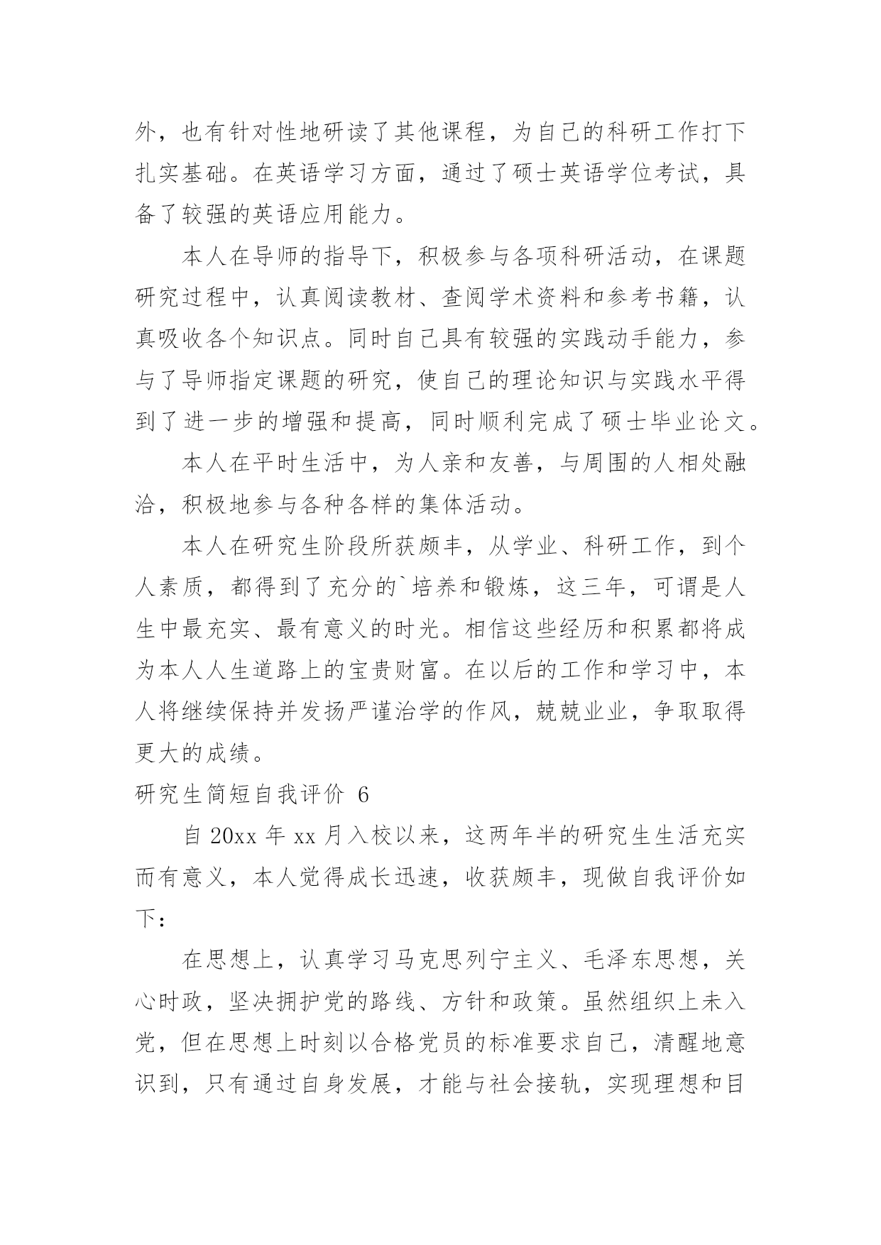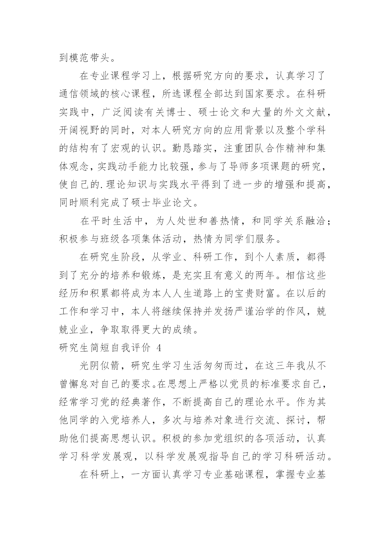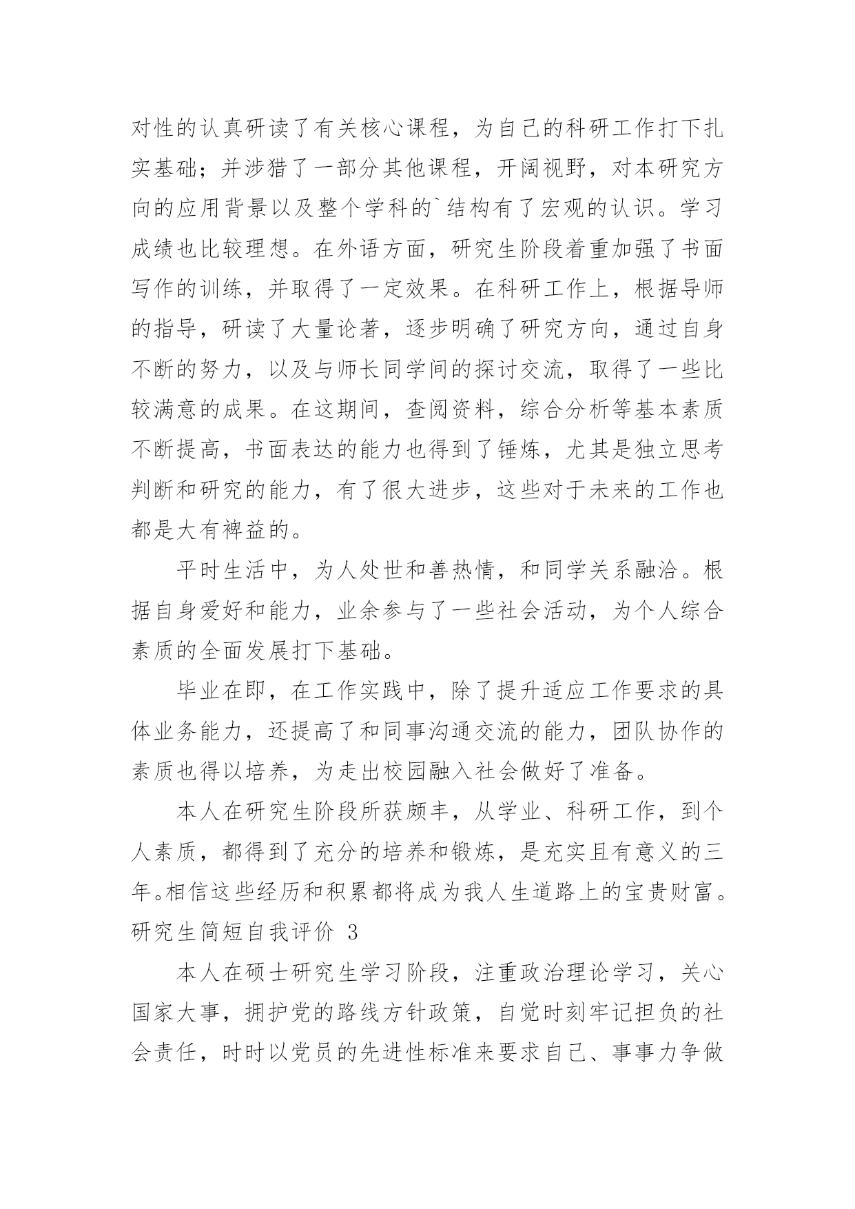 研究生简短自我评价研究生简短自我评价无论在学习、工作或是生活中,我们需要用到自我评价的情况非常的多,自我评价对个人的自我发展有着特殊的意义。那么,怎么去写自我评价呢?以下是小编为大家整理的研究生简短自我评价,欢迎阅读与收藏。研究生简短自我评价1两年的硕士研究生学习已经接近尾声,马上就要从学校走向社会了。回顾这两年来,通过自己不断的努力,在工作、学习、生活等各方面都有所提高。这两年的研究生学习,使我不但开阔了思路,增长了见识,更重要的是在学习和实践中锻炼了自己的实际操作和解决问题的能力。自身整体素质的提高使我受益匪浅。在学习上,文化课的学习使我对本专业有了更深刻、更准确的认识;查阅相关的文献和资料使我对专业的相关进展有了更加清晰的了解;实验相关的课程使我对很多仪器有了更直观的认识。在不断的学习中,积累了知识和经验;在平常的实验中,提高了动手技能;在课题的研究过程中,对相关的领域有了全面而具体的认知。在生活中,我积极参加各项集体活动,同学之间和睦相处,与同寝室、同专业、同班级的同学保持十分融洽的关系。平常注意锻炼身体,参加丰富多彩的.各种体育活动,并且在足球、篮球等有特长的方面努力为集体争取荣誉。保持朴素的生活作风,注意节俭,抵制各种浪费行为。提高自身修养,从小事做起严格要求自己。在思想觉悟上,我时刻牢记自己是一名党员,处处以身作则,以一名合格党员的要求严格规范自己的言行举止,起到模范带头作用。关心国家大事,经常通过各种媒体了解时事新闻,对国内外发生的事件都有自己的见解和判断。当然,在不断进步的同时,自己还是暴露了一些缺点和需要提高的地方。例如,在两年的学习中并没有发表相关的论文,说明自己在学术研究上还需要继续努力。平常的待人处事中容易冲动,有时脾气比较急躁,做起事情来有些时候也欠缺考虑。所以在将来的工作和学习中要更加努力,不断严格要求自己,从各个方面完善自我,继续提高自身的综合素质。研究生简短自我评价2本人作为研究生在xx大学数学所攻读计算数学专业近三年,毕业之际,回顾三年来的学习、工作以及生活,做自我评价如下:本人在思想觉悟上始终对自己有较高的要求,能用科学发展观来认识世界认识社会,能清醒的意识到自己所担负的社会责任,对个人的人生理想和发展目标,有了相对成熟的认识和定位。在专业课程的学习上,根据自身研究方向的要求,有针对性的认真研读了有关核心课程,为自己的科研工作打下扎实基础;并涉猎了一部分其他课程,开阔视野,对本研究方向的应用背景以及整个学科的`结构有了宏观的认识。学习成绩也比较理想。在外语方面,研究生阶段着重加强了书面写作的训练,并取得了一定效果。在科研工作上,根据导师的指导,研读了大量论著,逐步明确了研究方向,通过自身不断的努力,以及与师长同学间的探讨交流,取得了一些比较满意的成果。在这期间,查阅资料,综合分析等基本素质不断提高,书面表达的能力也得到了锤炼,尤其是独立思考判断和研究的能力,有了很大进步,这些对于未来的工作也都是大有裨益的。平时生活中,为人处世和善热情,和同学关系融洽。根据自身爱好和能力,业余参与了一些社会活动,为个人综合素质的全面发展打下基础。毕业在即,在工作实践中,除了提升适应工作要求的具体业务能力,还提高了和同事沟通交流的能力,团队协作的素质也得以培养,为走出校园融入社会做好了准备。本人在研究生阶段所获颇丰,从学业、科研工作,到个人素质,都得到了充分的培养和锻炼,是充实且有意义的三年。相信这些经历和积累都将成为我人生道路上的宝贵财富。研究生简短自我评价3本人在硕士研究生学习阶段,注重政治理论学习,关心国家大事,拥护党的路线方针政策,自觉时刻牢记担负的社会责任,时时以党员的先进性标准来要求自己、事事力争做到模范带头。在专业课程学习上,根据研究方向的要求,认真学习了通信领域的核心课程,所选课程全部达到国家要求。在科研实践中,广泛阅读有关博士、硕士论文和大量的外文文献,开阔视野的同时,对本人研究方向的应用背景以及整个学科的结构有了宏观的认识。勤恳踏实,注重团队合作精神和集体观念,实践动手能力比较强,参与了导师多项课题的研究,使自己的.理论知识与实践水平得到了进一步的增强和提高,同时顺利完成了硕士毕业论文。在平时生活中,为人处世和善热情,和同学关系融洽;积极参与班级各项集体活动,热情为同学们服务。在研究生阶段,从学业、科研工作,到个人素质,都得到了充分的培养和锻炼,是充实且有意义的两年。相信这些经历和积累都将成为本人人生道路上的宝贵财富。在以后的工作和学习中,本人将继续保持并发扬严谨治学的作风,兢兢业业,争取取得更大的成绩。研究生简短自我评价4光阴似箭,研究生学习生活匆匆而过,在这三年我从不曾懈怠对自己的要求。在思想上严格以党员的标准要求自己,经常学习党的经典著作,不断提高自己的理论水平。作为其他同学的入