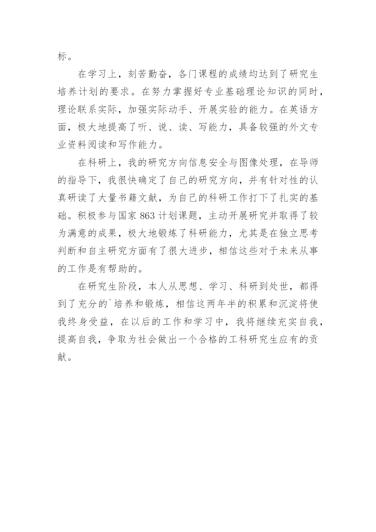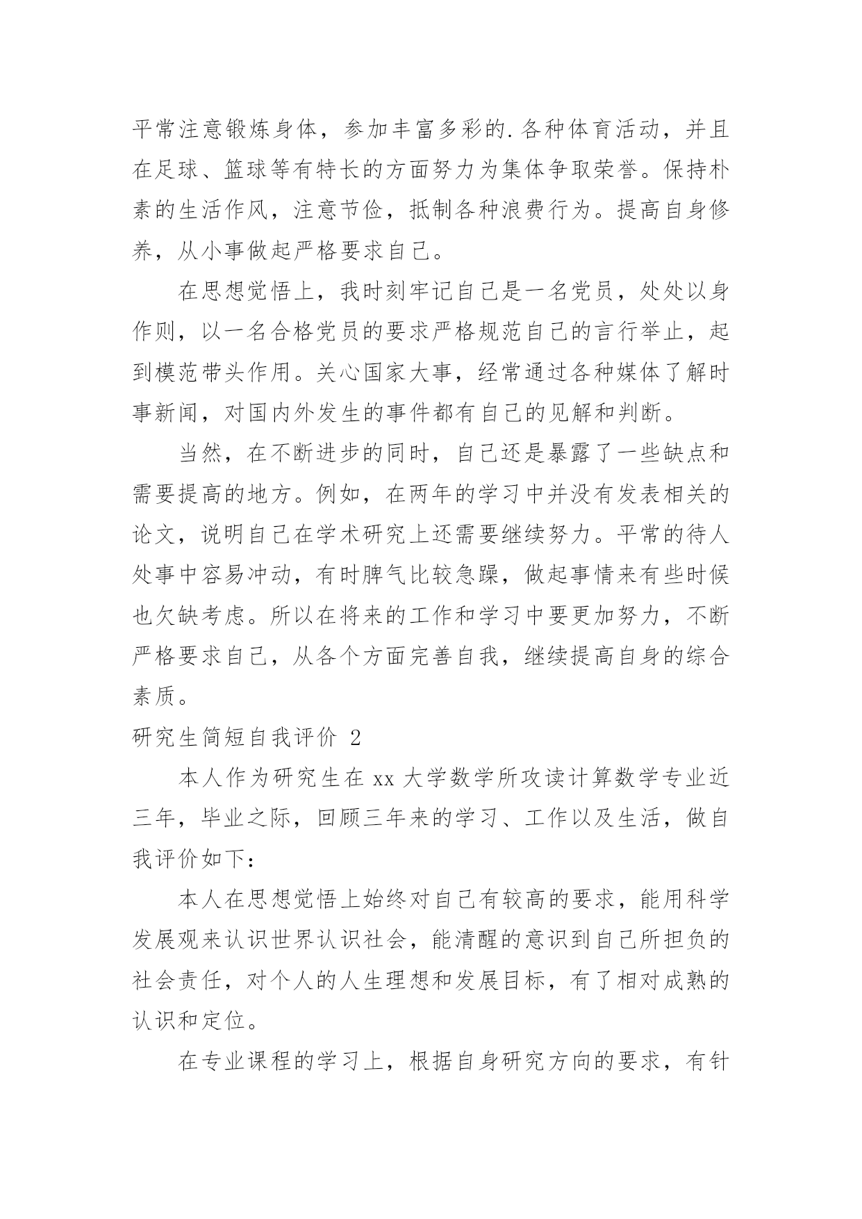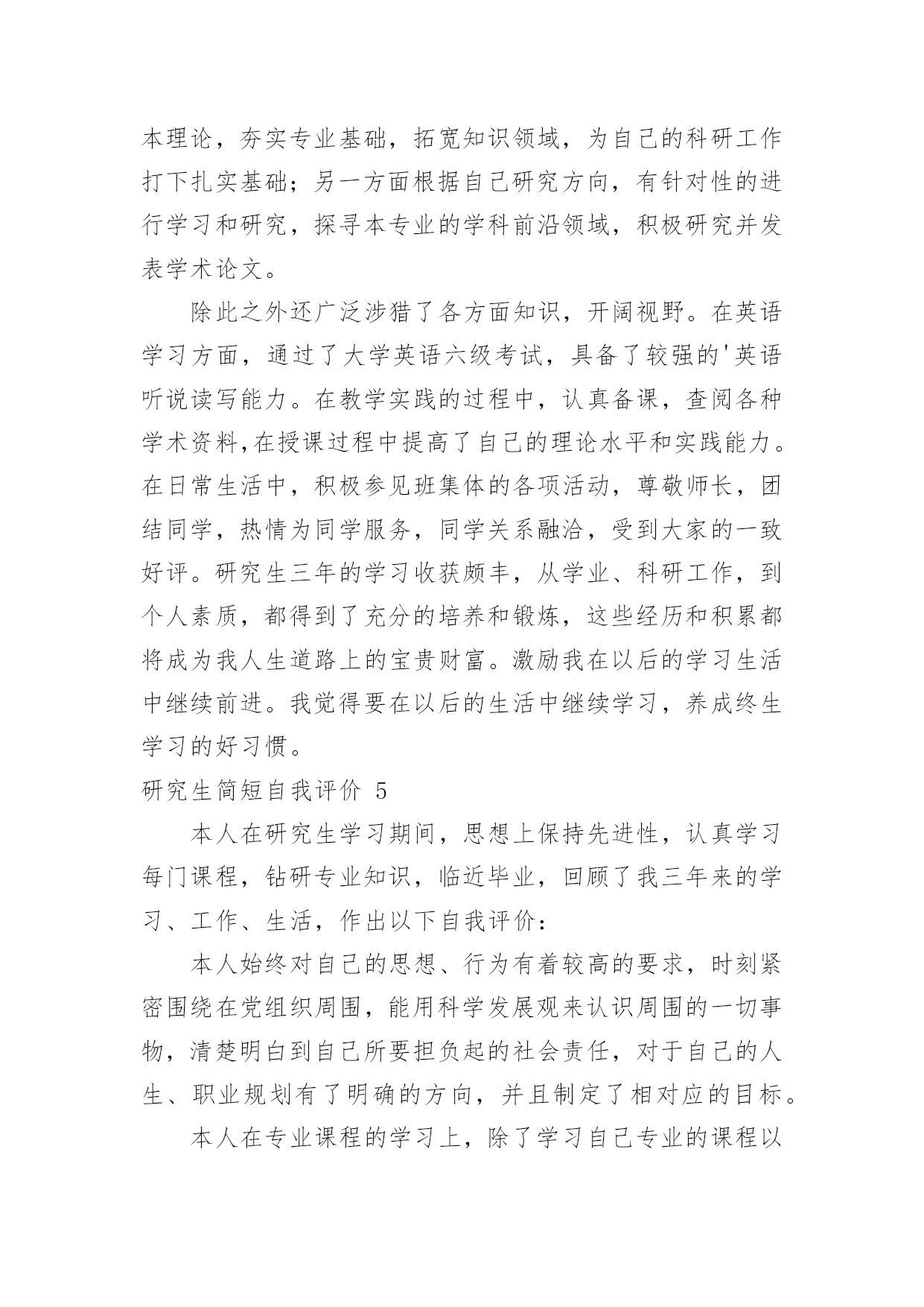 研究生简短自我评价研究生简短自我评价无论在学习、工作或是生活中,我们需要用到自我评价的情况非常的多,自我评价对个人的自我发展有着特殊的意义。那么,怎么去写自我评价呢?以下是小编为大家整理的研究生简短自我评价,欢迎阅读与收藏。研究生简短自我评价1两年的硕士研究生学习已经接近尾声,马上就要从学校走向社会了。回顾这两年来,通过自己不断的努力,在工作、学习、生活等各方面都有所提高。这两年的研究生学习,使我不但开阔了思路,增长了见识,更重要的是在学习和实践中锻炼了自己的实际操作和解决问题的能力。自身整体素质的提高使我受益匪浅。在学习上,文化课的学习使我对本专业有了更深刻、更准确的认识;查阅相关的文献和资料使我对专业的相关进展有了更加清晰的了解;实验相关的课程使我对很多仪器有了更直观的认识。在不断的学习中,积累了知识和经验;在平常的实验中,提高了动手技能;在课题的研究过程中,对相关的领域有了全面而具体的认知。在生活中,我积极参加各项集体活动,同学之间和睦相处,与同寝室、同专业、同班级的同学保持十分融洽的关系。平常注意锻炼身体,参加丰富多彩的.各种体育活动,并且在足球、篮球等有特长的方面努力为集体争取荣誉。保持朴素的生活作风,注意节俭,抵制各种浪费行为。提高自身修养,从小事做起严格要求自己。在思想觉悟上,我时刻牢记自己是一名党员,处处以身作则,以一名合格党员的要求严格规范自己的言行举止,起到模范带头作用。关心国家大事,经常通过各种媒体了解时事新闻,对国内外发生的事件都有自己的见解和判断。当然,在不断进步的同时,自己还是暴露了一些缺点和需要提高的地方。例如,在两年的学习中并没有发表相关的论文,说明自己在学术研究上还需要继续努力。平常的待人处事中容易冲动,有时脾气比较急躁,做起事情来有些时候也欠缺考虑。所以在将来的工作和学习中要更加努力,不断严格要求自己,从各个方面完善自我,继续提高自身的综合素质。研究生简短自我评价2本人作为研究生在xx大学数学所攻读计算数学专业近三年,毕业之际,回顾三年来的学习、工作以及生活,做自我评价如下:本人在思想觉悟上始终对自己有较高的要求,能用科学发展观来认识世界认识社会,能清醒的意识到自己所担负的社会责任,对个人的人生理想和发展目标,有了相对成熟的认识和定位。在专业课程的学习上,根据自身研究方向的要求,有针对性的认真研读了有关核心课程,为自己的科研工作打下扎实基础;并涉猎了一部分其他课程,开阔视野,对本研究方向的应用背景以及整个学科的`结构有了宏观的认识。学习成绩也比较理想。在外语方面,研究生阶段着重加强了书面写作的训练,并取得了一定效果。在科研工作上,根据导师的指导,研读了大量论著,逐步明确了研究方向,通过自身不断的努力,以及与师长同学间的探讨交流,取得了一些比较满意的成果。在这期间,查阅资料,综合分析等基本素质不断提高,书面表达的能力也得到了锤炼,尤其是独立思考判断和研究的能力,有了很大进步,这些对于未来的工作也都是大有裨益的。平时生活中,为人处世和善热情,和同学关系融洽。根据自身爱好和能力,业余参与了一些社会活动,为个人综合素质的全面发展打下基础。毕业在即,在工作实践中,除了提升适应工作要求的具体业务能力,还提高了和同事沟通交流的能力,团队协作的素质也得以培养,为走出校园融入社会做好了准备。本人在研究生阶段所获颇丰,从学业、科研工作,到个人素质,都得到了充分的培养和锻炼,是充实且有意义的三年。相信这些经历和积累都将成为我人生道路上的宝贵财富。研究生简短自我评价3本人在硕士研究生学习阶段,注重政治理论学习,关心国家大事,拥护党的路线方针政策,自觉时刻牢记担负的社会责任,时时以党员的先进性标准来要求自己、事事力争做到模范带头。在专业课程学习上,根据研究方向的要求,认真学习了通信领域的核心课程,所选课程全部达到国家要求。在科研实践中,广泛阅读有关博士、硕士论文和大量的外文文献,开阔视野的同时,对本人研究方向的应用背景以及整个学科的结构有了宏观的认识。勤恳踏实,注重团队合作精神和集体观念,实践动手能力比较强,参与了导师多项课题的研究,使自己的.理论知识与实践水平得到了进一步的增强和提高,同时顺利完成了硕士毕业论文。在平时生活中,为人处世和善热情,和同学关系融洽;积极参与班级各项集体活动,热情为同学们服务。在研究生阶段,从学业、科研工作,到个人素质,都得到了充分的培养和锻炼,是充实且有意义的两年。相信这些经历和积累都将成为本人人生道路上的宝贵财富。在以后的工作和学习中,本人将继续保持并发扬严谨治学的作风,兢兢业业,争取取得更大的成绩。研究生简短自我评价4光阴似箭,研究生学习生活匆匆而过,在这三年我从不曾懈怠对自己的要求。在思想上严格以党员的标准要求自己,经常学习党的经典著作,不断提高自己的理论水平。作为其他同学的入