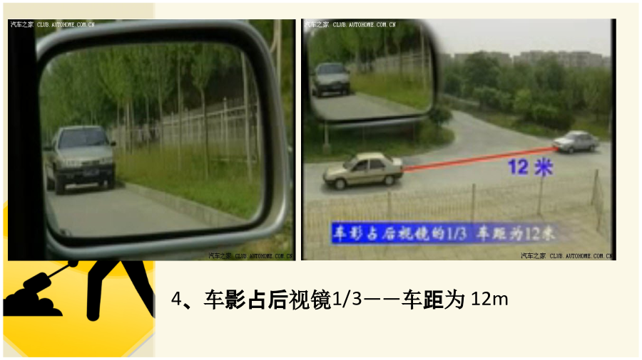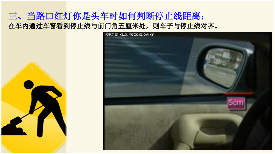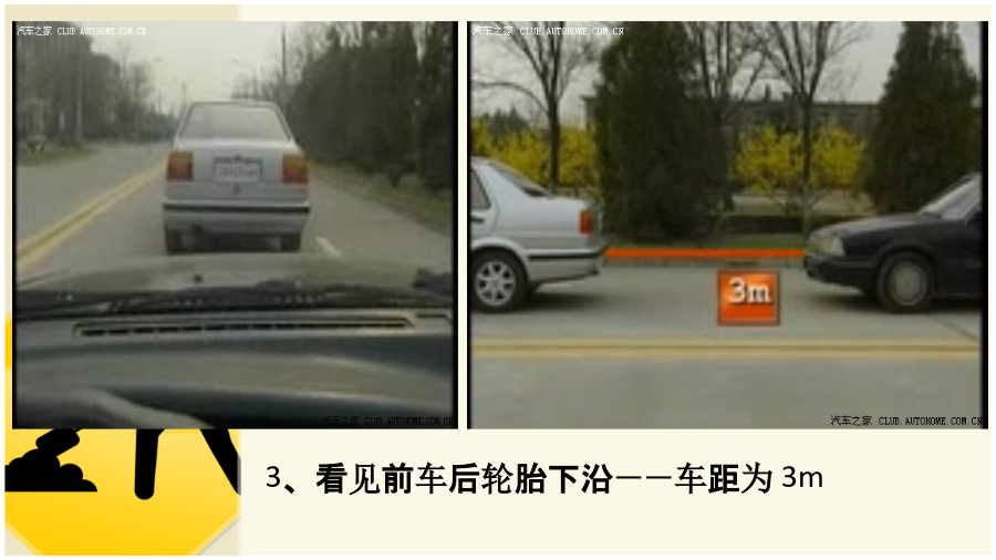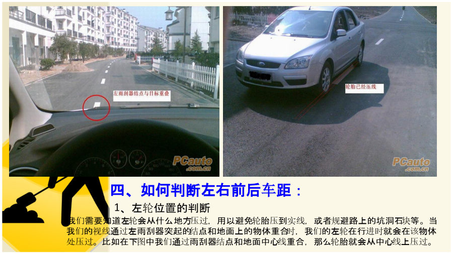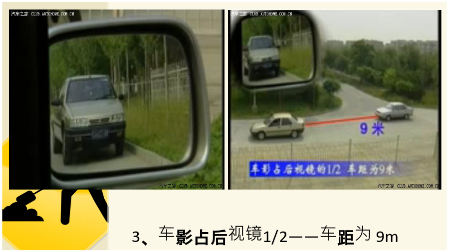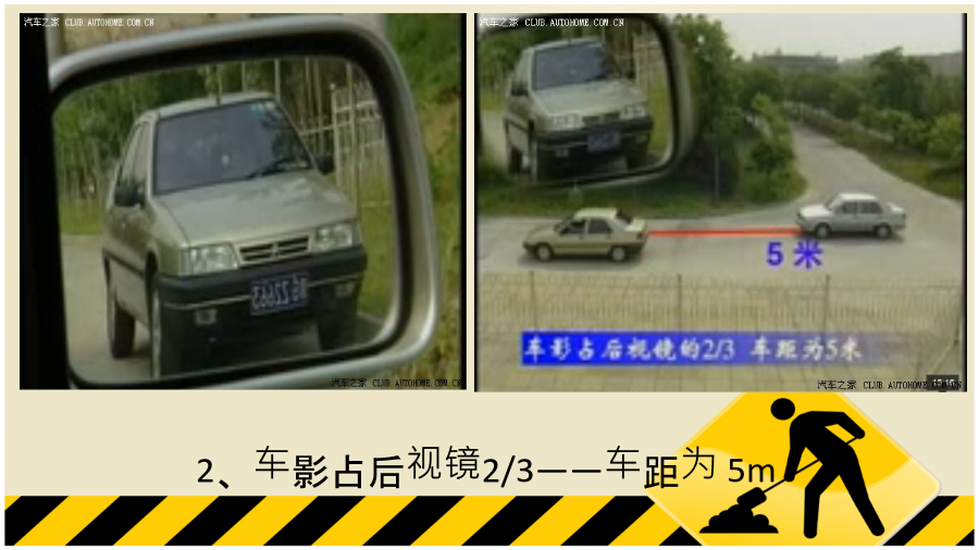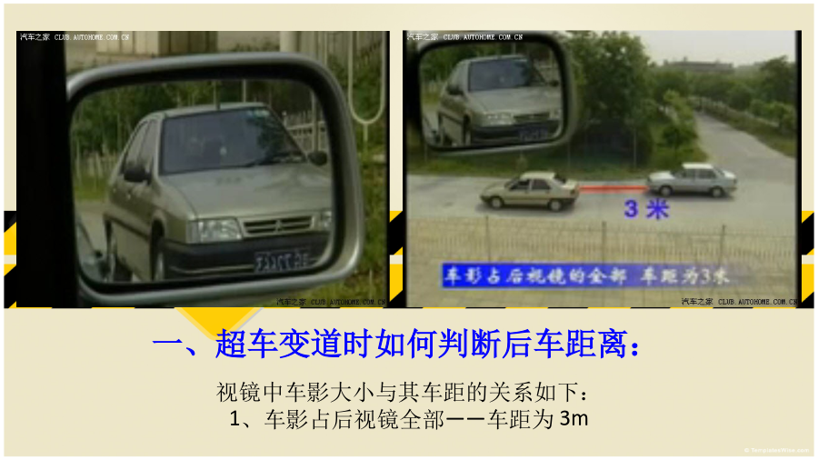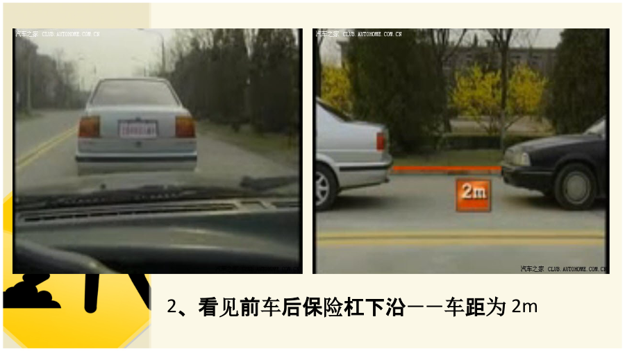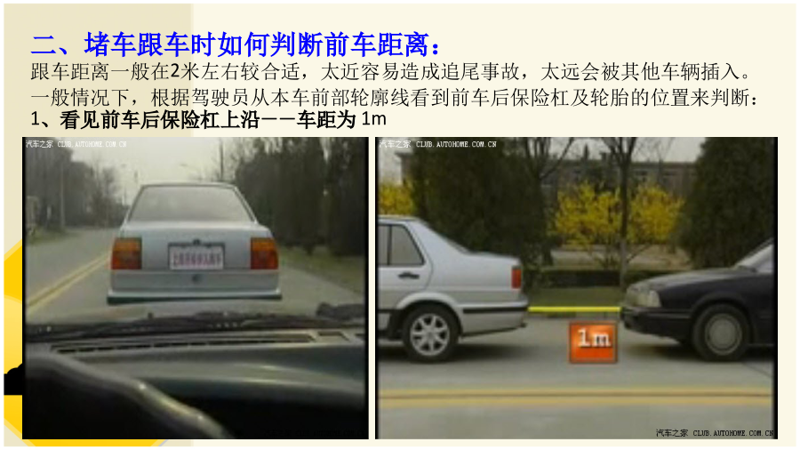 一、超车变道时如何判断后车距离:2、车影占后视镜2/3——车距为5m3、车影占后视镜1/2——车距为9mTitle二、堵车跟车时如何判断前车距离:跟车距离一般在2米左右较合适,太近容易造成追尾事故,太远会被其他车辆插入。一般情况下,根据驾驶员从本车前部轮廓线看到前车后保险杠及轮胎的位置来判断:1、看见前车后保险杠上沿——车距为1mTitleTitle三、当路口红灯你是头车时如何判断停止线距离:在车内通过车窗看到停止线与前门角五厘米处,则车子与停止线对齐。TitleTitleTitleTitleTitle说明