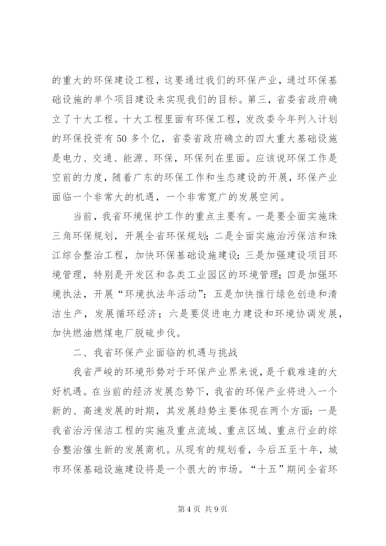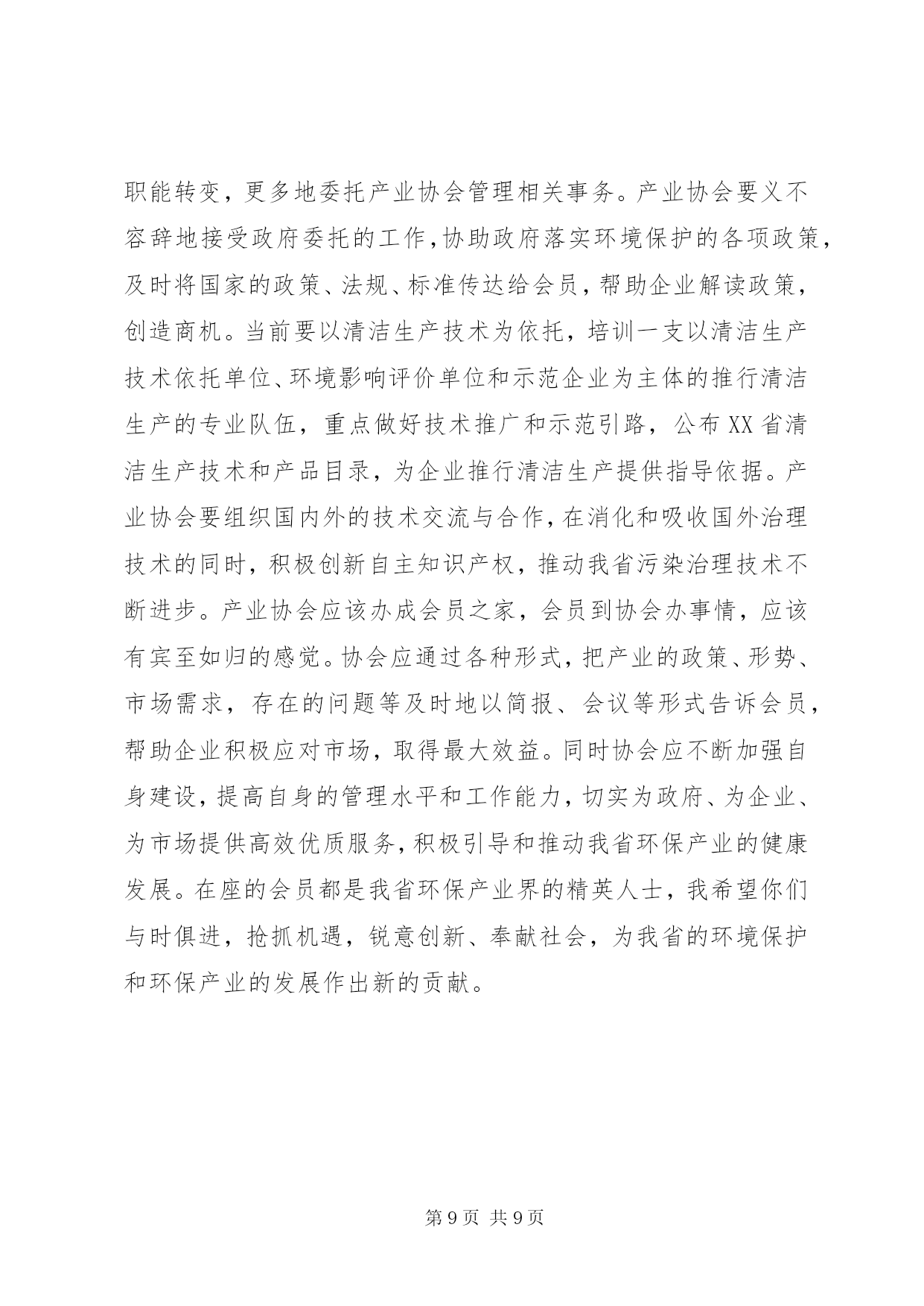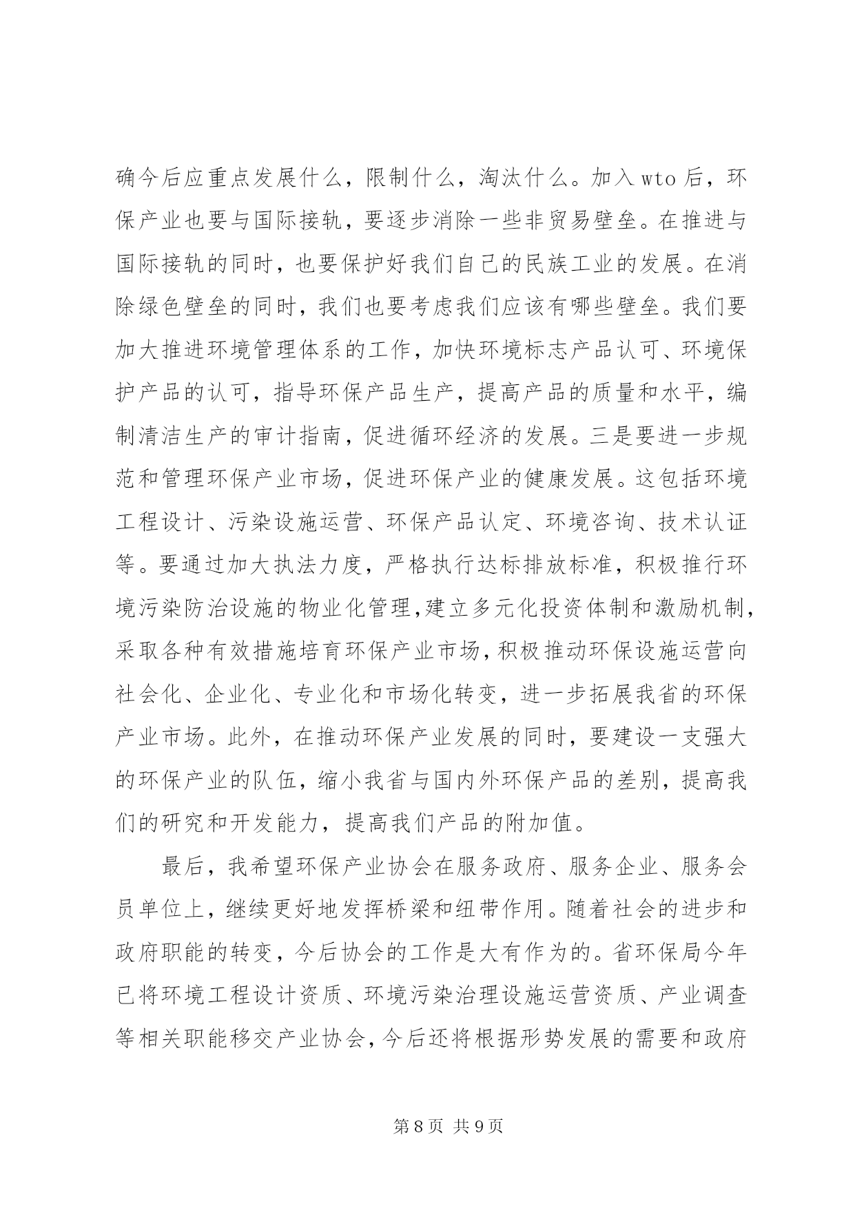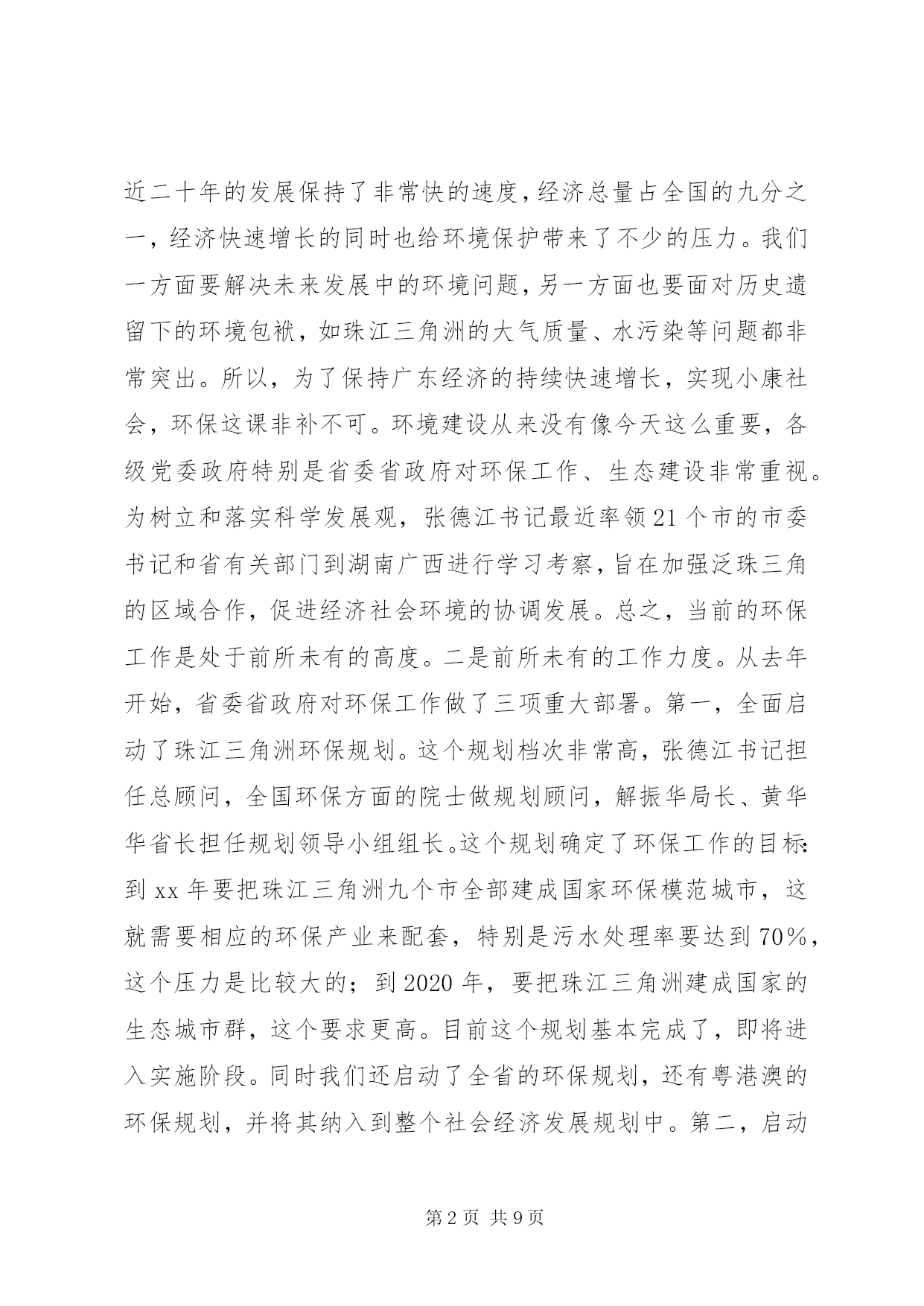 第PAGE\*Arabic\*MERGEFORMAT9页共NUMPAGES\*MERGEFORMAT9页环保协会领导讲话稿同志们:今天很高兴参加省环保产业协会的年会。刚才中国环保产业协会的韩伟秘书长做了很好的讲话,省发改委的王亚明处长专门参加了我们的会议。这个会议非常重要,内容非常丰富,特别是在广东环保产业发展的关键时刻,也是全省人民树立和落实科学发展观,加大广东环境保护和生态建设工作力度的新时期召开的,意义尤为重大。在这里我代表省环保局对省环保产业协会年会的召开,对环保优秀示范工程、优秀环保新技术新产品奖、环保产业科技创新和经营管理优秀论文奖的获奖个人和单位表示热烈的祝贺,对中国环保产业协会、省有关部门对我省环保工作的支持表示衷心的感谢。下面我讲两点意见,一是向同志们通报一下广东环保工作的情况,二是对发展环保产业和加强协会工作的一点意见。一、当前我省的环境形势和任务随着广东经济和社会的发展,特别是改革开放以来,广东环保产业有了很大发展,刚才韩会长对我省的环保产业做了肯定,这与省委省政府在加快经济发展中更加注重环境保护和生态建设的整体部署是分不开的。在当前全国全省人民树立和落实科学发展观,促进经济和社会协调发展的背景下,广东的环保工作形势可以用两个方面来表述:一是前所未有的历史高度。广东经济近二十年的发展保持了非常快的速度,经济总量占全国的九分之一,经济快速增长的同时也给环境保护带来了不少的压力。我们一方面要解决未来发展中的环境问题,另一方面也要面对历史遗留下的环境包袱,如珠江三角洲的大气质量、水污染等问题都非常突出。所以,为了保持广东经济的持续快速增长,实现小康社会,环保这课非补不可。环境建设从来没有像今天这么重要,各级党委政府特别是省委省政府对环保工作、生态建设非常重视。为树立和落实科学发展观,张德江书记最近率领21个市的市委书记和省有关部门到湖南广西进行学习考察,旨在加强泛珠三角的区域合作,促进经济社会环境的协调发展。总之,当前的环保工作是处于前所未有的高度。二是前所未有的工作力度。从去年开始,省委省政府对环保工作做了三项重大部署。第一,全面启动了珠江三角洲环保规划。这个规划档次非常高,张德江书记担任总顾问,全国环保方面的院士做规划顾问,解振华局长、黄华华省长担任规划领导小组组长。这个规划确定了环保工作的目标:到xx年要把珠江三角洲九个市全部建成国家环保模范城市,这就需要相应的环保产业来配套,特别是污水处理率要达到70%,这个压力是比较大的;到2020年,要把珠江三角洲建成国家的生态城市群,这个要求更高。目前这个规划基本完成了,即将进入实施阶段。同时我们还启动了全省的环保规划,还有粤港澳的环保规划,并将其纳入到整个社会经济发展规划中。第二,启动了治污保洁工程和珠江综合整治。广东的环境问题中比较突出的是水环境问题,大江、大河的水基本达到国家的二类标准,但是流经城市河段,特别是内河涌,污染相当严重,其中很重要的因素是,我们城市生活污水的处理率低,xx年的处理率仅为21%,每年大概有37亿吨的污水未经处理直接排到环境中去。所以,珠江综合整治以水环境整治为重点,其中很重要的一个配套措施就是加强污水处理建设,可能同志们都注意到了这段时间我们的空前力度,包括东莞、广州、佛山,污水处理设施近期上得非常快,XX县区一下子拿出16个污水处理厂来进行招标,这些都是我们珠江综合整治、治污保洁工程限定完成的任务。省委省政府与各市政府签定了协议,xx年我们的生活污水处理率要达到45%以上,即500万吨/日,xx年我们的污水处理量是280多万吨/日,去年一年增加了101万吨/日,达到了390多万吨/日,这个速度是空前的。珠江综合整治除了污水处理以外,还包括垃圾处理、电厂的脱硫。电厂脱硫的市场很大,这方面我们也比较薄弱,XX省现有火电厂的装机总容量是3600多万千瓦,按照规划,必须实现全部脱硫。我省是酸雨的重灾区,主要原因是电厂的脱硫比较滞后,3600多万千瓦的总容量里,有脱硫设施的大概只占5%。到xx年、xx年,我们都要逐步地根据规划来完成脱硫任务,脱硫的市场很大。还有垃圾处理厂,我们都有十分明确的目标。也就是说,珠江综合整治、治污保洁工程是省委省政府确定的重大的环保建设工程,这要通过我们的环保产业,通过环保基础设施的单个项目建设来实现我们的目标。第三,省委省政府确立了十大工程。十大工程里面有环保工程,发改委今年列入计划的环保投资有50多个亿,省委省政府确立的四大重大基础设施是电力、交通、能源、环保,环保列在里面。应该说环保工作是空前的力度,随着广东的环保工作和生态建设的开展,环保产业面临一个非常大的机遇,一个非常宽广的发展空间。当前,我省环境保护工作的重点主要有。一是要全面实施珠三角环保规划,开展全省环保规划;二是全面实