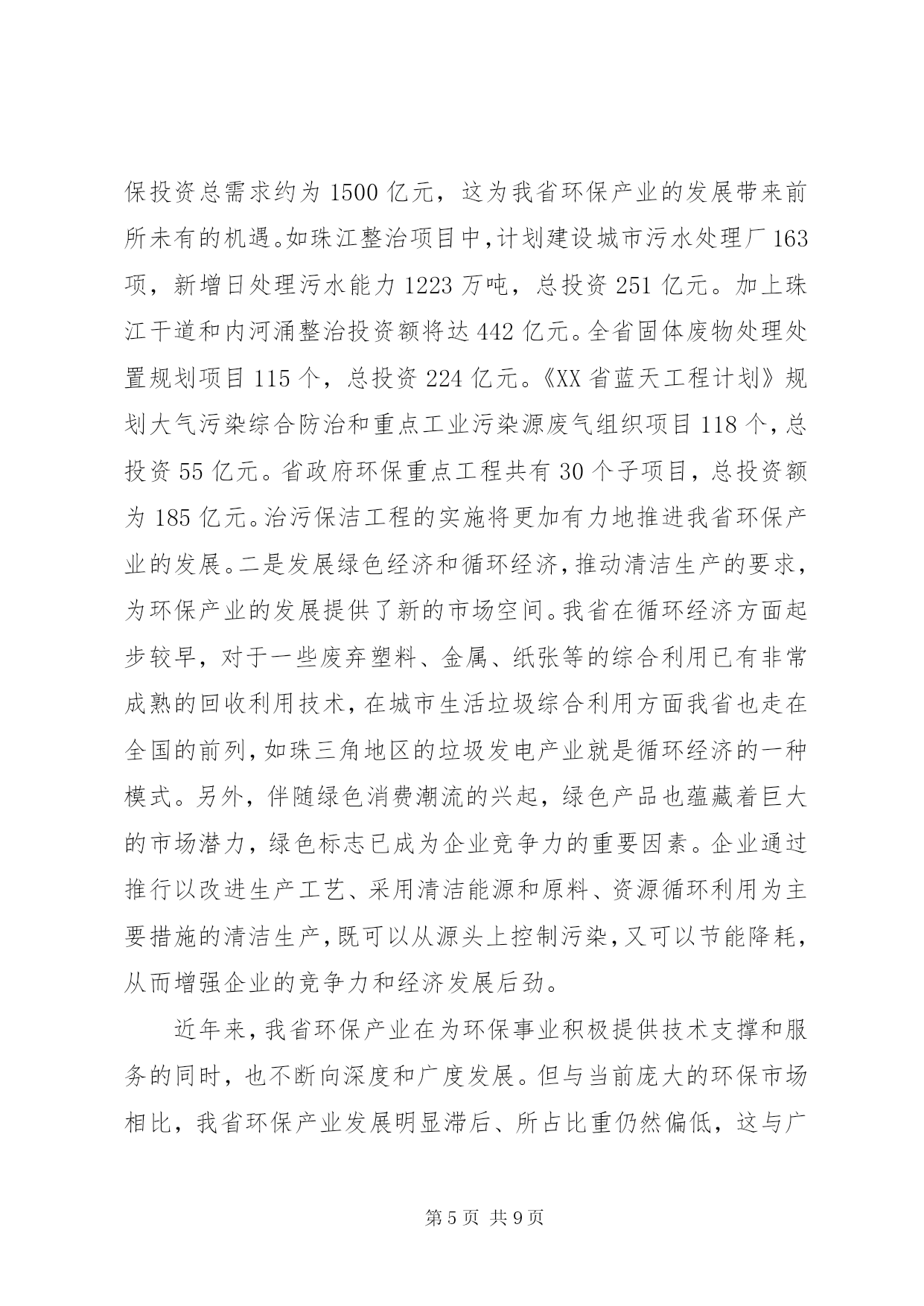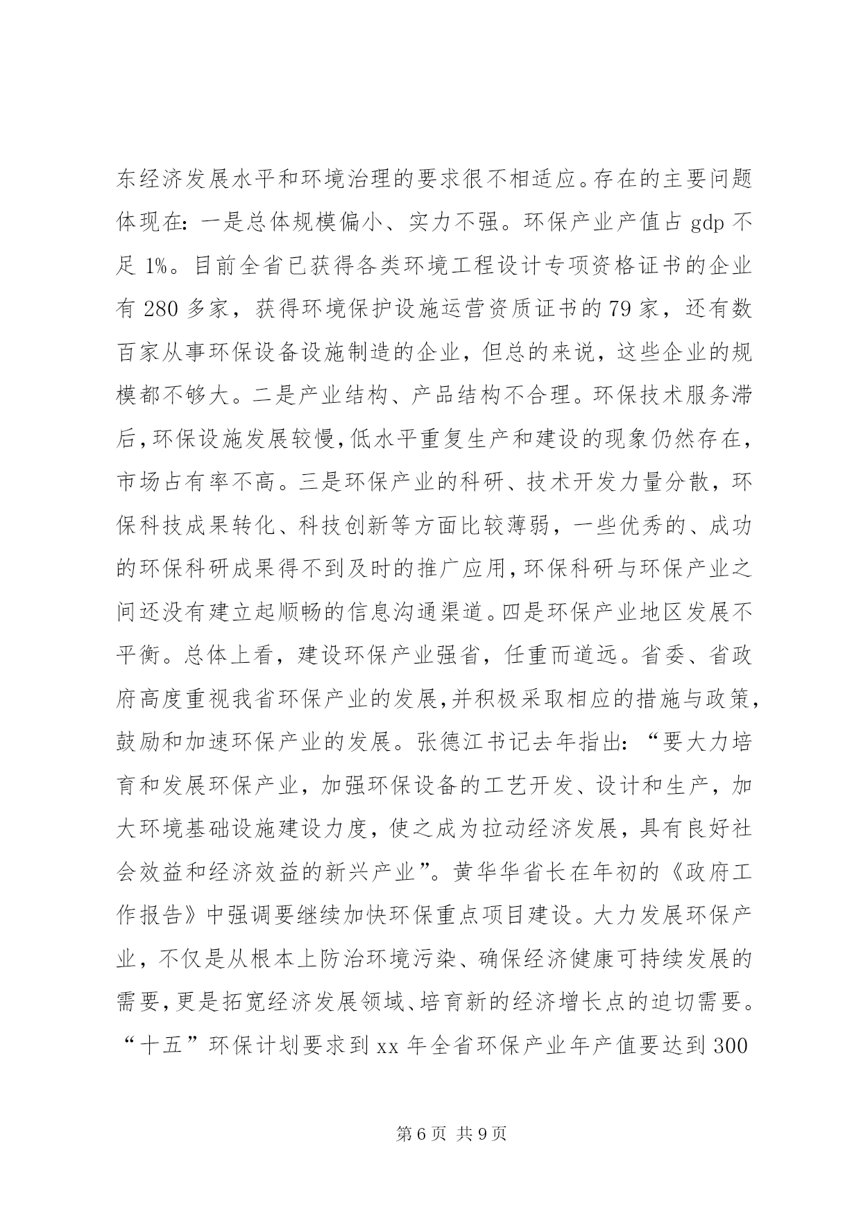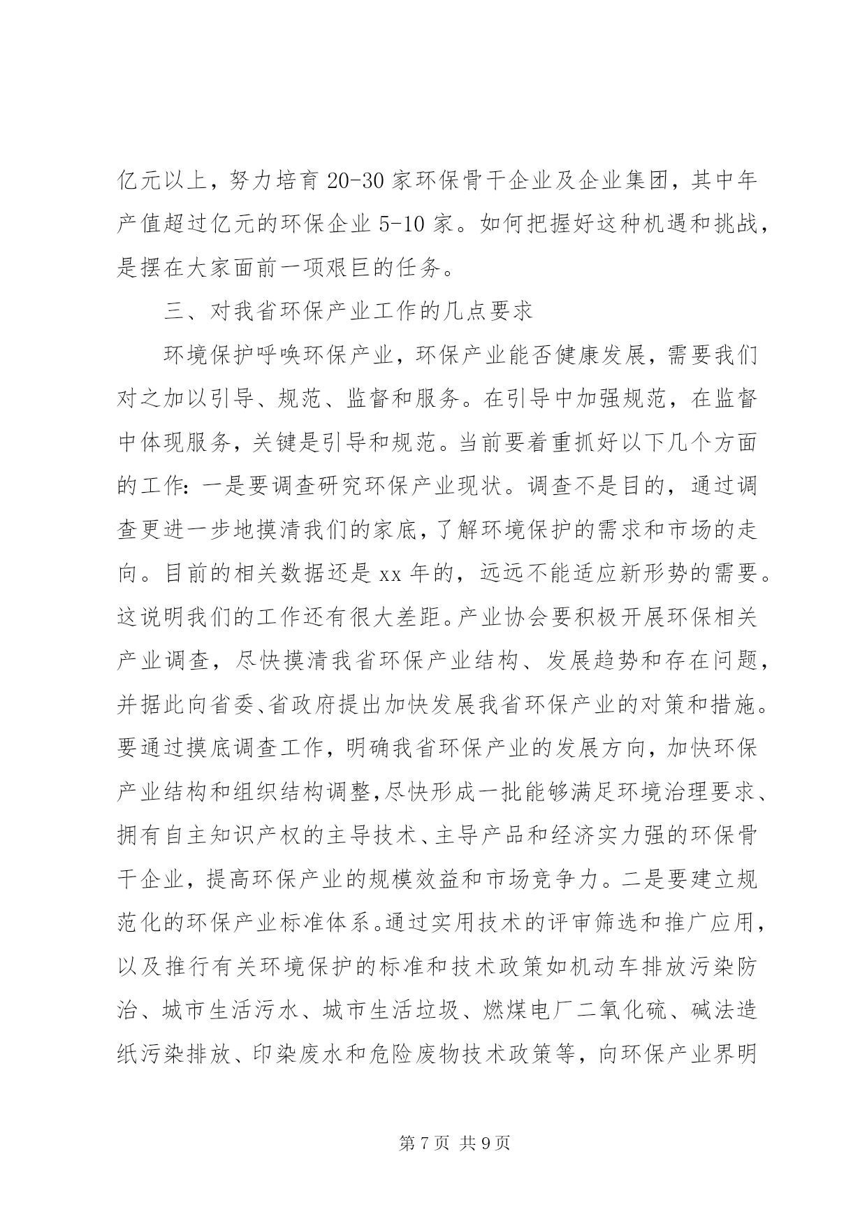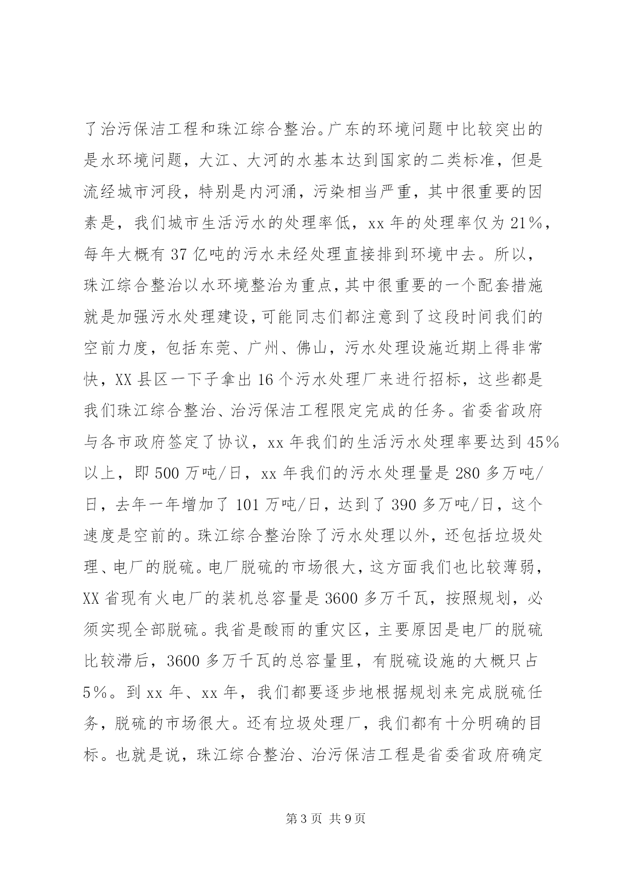 第PAGE\*Arabic\*MERGEFORMAT9页共NUMPAGES\*MERGEFORMAT9页环保协会领导讲话稿同志们:今天很高兴参加省环保产业协会的年会。刚才中国环保产业协会的韩伟秘书长做了很好的讲话,省发改委的王亚明处长专门参加了我们的会议。这个会议非常重要,内容非常丰富,特别是在广东环保产业发展的关键时刻,也是全省人民树立和落实科学发展观,加大广东环境保护和生态建设工作力度的新时期召开的,意义尤为重大。在这里我代表省环保局对省环保产业协会年会的召开,对环保优秀示范工程、优秀环保新技术新产品奖、环保产业科技创新和经营管理优秀论文奖的获奖个人和单位表示热烈的祝贺,对中国环保产业协会、省有关部门对我省环保工作的支持表示衷心的感谢。下面我讲两点意见,一是向同志们通报一下广东环保工作的情况,二是对发展环保产业和加强协会工作的一点意见。一、当前我省的环境形势和任务随着广东经济和社会的发展,特别是改革开放以来,广东环保产业有了很大发展,刚才韩会长对我省的环保产业做了肯定,这与省委省政府在加快经济发展中更加注重环境保护和生态建设的整体部署是分不开的。在当前全国全省人民树立和落实科学发展观,促进经济和社会协调发展的背景下,广东的环保工作形势可以用两个方面来表述:一是前所未有的历史高度。广东经济近二十年的发展保持了非常快的速度,经济总量占全国的九分之一,经济快速增长的同时也给环境保护带来了不少的压力。我们一方面要解决未来发展中的环境问题,另一方面也要面对历史遗留下的环境包袱,如珠江三角洲的大气质量、水污染等问题都非常突出。所以,为了保持广东经济的持续快速增长,实现小康社会,环保这课非补不可。环境建设从来没有像今天这么重要,各级党委政府特别是省委省政府对环保工作、生态建设非常重视。为树立和落实科学发展观,张德江书记最近率领21个市的市委书记和省有关部门到湖南广西进行学习考察,旨在加强泛珠三角的区域合作,促进经济社会环境的协调发展。总之,当前的环保工作是处于前所未有的高度。二是前所未有的工作力度。从去年开始,省委省政府对环保工作做了三项重大部署。第一,全面启动了珠江三角洲环保规划。这个规划档次非常高,张德江书记担任总顾问,全国环保方面的院士做规划顾问,解振华局长、黄华华省长担任规划领导小组组长。这个规划确定了环保工作的目标:到xx年要把珠江三角洲九个市全部建成国家环保模范城市,这就需要相应的环保产业来配套,特别是污水处理率要达到70%,这个压力是比较大的;到2020年,要把珠江三角洲建成国家的生态城市群,这个要求更高。目前这个规划基本完成了,即将进入实施阶段。同时我们还启动了全省的环保规划,还有粤港澳的环保规划,并将其纳入到整个社会经济发展规划中。第二,启动了治污保洁工程和珠江综合整治。广东的环境问题中比较突出的是水环境问题,大江、大河的水基本达到国家的二类标准,但是流经城市河段,特别是内河涌,污染相当严重,其中很重要的因素是,我们城市生活污水的处理率低,xx年的处理率仅为21%,每年大概有37亿吨的污水未经处理直接排到环境中去。所以,珠江综合整治以水环境整治为重点,其中很重要的一个配套措施就是加强污水处理建设,可能同志们都注意到了这段时间我们的空前力度,包括东莞、广州、佛山,污水处理设施近期上得非常快,XX县区一下子拿出16个污水处理厂来进行招标,这些都是我们珠江综合整治、治污保洁工程限定完成的任务。省委省政府与各市政府签定了协议,xx年我们的生活污水处理率要达到45%以上,即500万吨/日,xx年我们的污水处理量是280多万吨/日,去年一年增加了101万吨/日,达到了390多万吨/日,这个速度是空前的。珠江综合整治除了污水处理以外,还包括垃圾处理、电厂的脱硫。电厂脱硫的市场很大,这方面我们也比较薄弱,XX省现有火电厂的装机总容量是3600多万千瓦,按照规划,必须实现全部脱硫。我省是酸雨的重灾区,主要原因是电厂的脱硫比较滞后,3600多万千瓦的总容量里,有脱硫设施的大概只占5%。到xx年、xx年,我们都要逐步地根据规划来完成脱硫任务,脱硫的市场很大。还有垃圾处理厂,我们都有十分明确的目标。也就是说,珠江综合整治、治污保洁工程是省委省政府确定的重大的环保建设工程,这要通过我们的环保产业,通过环保基础设施的单个项目建设来实现我们的目标。第三,省委省政府确立了十大工程。十大工程里面有环保工程,发改委今年列入计划的环保投资有50多个亿,省委省政府确立的四大重大基础设施是电力、交通、能源、环保,环保列在里面。应该说环保工作是空前的力度,随着广东的环保工作和生态建设的开展,环保产业面临一个非常大的机遇,一个非常宽广的发展空间。当前,我省环境保护工作的重点主要有。一是要全面实施珠三角环保规划,开展全省环保规划;二是全面实