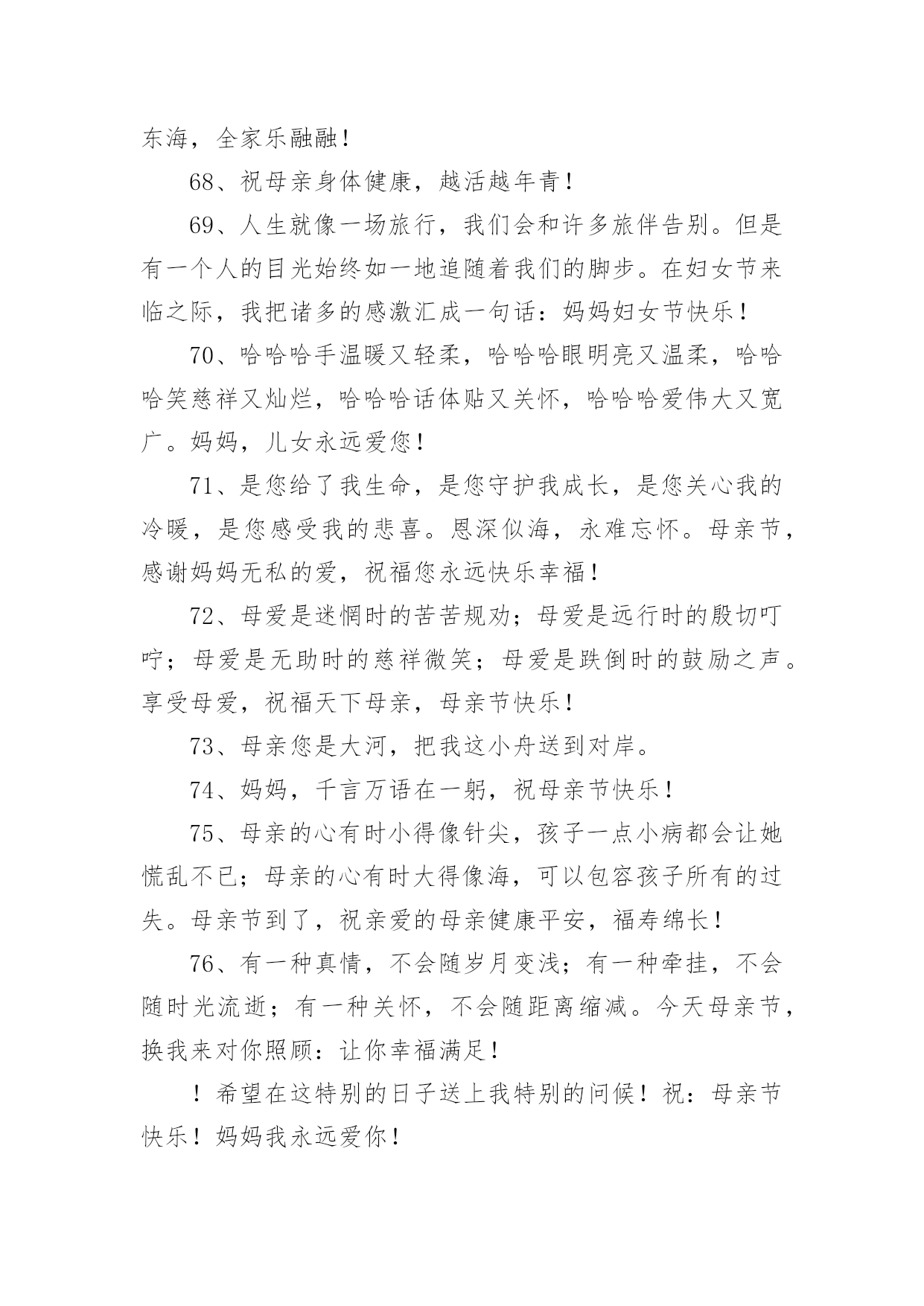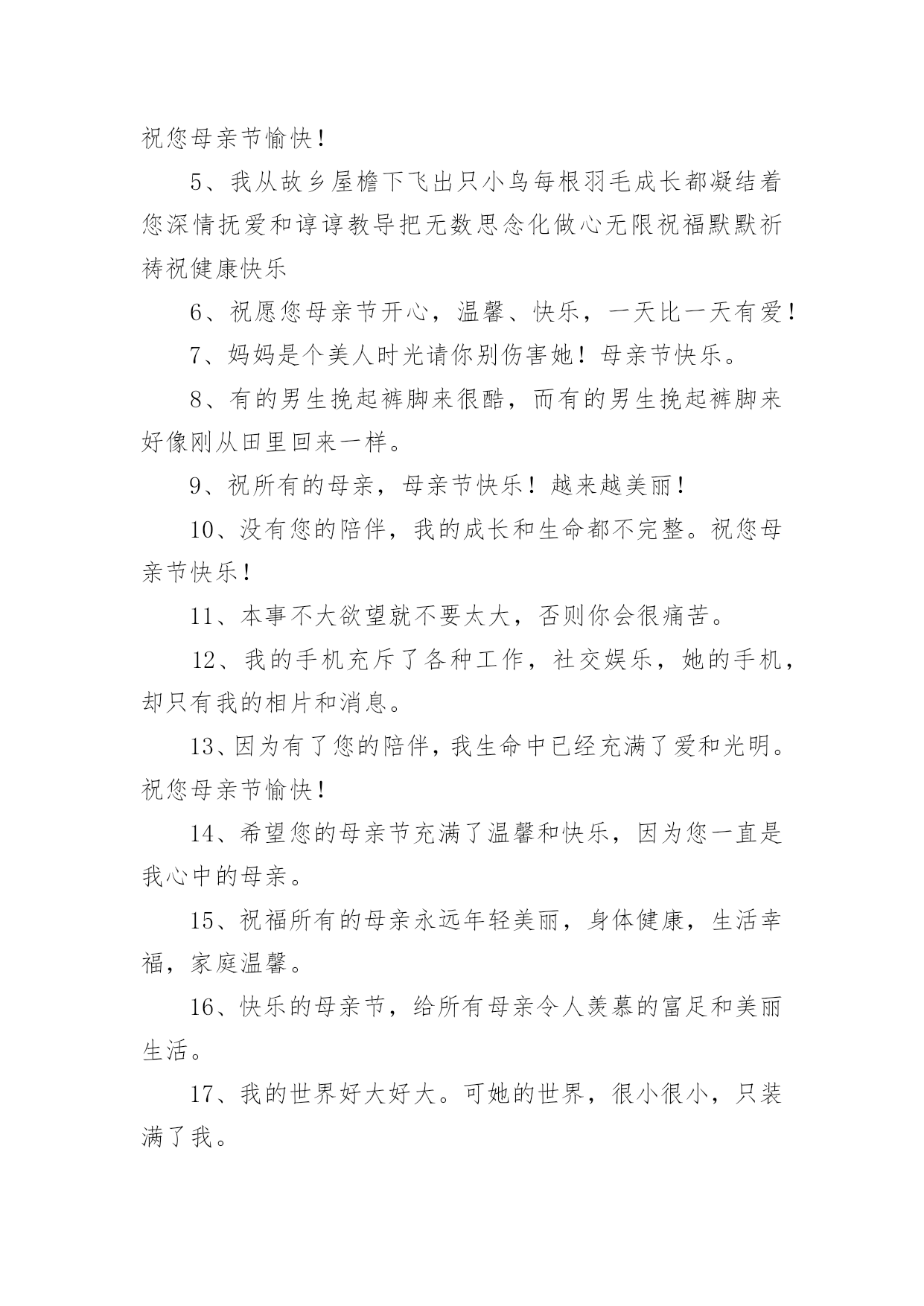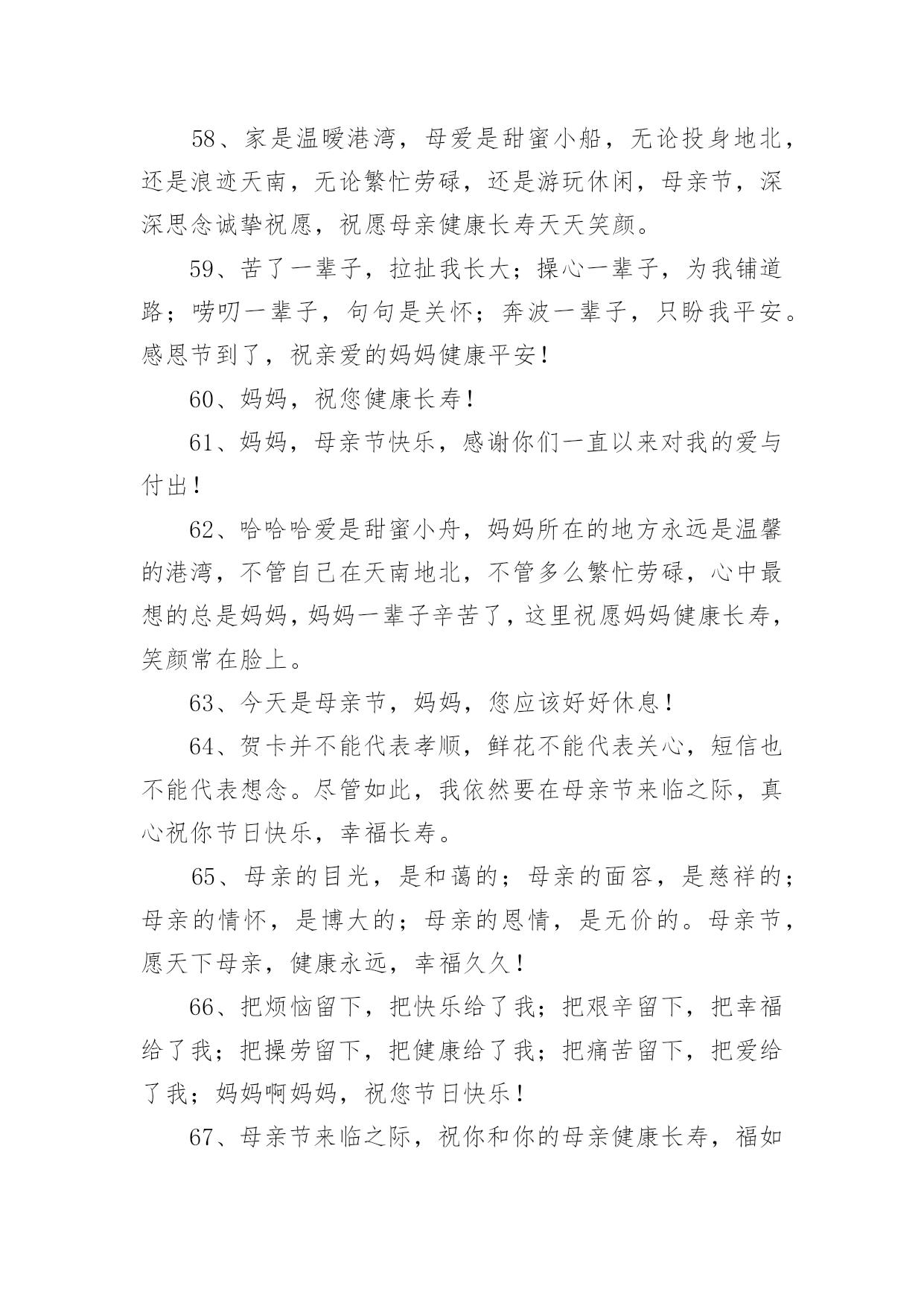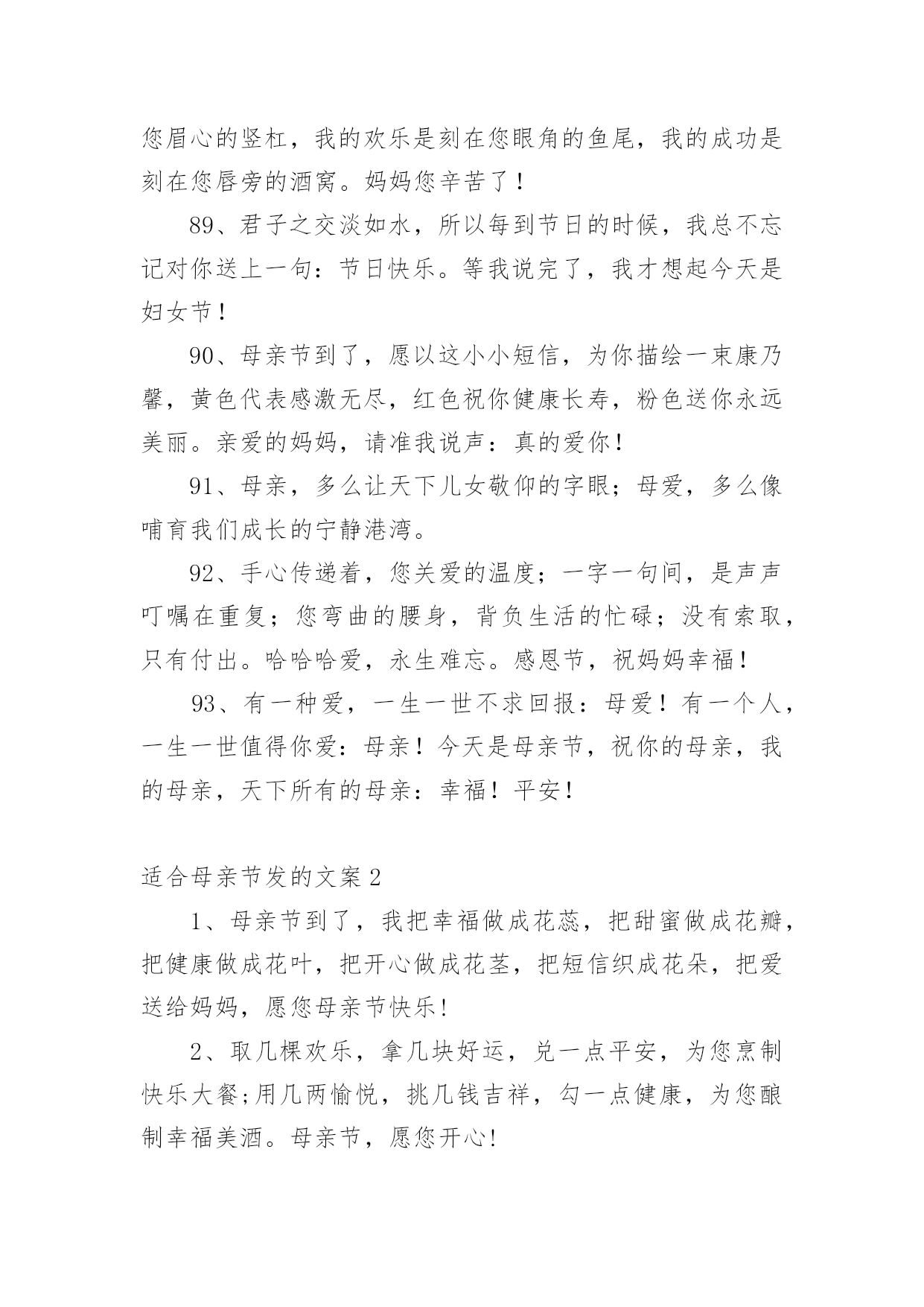 适合母亲节发的文案1适合母亲节发的文案随着网络社交的悄悄演进,大家都有令自己印象深刻的文案吧,文案用以记录和分享生活日常。你知道什么样的文案才能称之为经典吗?下面是小编为大家收集的适合母亲节发的文案,希望对大家有所帮助。适合母亲节发的文案11、祝天下母亲节日快乐!身体健康,笑口常开!妈妈您辛苦啦!2、离不开您的怀抱,尝不够的是柔情;躲不开您的视线,品不尽的是关爱;走不开您的关怀,叙不完的是亲情;儿行千里母担忧,最不愿放开的是母亲的手;母亲节里,妈妈请接受我深深的爱!妈妈,我无法用言语表达我对你的爱,因为我知道这世界上最无私最伟大的就是母爱,从小到大,您一直我的骄傲,就像是我的导师一样,什么事情都是您帮我处理好,您为我操劳了太多太多了,妈妈,我爱你,母亲节快乐!3、今天是母亲节,给妈妈买个苹果,保佑她生活平安,给妈妈买个香蕉,保佑她心甜,给妈妈买个蛋糕,保佑她胃口好,笑口常开,永不老去,节日快乐!4、亲爱的妈妈,您的母爱是我生命中最重要的事情,祝您母亲节愉快!5、我从故乡屋檐下飞出只小鸟每根羽毛成长都凝结着您深情抚爱和谆谆教导把无数思念化做心无限祝福默默祈祷祝健康快乐6、祝愿您母亲节开心,温馨、快乐,一天比一天有爱!7、妈妈是个美人时光请你别伤害她!母亲节快乐。8、有的男生挽起裤脚来很酷,而有的男生挽起裤脚来好像刚从田里回来一样。9、祝所有的母亲,母亲节快乐!越来越美丽!10、没有您的陪伴,我的成长和生命都不完整。祝您母亲节快乐!11、本事不大欲望就不要太大,否则你会很痛苦。12、我的手机充斥了各种工作,社交娱乐,她的手机,却只有我的相片和消息。13、因为有了您的陪伴,我生命中已经充满了爱和光明。祝您母亲节愉快!14、希望您的母亲节充满了温馨和快乐,因为您一直是我心中的母亲。15、祝福所有的母亲永远年轻美丽,身体健康,生活幸福,家庭温馨。16、快乐的母亲节,给所有母亲令人羡慕的富足和美丽生活。17、我的世界好大好大。可她的世界,很小很小,只装满了我。18、母亲是我们生命中最有用的人,绝无仅有的精神寄托和肉体支柱。愿母亲永远年轻美丽,幸福美满!19、祝全天下的母亲母亲节快乐,身体健康,永远年轻。妈我爱你!20、母亲节,是我们表达崇高敬意和亲情的时刻,愿母亲节日快乐,无忧无虑,万事如意。21、祝愿母亲从不会因为疲劳采摘下自家的“果实”,始终坚持为家庭奋斗,永远年轻美丽。22、家人关心你、财神关照你、我会永远宠爱你、幸运星永远照着你!祝妈妈母亲节快乐身体健康23、老妈,母亲节快乐。记得别老是唠叨我了。24、母亲您给了我生命,而我则成了您永远的牵挂。在我无法陪伴左右的日子里,愿妈妈您每一天都平安快乐,母亲节快乐!25、如果世界上有永恒无私的爱,那就是母爱和父爱。我委托明天父亲节和平安宁的曙光,送上我真挚的祝福:祝你父亲永远幸福。26、您常说,子女的幸福快乐就是最好的礼物,今天我把所有的幸福和快乐用短信包裹送给您,祝身体健康,笑口常开!27、有一个最美丽的名字:妈妈。有一种真实的感觉:感觉。有最高的品质:孝顺。现在有一句祝福的话:母亲节快乐!把它送给你妈妈,祝她一切顺利!28、有这样一个人:忍着痛把你带到这个世界上,无怨无悔地默默为你付出,直接为你解决问题,不求回报,只愿你健康平安。今天,母亲节,记得感谢她好!29、爱您的这一天,我感到很幸运,生命中最重要的人就是您,我非常感激您。30、父亲节快到了,亲爱的父亲,愿你永远健康快乐!31、母亲节我认为行动比语言更真实。32、妈妈您在学习和生活方面都对我很关心,鼓励我让我对自己有信心。我要祝福你,节日快乐、身体健康、笑口常开、工作顺利,天天都有好心情。33、慈母倚门情,游子行路苦。寒衣针线密,家书抵万金。见面怜清瘦,嘘寒问苦辛。母亲节来临之际,献出寸草之心,报母亲三春晖。祝愿天下所有母亲快乐!34、有哈哈哈味道,哪里都是家。妈妈我爱你,节日快乐。35、什么是幸福?小羊羔有妈妈喂它奶喝,小鸟儿有妈妈喂它虫吃,这就是幸福!母亲节就到了,想想我们儿时的幸福,记得给辛劳的母亲送去祝福!36、不论岁月多么匆匆,您依旧在我的心里,不论光阴如此无情,您依旧给我最温暖的爱,不论我遇见多少天使,您依旧是世界上最美丽最伟大的!祝母亲节快乐!37、母亲呵!你是荷叶,我是红莲,心中的雨点来了,除了你,谁是我天空下的荫蔽?祝您母亲节快乐!38、太阳最红,母爱最纯,母亲最亲,母亲恩情比天高比海深,咫尺天涯齐祝福,母亲儿女心连心。母亲节,祝我们的母亲寿比南山松福如东海水。39、送一束鲜花,道一句祝愿,母亲就会笑容满面。40、母爱何深,牵肠挂肚系一生,岂只怀胎十月;亲恩难忘,霖雨春晖荣寸草,允当反哺千回。41、母爱是伟大的,母爱是崇高的,母爱是无私的。多少年来,母亲养育着我,呵护着我,使我在母亲的呵护下成长,在母爱的关怀