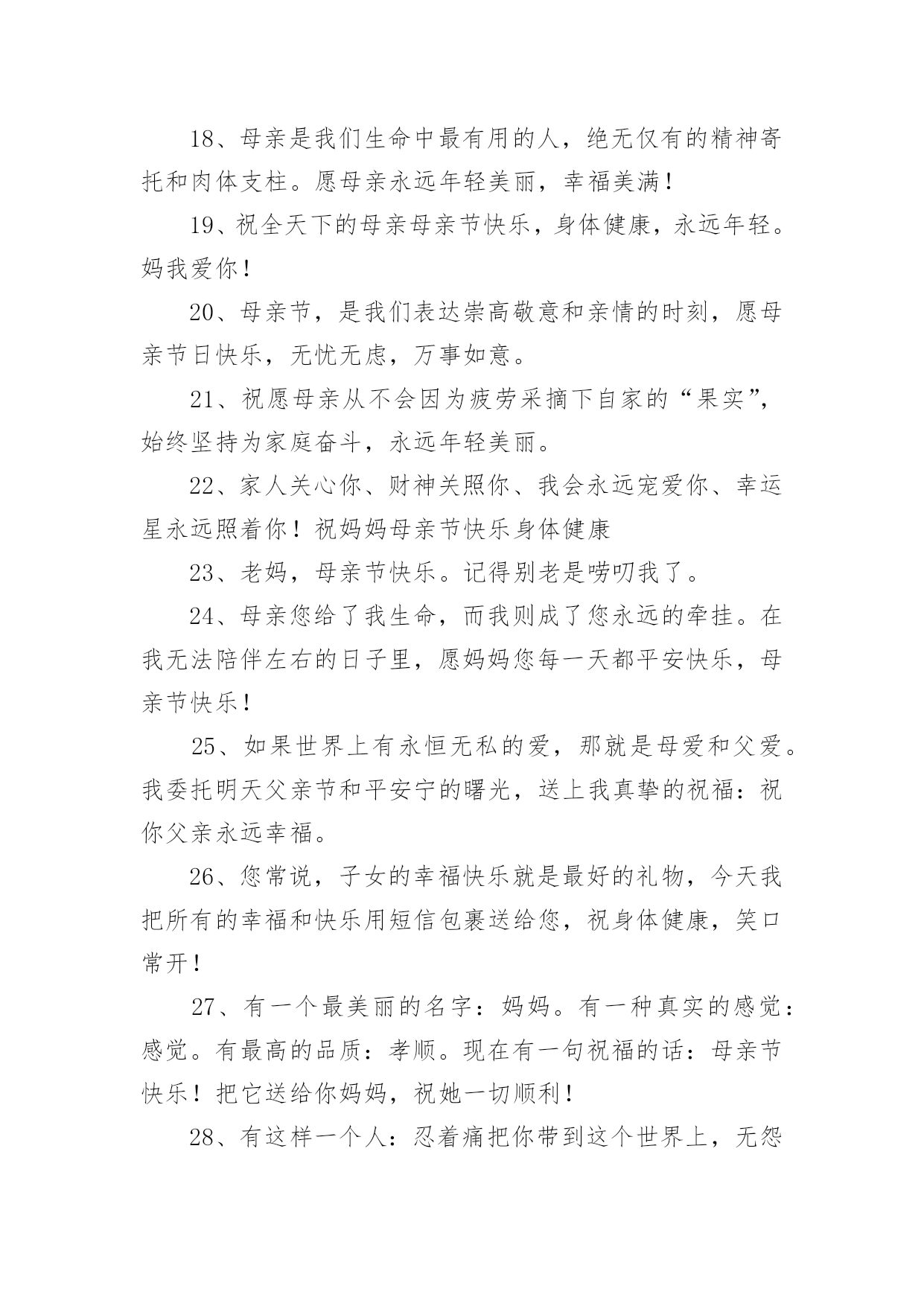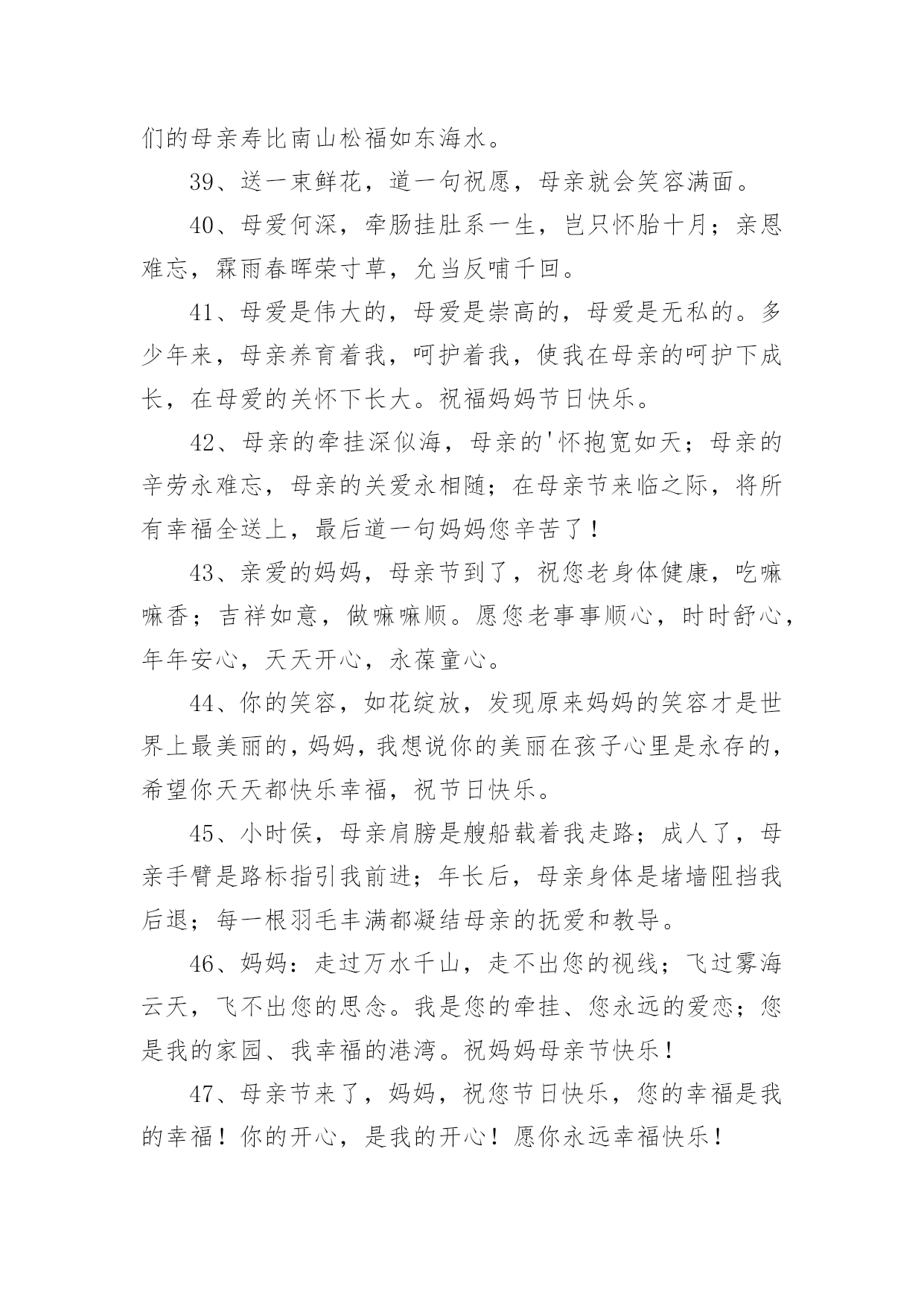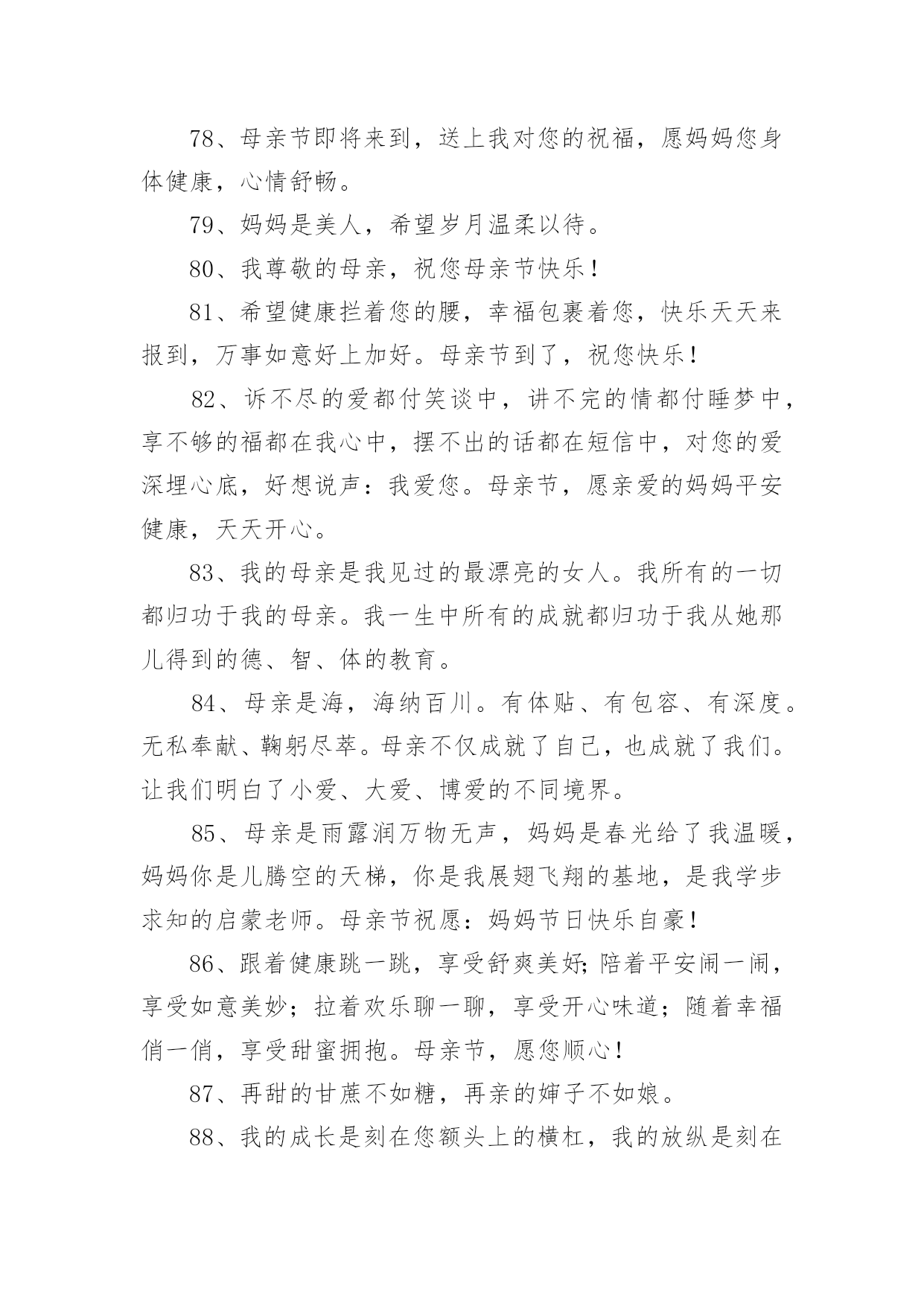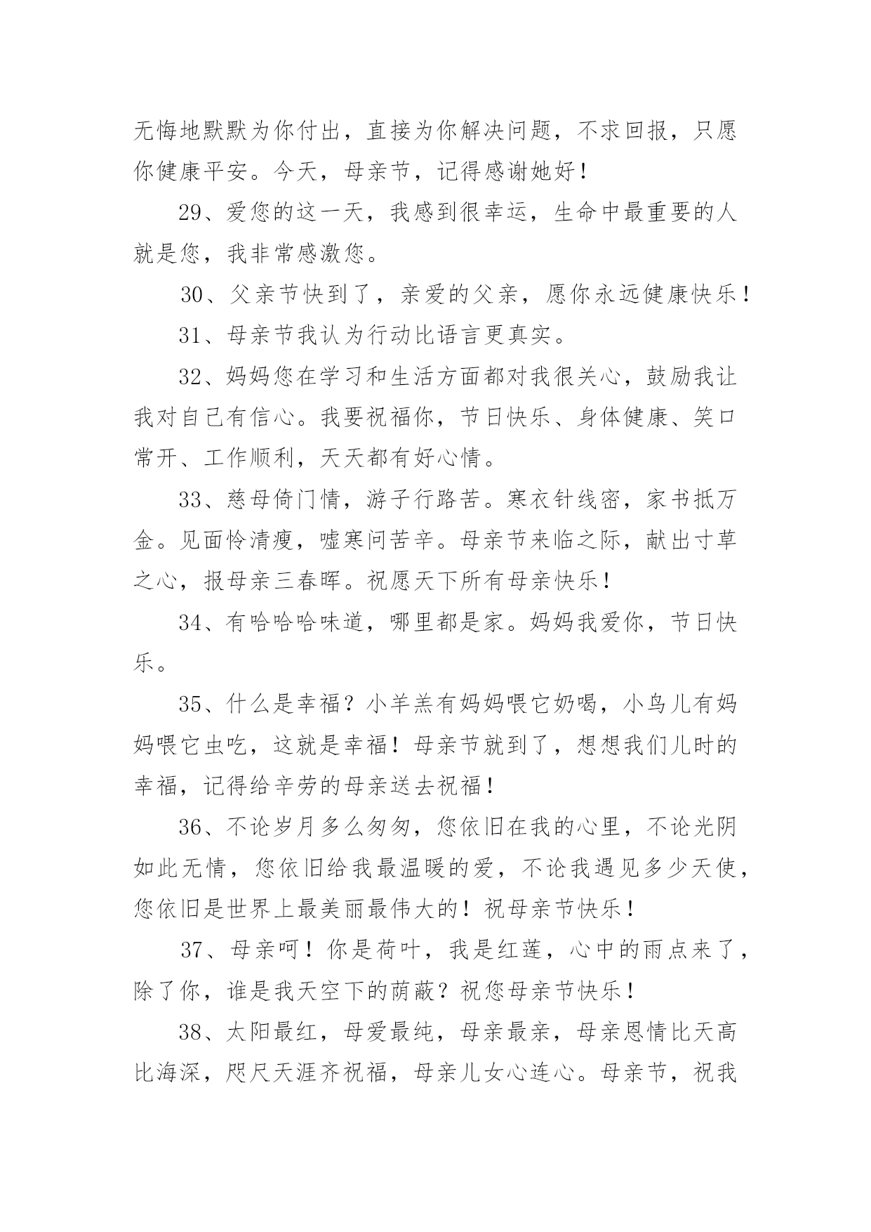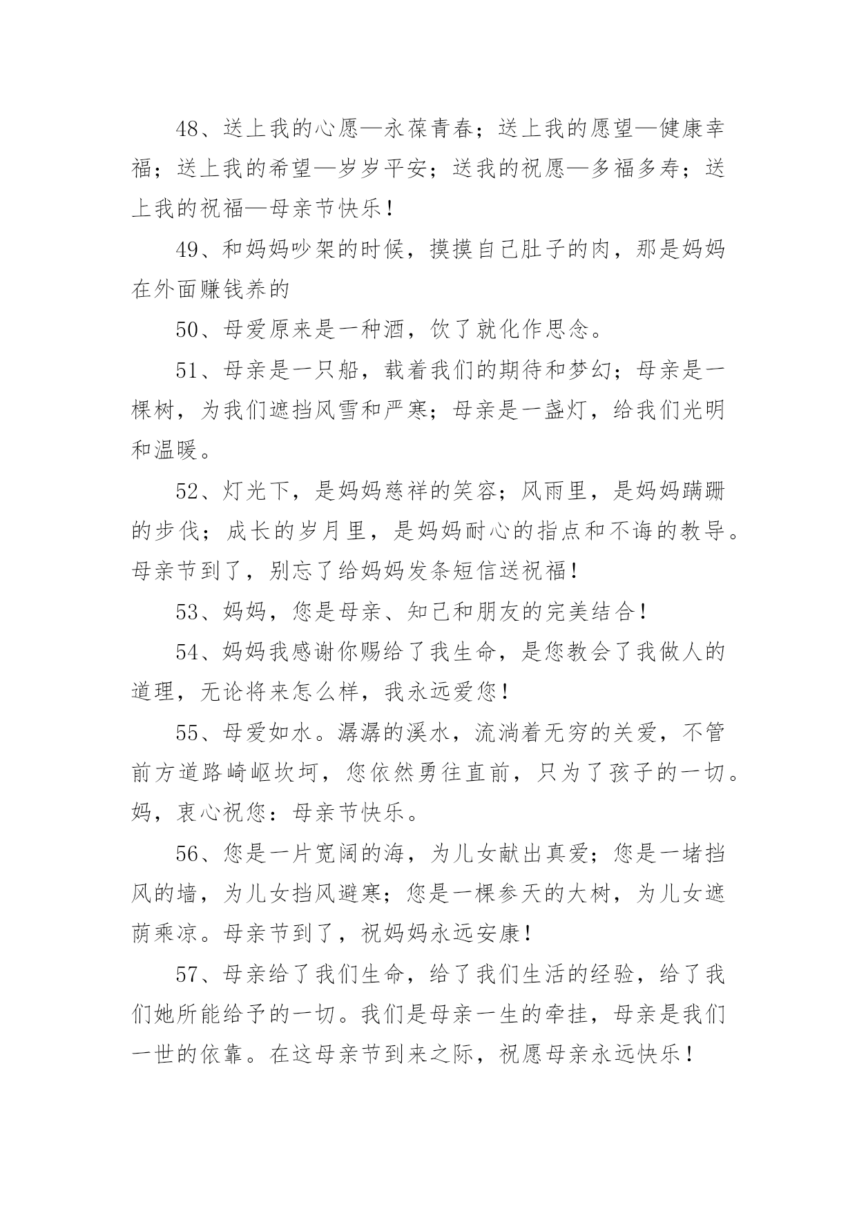 适合母亲节发的文案1适合母亲节发的文案随着网络社交的悄悄演进,大家都有令自己印象深刻的文案吧,文案用以记录和分享生活日常。你知道什么样的文案才能称之为经典吗?下面是小编为大家收集的适合母亲节发的文案,希望对大家有所帮助。适合母亲节发的文案11、祝天下母亲节日快乐!身体健康,笑口常开!妈妈您辛苦啦!2、离不开您的怀抱,尝不够的是柔情;躲不开您的视线,品不尽的是关爱;走不开您的关怀,叙不完的是亲情;儿行千里母担忧,最不愿放开的是母亲的手;母亲节里,妈妈请接受我深深的爱!妈妈,我无法用言语表达我对你的爱,因为我知道这世界上最无私最伟大的就是母爱,从小到大,您一直我的骄傲,就像是我的导师一样,什么事情都是您帮我处理好,您为我操劳了太多太多了,妈妈,我爱你,母亲节快乐!3、今天是母亲节,给妈妈买个苹果,保佑她生活平安,给妈妈买个香蕉,保佑她心甜,给妈妈买个蛋糕,保佑她胃口好,笑口常开,永不老去,节日快乐!4、亲爱的妈妈,您的母爱是我生命中最重要的事情,祝您母亲节愉快!5、我从故乡屋檐下飞出只小鸟每根羽毛成长都凝结着您深情抚爱和谆谆教导把无数思念化做心无限祝福默默祈祷祝健康快乐6、祝愿您母亲节开心,温馨、快乐,一天比一天有爱!7、妈妈是个美人时光请你别伤害她!母亲节快乐。8、有的男生挽起裤脚来很酷,而有的男生挽起裤脚来好像刚从田里回来一样。9、祝所有的母亲,母亲节快乐!越来越美丽!10、没有您的陪伴,我的成长和生命都不完整。祝您母亲节快乐!11、本事不大欲望就不要太大,否则你会很痛苦。12、我的手机充斥了各种工作,社交娱乐,她的手机,却只有我的相片和消息。13、因为有了您的陪伴,我生命中已经充满了爱和光明。祝您母亲节愉快!14、希望您的母亲节充满了温馨和快乐,因为您一直是我心中的母亲。15、祝福所有的母亲永远年轻美丽,身体健康,生活幸福,家庭温馨。16、快乐的母亲节,给所有母亲令人羡慕的富足和美丽生活。17、我的世界好大好大。可她的世界,很小很小,只装满了我。18、母亲是我们生命中最有用的人,绝无仅有的精神寄托和肉体支柱。愿母亲永远年轻美丽,幸福美满!19、祝全天下的母亲母亲节快乐,身体健康,永远年轻。妈我爱你!20、母亲节,是我们表达崇高敬意和亲情的时刻,愿母亲节日快乐,无忧无虑,万事如意。21、祝愿母亲从不会因为疲劳采摘下自家的“果实”,始终坚持为家庭奋斗,永远年轻美丽。22、家人关心你、财神关照你、我会永远宠爱你、幸运星永远照着你!祝妈妈母亲节快乐身体健康23、老妈,母亲节快乐。记得别老是唠叨我了。24、母亲您给了我生命,而我则成了您永远的牵挂。在我无法陪伴左右的日子里,愿妈妈您每一天都平安快乐,母亲节快乐!25、如果世界上有永恒无私的爱,那就是母爱和父爱。我委托明天父亲节和平安宁的曙光,送上我真挚的祝福:祝你父亲永远幸福。26、您常说,子女的幸福快乐就是最好的礼物,今天我把所有的幸福和快乐用短信包裹送给您,祝身体健康,笑口常开!27、有一个最美丽的名字:妈妈。有一种真实的感觉:感觉。有最高的品质:孝顺。现在有一句祝福的话:母亲节快乐!把它送给你妈妈,祝她一切顺利!28、有这样一个人:忍着痛把你带到这个世界上,无怨无悔地默默为你付出,直接为你解决问题,不求回报,只愿你健康平安。今天,母亲节,记得感谢她好!29、爱您的这一天,我感到很幸运,生命中最重要的人就是您,我非常感激您。30、父亲节快到了,亲爱的父亲,愿你永远健康快乐!31、母亲节我认为行动比语言更真实。32、妈妈您在学习和生活方面都对我很关心,鼓励我让我对自己有信心。我要祝福你,节日快乐、身体健康、笑口常开、工作顺利,天天都有好心情。33、慈母倚门情,游子行路苦。寒衣针线密,家书抵万金。见面怜清瘦,嘘寒问苦辛。母亲节来临之际,献出寸草之心,报母亲三春晖。祝愿天下所有母亲快乐!34、有哈哈哈味道,哪里都是家。妈妈我爱你,节日快乐。35、什么是幸福?小羊羔有妈妈喂它奶喝,小鸟儿有妈妈喂它虫吃,这就是幸福!母亲节就到了,想想我们儿时的幸福,记得给辛劳的母亲送去祝福!36、不论岁月多么匆匆,您依旧在我的心里,不论光阴如此无情,您依旧给我最温暖的爱,不论我遇见多少天使,您依旧是世界上最美丽最伟大的!祝母亲节快乐!37、母亲呵!你是荷叶,我是红莲,心中的雨点来了,除了你,谁是我天空下的荫蔽?祝您母亲节快乐!38、太阳最红,母爱最纯,母亲最亲,母亲恩情比天高比海深,咫尺天涯齐祝福,母亲儿女心连心。母亲节,祝我们的母亲寿比南山松福如东海水。39、送一束鲜花,道一句祝愿,母亲就会笑容满面。40、母爱何深,牵肠挂肚系一生,岂只怀胎十月;亲恩难忘,霖雨春晖荣寸草,允当反哺千回。41、母爱是伟大的,母爱是崇高的,母爱是无私的。多少年来,母亲养育着我,呵护着我,使我在母亲的呵护下成长,在母爱的关怀