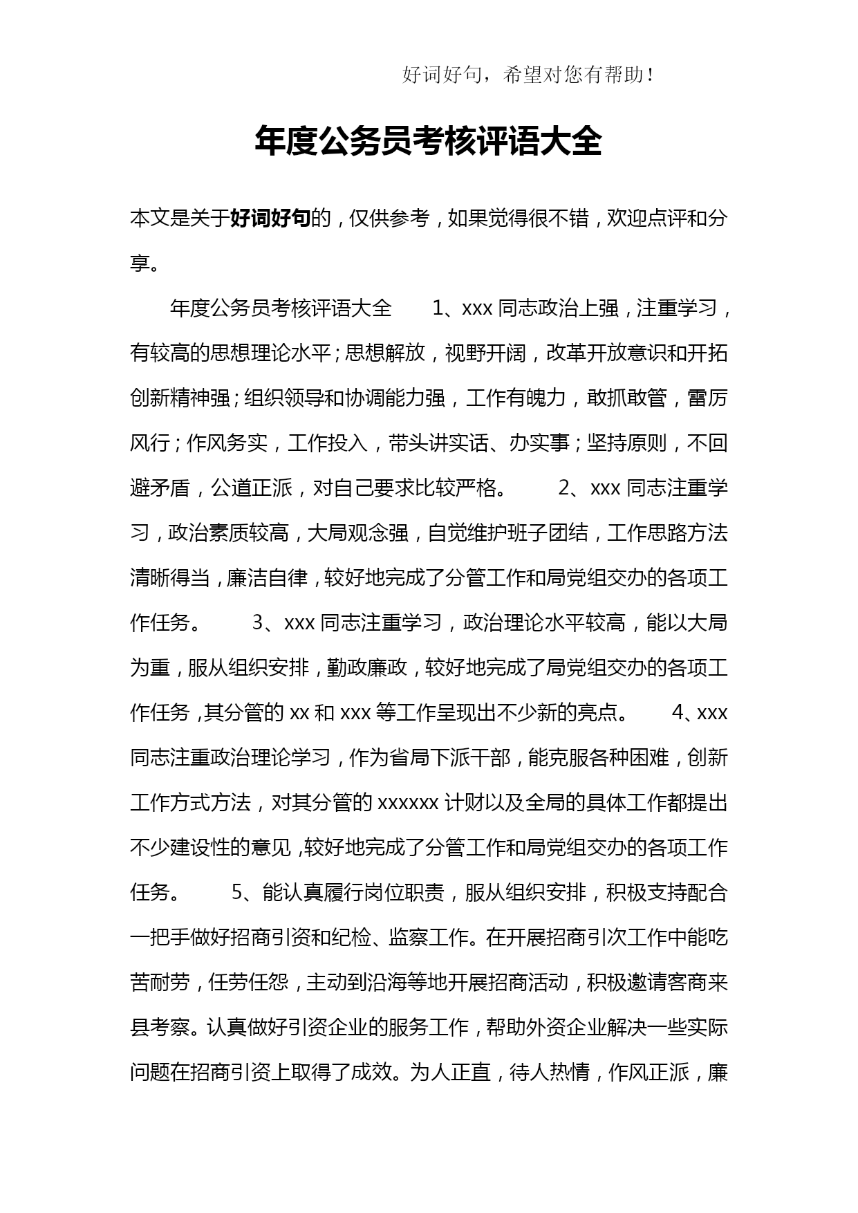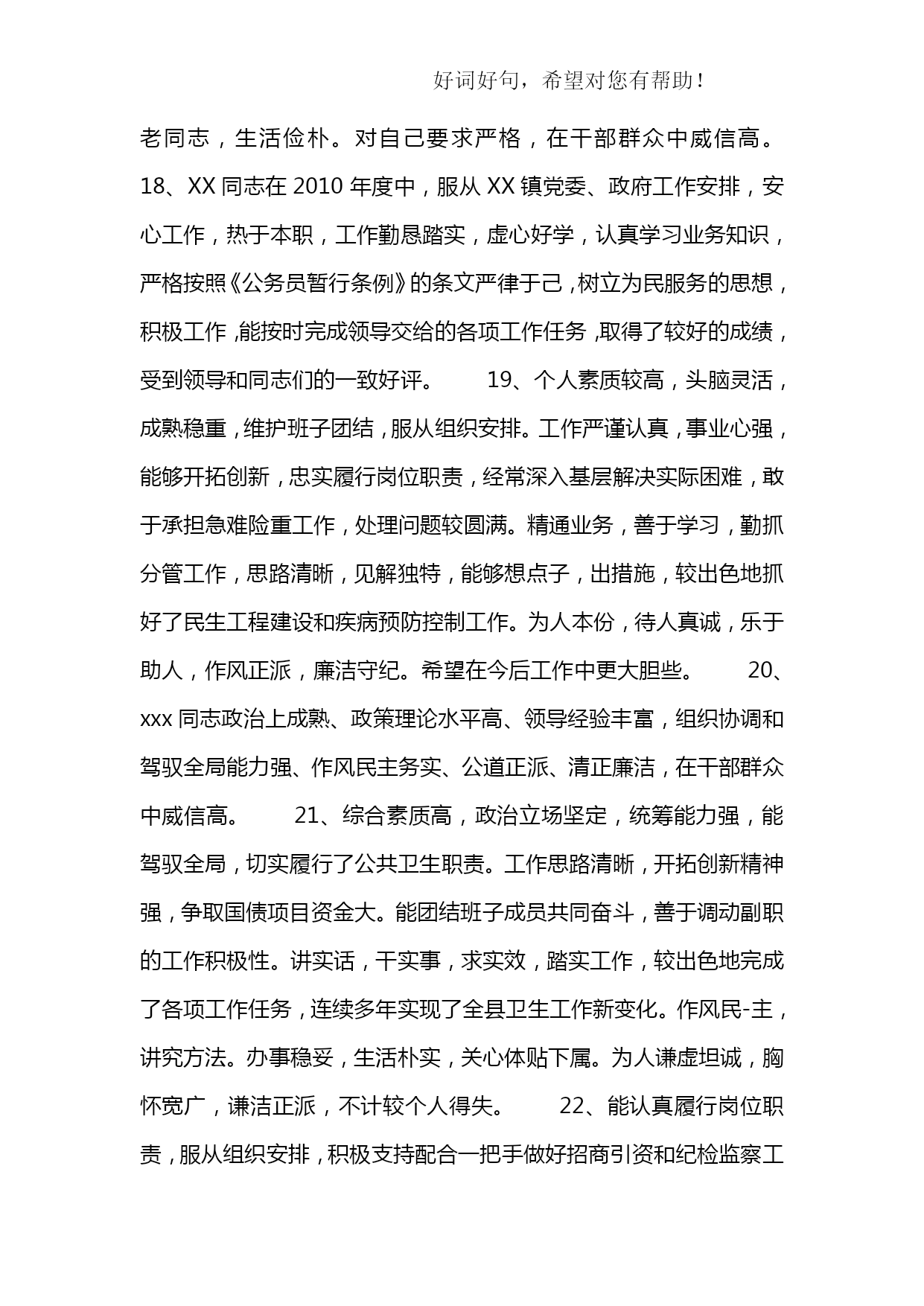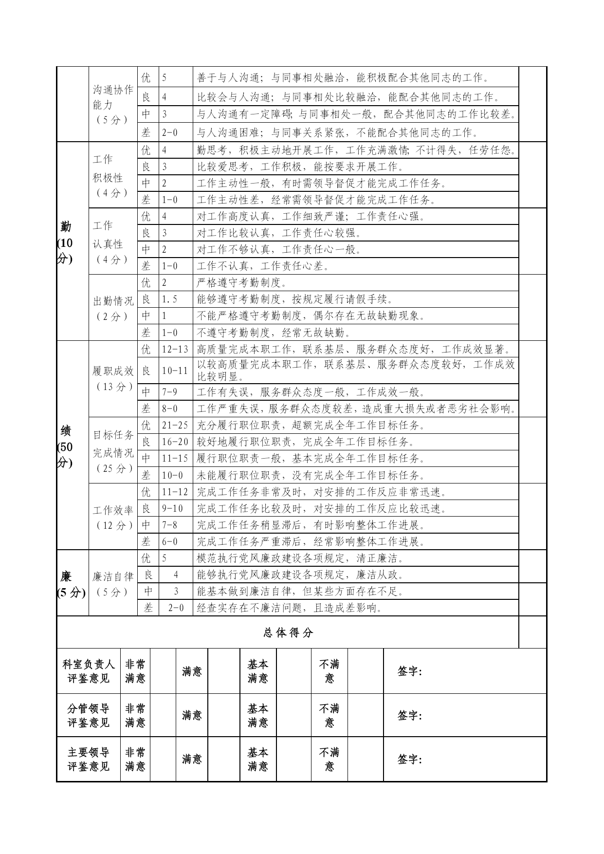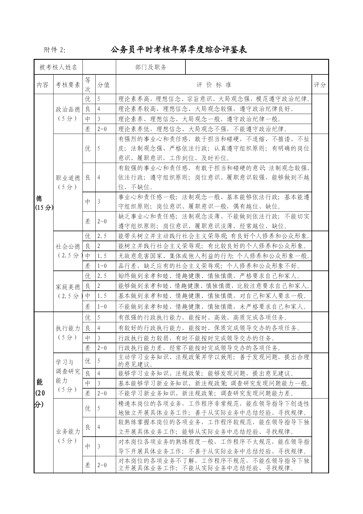 公务员平时考核季度综合评鉴表优质资料(可以直接使用,可编辑优质资料,欢迎下载)附件2:公务员平时考核年第季度综合评鉴表被考核人姓名部门及职务内容考核要素等次分值评价标准评分德(15分)政治品德(5分)优5理论素养高,理想信念、宗旨意识、大局观念强,模范遵守政治纪律。良4理论素养较高,理想信念、大局观念较强,遵守政治纪律良好。中3理论素养、理想信念、大局观念一般,遵守政治纪律一般。差2-0理论素养低,理想信念、大局观念不强,不能遵守政治纪律。职业道德(5分)优5有强烈的事业心和责任感,敢于担当和碰硬,不退缩、不推诿、不扯皮;法制观念强、严格依法行政;认真遵守组织原则;有明确的岗位意识、履职意识,工作到位、及时补位。良4有较强的事业心和责任感,有敢于担当和碰硬的意识;法制观念较强、依法行政;遵守组织原则;岗位意识、履职意识较强,能够做到不越位、不缺位。中3事业心和责任感一般;法制观念一般、基本能够依法行政;基本能遵守组织原则;岗位意识、履职意识一般,偶有越位、缺位。差2-0缺乏事业心和责任感;法制观念淡薄、不能做到依法行政;不能切实遵守组织原则;岗位意识、履职意识淡薄,经常越位、缺位。社会公德(2.5分)优2.5能带头树立并主动践行社会主义荣辱观;有良好个人修养和公众形象。良2能树立并践行社会主义荣辱观;有比较良好的个人修养和公众形象。中1.5无故意危害国家、集体或他人利益的行为;个人修养和公众形象一般。差1-0品行差,缺乏应有的社会主义荣辱观;个人修养和公众形象不好。家庭美德(2.5分)优2.5始终做到亲孝和睦、情趣健康、慎独慎微,严格要求自己和家人。良2能够做到亲孝和睦、情趣健康、慎独慎微,比较注意要求自己和家人。中1.5基本做到亲孝和睦、情趣健康、慎独慎微,对自己和家人要求一般。差1-0不能做到亲孝和睦、情趣健康、慎独慎微,未严格要求自己和家人。能(20分)执行能力(5分)优5有很强的行政执行能力,能按时、高效、高质完成各项任务。良4有较好的行政执行能力,能按时、保质完成领导交办的各项任务。中3行政执行能力较弱,有时不能按时完成领导交办的任务。差2-0行政执行能力差,经常不能按时完成领导交办的各项任务。学习与调查研究能力(5分)优5主动学习业务知识、法规政策并学以致用;善于发现问题,提出合理的意见建议。良4能够学习业务知识、法规政策;能够发现问题,提出意见建议。中3基本能够学习新业务知识、新法规政策;调查研究发现问题能力一般。差2-0不能学习新业务知识、新法规政策;调查研究发现问题能力差。业务能力(5分)优5精通本岗位的各项业务,工作程序非常规范,能在领导指导下创造性地独立开展具体业务工作;善于从实际业务中总结经验、寻找规律。良4较熟练掌握本岗位的各项业务,工作程序较规范,能在领导指导下独立开展具体业务工作;能够从实际业务中总结经验、寻找规律。中3对本岗位各项业务的熟练程度一般,工作程序不太规范,能在领导指导下开展具体业务工作;不善于从实际业务中总结经验、寻找规律。差2-0对本岗位的各项业务不了解,工作程序不规范,不能在领导指导下独立开展具体业务工作;不能从实际业务中总结经验、寻找规律。沟通协作能力(5分)优5善于与人沟通;与同事相处融洽,能积极配合其他同志的工作。良4比较会与人沟通;与同事相处比较融洽,能配合其他同志的工作。中3与人沟通有一定障碍;与同事相处一般,配合其他同志的工作比较差。差2-0与人沟通困难;与同事关系紧张,不能配合其他同志的工作。勤(10分)工作积极性(4分)优4勤思考,积极主动地开展工作,工作充满激情;不计得失,任劳任怨。良3比较爱思考,工作积极,能按要求开展工作。中2工作主动性一般,有时需领导督促才能完成工作任务。差1-0工作主动性差,经常需领导督促才能完成工作任务。工作认真性(4分)优4对工作高度认真,工作细致严谨;工作责任心强。良3对工作比较认真,工作责任心较强。中2对工作不够认真,工作责任心一般。差1-0工作不认真,工作责任心差。出勤情况(2分)优2严格遵守考勤制度。良1.5能够遵守考勤制度,按规定履行请假手续。中1不能严格遵守考勤制度,偶尔存在无故缺勤现象。差1-0不遵守考勤制度,经常无故缺勤。绩(50分)履职成效(13分)优12-13高质量完成本职工作,联系基层、服务群众态度好,工作成效显著。良10-11以较高质量完成本职工作,联系基层、服务群众态度较好,工作成效比较明显。中7-9工作有失误,服务群众态度一般,工作成效一般。差8-0工作严重失误,服务群众态度较差,造成重大损失或者恶劣社会影响。目标任务完成情况(25分)优21-25充分履行职位职责,超额完成全年工作目标任务。良16-20较好地履行职位职责,完成全年工作目标任务。中11-15履行职