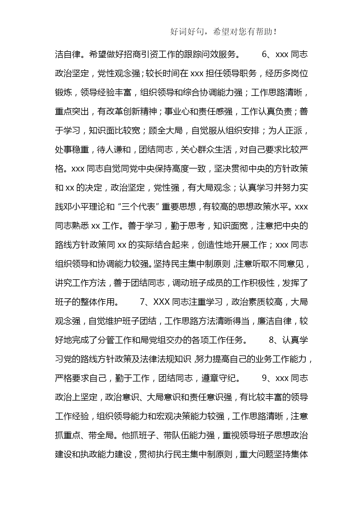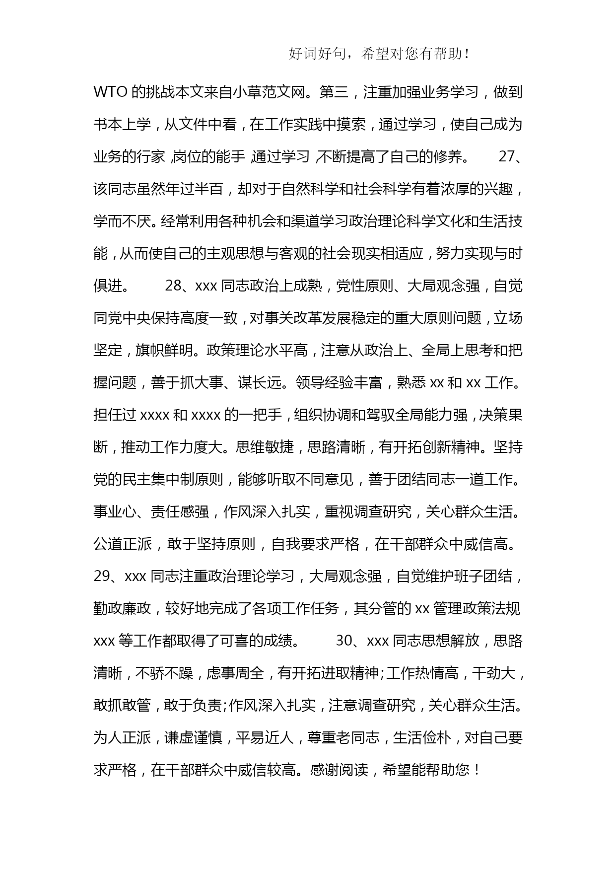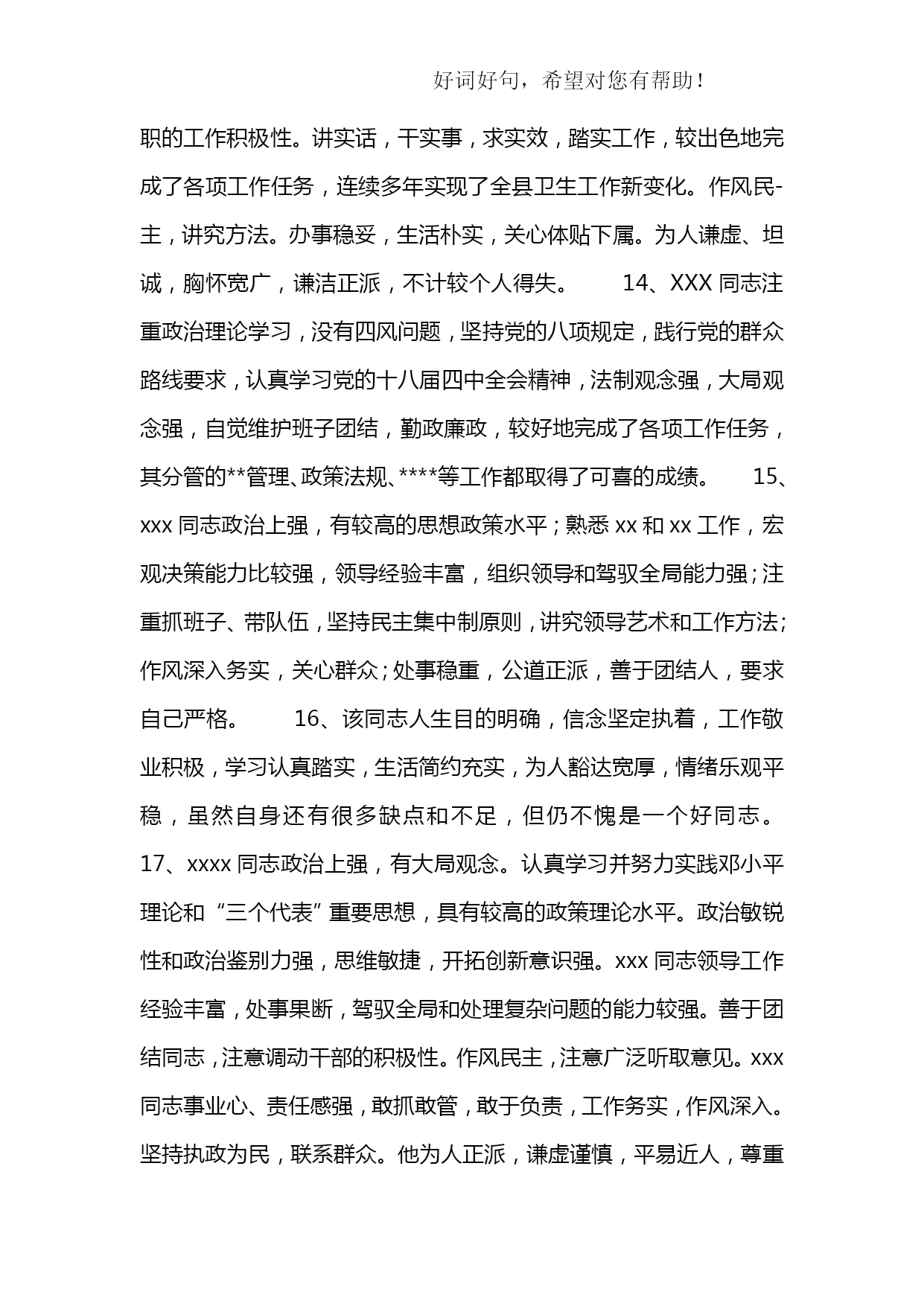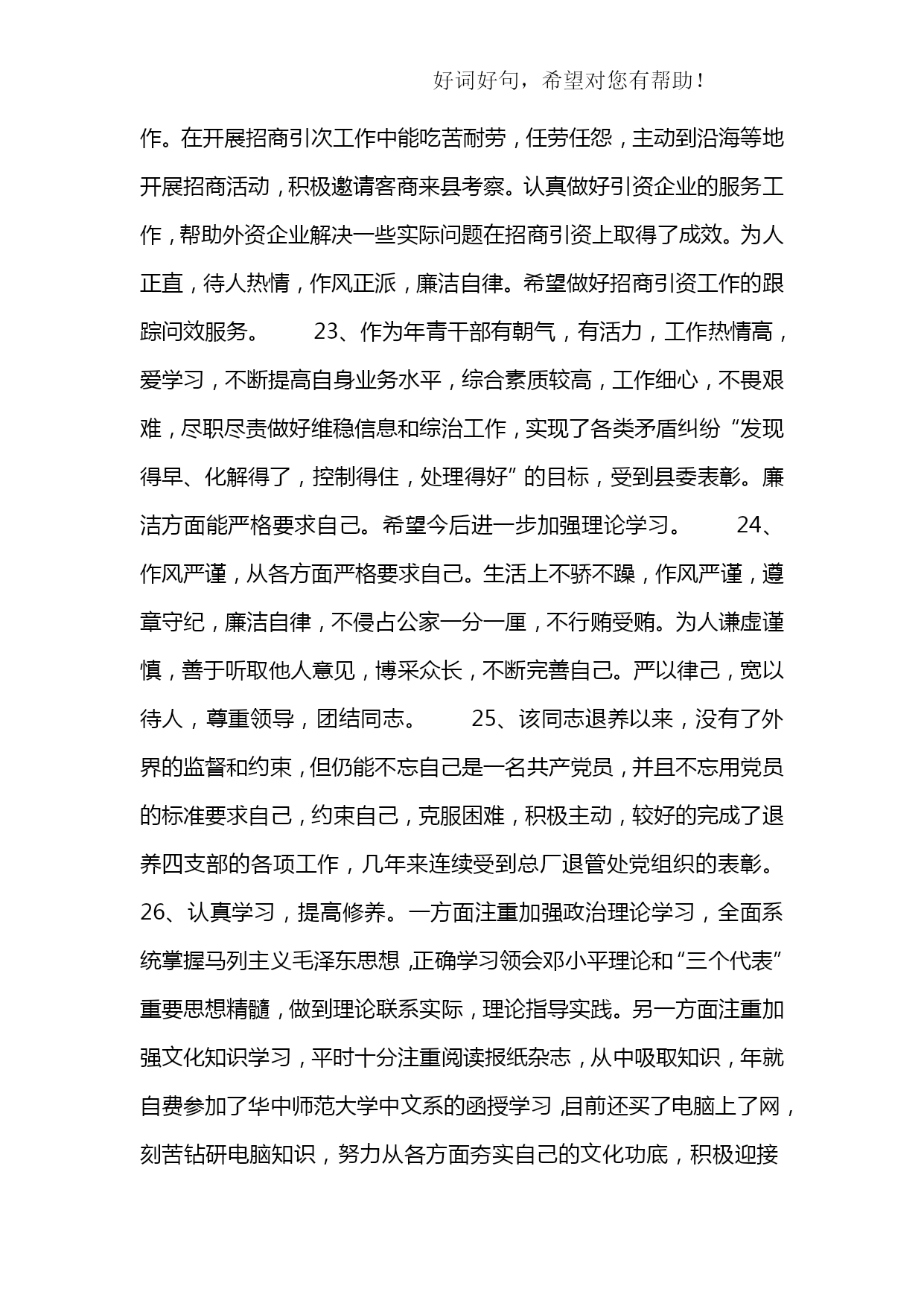 公务员平时考核季度综合评鉴表优质资料(可以直接使用,可编辑优质资料,欢迎下载)附件2:公务员平时考核年第季度综合评鉴表被考核人姓名部门及职务内容考核要素等次分值评价标准评分德(15分)政治品德(5分)优5理论素养高,理想信念、宗旨意识、大局观念强,模范遵守政治纪律。良4理论素养较高,理想信念、大局观念较强,遵守政治纪律良好。中3理论素养、理想信念、大局观念一般,遵守政治纪律一般。差2-0理论素养低,理想信念、大局观念不强,不能遵守政治纪律。职业道德(5分)优5有强烈的事业心和责任感,敢于担当和碰硬,不退缩、不推诿、不扯皮;法制观念强、严格依法行政;认真遵守组织原则;有明确的岗位意识、履职意识,工作到位、及时补位。良4有较强的事业心和责任感,有敢于担当和碰硬的意识;法制观念较强、依法行政;遵守组织原则;岗位意识、履职意识较强,能够做到不越位、不缺位。中3事业心和责任感一般;法制观念一般、基本能够依法行政;基本能遵守组织原则;岗位意识、履职意识一般,偶有越位、缺位。差2-0缺乏事业心和责任感;法制观念淡薄、不能做到依法行政;不能切实遵守组织原则;岗位意识、履职意识淡薄,经常越位、缺位。社会公德(2.5分)优2.5能带头树立并主动践行社会主义荣辱观;有良好个人修养和公众形象。良2能树立并践行社会主义荣辱观;有比较良好的个人修养和公众形象。中1.5无故意危害国家、集体或他人利益的行为;个人修养和公众形象一般。差1-0品行差,缺乏应有的社会主义荣辱观;个人修养和公众形象不好。家庭美德(2.5分)优2.5始终做到亲孝和睦、情趣健康、慎独慎微,严格要求自己和家人。良2能够做到亲孝和睦、情趣健康、慎独慎微,比较注意要求自己和家人。中1.5基本做到亲孝和睦、情趣健康、慎独慎微,对自己和家人要求一般。差1-0不能做到亲孝和睦、情趣健康、慎独慎微,未严格要求自己和家人。能(20分)执行能力(5分)优5有很强的行政执行能力,能按时、高效、高质完成各项任务。良4有较好的行政执行能力,能按时、保质完成领导交办的各项任务。中3行政执行能力较弱,有时不能按时完成领导交办的任务。差2-0行政执行能力差,经常不能按时完成领导交办的各项任务。学习与调查研究能力(5分)优5主动学习业务知识、法规政策并学以致用;善于发现问题,提出合理的意见建议。良4能够学习业务知识、法规政策;能够发现问题,提出意见建议。中3基本能够学习新业务知识、新法规政策;调查研究发现问题能力一般。差2-0不能学习新业务知识、新法规政策;调查研究发现问题能力差。业务能力(5分)优5精通本岗位的各项业务,工作程序非常规范,能在领导指导下创造性地独立开展具体业务工作;善于从实际业务中总结经验、寻找规律。良4较熟练掌握本岗位的各项业务,工作程序较规范,能在领导指导下独立开展具体业务工作;能够从实际业务中总结经验、寻找规律。中3对本岗位各项业务的熟练程度一般,工作程序不太规范,能在领导指导下开展具体业务工作;不善于从实际业务中总结经验、寻找规律。差2-0对本岗位的各项业务不了解,工作程序不规范,不能在领导指导下独立开展具体业务工作;不能从实际业务中总结经验、寻找规律。沟通协作能力(5分)优5善于与人沟通;与同事相处融洽,能积极配合其他同志的工作。良4比较会与人沟通;与同事相处比较融洽,能配合其他同志的工作。中3与人沟通有一定障碍;与同事相处一般,配合其他同志的工作比较差。差2-0与人沟通困难;与同事关系紧张,不能配合其他同志的工作。勤(10分)工作积极性(4分)优4勤思考,积极主动地开展工作,工作充满激情;不计得失,任劳任怨。良3比较爱思考,工作积极,能按要求开展工作。中2工作主动性一般,有时需领导督促才能完成工作任务。差1-0工作主动性差,经常需领导督促才能完成工作任务。工作认真性(4分)优4对工作高度认真,工作细致严谨;工作责任心强。良3对工作比较认真,工作责任心较强。中2对工作不够认真,工作责任心一般。差1-0工作不认真,工作责任心差。出勤情况(2分)优2严格遵守考勤制度。良1.5能够遵守考勤制度,按规定履行请假手续。中1不能严格遵守考勤制度,偶尔存在无故缺勤现象。差1-0不遵守考勤制度,经常无故缺勤。绩(50分)履职成效(13分)优12-13高质量完成本职工作,联系基层、服务群众态度好,工作成效显著。良10-11以较高质量完成本职工作,联系基层、服务群众态度较好,工作成效比较明显。中7-9工作有失误,服务群众态度一般,工作成效一般。差8-0工作严重失误,服务群众态度较差,造成重大损失或者恶劣社会影响。目标任务完成情况(25分)优21-25充分履行职位职责,超额完成全年工作目标任务。良16-20较好地履行职位职责,完成全年工作目标任务。中11-15履行职