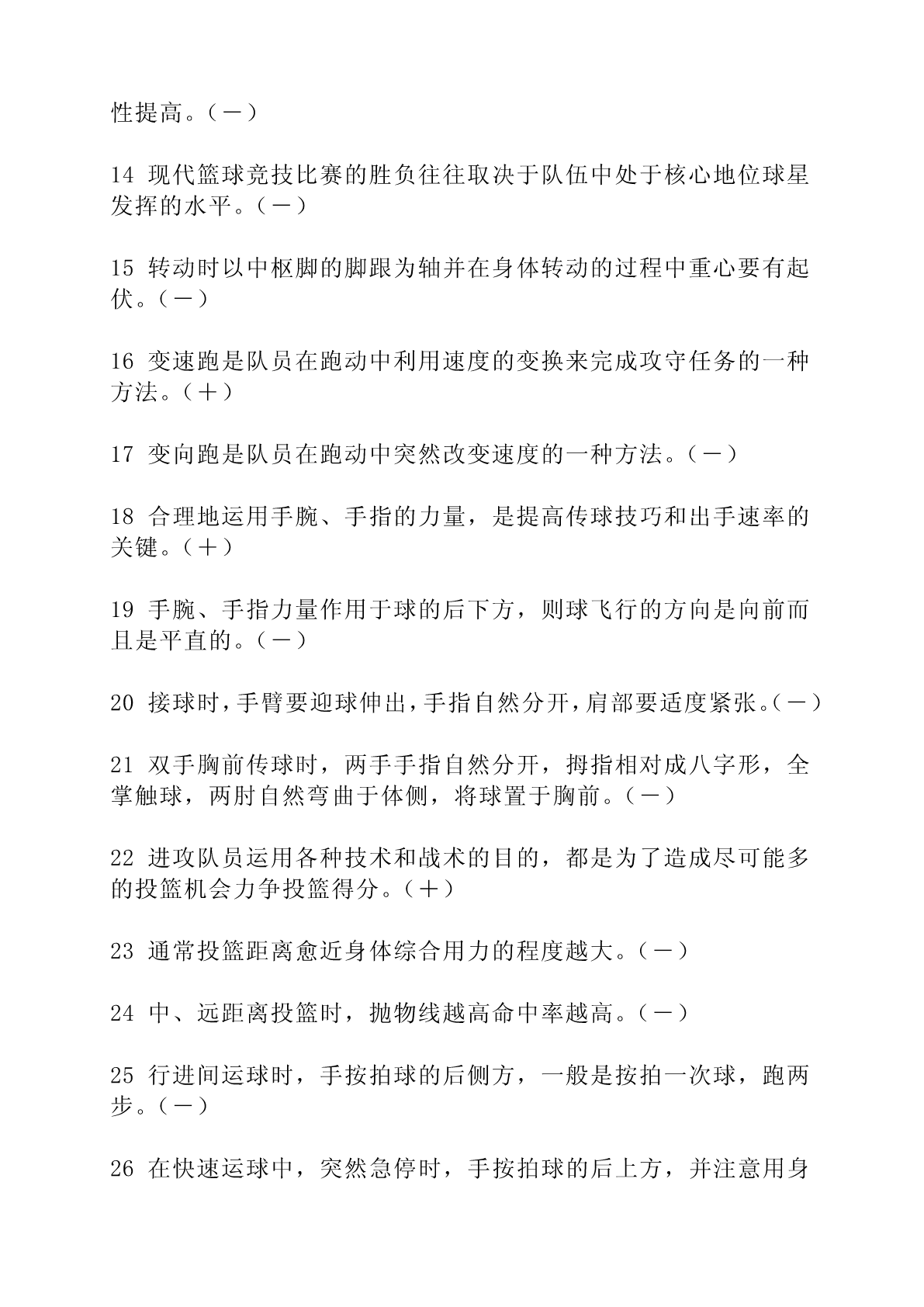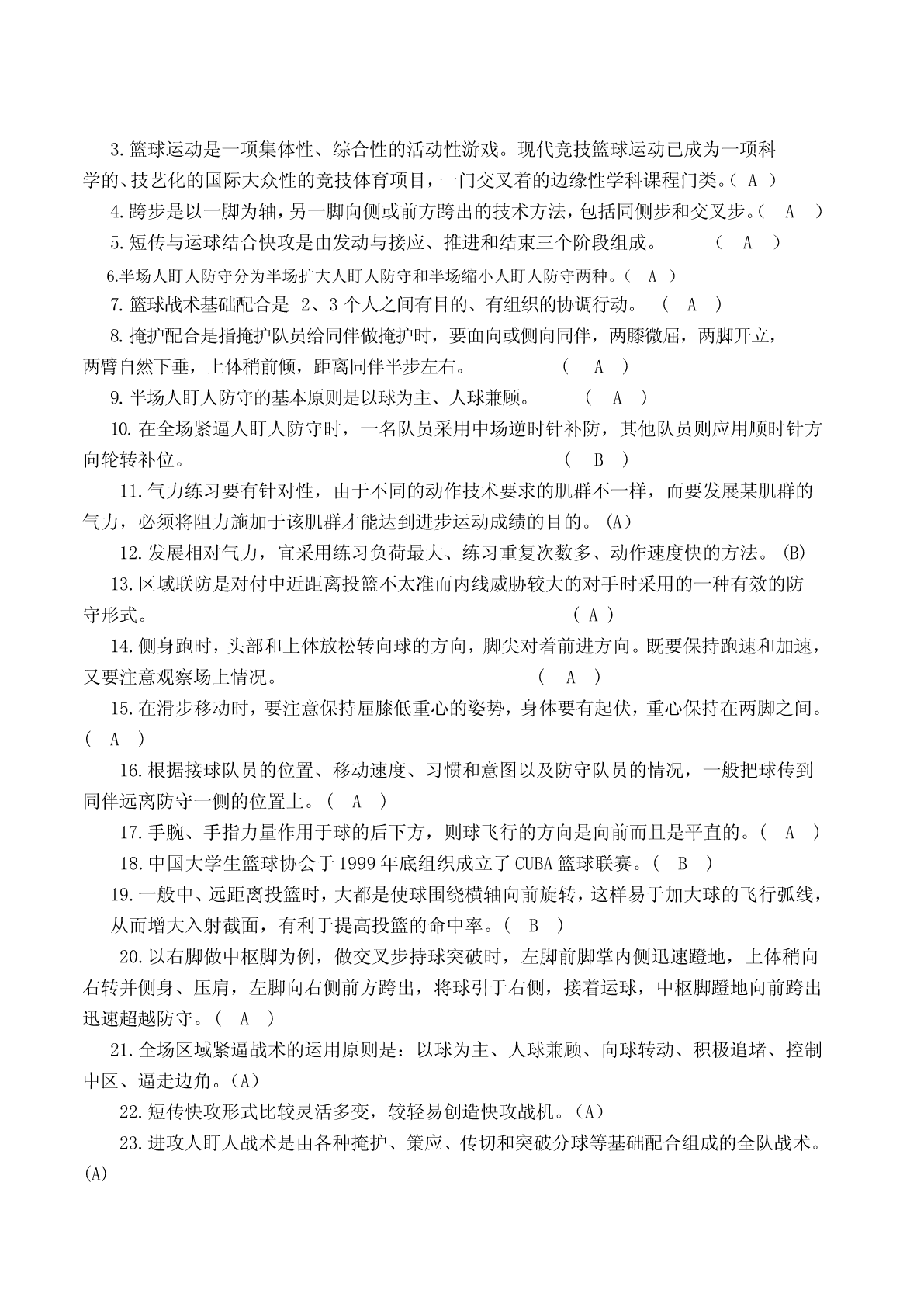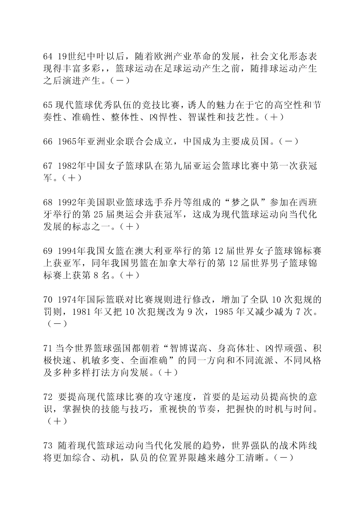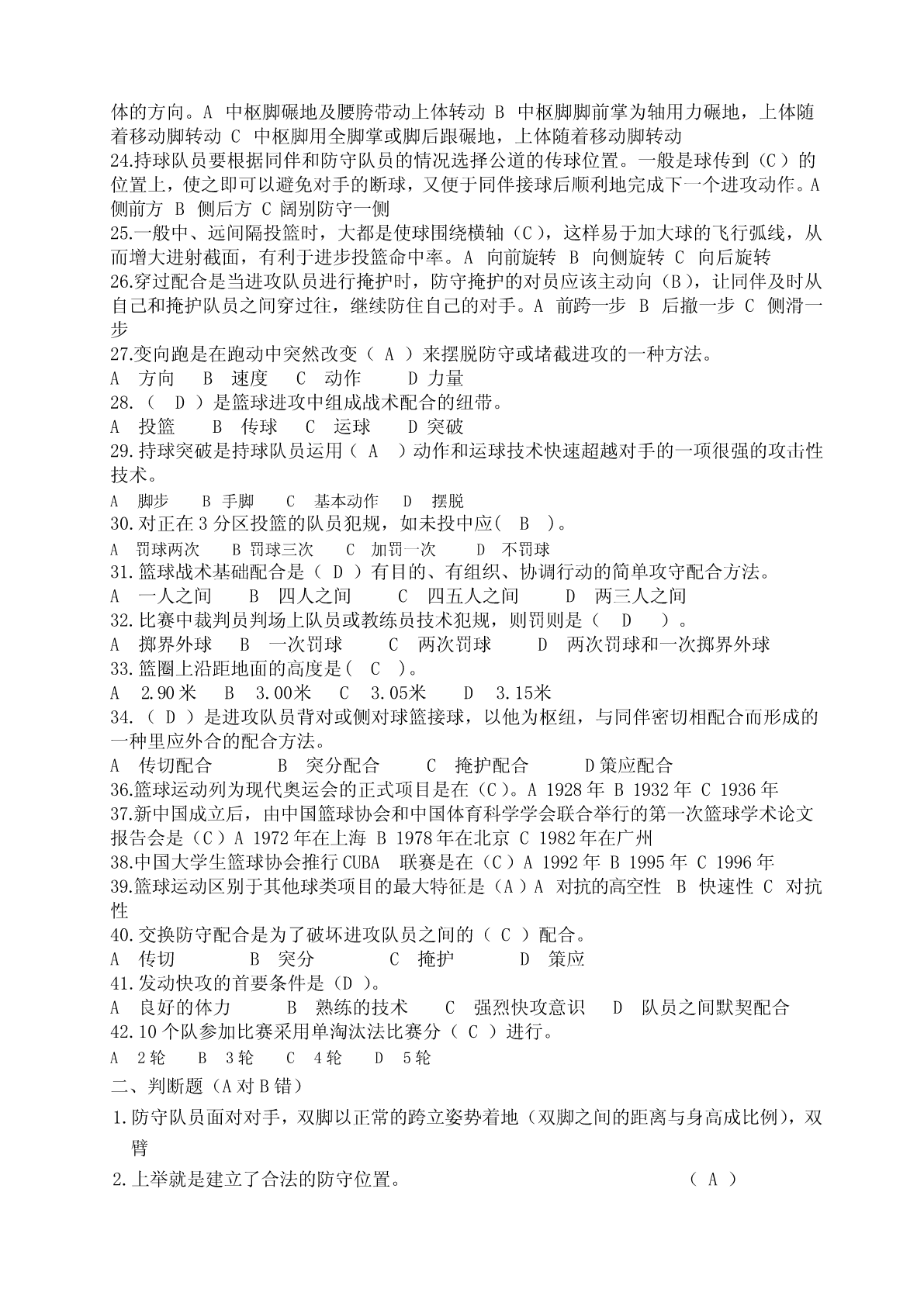 篮球理论考试复习一、单选题1.篮球运动(B)年起源于美国。是美国东部马萨诸塞州斯普林菲尔德市当时的青年基督教学体育教师詹姆仕.奈史密斯发明的。A1890B1891C1892D18932.急停是队员跑动中突然制动(B)的一种动作方法。A冲力B速度C力量D方向(C)年在瑞士的日内瓦成立了国际业余篮球联合会。A1976B1936C1932D19373.篮球运动最早传入我国天津的时间是(B)。A1894B1895C1897D18984.中国男子篮球队参加历届奥运会和世界锦标赛中最好成绩是(B)名。A7B8C9D105.进攻战术基础配合包括(C):A二三人半场进攻配合B传切配合、定位掩护配合、突破配合、策应配合C传切配合、掩护配合、突分配合、策应配合6.当对方加强内线进攻时,一般来说,本方应采用(B)防守:A半场扩大人盯人B半场缩小人盯人C混合防守7.当对方投中或罚中后,采用全场紧逼防守时,展开后场进攻的关键是(B):A运球快速突破B接应发球C快速落位和掩护8.现代篮球运动是由一位叫(A)的美国人先容到中国的。A来会里B蔡尔乐C马约翰9.中国男子篮球队参加历届奥运会和世界锦标赛中最好成绩是(B):A第7名B第8名C第9名10.中国女子篮球队参加历届奥运会和世界锦标赛中最好成绩是(A):A第2名B第3名C第4名11.中国篮球协会试行全国性的职业篮球联赛是在(A):A1995年CNBA联赛B1996年CBA职业联赛C1995年全国甲A联赛12.标准篮球场地的面积是(D)。A27米×14米B26米×13米C25米×14米D28米×15米13.变速跑是队员跑动中利用(A)的变换来争取主动的一种方法。A速度B强度C时间D位置14.后退跑是队员在球场上(C)前进方向的一种方法。A侧对B面对C背对D正对15.1936年第(B)届奥运会上,篮球运动被列为男子正式竞赛项目。A10B11C12D1316.行进间双手接球时,一般左(釉订脚上前接球后,釉定左)脚上步,左脚抬起在(B)出球。A落地后B落地前C腾空时17.半场人盯人防守时,对不持球的队员可采取的防守要求是(B)A盯人不盯球B人球兼顾C盯球不盯人18.全场紧逼盯人防守战术是与对方在(C)展开激烈的争夺。A后场B前场C全场19.篮球场内三个圈的半径都是(C)。A1.70米B2.00米C1.80米20.进攻队员在后场控制球后必须在(C)秒钟内使球进进前场。A3B5C821.3秒钟规则是当某队控制球时,同队队员在(B)停留不得超过3秒钟。A本方限制区B对方限制区C本方罚球区22.篮圈上沿距地面的高度是(A)。A3.05米B2.75米C2.90米23.转身时,重心移向中枢脚,移动脚的脚前掌蹬地跨出的同时,(B)向前或向后改变身体的方向。A中枢脚碾地及腰胯带动上体转动B中枢脚脚前掌为轴用力碾地,上体随着移动脚转动C中枢脚用全脚掌或脚后跟碾地,上体随着移动脚转动24.持球队员要根据同伴和防守队员的情况选择公道的传球位置。一般是球传到(C)的位置上,使之即可以避免对手的断球,又便于同伴接球后顺利地完成下一个进攻动作。A侧前方B侧后方C阔别防守一侧25.一般中、远间隔投篮时,大都是使球围绕横轴(C),这样易于加大球的飞行弧线,从而增大进射截面,有利于进步投篮命中率。A向前旋转B向侧旋转C向后旋转26.穿过配合是当进攻队员进行掩护时,防守掩护的对员应该主动向(B),让同伴及时从自己和掩护队员之间穿过往,继续防住自己的对手。A前跨一步B后撤一步C侧滑一步27.变向跑是在跑动中突然改变(A)来摆脱防守或堵截进攻的一种方法。A方向B速度C动作D力量28.(D)是篮球进攻中组成战术配合的纽带。A投篮B传球C运球D突破29.持球突破是持球队员运用(A)动作和运球技术快速超越对手的一项很强的攻击性技术。A脚步B手脚C基本动作D摆脱30.对正在3分区投篮的队员犯规,如未投中应(B)。A罚球两次B罚球三次C加罚一次D不罚球31.篮球战术基础配合是(D)有目的、有组织、协调行动的简单攻守配合方法。A一人之间B四人之间C四五人之间D两三人之间32.比赛中裁判员判场上队员或教练员技术犯规,则罚则是(D)。A掷界外球B一次罚球C两次罚球D两次罚球和一次掷界外球33.篮圈上沿距地面的高度是(C)。A2.90米B3.00米C3.05米D3.15米34.(D)是进攻队员背对或侧对球篮接球,以他为枢纽,与同伴密切相配合而形成的一种里应外合的配合方法。A传切配合B突分配合C掩护配合D策应配合36.篮球运动列为现代奥运会的正式项目是在(C)。A1928年B1932年C1936年37.新中国成立后,