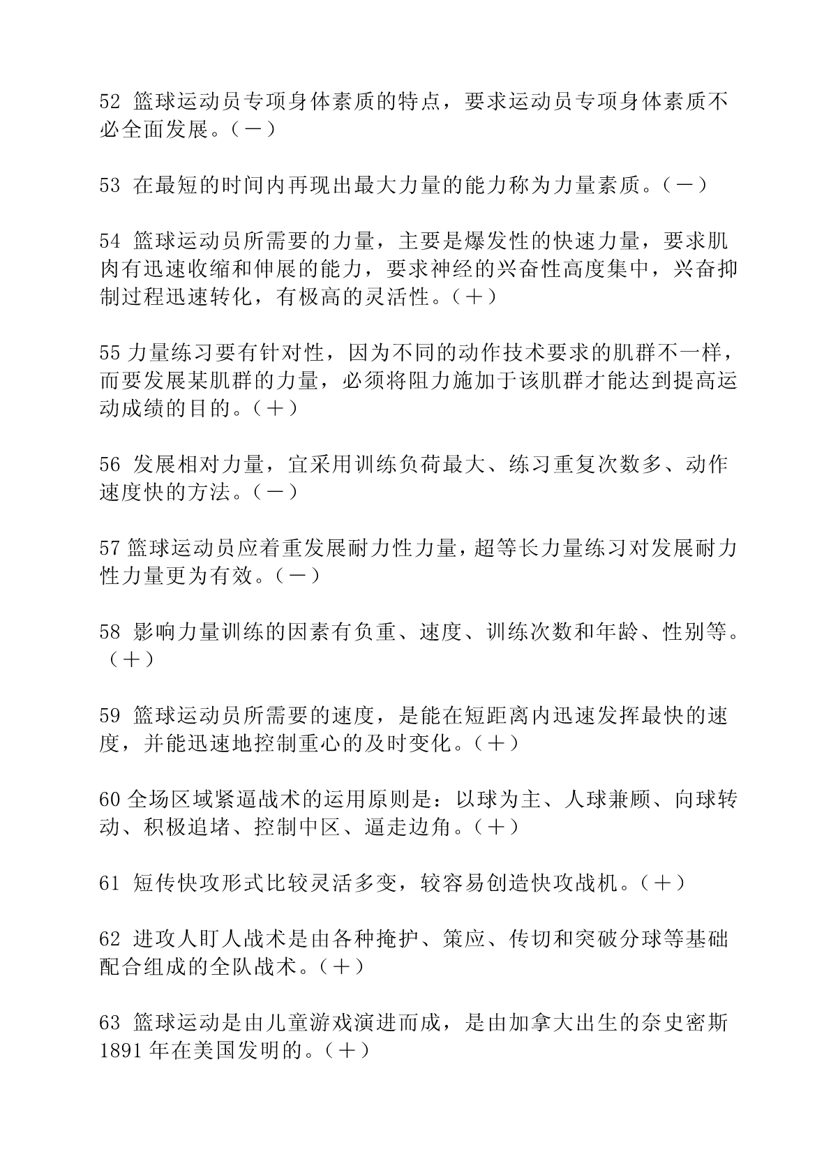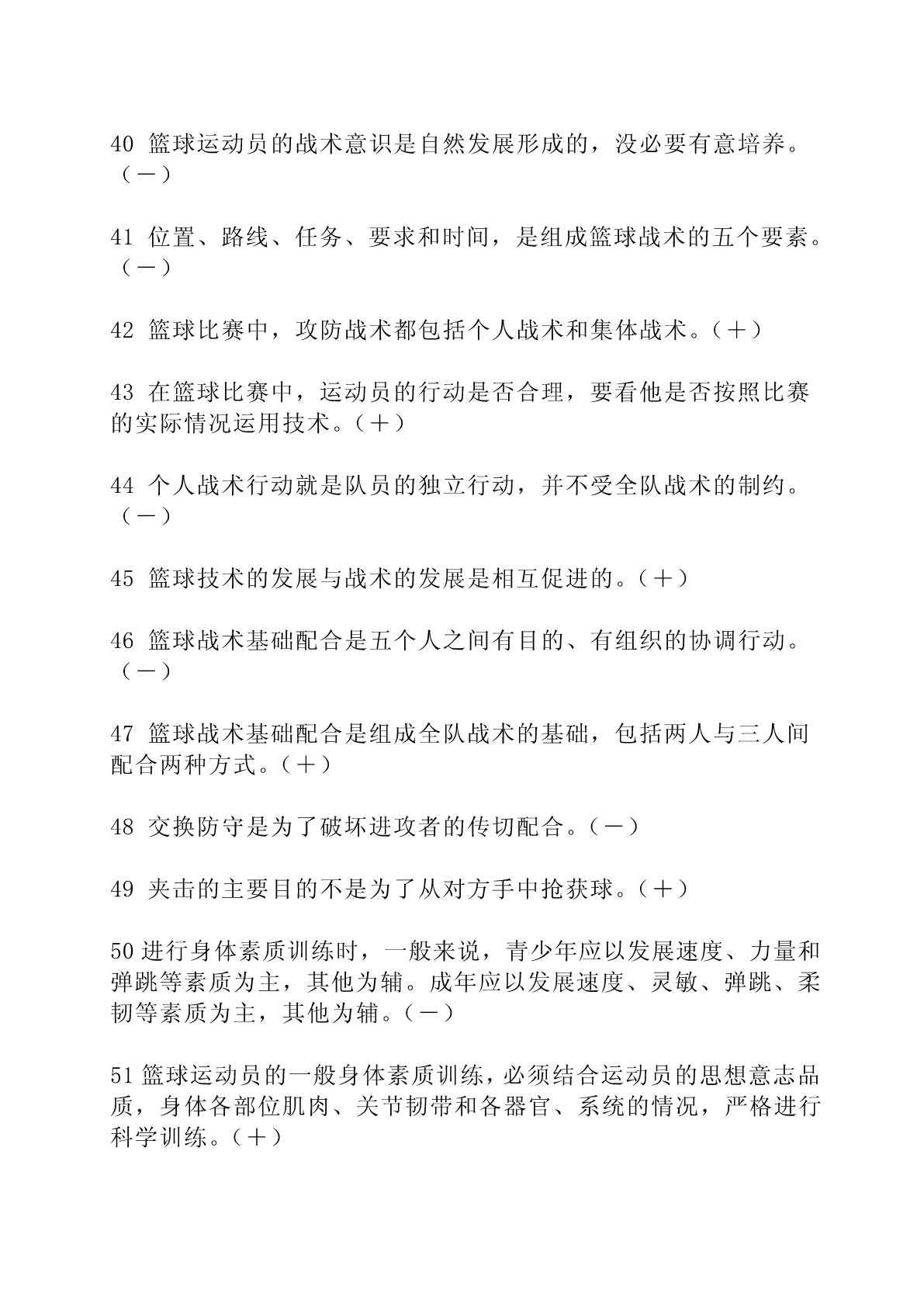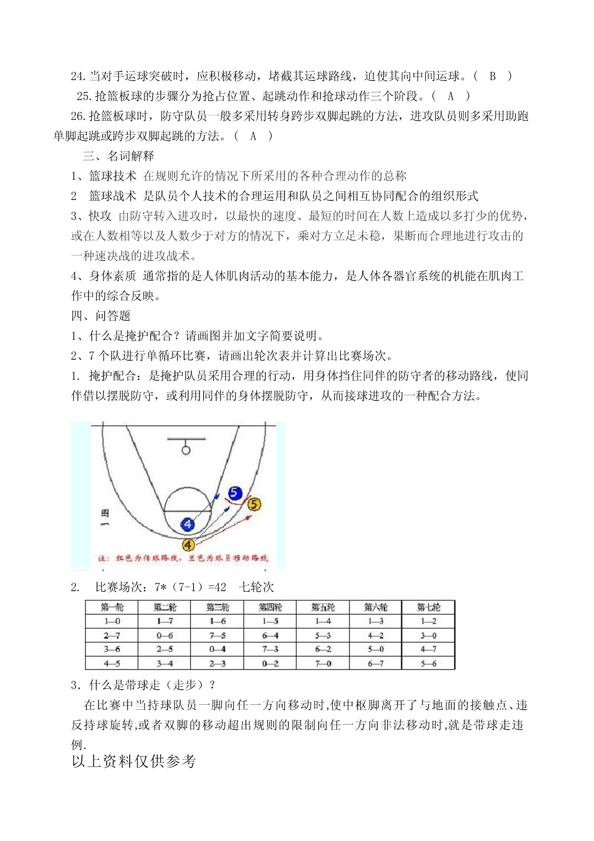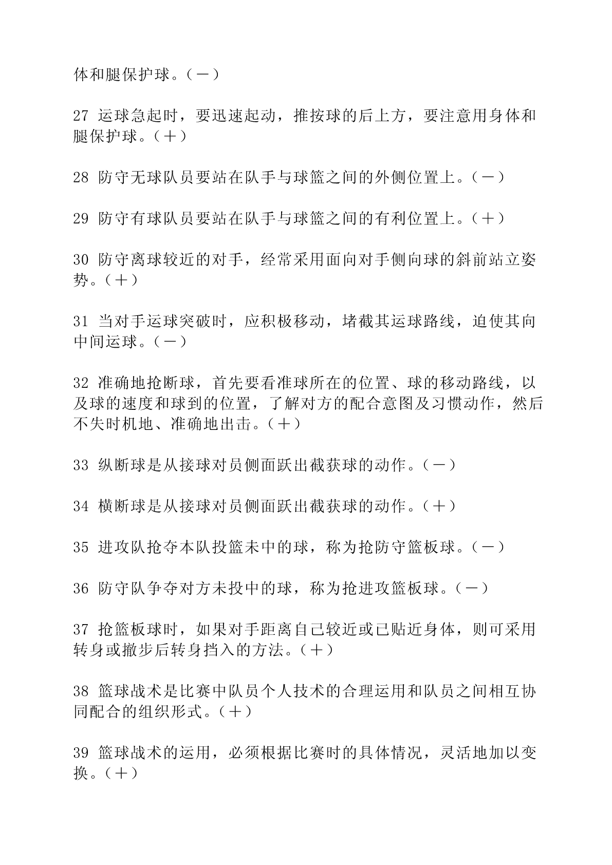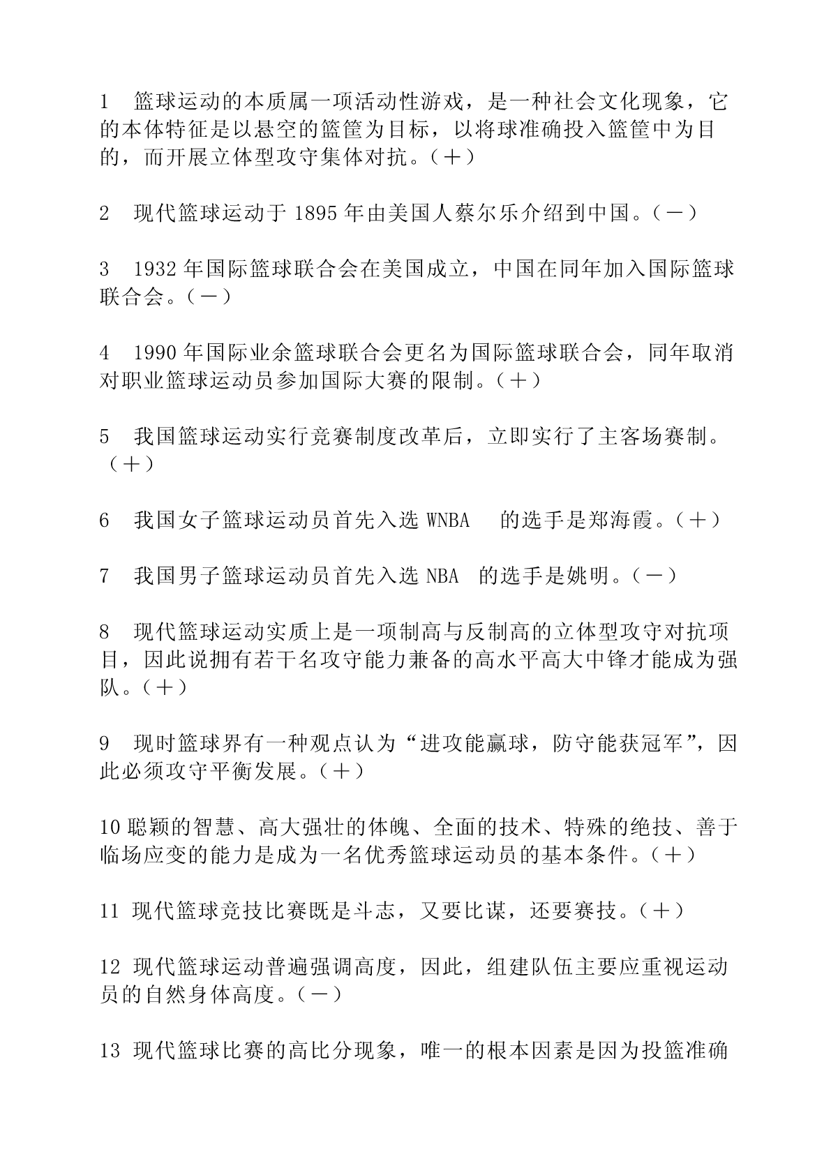 篮球理论考试复习一、单选题1.篮球运动(B)年起源于美国。是美国东部马萨诸塞州斯普林菲尔德市当时的青年基督教学体育教师詹姆仕.奈史密斯发明的。A1890B1891C1892D18932.急停是队员跑动中突然制动(B)的一种动作方法。A冲力B速度C力量D方向(C)年在瑞士的日内瓦成立了国际业余篮球联合会。A1976B1936C1932D19373.篮球运动最早传入我国天津的时间是(B)。A1894B1895C1897D18984.中国男子篮球队参加历届奥运会和世界锦标赛中最好成绩是(B)名。A7B8C9D105.进攻战术基础配合包括(C):A二三人半场进攻配合B传切配合、定位掩护配合、突破配合、策应配合C传切配合、掩护配合、突分配合、策应配合6.当对方加强内线进攻时,一般来说,本方应采用(B)防守:A半场扩大人盯人B半场缩小人盯人C混合防守7.当对方投中或罚中后,采用全场紧逼防守时,展开后场进攻的关键是(B):A运球快速突破B接应发球C快速落位和掩护8.现代篮球运动是由一位叫(A)的美国人先容到中国的。A来会里B蔡尔乐C马约翰9.中国男子篮球队参加历届奥运会和世界锦标赛中最好成绩是(B):A第7名B第8名C第9名10.中国女子篮球队参加历届奥运会和世界锦标赛中最好成绩是(A):A第2名B第3名C第4名11.中国篮球协会试行全国性的职业篮球联赛是在(A):A1995年CNBA联赛B1996年CBA职业联赛C1995年全国甲A联赛12.标准篮球场地的面积是(D)。A27米×14米B26米×13米C25米×14米D28米×15米13.变速跑是队员跑动中利用(A)的变换来争取主动的一种方法。A速度B强度C时间D位置14.后退跑是队员在球场上(C)前进方向的一种方法。A侧对B面对C背对D正对15.1936年第(B)届奥运会上,篮球运动被列为男子正式竞赛项目。A10B11C12D1316.行进间双手接球时,一般左(釉订脚上前接球后,釉定左)脚上步,左脚抬起在(B)出球。A落地后B落地前C腾空时17.半场人盯人防守时,对不持球的队员可采取的防守要求是(B)A盯人不盯球B人球兼顾C盯球不盯人18.全场紧逼盯人防守战术是与对方在(C)展开激烈的争夺。A后场B前场C全场19.篮球场内三个圈的半径都是(C)。A1.70米B2.00米C1.80米20.进攻队员在后场控制球后必须在(C)秒钟内使球进进前场。A3B5C821.3秒钟规则是当某队控制球时,同队队员在(B)停留不得超过3秒钟。A本方限制区B对方限制区C本方罚球区22.篮圈上沿距地面的高度是(A)。A3.05米B2.75米C2.90米23.转身时,重心移向中枢脚,移动脚的脚前掌蹬地跨出的同时,(B)向前或向后改变身体的方向。A中枢脚碾地及腰胯带动上体转动B中枢脚脚前掌为轴用力碾地,上体随着移动脚转动C中枢脚用全脚掌或脚后跟碾地,上体随着移动脚转动24.持球队员要根据同伴和防守队员的情况选择公道的传球位置。一般是球传到(C)的位置上,使之即可以避免对手的断球,又便于同伴接球后顺利地完成下一个进攻动作。A侧前方B侧后方C阔别防守一侧25.一般中、远间隔投篮时,大都是使球围绕横轴(C),这样易于加大球的飞行弧线,从而增大进射截面,有利于进步投篮命中率。A向前旋转B向侧旋转C向后旋转26.穿过配合是当进攻队员进行掩护时,防守掩护的对员应该主动向(B),让同伴及时从自己和掩护队员之间穿过往,继续防住自己的对手。A前跨一步B后撤一步C侧滑一步27.变向跑是在跑动中突然改变(A)来摆脱防守或堵截进攻的一种方法。A方向B速度C动作D力量28.(D)是篮球进攻中组成战术配合的纽带。A投篮B传球C运球D突破29.持球突破是持球队员运用(A)动作和运球技术快速超越对手的一项很强的攻击性技术。A脚步B手脚C基本动作D摆脱30.对正在3分区投篮的队员犯规,如未投中应(B)。A罚球两次B罚球三次C加罚一次D不罚球31.篮球战术基础配合是(D)有目的、有组织、协调行动的简单攻守配合方法。A一人之间B四人之间C四五人之间D两三人之间32.比赛中裁判员判场上队员或教练员技术犯规,则罚则是(D)。A掷界外球B一次罚球C两次罚球D两次罚球和一次掷界外球33.篮圈上沿距地面的高度是(C)。A2.90米B3.00米C3.05米D3.15米34.(D)是进攻队员背对或侧对球篮接球,以他为枢纽,与同伴密切相配合而形成的一种里应外合的配合方法。A传切配合B突分配合C掩护配合D策应配合36.篮球运动列为现代奥运会的正式项目是在(C)。A1928年B1932年C1936年37.新中国成立后,
