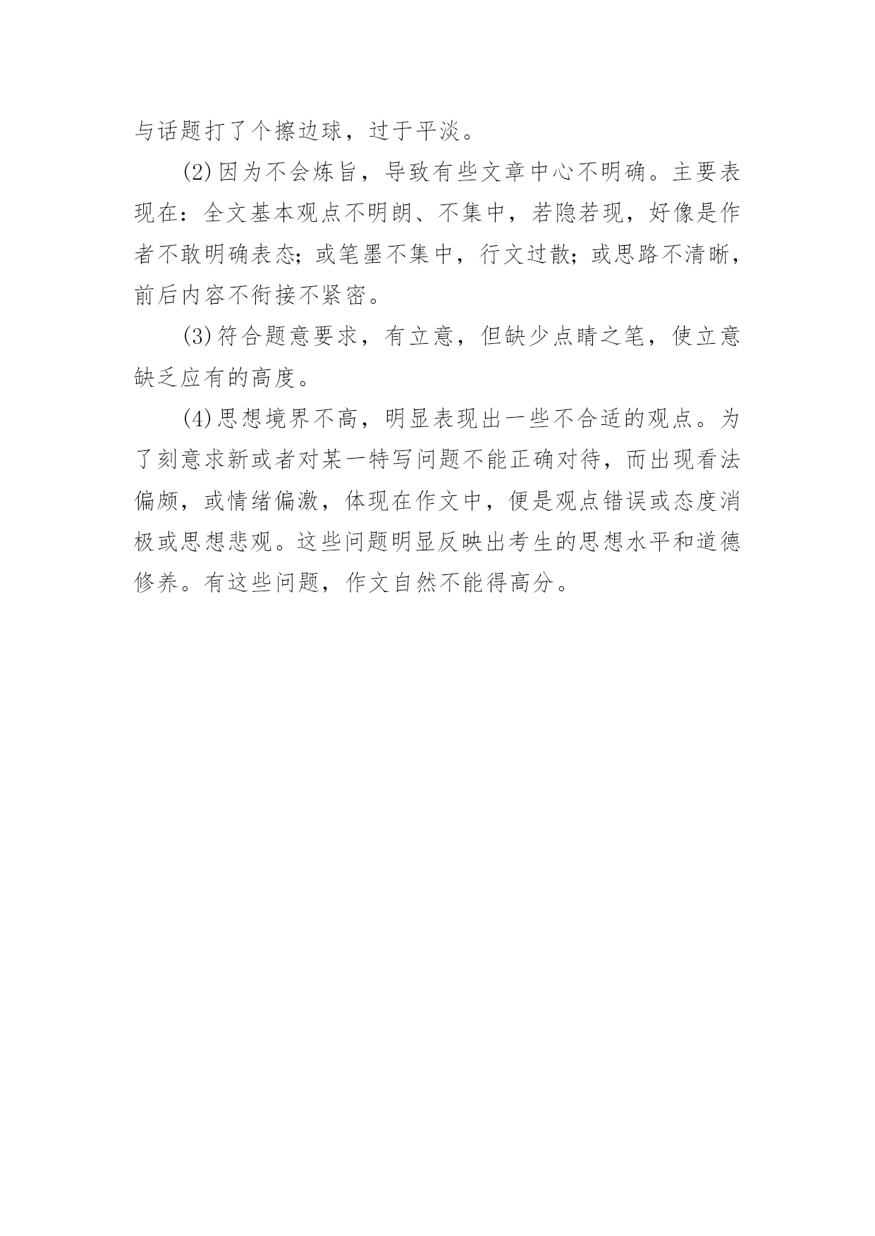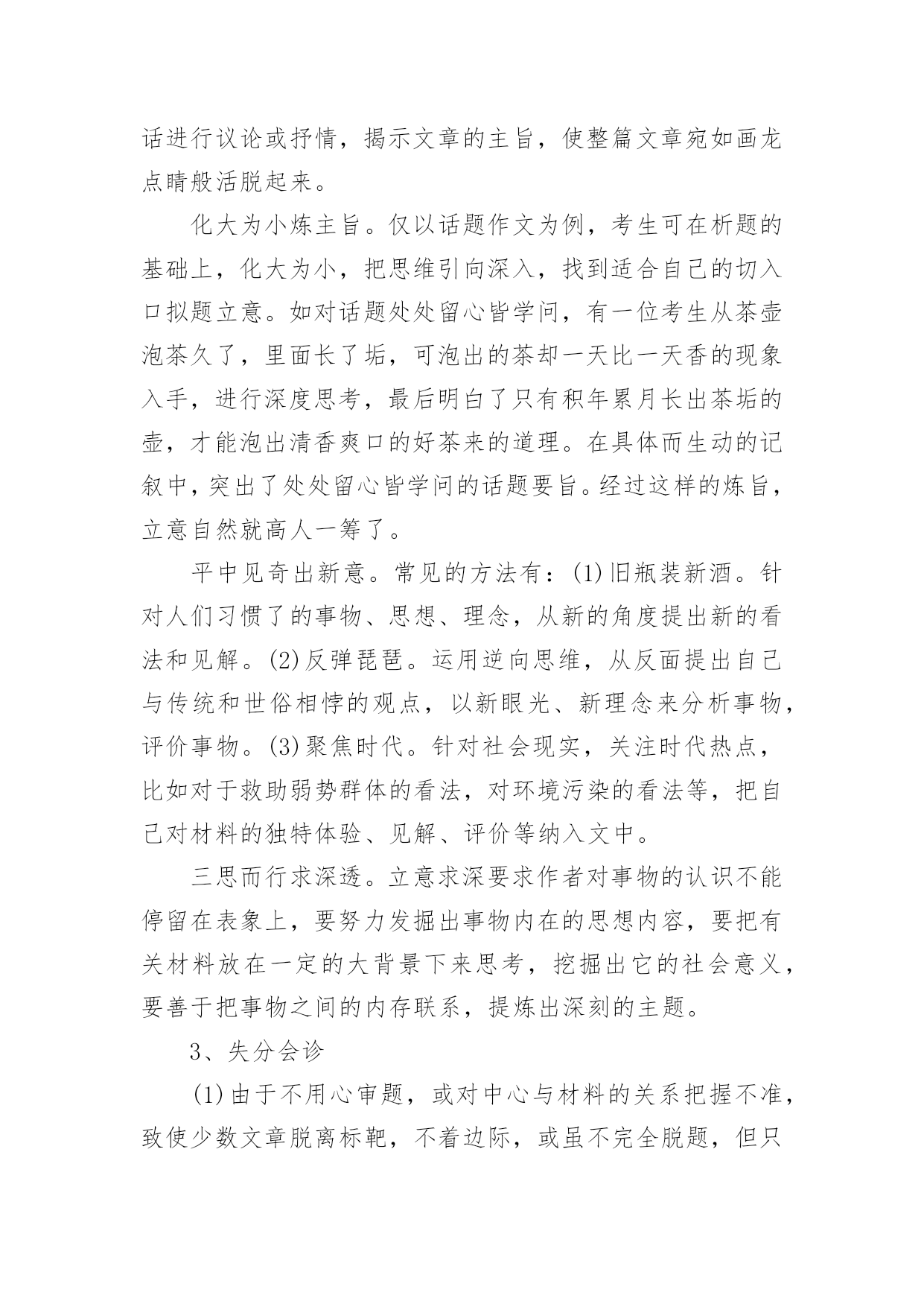 中考作文高分解密1、得分点概述我们不论写什么文章,在下笔之前,总要先考虑写什么内容,体现什么思想。这个过程,就是提炼主题的过程,古人称之为立意。在历年的中考作文评卷过程中,立意一直是阅卷老师关注的焦点。意立得如何,是否突出、有深度,可直接关系到文章的成败和作文的成绩。综观全国各地的中考作文评分标准,无一不将立意明确,中心突出这一要求作为其重要的评判标准,而且它在各地作文评改中所占的分值比重普遍较大,如安徽省,以本项得分点为主的内容一项竟占了全部分值的54。5%;潍坊市占了50%;北京市、上海市、河北省的本项得分点与选材,合占全卷的40%。由此观之,立意鲜明、新颖、深刻,乃是考场作文成功的关键。2、得分点策略如何达到上面所说的鲜明、新颖、深刻呢?我们不妨采用以下方法与技巧。明题依体凸中心。首先要正确理解题意;其次依据文体明了中心。以写记叙文为例,可抓住记叙的线索,诸如景、物、人、事、思想感情等,这是做到立意明确的先决条件;三要精心选择能表达文章中心的材料,若材料与中心联系不紧,就影响中心的明确;四是在文章的关键地方,用一两句话进行议论或抒情,揭示文章的主旨,使整篇文章宛如画龙点睛般活脱起来。化大为小炼主旨。仅以话题作文为例,考生可在析题的基础上,化大为小,把思维引向深入,找到适合自己的切入口拟题立意。如对话题处处留心皆学问,有一位考生从茶壶泡茶久了,里面长了垢,可泡出的茶却一天比一天香的现象入手,进行深度思考,最后明白了只有积年累月长出茶垢的壶,才能泡出清香爽口的好茶来的道理。在具体而生动的记叙中,突出了处处留心皆学问的话题要旨。经过这样的炼旨,立意自然就高人一筹了。平中见奇出新意。常见的方法有:(1)旧瓶装新酒。针对人们习惯了的事物、思想、理念,从新的角度提出新的看法和见解。(2)反弹琵琶。运用逆向思维,从反面提出自己与传统和世俗相悖的观点,以新眼光、新理念来分析事物,评价事物。(3)聚焦时代。针对社会现实,关注时代热点,比如对于救助弱势群体的看法,对环境污染的看法等,把自己对材料的独特体验、见解、评价等纳入文中。三思而行求深透。立意求深要求作者对事物的认识不能停留在表象上,要努力发掘出事物内在的思想内容,要把有关材料放在一定的大背景下来思考,挖掘出它的社会意义,要善于把事物之间的内存联系,提炼出深刻的主题。3、失分会诊(1)由于不用心审题,或对中心与材料的关系把握不准,致使少数文章脱离标靶,不着边际,或虽不完全脱题,但只与话题打了个擦边球,过于平淡。(2)因为不会炼旨,导致有些文章中心不明确。主要表现在:全文基本观点不明朗、不集中,若隐若现,好像是作者不敢明确表态;或笔墨不集中,行文过散;或思路不清晰,前后内容不衔接不紧密。(3)符合题意要求,有立意,但缺少点睛之笔,使立意缺乏应有的高度。(4)思想境界不高,明显表现出一些不合适的观点。为了刻意求新或者对某一特写问题不能正确对待,而出现看法偏颇,或情绪偏激,体现在作文中,便是观点错误或态度消极或思想悲观。这些问题明显反映出考生的思想水平和道德修养。有这些问题,作文自然不能得高分。