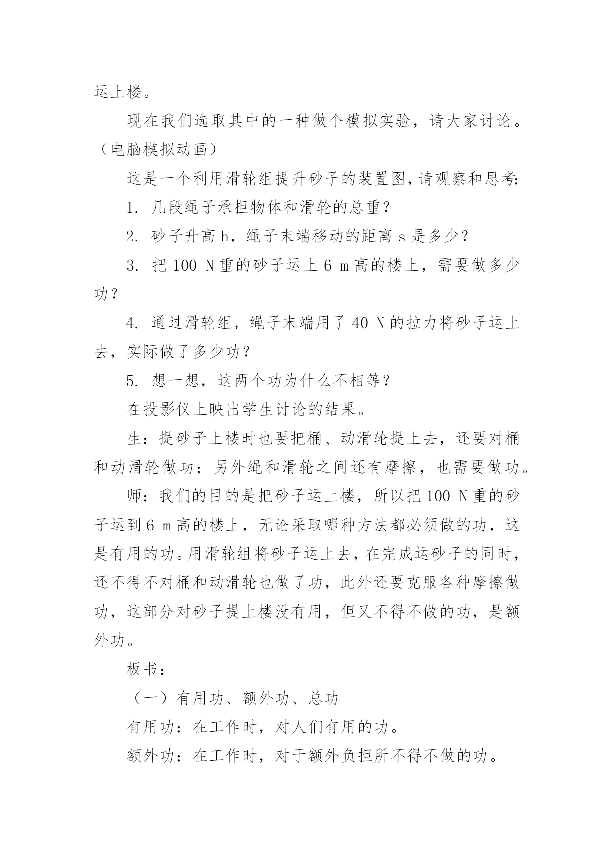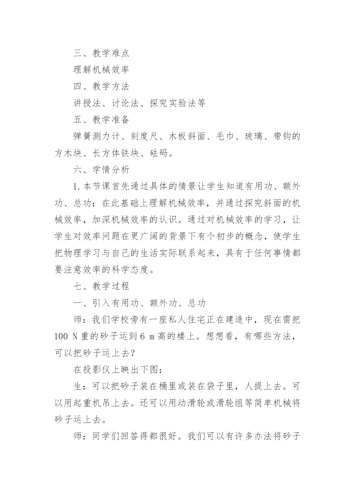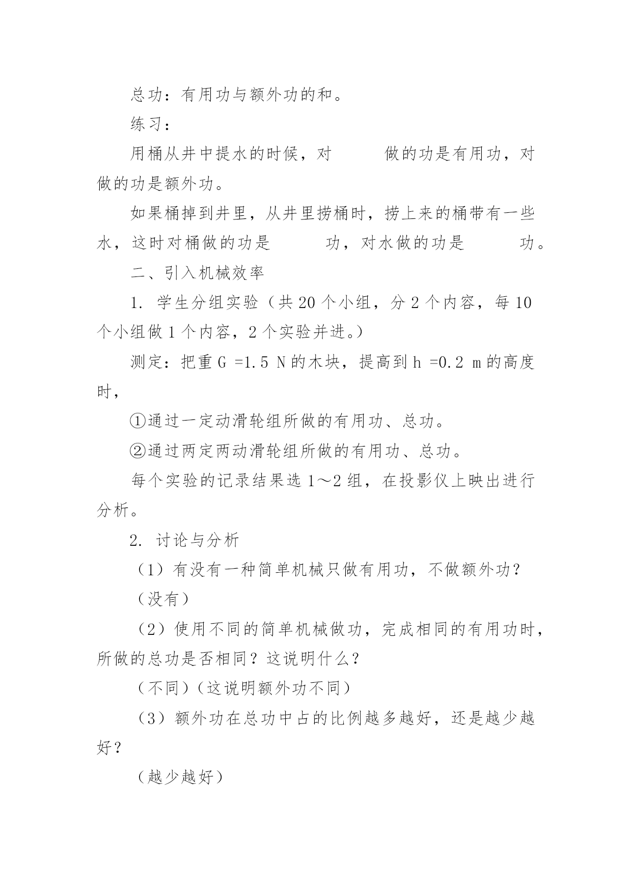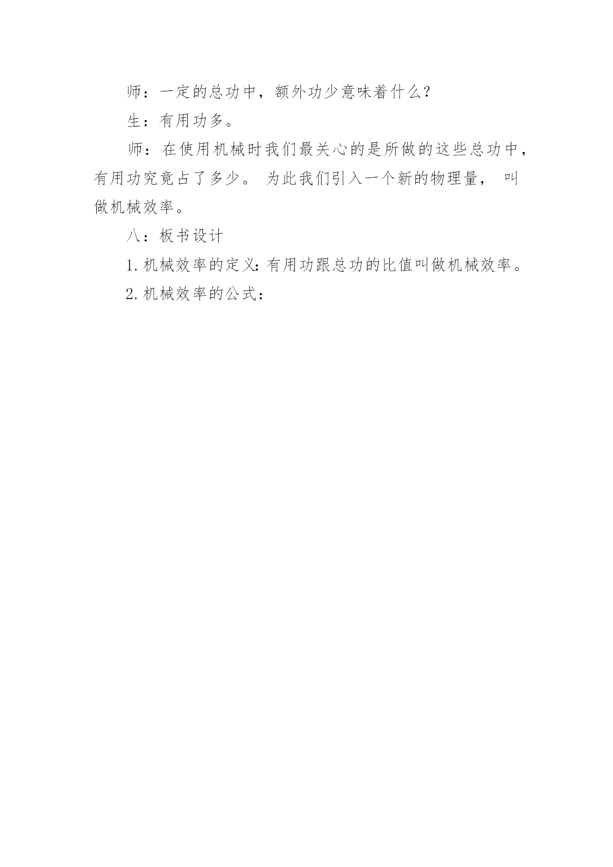 《机械效率》教学设计《机械效率》教学设计一、教学目标(一)、知识与技能1.知道利用斜面拉物体时,有用功与总功的计算方法,会计算斜面的机械效率。2.会测定斜面的机械效率,并会运用控制变量法的实验方法进行探究实验。3.知道提高机械效率的意义和主要方法。(二)、过程与方法1.从生活实际出发培养探究物理学的有关知识的兴趣以及深入认识事物的能力。2.亲身经历测量斜面机械效率的过程,通过参与探究影响斜面的机械效率因素的活动,学习拟定简单的科学探究计划和实验方案,并培养自主合作探究的能力。(三)、情感态度与价值观1.让学生学会关注生产、生活中各种机械的机械效率,具有用机械效率来评价机械的意识。2.通过探究活动,进行充分的交流与合作,培养学生严谨求实的科学态度和团结协作的科学精神。二、教学重点1.理解机构效率2.探究斜面的机械效率三、教学难点理解机械效率四、教学方法讲授法、讨论法、探究实验法等五、教学准备弹簧测力计、刻度尺、木板斜面、毛巾、玻璃、带钩的方木块、长方体铁块、砝码。六、学情分析1.本节课首先通过具体的情景让学生知道有用功、额外功、总功;在此基础上理解机械效率,并通过探究斜面的机械效率,加深机械效率的认识。通过对机械效率的学习,让学生对效率问题在更广阔的背景下有个初步的概念,使学生把物理学习与自己的生活实际联系起来,具有于任何事情都要注意效率的科学态度。七、教学过程一、引入有用功、额外功、总功师:我们学校旁有一座私人住宅正在建造中,现在需把100N重的砂子运到6m高的楼上。想想看,有哪些方法,可以把砂子运上去?在投影仪上映出下图:生:可以把砂子装在桶里或装在袋子里,人提上去。可以用起重机吊上去。还可以用动滑轮或滑轮组等简单机械将砂子运上去。师:同学们回答得都很好。我们可以有许多办法将砂子运上楼。现在我们选取其中的一种做个模拟实验,请大家讨论。(电脑模拟动画)这是一个利用滑轮组提升砂子的装置图,请观察和思考:1.几段绳子承担物体和滑轮的总重?2.砂子升高h,绳子末端移动的距离s是多少?3.把100N重的砂子运上6m高的楼上,需要做多少功?4.通过滑轮组,绳子末端用了40N的拉力将砂子运上去,实际做了多少功?5.想一想,这两个功为什么不相等?在投影仪上映出学生讨论的结果。生:提砂子上楼时也要把桶、动滑轮提上去,还要对桶和动滑轮做功;另外绳和滑轮之间还有摩擦,也需要做功。师:我们的目的是把砂子运上楼,所以把100N重的砂子运到6m高的楼上,无论采取哪种方法都必须做的功,这是有用的功。用滑轮组将砂子运上去,在完成运砂子的同时,还不得不对桶和动滑轮也做了功,此外还要克服各种摩擦做功,这部分对砂子提上楼没有用,但又不得不做的功,是额外功。板书:(一)有用功、额外功、总功有用功:在工作时,对人们有用的功。额外功:在工作时,对于额外负担所不得不做的功。总功:有用功与额外功的和。练习:用桶从井中提水的时候,对做的功是有用功,对做的功是额外功。如果桶掉到井里,从井里捞桶时,捞上来的桶带有一些水,这时对桶做的功是功,对水做的功是功。二、引入机械效率1.学生分组实验(共20个小组,分2个内容,每10个小组做1个内容,2个实验并进。)测定:把重G=1.5N的木块,提高到h=0.2m的高度时,①通过一定动滑轮组所做的有用功、总功。②通过两定两动滑轮组所做的有用功、总功。每个实验的记录结果选1~2组,在投影仪上映出进行分析。2.讨论与分析(1)有没有一种简单机械只做有用功,不做额外功?(没有)(2)使用不同的简单机械做功,完成相同的有用功时,所做的总功是否相同?这说明什么?(不同)(这说明额外功不同)(3)额外功在总功中占的比例越多越好,还是越少越好?(越少越好)师:一定的总功中,额外功少意味着什么?生:有用功多。师:在使用机械时我们最关心的是所做的这些总功中,有用功究竟占了多少。为此我们引入一个新的物理量,叫做机械效率。八:板书设计1.机械效率的定义:有用功跟总功的比值叫做机械效率。2.机械效率的公式: