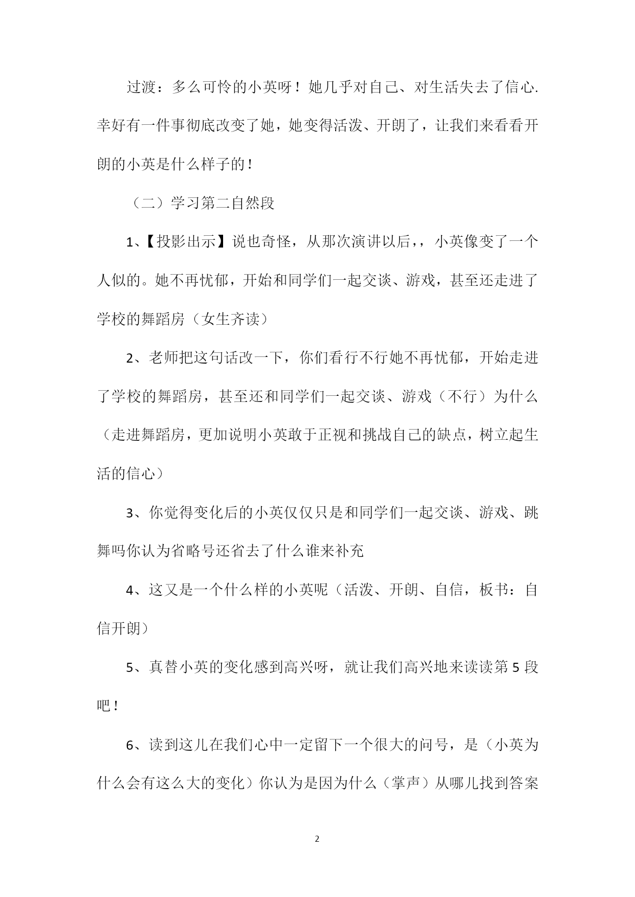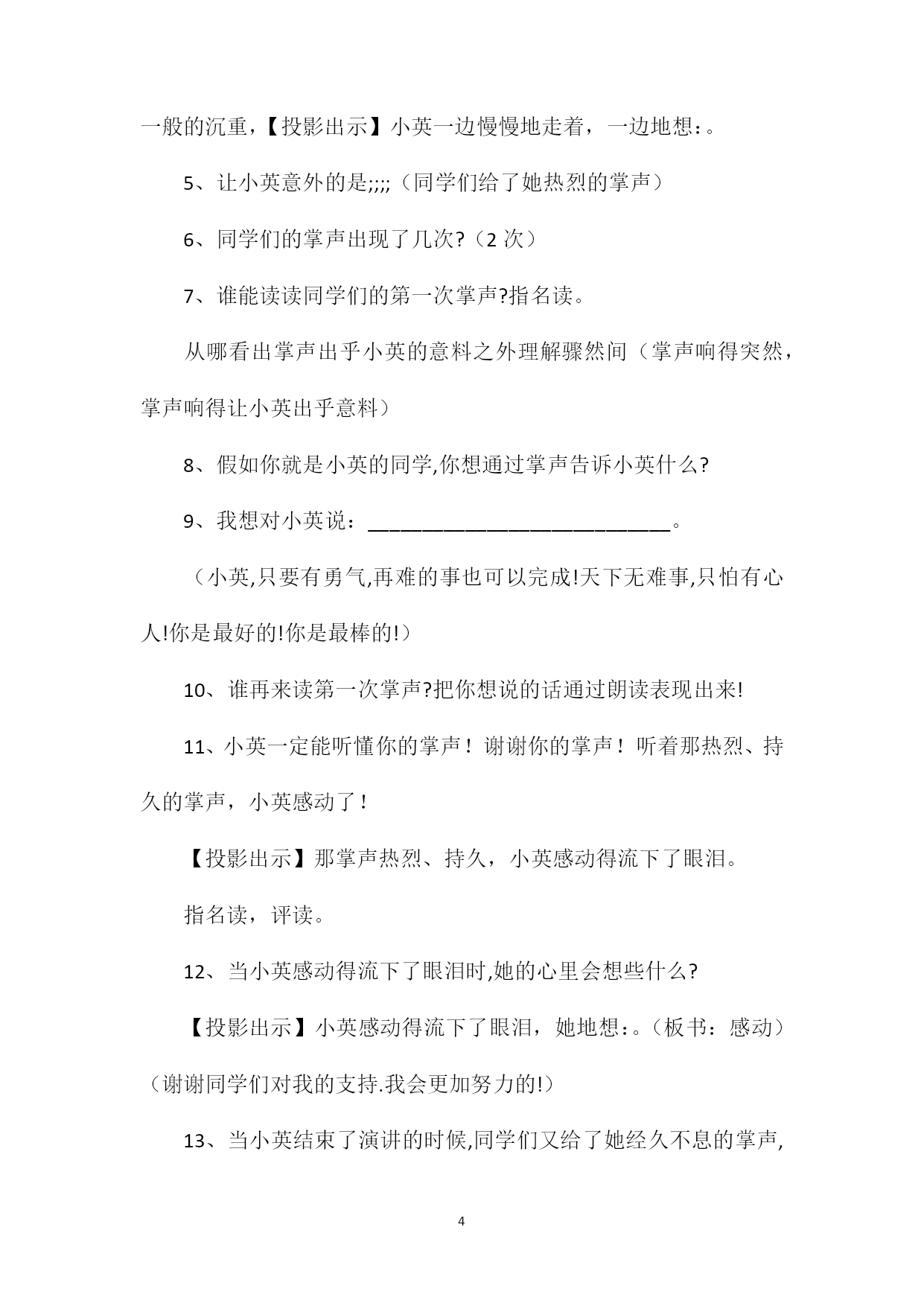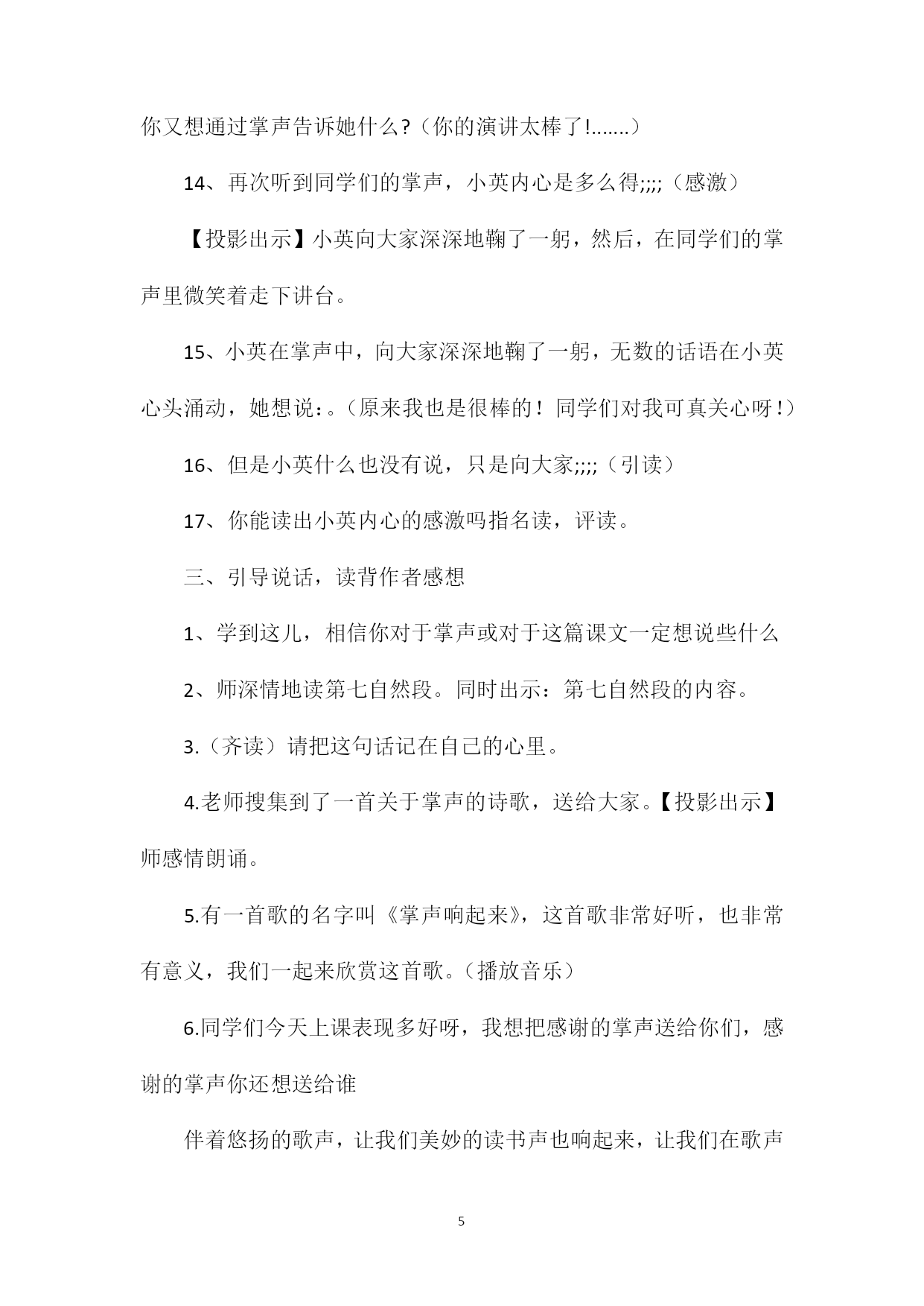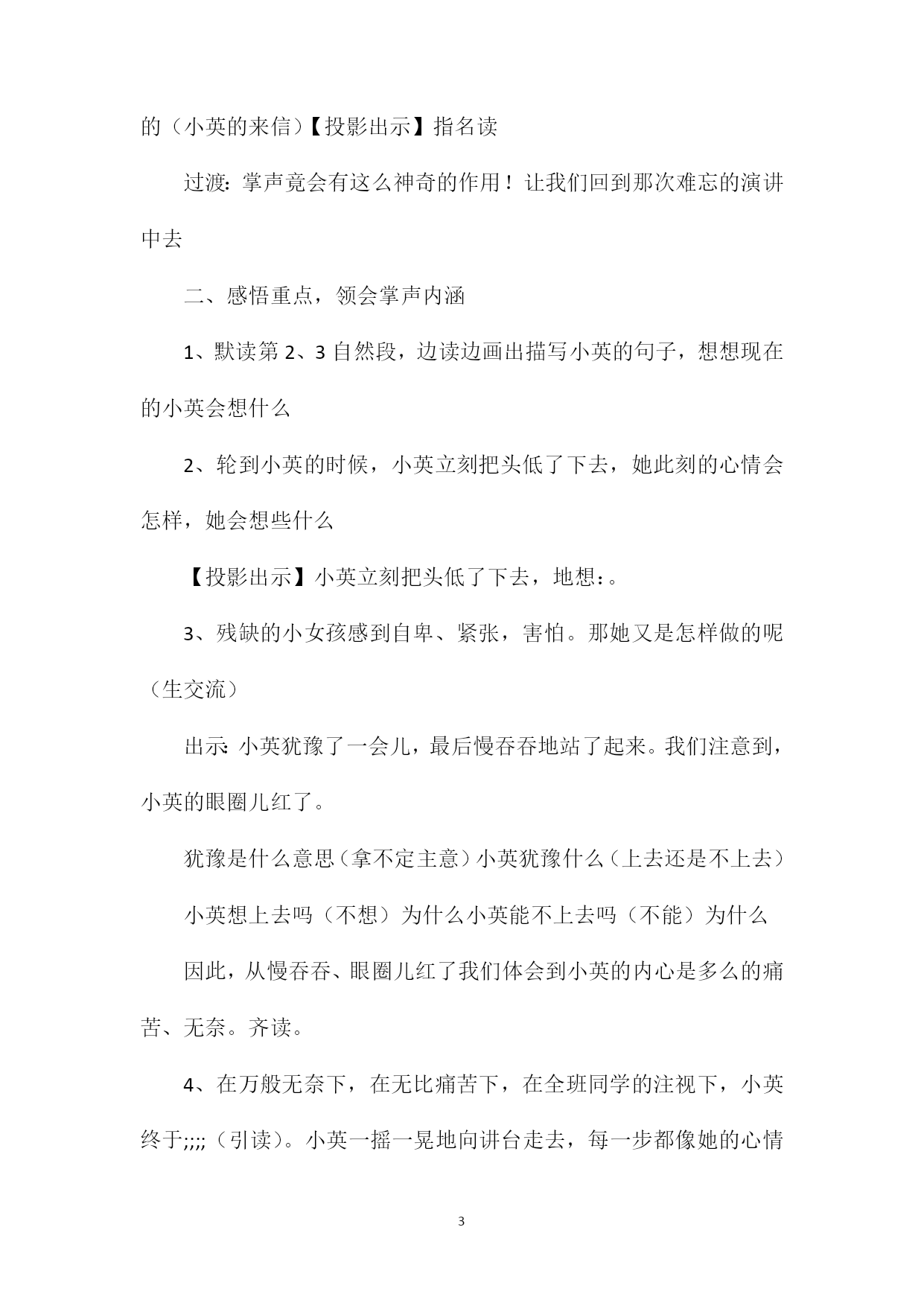 PAGEPAGE6《掌声》教学设计(2)一、前后对照,感受小英变化(一)学习第一自然段1、这节课我们继续学习《掌声》这篇课文。这篇课文主要写的是谁吗(小英)2、一开始,小英给你留下什么样的印象【投影出示】指名读课文第一自然段。我们读出了什么样的小英(自卑、忧郁、孤单、沉默,板书:自卑忧郁)从哪看出小英很忧郁3、是什么原因让小英总是默默地坐在教室的一角(用因为所以的句式说)4、那时的小英内心一定十分地痛苦、忧伤、寂寞。当小英默默地坐在教室一角时,她心里会想些什么【投影出示】她总是默默地坐在教室的一角,地想:。5、小英忧郁、自卑、沉默的样子,你能读出来吗指名读,把小英的心情读出来。评读。让我们一起走近忧郁的小英,齐读第一自然段。过渡:多么可怜的小英呀!她几乎对自己、对生活失去了信心.幸好有一件事彻底改变了她,她变得活泼、开朗了,让我们来看看开朗的小英是什么样子的!(二)学习第二自然段1、【投影出示】说也奇怪,从那次演讲以后,,小英像变了一个人似的。她不再忧郁,开始和同学们一起交谈、游戏,甚至还走进了学校的舞蹈房(女生齐读)2、老师把这句话改一下,你们看行不行她不再忧郁,开始走进了学校的舞蹈房,甚至还和同学们一起交谈、游戏(不行)为什么(走进舞蹈房,更加说明小英敢于正视和挑战自己的缺点,树立起生活的信心)3、你觉得变化后的小英仅仅只是和同学们一起交谈、游戏、跳舞吗你认为省略号还省去了什么谁来补充4、这又是一个什么样的小英呢(活泼、开朗、自信,板书:自信开朗)5、真替小英的变化感到高兴呀,就让我们高兴地来读读第5段吧!6、读到这儿在我们心中一定留下一个很大的问号,是(小英为什么会有这么大的变化)你认为是因为什么(掌声)从哪儿找到答案的(小英的来信)【投影出示】指名读过渡:掌声竟会有这么神奇的作用!让我们回到那次难忘的演讲中去二、感悟重点,领会掌声内涵1、默读第2、3自然段,边读边画出描写小英的句子,想想现在的小英会想什么2、轮到小英的时候,小英立刻把头低了下去,她此刻的心情会怎样,她会想些什么【投影出示】小英立刻把头低了下去,地想:。3、残缺的小女孩感到自卑、紧张,害怕。那她又是怎样做的呢(生交流)出示:小英犹豫了一会儿,最后慢吞吞地站了起来。我们注意到,小英的眼圈儿红了。犹豫是什么意思(拿不定主意)小英犹豫什么(上去还是不上去)小英想上去吗(不想)为什么小英能不上去吗(不能)为什么因此,从慢吞吞、眼圈儿红了我们体会到小英的内心是多么的痛苦、无奈。齐读。4、在万般无奈下,在无比痛苦下,在全班同学的注视下,小英终于;;;;(引读)。小英一摇一晃地向讲台走去,每一步都像她的心情一般的沉重,【投影出示】小英一边慢慢地走着,一边地想:。5、让小英意外的是;;;;(同学们给了她热烈的掌声)6、同学们的掌声出现了几次?(2次)7、谁能读读同学们的第一次掌声?指名读。从哪看出掌声出乎小英的意料之外理解骤然间(掌声响得突然,掌声响得让小英出乎意料)8、假如你就是小英的同学,你想通过掌声告诉小英什么?9、我想对小英说:____________________________。(小英,只要有勇气,再难的事也可以完成!天下无难事,只怕有心人!你是最好的!你是最棒的!)10、谁再来读第一次掌声?把你想说的话通过朗读表现出来!11、小英一定能听懂你的掌声!谢谢你的掌声!听着那热烈、持久的掌声,小英感动了!【投影出示】那掌声热烈、持久,小英感动得流下了眼泪。指名读,评读。12、当小英感动得流下了眼泪时,她的心里会想些什么?【投影出示】小英感动得流下了眼泪,她地想:。(板书:感动)(谢谢同学们对我的支持.我会更加努力的!)13、当小英结束了演讲的时候,同学们又给了她经久不息的掌声,你又想通过掌声告诉她什么?(你的演讲太棒了!.......)14、再次听到同学们的掌声,小英内心是多么得;;;;(感激)【投影出示】小英向大家深深地鞠了一躬,然后,在同学们的掌声里微笑着走下讲台。15、小英在掌声中,向大家深深地鞠了一躬,无数的话语在小英心头涌动,她想说:。(原来我也是很棒的!同学们对我可真关心呀!)16、但是小英什么也没有说,只是向大家;;;;(引读)17、你能读出小英内心的感激吗指名读,评读。三、引导说话,读背作者感想1、学到这儿,相信你对于掌声或对于这篇课文一定想说些什么2、师深情地读第七自然段。同时出示:第七自然段的内容。3.(齐读)请把这句话记在自己的心里。4.老师搜集到了一首关于掌声的诗歌,送给大家。【投影出示】师感情朗诵。5.有一首歌的名字叫《掌声响起来》,这首歌非常好听,也非常有意义,我们一起来欣赏这首歌。(播放音乐)