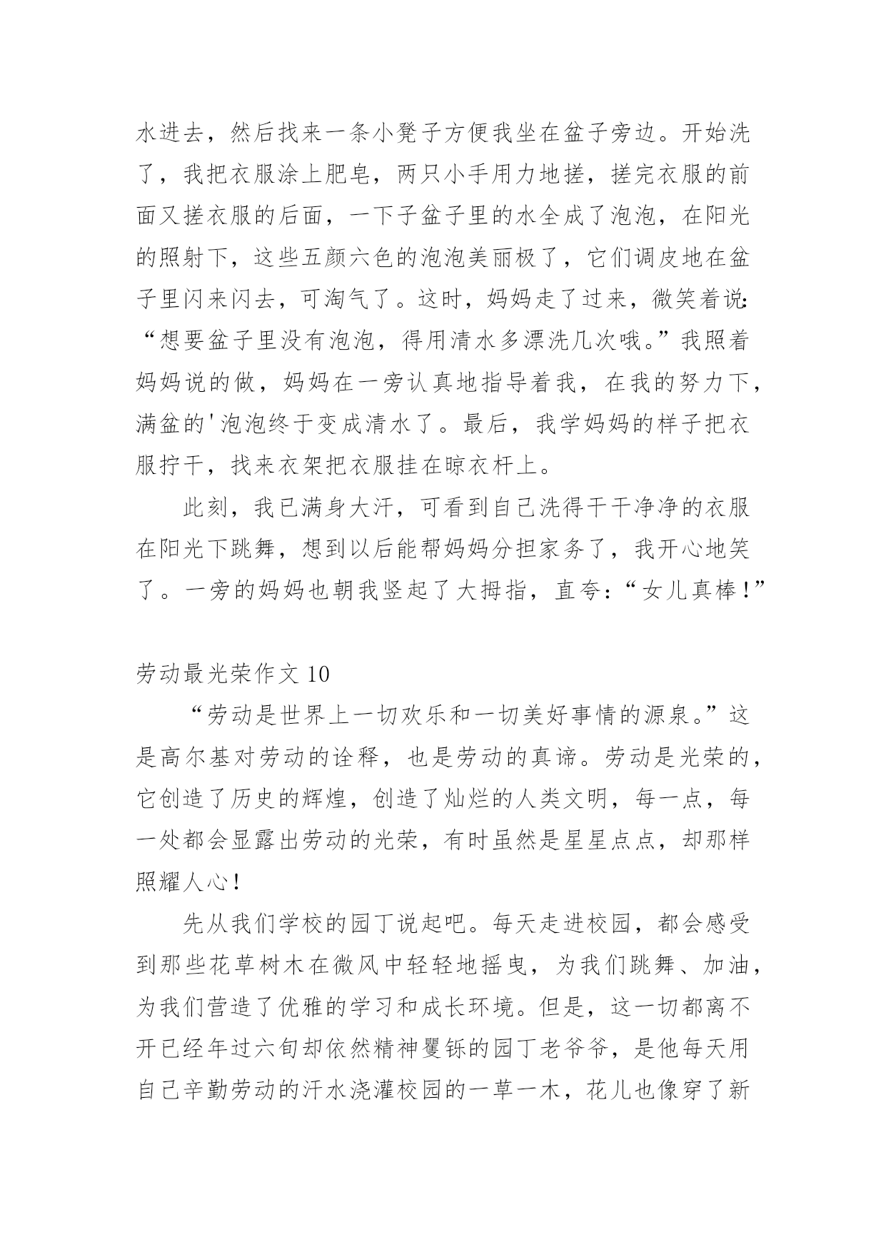 劳动最光荣作文劳动最光荣作文(合集)无论在学习、工作或是生活中,大家都写过作文,肯定对各类作文都很熟悉吧,作文是通过文字来表达一个主题意义的记叙方法。怎么写作文才能避免踩雷呢?下面是小编收集整理的劳动最光荣作文,欢迎阅读,希望大家能够喜欢。劳动最光荣作文1那天老师给我们布置了一个作业:给家长做一次饭。早上我一大早起来买菜,买了:青菜、五花肉、鸡蛋、萝卜、四季豆等等。我开始洗菜,妈妈说过:要用水把菜先洗干净。我先把萝卜洗干净后,拿出我的铅笔神器——切皮刀。我切啊切,切完之后发现我的萝卜不是我买回来的圆柱形,而是变成了长方体。我深刻反思原来我用刀的.力度太大了,所以才会这样。中午,我开始做饭,我先把抽油烟机开起,然后我把油和肉放入锅里,把青菜也放入窝锅里,炒啊!炒啊!全身上下大汗淋淋。这一刻,我终于体会到爸爸妈妈的不容易。然后开始炒萝卜、四季豆。我一边炒一边想:我做的菜好不好吃呢?爸爸妈妈喜不喜欢吃嘛?放油、放盐,都要适量。这一次作业,让我记忆非常深刻。每一滴油盐都是父母辛辛苦苦赚来的,很不容易,我们都要珍惜。劳动最光荣作文2今天,我和奶奶、大伯一大早就起床了。因为我们要去挖贝母。我们准备好锄头、袋子和篮子就出发了,走了一会儿就到了。我们拿出锄头和篮子,就开始挖。我慢慢吞吞地挖着,可奶奶和大伯速度快得令我难以相信。我就照着他们的速度挖着,可挖一下就有许多贝母裂开。奶奶见我的情形,就细心教导我,说要从边缘挖进来,贝母才不会破。我以为奶奶会骂我,可奶奶的.仁慈使我感动。过了十几分钟,我就把一行贝母挖完了。一个上午很快就过去了。吃过午饭,我们又出发了。我又慢吞吞地挖着,真想躺下来晒太阳,可不行啊,泥土这么脏,更何况,我的任务还没完成。我又开始挖了,撇头看了一下奶奶,她已经远远超过我了。我就马上紧追不舍,终于追上了。我又开始慢慢地挖。突然,我看见了一条什么东西在动,就用锄头挖开了泥土,不看不知道,一看吓一跳,是一条十几厘米长的蚯蚓。我就马上用锄头把蚯蚓钩了起来,甩了出去。又开始挖了,我们大汗淋漓,经过我们的辛勤劳动,终于把贝母挖完了。虽然今天很累,但是劳动是最光荣的。劳动最光荣作文3以前,我一直都不想去劳动,可是自从我来到英华小学,就没有人能阻挡我去劳动了。原来我在家的时候,我除了写作业就是玩,感觉太无聊了,我在家我妈一叫我打扫,我就赶紧跑,就算给我买好吃的、好喝的,我也不愿意打扫,我以前连扫把都不摸一下的然后我妈就让我去英华小学上,在英华小学上两周后,老师就让我打扫卫生区了,我本来是不愿意的.,可我还是去了,我拿扫把一扫,感觉很有意思,于是我就开始扫了起来,扫了几天以后,我生病了,然后老师让我去拿药,我上次,我吃饭的时候,我不小心吐了,然后老师让别人帮我刷盆,让我回教室喝水,可是我回教室就想:“不行,我要去劳动,于是我就戴上手套,拿着簸萁、扫把就去了,我一到那里,就像机器人干活似的,我三两下就扫完了,然后倒进垃圾池里面了,之后完了以后,我在回教室的路上,我感觉自己很快乐。我明白了一个道理:你如果自己一直劳动的话,你自己也能收获一份快乐。我喜欢劳动。因为劳动使我的生活变得更美好了。劳动最光荣作文4劳动创造人,劳动创造历史,劳动创造光辉灿烂的人类文明!在每一脚,每一处都会显露出劳动的珍贵,有时虽是星星点点,却那样照耀人心!随着春天里的萧萧细雨,伴着春姑娘带来的柔柔轻风,我走到泥泞不堪的小路上。瞧,那不是已经年过六旬的`老爷爷吗?他在那里干什么呢?原来他正在用心地为春姑娘添色彩,他不是满怀仇绪地恨春天的到来,给他增添沉重的担子,而是,辛勤的工作,脸上不时露出满足的笑容!走过了那一条泥泞的小路,就是一片绿油油的稻田,那稻田里有着人民的希望,充满着勃勃的朝气!一队农民夫妇正在辛劳地工作着,正在努力地走进自己未来的憧憬里!你看啊,这些人都是默默地耕耘着。这一点一滴的努力,在别人的眼里或许是一件微不足道的小事,可是在我们生活中却是一颗颗流光溢彩的珍珠。劳动最光荣!劳动最光荣作文5今天我帮妈妈洗了一双鞋子,原来都是妈妈洗,现在我想来洗。先把鞋子放进有水的盆里、再用刷子把鞋面刷上一层雪白的泡沫、然后拿刷子把鞋内给刷干净,最后把鞋帮和鞋底刷得白一些。把水倒了,再换一盆干净的水,洗另一只鞋······洗完鞋子,放到卫生间里晾干,再放到阳台晒。我感觉洗鞋子很累,妈妈每天给我们一家人干活特别辛苦。劳动真是最光荣!感恩劳动者一份耕耘,一份收获,转眼又到了丰收时节,我们又能吃到好吃的水果,还有庄稻,但是这些东西是怎么来的呢?是我们无私播种者。十月,秋风瑟瑟,苹果害羞的.红了脸,枣儿红了一圈,石榴咧开了嘴,就连玉米都换了新外衣,走进稻田,放眼望去,金黄的一片,仿佛大地穿上了金色的外衣,这些都是在告诉我们,秋天来啦!吃水不忘挖井人在这些硕实累累的背后都是我们伟大劳动