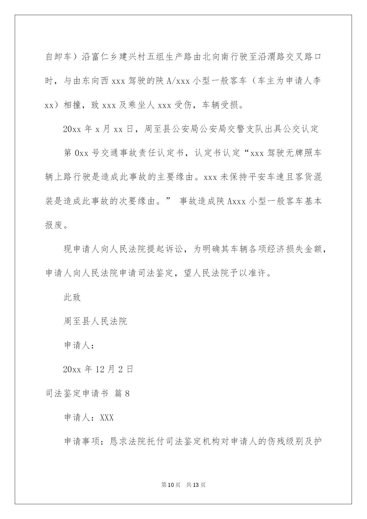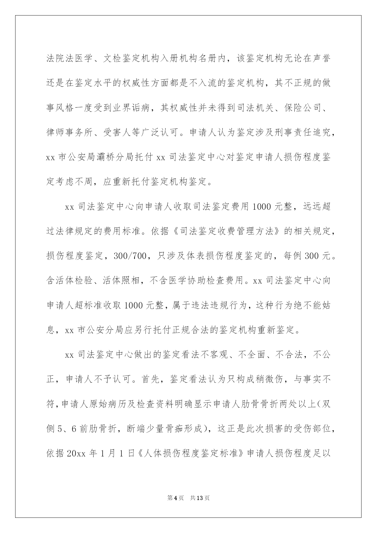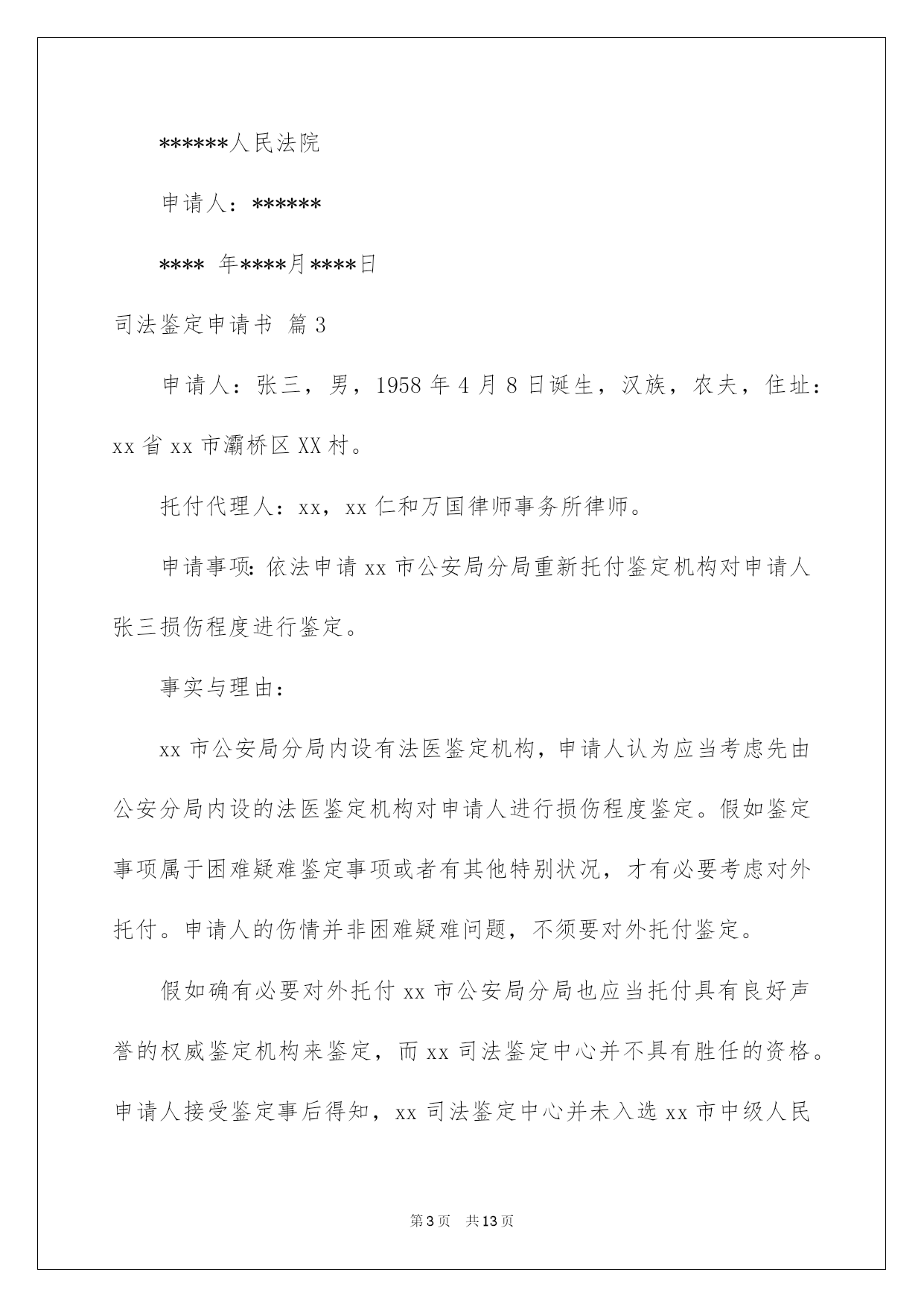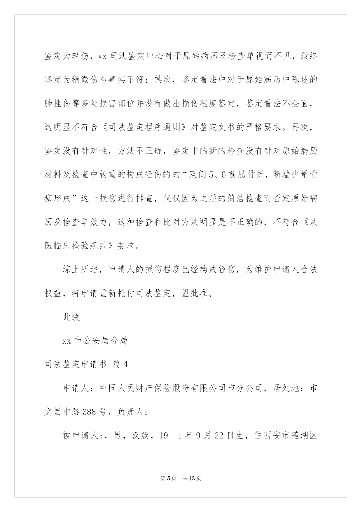 第PAGE\*Arabic\*MERGEFORMAT13页共NUMPAGES\*Arabic\*MERGEFORMAT13页第PAGE\*MERGEFORMAT13页共NUMPAGES\*MERGEFORMAT13页第PAGE\*MERGEFORMAT13页共NUMPAGES\*MERGEFORMAT13页第PAGE\*MERGEFORMAT13页共NUMPAGES\*MERGEFORMAT13页第PAGE\*MERGEFORMAT13页共NUMPAGES\*MERGEFORMAT13页第PAGE\*MERGEFORMAT13页共NUMPAGES\*MERGEFORMAT13页第PAGE\*MERGEFORMAT13页共NUMPAGES\*MERGEFORMAT13页第PAGE\*MERGEFORMAT13页共NUMPAGES\*MERGEFORMAT13页第PAGE\*MERGEFORMAT13页共NUMPAGES\*MERGEFORMAT13页第PAGE\*MERGEFORMAT13页共NUMPAGES\*MERGEFORMAT13页第PAGE\*MERGEFORMAT13页共NUMPAGES\*MERGEFORMAT13页2022司法鉴定申请书司法鉴定申请书汇总十篇在人们物质精神需求不断增长的今日,许多事项都须要运用申请书,不同的运用场景有不同的申请书。为了让您不再为写申请书头疼,以下是我帮大家整理的司法鉴定申请书10篇,仅供参考,欢迎大家阅读。司法鉴定申请书篇1申请人:某某省某某市第十建筑工程有限公司济南分公司负责人:何某某,职务:经理地址:济南市经十西路宋园新区申请事项恳求法院依法托付相关司法鉴定机构,依法对本案所涉两张借条的真伪进行鉴定;依法对两张借条上公章、私人章的加盖时间进行鉴定;依法对两张借条打印文字的时间及与加盖印章的时间先后依次进行鉴定。申请理由原告彭某某诉申请人民间借贷纠纷一案,已经贵院立案审理,本案原告彭某某用于起诉的证据是两张借条,但是,申请人从未向彭某某借过款,该两张借条存在明显的瑕疵,是彭某某利用驾驭公司印章的便利条件伪造的,该两张借条不能作为法院认定案件事实的证据。所以,申请人特依法提出鉴定申请,恳求贵院依法托付相关司法鉴定机构对本案所涉两张借条的真实性进行鉴定,以便于法院查清案件事实,作出公正的判决。此致济南市槐荫区人民法院申请人司法鉴定申请书篇2申请人:******住址:******恳求事项:恳求人民法院依法指定司法鉴定机构对申请人的******进行鉴定。事实和理由:******************************************此致******人民法院申请人:**********年****月****日司法鉴定申请书篇3申请人:张三,男,1958年4月8日诞生,汉族,农夫,住址:xx省xx市灞桥区XX村。托付代理人:xx,xx仁和万国律师事务所律师。申请事项:依法申请xx市公安局分局重新托付鉴定机构对申请人张三损伤程度进行鉴定。事实与理由:xx市公安局分局内设有法医鉴定机构,申请人认为应当考虑先由公安分局内设的法医鉴定机构对申请人进行损伤程度鉴定。假如鉴定事项属于困难疑难鉴定事项或者有其他特别状况,才有必要考虑对外托付。申请人的伤情并非困难疑难问题,不须要对外托付鉴定。假如确有必要对外托付xx市公安局分局也应当托付具有良好声誉的权威鉴定机构来鉴定,而xx司法鉴定中心并不具有胜任的资格。申请人接受鉴定事后得知,xx司法鉴定中心并未入选xx市中级人民法院法医学、文检鉴定机构入册机构名册内,该鉴定机构无论在声誉还是在鉴定水平的权威性方面都是不入流的鉴定机构,其不正规的做事风格一度受到业界诟病,其权威性并未得到司法机关、保险公司、律师事务所、受害人等广泛认可。申请人认为鉴定涉及刑事责任追究,xx市公安局灞桥分局托付xx司法鉴定中心对鉴定申请人损伤程度鉴定考虑不周,应重新托付鉴定机构鉴定。xx司法鉴定中心向申请人收取司法鉴定费用1000元整,远远超过法律规定的费用标准。依据《司法鉴定收费管理方法》的相关规定,损伤程度鉴定,300/700,只涉及体表损伤程度鉴定的,每例300元。含活体检验、活体照相,不含医学协助检查费用。xx司法鉴定中心向申请人超标准收取1000元整,属于违法违规行为,这种行为绝不能姑息,xx市公安分局应另行托付正规合法的鉴定机构重新鉴定。xx司法鉴定中心做出的鉴定看法不客观、不全面、不合法,不公正,申请人不予认可。首先,鉴定看法认为只构成稍微伤,与事实不符,申请人原始病历及检查资料明确显示申请人肋骨骨折两处