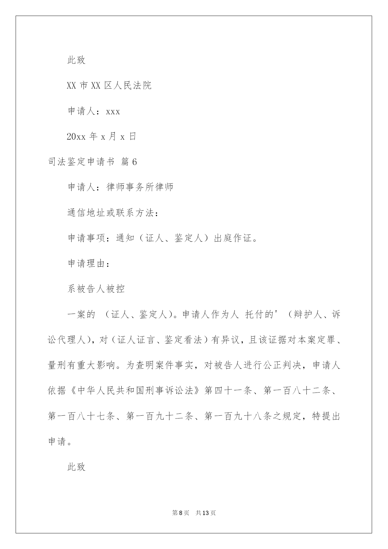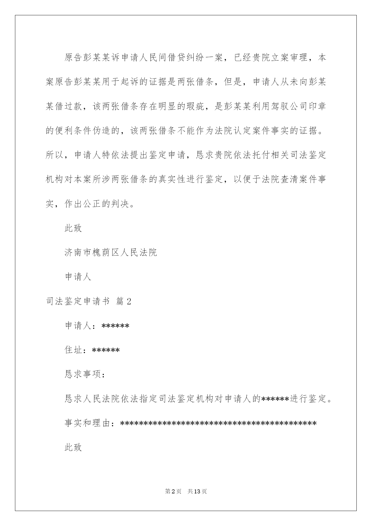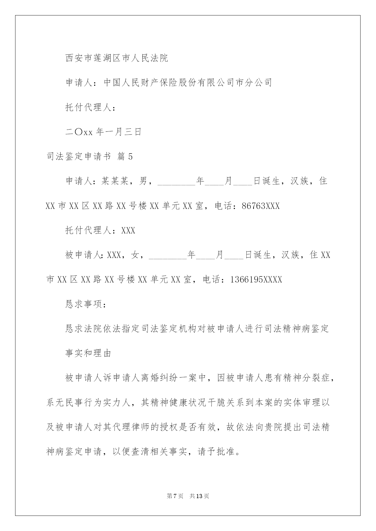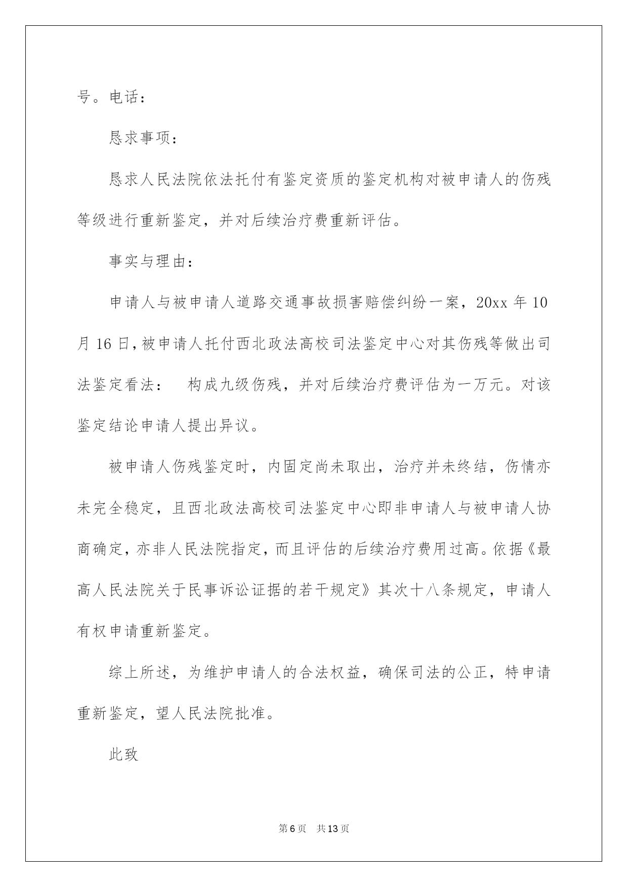 第PAGE\*Arabic\*MERGEFORMAT13页共NUMPAGES\*Arabic\*MERGEFORMAT13页第PAGE\*MERGEFORMAT13页共NUMPAGES\*MERGEFORMAT13页第PAGE\*MERGEFORMAT13页共NUMPAGES\*MERGEFORMAT13页第PAGE\*MERGEFORMAT13页共NUMPAGES\*MERGEFORMAT13页第PAGE\*MERGEFORMAT13页共NUMPAGES\*MERGEFORMAT13页第PAGE\*MERGEFORMAT13页共NUMPAGES\*MERGEFORMAT13页第PAGE\*MERGEFORMAT13页共NUMPAGES\*MERGEFORMAT13页第PAGE\*MERGEFORMAT13页共NUMPAGES\*MERGEFORMAT13页第PAGE\*MERGEFORMAT13页共NUMPAGES\*MERGEFORMAT13页第PAGE\*MERGEFORMAT13页共NUMPAGES\*MERGEFORMAT13页第PAGE\*MERGEFORMAT13页共NUMPAGES\*MERGEFORMAT13页2022司法鉴定申请书司法鉴定申请书汇总十篇在人们物质精神需求不断增长的今日,许多事项都须要运用申请书,不同的运用场景有不同的申请书。为了让您不再为写申请书头疼,以下是我帮大家整理的司法鉴定申请书10篇,仅供参考,欢迎大家阅读。司法鉴定申请书篇1申请人:某某省某某市第十建筑工程有限公司济南分公司负责人:何某某,职务:经理地址:济南市经十西路宋园新区申请事项恳求法院依法托付相关司法鉴定机构,依法对本案所涉两张借条的真伪进行鉴定;依法对两张借条上公章、私人章的加盖时间进行鉴定;依法对两张借条打印文字的时间及与加盖印章的时间先后依次进行鉴定。申请理由原告彭某某诉申请人民间借贷纠纷一案,已经贵院立案审理,本案原告彭某某用于起诉的证据是两张借条,但是,申请人从未向彭某某借过款,该两张借条存在明显的瑕疵,是彭某某利用驾驭公司印章的便利条件伪造的,该两张借条不能作为法院认定案件事实的证据。所以,申请人特依法提出鉴定申请,恳求贵院依法托付相关司法鉴定机构对本案所涉两张借条的真实性进行鉴定,以便于法院查清案件事实,作出公正的判决。此致济南市槐荫区人民法院申请人司法鉴定申请书篇2申请人:******住址:******恳求事项:恳求人民法院依法指定司法鉴定机构对申请人的******进行鉴定。事实和理由:******************************************此致******人民法院申请人:**********年****月****日司法鉴定申请书篇3申请人:张三,男,1958年4月8日诞生,汉族,农夫,住址:xx省xx市灞桥区XX村。托付代理人:xx,xx仁和万国律师事务所律师。申请事项:依法申请xx市公安局分局重新托付鉴定机构对申请人张三损伤程度进行鉴定。事实与理由:xx市公安局分局内设有法医鉴定机构,申请人认为应当考虑先由公安分局内设的法医鉴定机构对申请人进行损伤程度鉴定。假如鉴定事项属于困难疑难鉴定事项或者有其他特别状况,才有必要考虑对外托付。申请人的伤情并非困难疑难问题,不须要对外托付鉴定。假如确有必要对外托付xx市公安局分局也应当托付具有良好声誉的权威鉴定机构来鉴定,而xx司法鉴定中心并不具有胜任的资格。申请人接受鉴定事后得知,xx司法鉴定中心并未入选xx市中级人民法院法医学、文检鉴定机构入册机构名册内,该鉴定机构无论在声誉还是在鉴定水平的权威性方面都是不入流的鉴定机构,其不正规的做事风格一度受到业界诟病,其权威性并未得到司法机关、保险公司、律师事务所、受害人等广泛认可。申请人认为鉴定涉及刑事责任追究,xx市公安局灞桥分局托付xx司法鉴定中心对鉴定申请人损伤程度鉴定考虑不周,应重新托付鉴定机构鉴定。xx司法鉴定中心向申请人收取司法鉴定费用1000元整,远远超过法律规定的费用标准。依据《司法鉴定收费管理方法》的相关规定,损伤程度鉴定,300/700,只涉及体表损伤程度鉴定的,每例300元。含活体检验、活体照相,不含医学协助检查费用。xx司法鉴定中心向申请人超标准收取1000元整,属于违法违规行为,这种行为绝不能姑息,xx市公安分局应另行托付正规合法的鉴定机构重新鉴定。xx司法鉴定中心做出的鉴定看法不客观、不全面、不合法,不公正,申请人不予认可。首先,鉴定看法认为只构成稍微伤,与事实不符,申请人原始病历及检查资料明确显示申请人肋骨骨折两处