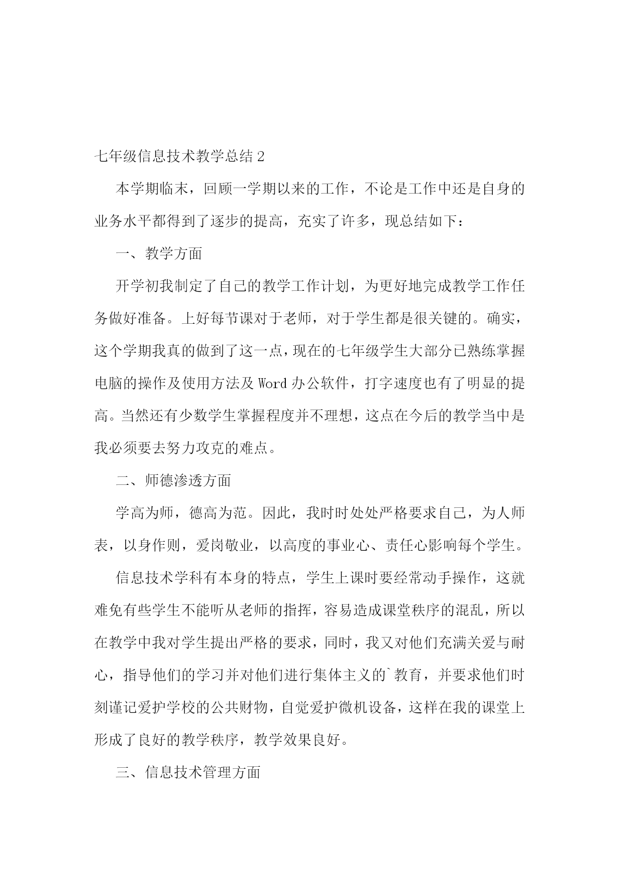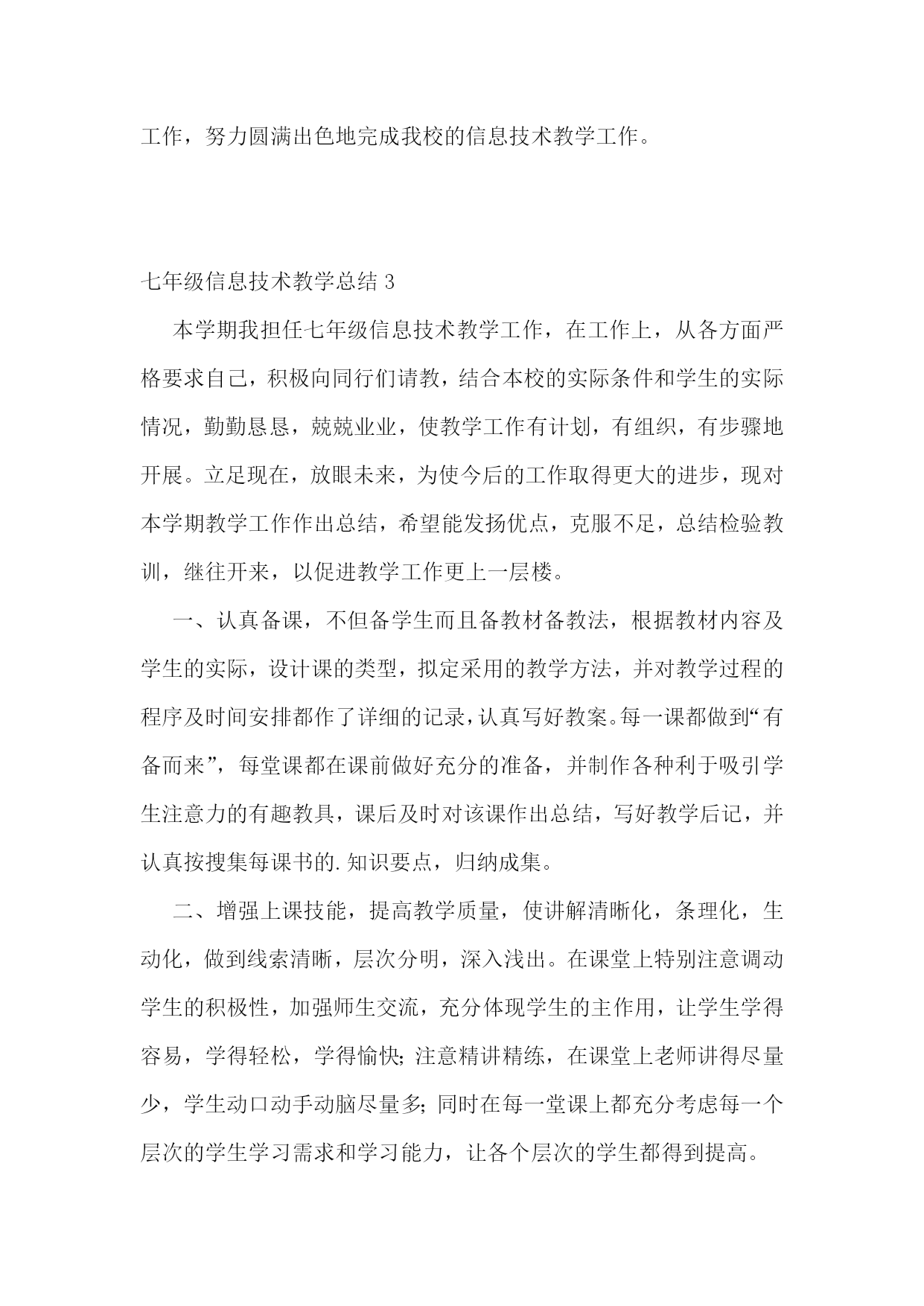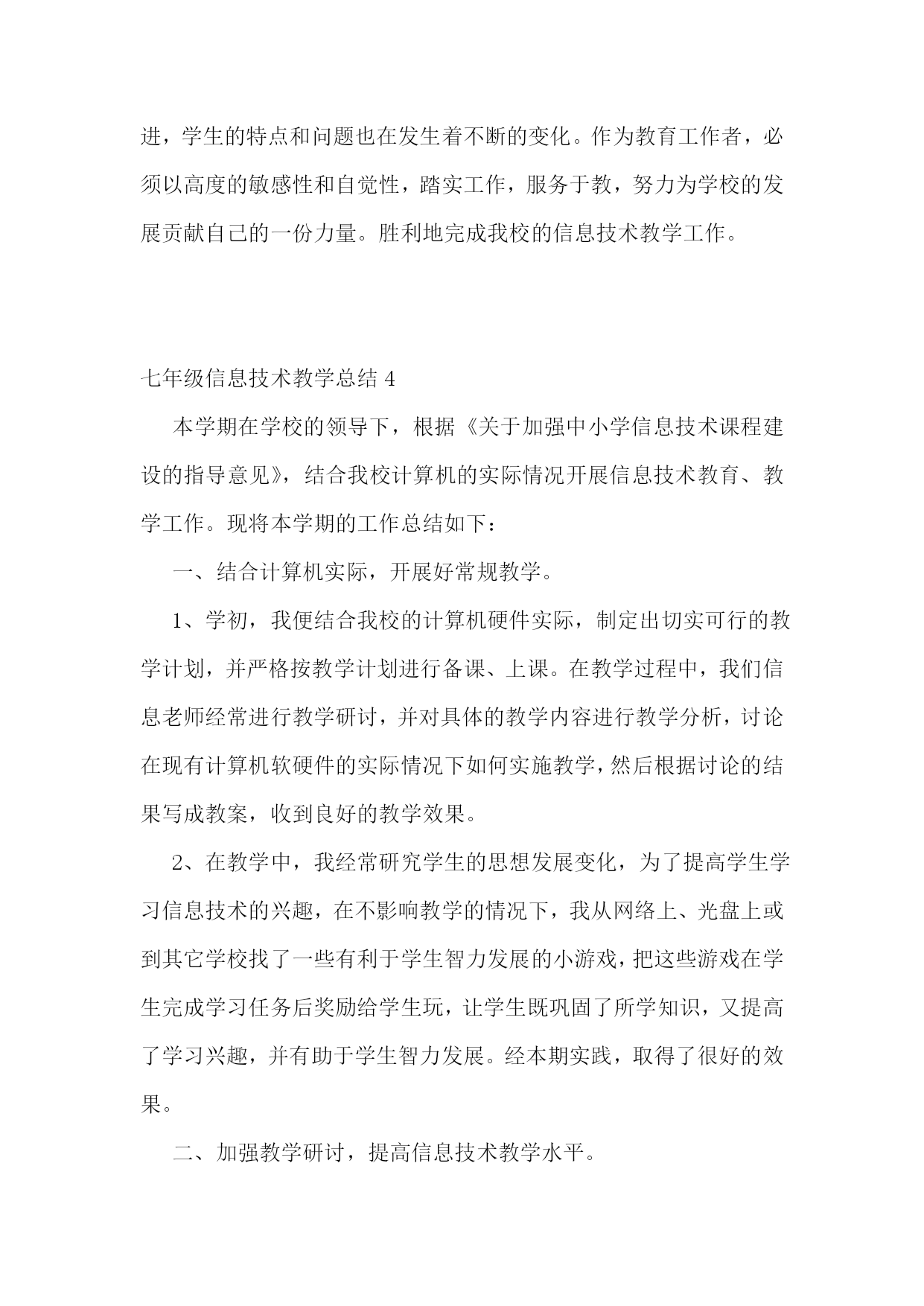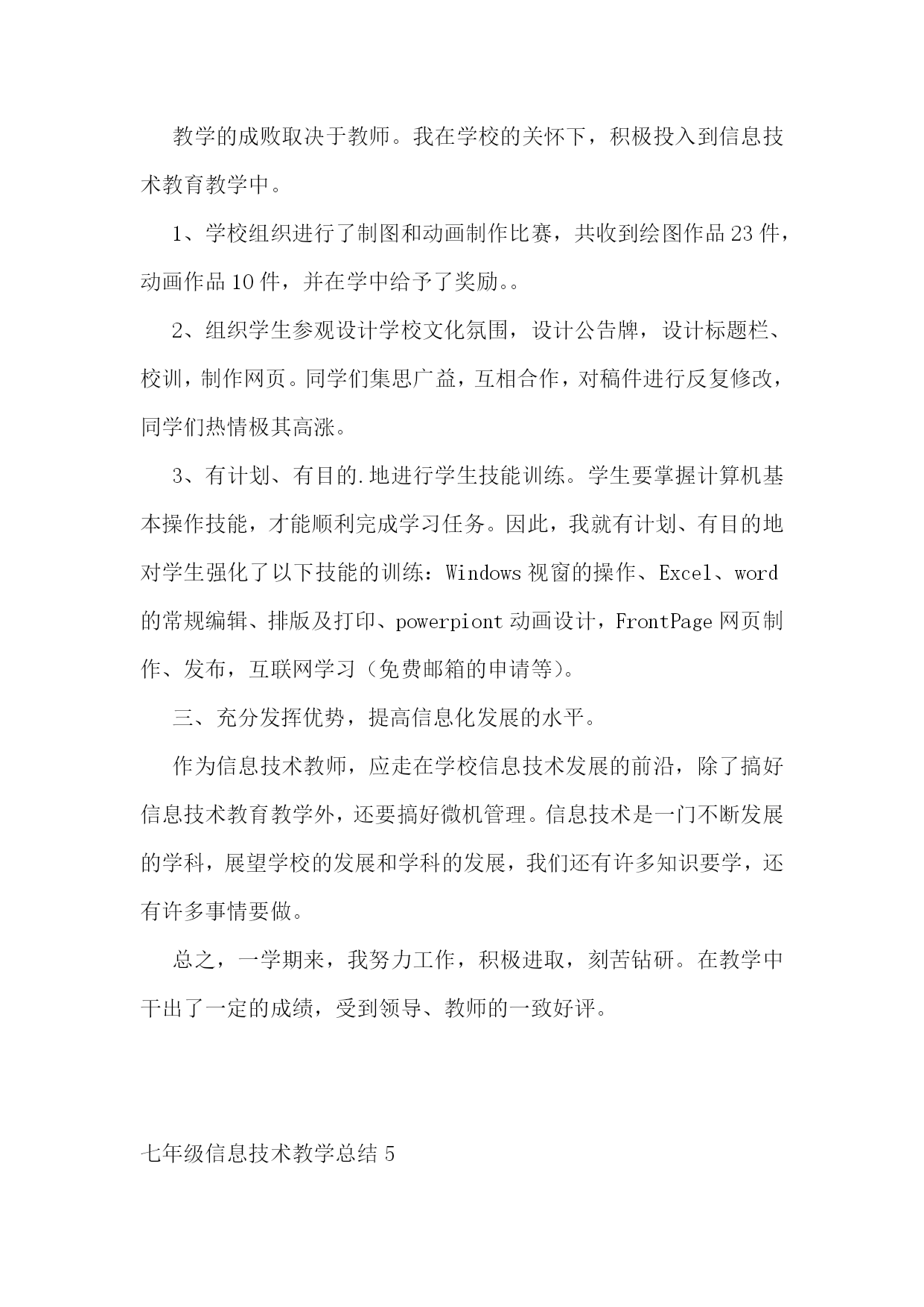 七年级信息技术教学总结七年级信息技术教学总结1本学期即将结束,回顾这一学期,我所从事的信息技术教学工作,基本上来说是比较顺利地完成任务。不论是工作中还是自身业务水平都得到了逐步提高,充实了许多,也得到了许多,现总结如下:一、思想方面在这学期里,我从思想上,利用师德师风教育活动端正自己;从行动上学电脑技术,学教学技能等;在生活上注意形象,为人师表。一学期来,我积极参加政治学习,努力提高自身的思想觉悟,服从学校的工作安排。二、教学方面根据开学初制定的教学工作计划,认真备好课,上好课,教学中对法制教育的渗透做到恰当地选择时机、选择内容、有机渗透,使学生在法制教育的渗透过程中获得相应的法制教育知识。三、师德渗透在工作中我能按照《中小学教师职业道德规范》严格要求,为人师表,严格执行师德规范,有高度事业心、责任心、爱岗敬业,重视对每个学生全面素质和良好个性培养。指导他们学习并对他们进行集体主义教育,并要求他们时刻谨记爱护学校公共财物,自觉爱护微机设备,在我课堂上形成了良好教学秩序,也是保障良好教学效果前提。四、自身业务水平的提高信息技术是一门特殊的课程,它不同于传统的课程,它的更新速度快得实在让人不敢怠慢,只要你有稍微的不留神,你绝对被抛得远远的,而且你永远无法追赶上它的脚步,所以对于我来说,不断地接受新知识,不断地在日常的设备维护中积累经验是十分重要的。因此,不论是看电脑杂志,还是在互联网上查阅资料,我都非常认真,更甚者,我会不断地去接触一些新鲜的东西或软件,在使用的过程中掌握它们的操作方法,使用技巧。这对于平时的教学都是很有帮助的.,而且对自己业务水平的提高也是非常有好处的。今后,我还将一如既往的学习各种理论知识,增加实践经验,努力在业务水平上能不断进步,不断更新。信息技术作为一门重要的技术,已经越来越多的人们所使用。当今及未来社会,掌握信息技术是对人的一种基本要求,人们都知道不懂得信息技术的人必将被现代社会所淘汰。信息技术课,不仅仅是让学生学会几种操作,更重要的是要提高学生的息素养。因此我在教育教学方面积极加强教学理论素养,努力搞好教学工作。这学期的教学工作中,我围绕努力培养学生信息素养这个中心目标,着重抓了提高学生获取、处理信息能力的工作。一份春华,一份秋实,在教书育人的道路上我付出的是汗水和泪水,然而我收获的却是那一份份充实,那沉甸甸的情感。我用我的心去教诲我的学生,我用我的情去培育我的学生,我无愧于我心,我无悔于我的事业。让我把一生矢志教育的心愿化为热爱学生的一团火,将自己最珍贵的爱奉献给孩子们,相信今日含苞欲放的花蕾,明日一定能盛开绚丽的花朵。七年级信息技术教学总结2本学期临末,回顾一学期以来的工作,不论是工作中还是自身的业务水平都得到了逐步的提高,充实了许多,现总结如下:一、教学方面开学初我制定了自己的教学工作计划,为更好地完成教学工作任务做好准备。上好每节课对于老师,对于学生都是很关键的。确实,这个学期我真的做到了这一点,现在的七年级学生大部分已熟练掌握电脑的操作及使用方法及Word办公软件,打字速度也有了明显的提高。当然还有少数学生掌握程度并不理想,这点在今后的教学当中是我必须要去努力攻克的难点。二、师德渗透方面学高为师,德高为范。因此,我时时处处严格要求自己,为人师表,以身作则,爱岗敬业,以高度的事业心、责任心影响每个学生。信息技术学科有本身的特点,学生上课时要经常动手操作,这就难免有些学生不能听从老师的指挥,容易造成课堂秩序的混乱,所以在教学中我对学生提出严格的要求,同时,我又对他们充满关爱与耐心,指导他们的学习并对他们进行集体主义的`教育,并要求他们时刻谨记爱护学校的公共财物,自觉爱护微机设备,这样在我的课堂上形成了良好的教学秩序,教学效果良好。三、信息技术管理方面我既是信息技术教师,还兼职学校计算机教室的管理员。不论是电脑的常规维护还是领导安排的临时性工作,我都认真、高效地完成。能确保设备能正常完好的运行对整个学校来说显得尤为重要,而对于这些设备的使用、维护,我都能够了解和熟练掌握,为以后学校使用远程教育资源、学科间的相互渗透打下坚实的基础。四、加强学习,提高业务水平在教学之余,我也注重自身发展进步。除了听课、参加教研组教研活动外,我还注意到要自学,积极学习各种理论,以充实自己,以便在工作中以坚实的理论作为指导,更好地进行教育教学。加强了自身的业务水平和道德修养,经常阅读一些关于教师职业道德的书籍,在网上阅读一些关于新课程培训和信息技术课教学等方面的文章及心得体会。我还利用业余时间认真学习网络知识,学习制作课件、网站,为学校的教育教学服务。五、今后努力方向1、要更新教学思路,从教材实际出发,通过多种形式的活动和方法,使课内课外有机结合,让学生学以致用。2、