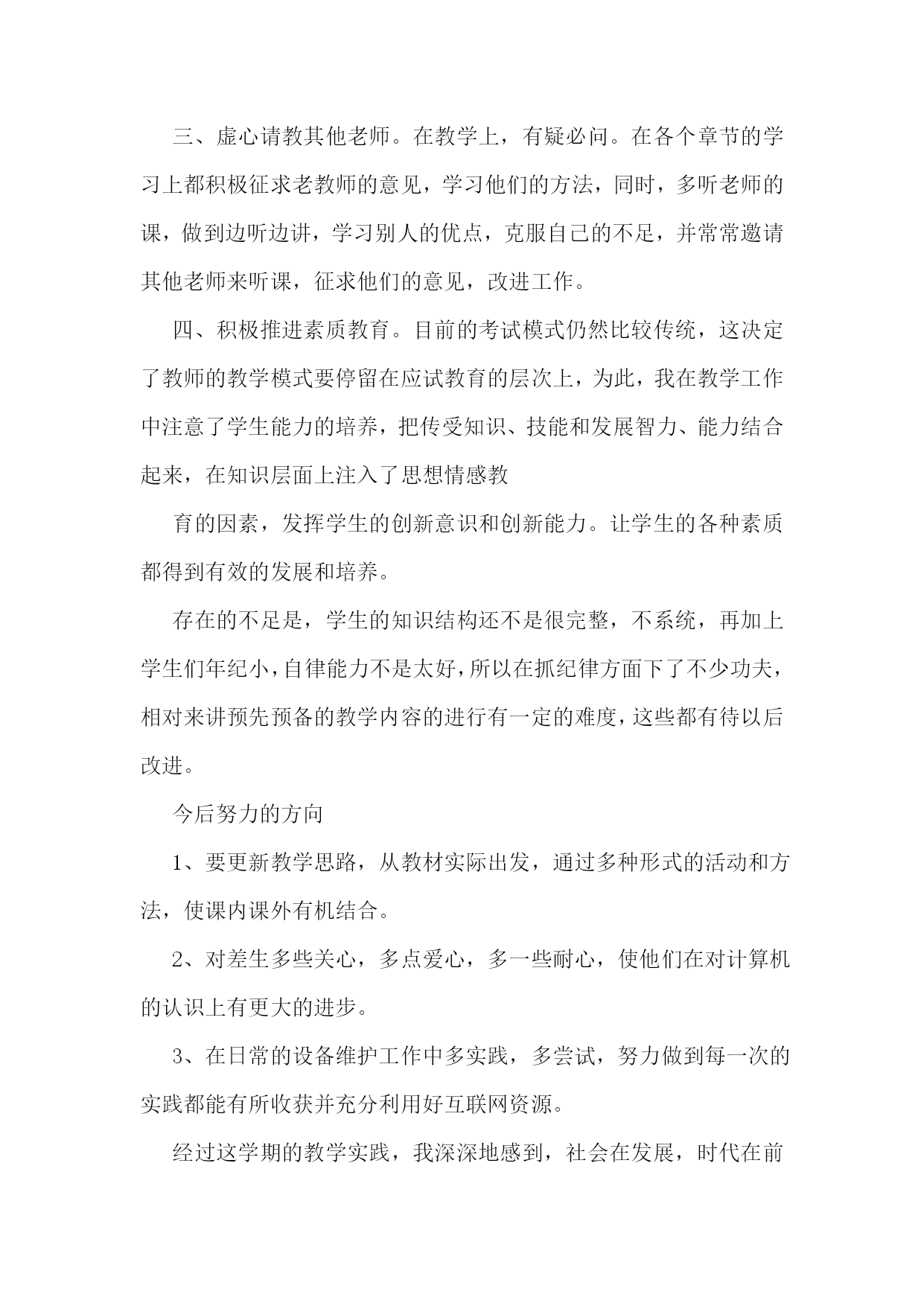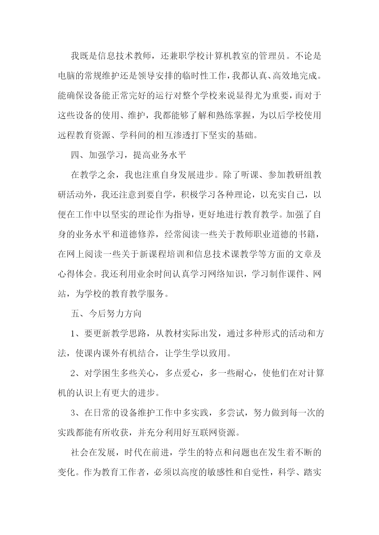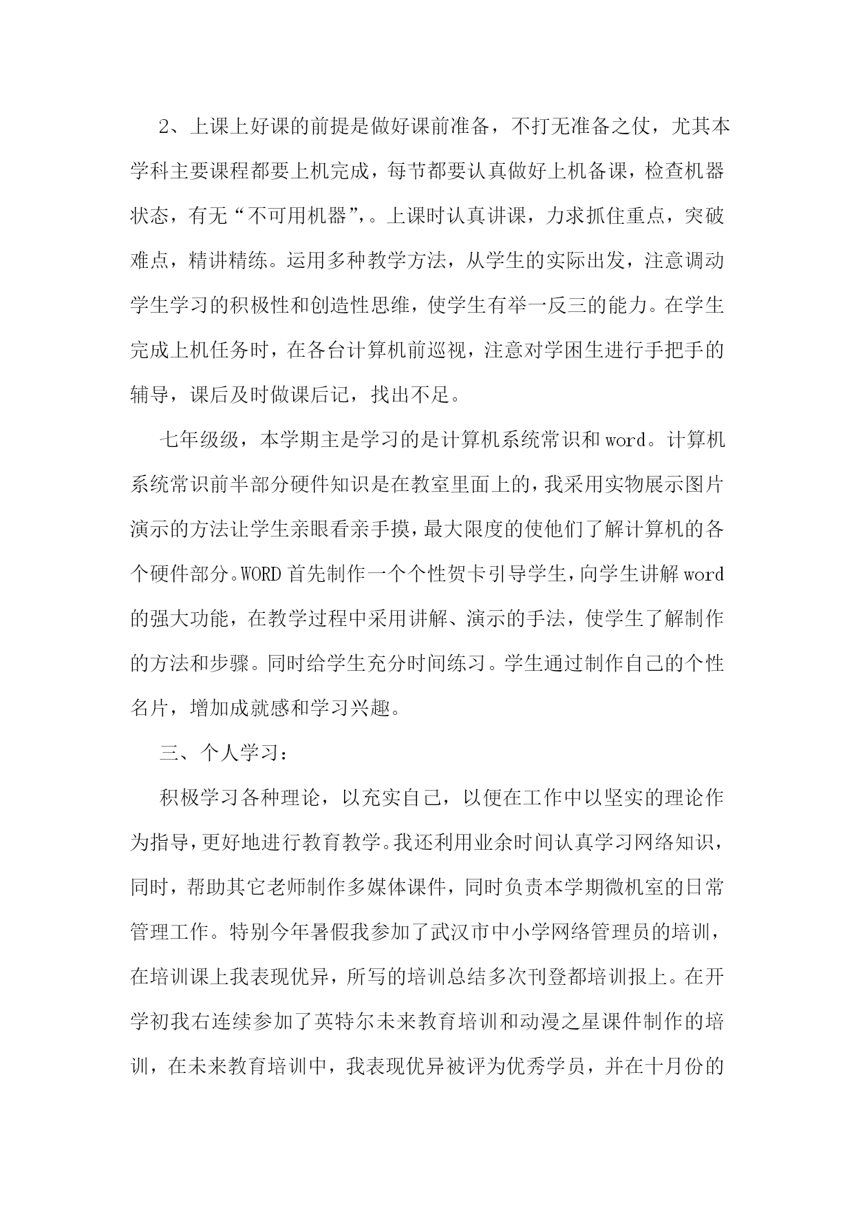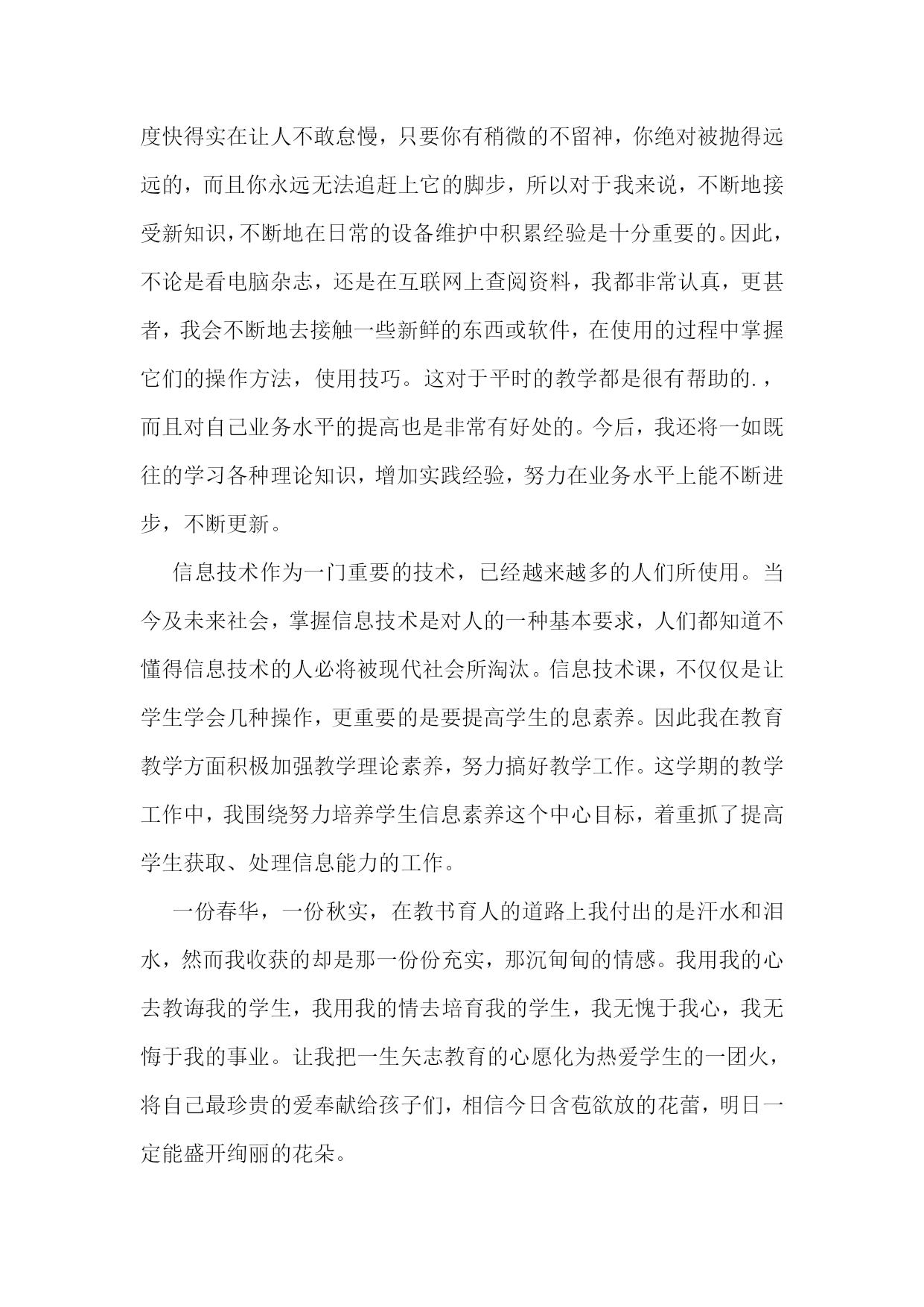 七年级信息技术教学总结七年级信息技术教学总结1本学期即将结束,回顾这一学期,我所从事的信息技术教学工作,基本上来说是比较顺利地完成任务。不论是工作中还是自身业务水平都得到了逐步提高,充实了许多,也得到了许多,现总结如下:一、思想方面在这学期里,我从思想上,利用师德师风教育活动端正自己;从行动上学电脑技术,学教学技能等;在生活上注意形象,为人师表。一学期来,我积极参加政治学习,努力提高自身的思想觉悟,服从学校的工作安排。二、教学方面根据开学初制定的教学工作计划,认真备好课,上好课,教学中对法制教育的渗透做到恰当地选择时机、选择内容、有机渗透,使学生在法制教育的渗透过程中获得相应的法制教育知识。三、师德渗透在工作中我能按照《中小学教师职业道德规范》严格要求,为人师表,严格执行师德规范,有高度事业心、责任心、爱岗敬业,重视对每个学生全面素质和良好个性培养。指导他们学习并对他们进行集体主义教育,并要求他们时刻谨记爱护学校公共财物,自觉爱护微机设备,在我课堂上形成了良好教学秩序,也是保障良好教学效果前提。四、自身业务水平的提高信息技术是一门特殊的课程,它不同于传统的课程,它的更新速度快得实在让人不敢怠慢,只要你有稍微的不留神,你绝对被抛得远远的,而且你永远无法追赶上它的脚步,所以对于我来说,不断地接受新知识,不断地在日常的设备维护中积累经验是十分重要的。因此,不论是看电脑杂志,还是在互联网上查阅资料,我都非常认真,更甚者,我会不断地去接触一些新鲜的东西或软件,在使用的过程中掌握它们的操作方法,使用技巧。这对于平时的教学都是很有帮助的.,而且对自己业务水平的提高也是非常有好处的。今后,我还将一如既往的学习各种理论知识,增加实践经验,努力在业务水平上能不断进步,不断更新。信息技术作为一门重要的技术,已经越来越多的人们所使用。当今及未来社会,掌握信息技术是对人的一种基本要求,人们都知道不懂得信息技术的人必将被现代社会所淘汰。信息技术课,不仅仅是让学生学会几种操作,更重要的是要提高学生的息素养。因此我在教育教学方面积极加强教学理论素养,努力搞好教学工作。这学期的教学工作中,我围绕努力培养学生信息素养这个中心目标,着重抓了提高学生获取、处理信息能力的工作。一份春华,一份秋实,在教书育人的道路上我付出的是汗水和泪水,然而我收获的却是那一份份充实,那沉甸甸的情感。我用我的心去教诲我的学生,我用我的情去培育我的学生,我无愧于我心,我无悔于我的事业。让我把一生矢志教育的心愿化为热爱学生的一团火,将自己最珍贵的爱奉献给孩子们,相信今日含苞欲放的花蕾,明日一定能盛开绚丽的花朵。七年级信息技术教学总结2本学期临末,回顾一学期以来的工作,不论是工作中还是自身的业务水平都得到了逐步的提高,充实了许多,现总结如下:一、教学方面开学初我制定了自己的教学工作计划,为更好地完成教学工作任务做好准备。上好每节课对于老师,对于学生都是很关键的。确实,这个学期我真的做到了这一点,现在的七年级学生大部分已熟练掌握电脑的操作及使用方法及Word办公软件,打字速度也有了明显的提高。当然还有少数学生掌握程度并不理想,这点在今后的教学当中是我必须要去努力攻克的难点。二、师德渗透方面学高为师,德高为范。因此,我时时处处严格要求自己,为人师表,以身作则,爱岗敬业,以高度的事业心、责任心影响每个学生。信息技术学科有本身的特点,学生上课时要经常动手操作,这就难免有些学生不能听从老师的指挥,容易造成课堂秩序的混乱,所以在教学中我对学生提出严格的要求,同时,我又对他们充满关爱与耐心,指导他们的学习并对他们进行集体主义的`教育,并要求他们时刻谨记爱护学校的公共财物,自觉爱护微机设备,这样在我的课堂上形成了良好的教学秩序,教学效果良好。三、信息技术管理方面我既是信息技术教师,还兼职学校计算机教室的管理员。不论是电脑的常规维护还是领导安排的临时性工作,我都认真、高效地完成。能确保设备能正常完好的运行对整个学校来说显得尤为重要,而对于这些设备的使用、维护,我都能够了解和熟练掌握,为以后学校使用远程教育资源、学科间的相互渗透打下坚实的基础。四、加强学习,提高业务水平在教学之余,我也注重自身发展进步。除了听课、参加教研组教研活动外,我还注意到要自学,积极学习各种理论,以充实自己,以便在工作中以坚实的理论作为指导,更好地进行教育教学。加强了自身的业务水平和道德修养,经常阅读一些关于教师职业道德的书籍,在网上阅读一些关于新课程培训和信息技术课教学等方面的文章及心得体会。我还利用业余时间认真学习网络知识,学习制作课件、网站,为学校的教育教学服务。五、今后努力方向1、要更新教学思路,从教材实际出发,通过多种形式的活动和方法,使课内课外有机结合,让学生学以致用。2、
