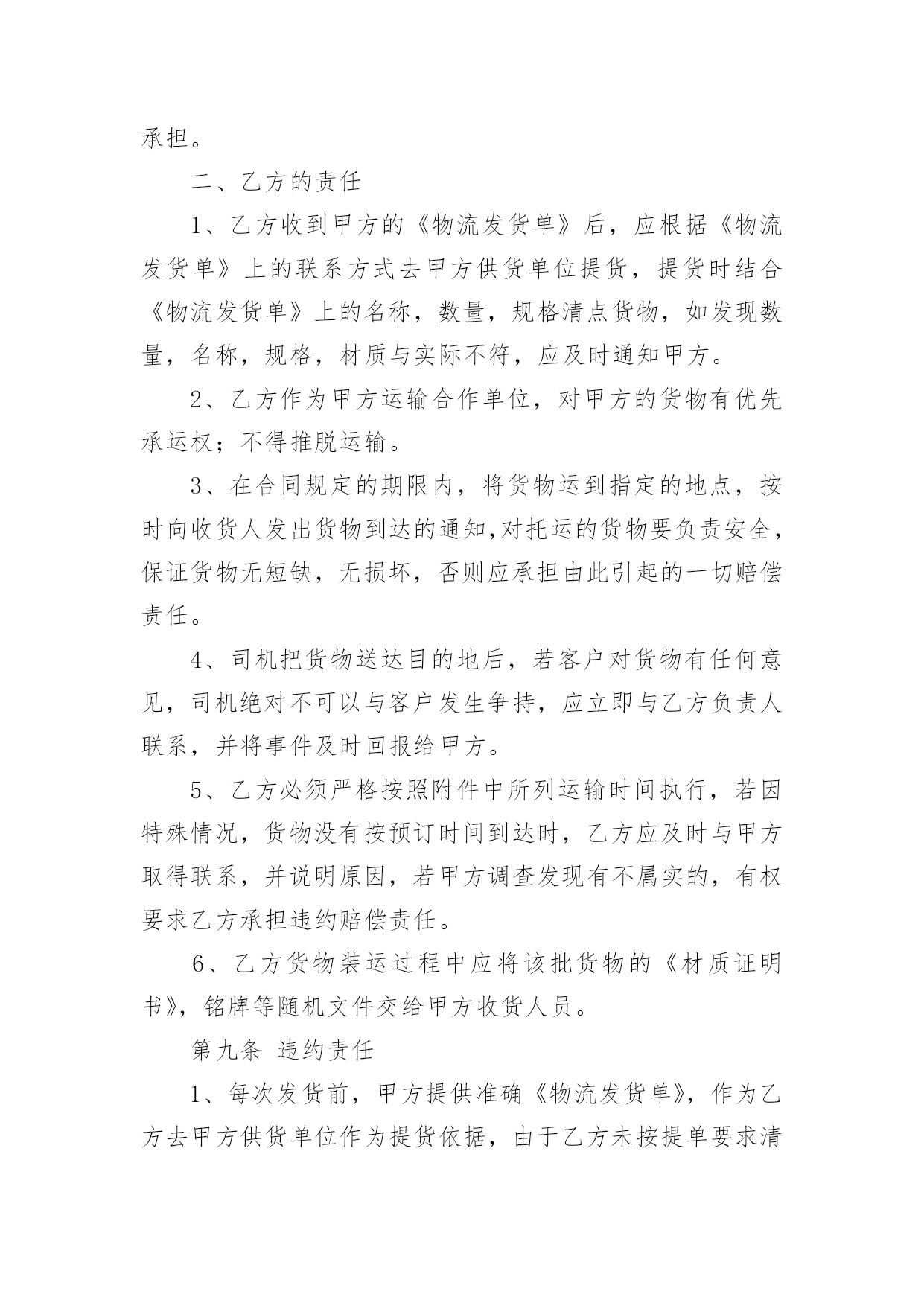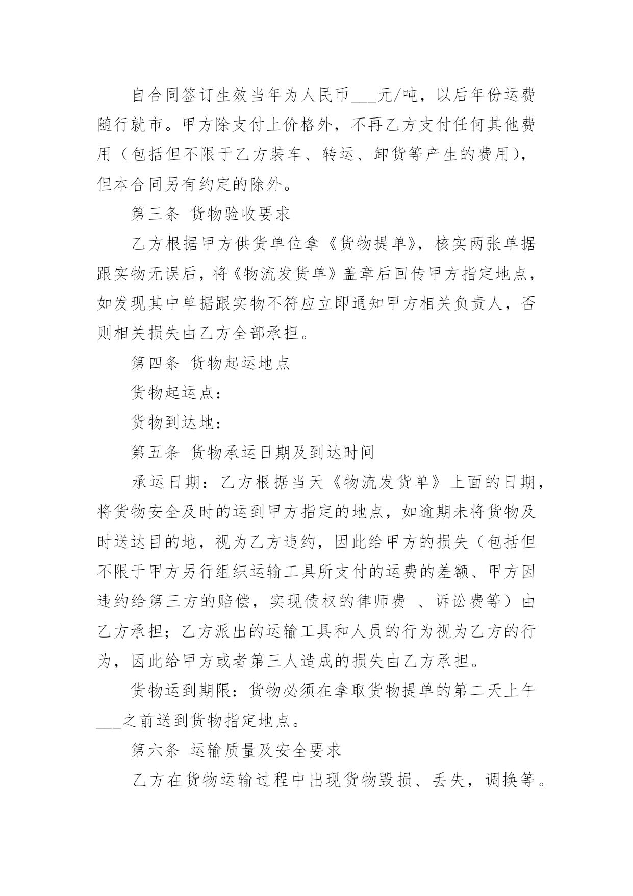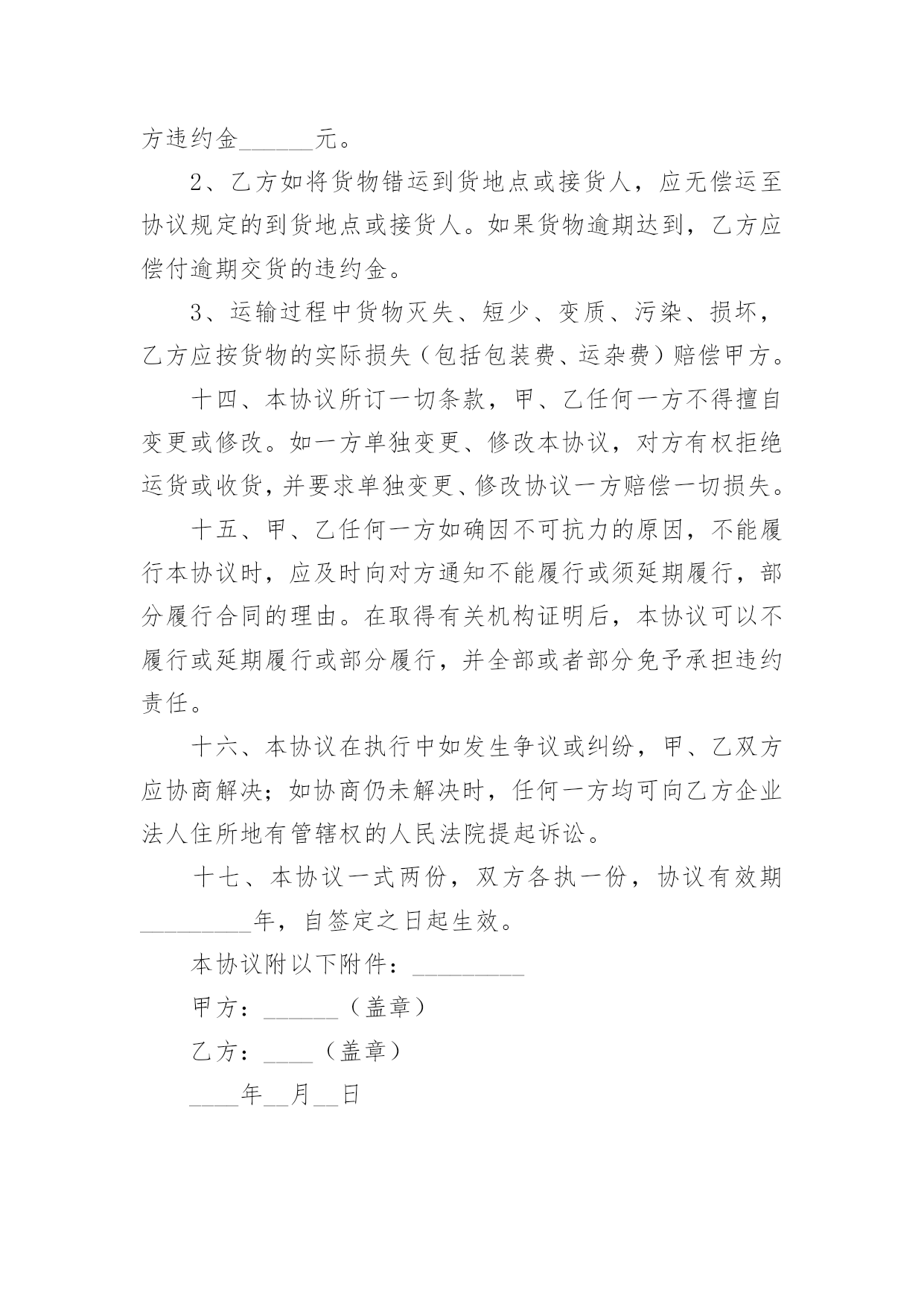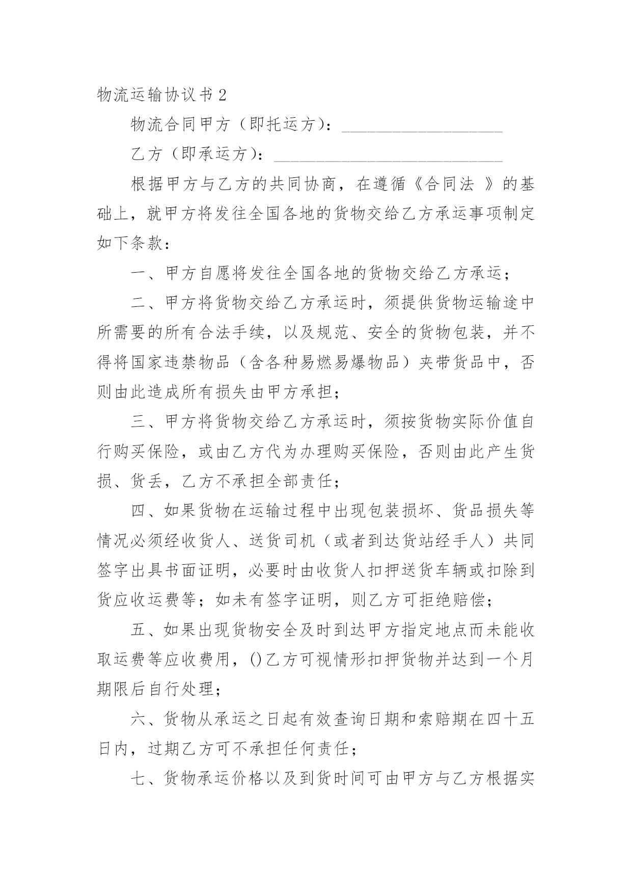 物流运输协议书在当今社会生活中,用到协议的地方越来越多,协议协调着人与人,人与事之间的关系。我敢肯定,大部分人都对拟定协议很是头疼的,下面是小编整理的物流运输协议书,希望能够帮助到大家。物流运输协议书1托运方(以下简称甲方):承运方(以下简称乙方):甲乙双方本着平等互利的原则,就甲方委托乙方承运货物有关事宜达成如下协议以供双方共同遵守执行。一、乙方必须向甲方提供有效的资质证件,主要有营业执照、道路运输证、法人机构代码证等复印件;二、在签署本合同时,乙方需向甲方交付派车保证金(人民币)_________,该押金不计利息。三、乙方车辆必须各种手续齐全,防护用品齐全,如因以上原因所造成的职能部门罚款、扣押及货物丢失、淋湿、损坏均由乙方承担责任并负责赔偿;四、货物起运地点________货物到达地点________货物承运日期________货物运到期限________五、运输质量及安全要求:装车和卸货的数量一致,货物完好,乙方签甲方出库单。六、货物装卸责任和方法:________方负责装卸。七、收货人领取货物及验收办法:按甲方出库单收货,确认货物完好。八、运输费用、结算方式:运费:________¥,计人民币________元整,付款方式为________(转帐或现金),货到目的地日期起,________日内付款。九、甲方不得自行租车,乙方按甲方需要指派车辆,如乙方不能及时派车,甲方可另行租车,如所租车租金超过双方拟定价格,超出部分由乙方负责支付(在派车保证金中扣除);十、乙方运输货物须在_________小时内安全到达甲方指定目的地;十一、超过_________立方或_________吨以上货物如在_________公里范围内,乙方需协助甲方提取且不计运费。如超过此限甲方须酌情补助费用;十二、权利义务a、甲方的权利义务1、甲方的权利:要求乙方按照合同规定的时间、地点,把货物运输到目的地。货物托运后,甲方需要变更收货人或者取消托运时,有权向乙方提出变更合同的内容或解除合同的要求。但必须在货物未运到目的地之前通知乙方,并应按有关规定付给乙方所需费用。2、甲方的义务:按约定向乙方交付运杂费。否则,乙方有权停止运输,并要求对方支付违约金。托运方对托运的货物,应按照规定的标准进行包装捆扎,遵守有关运输的规定,按照合同中规定的时间和数量交付托运货物。b、乙方的权利义务1、乙方的权利:按货物运输合同的约定,向甲方或甲方指定的收货方收取运杂费用。2、乙方的义务:在合同规定的期限内,将货物运到指定的地点,按时向指定的收货人移交托运的货物。对托运的货物要负责安全,保证货物无短缺、无损坏。如有上述问题,应承担赔偿义务。十三、违约责任a、甲方违约责任1、由于在普通货物中夹带、匿报危险货物,错报笨重货物重量等而招致吊具断裂、货物摔损、吊机倾翻、爆炸、腐蚀等事故,甲方应承担赔偿责任。2、由于货物包装缺陷产生破损,致使其它货物或运输工具、机械设备被污染腐蚀、损坏,造成人身伤亡的,甲方应承担赔偿责任。3、在甲方专用线或在港、站公用线、专用铁道自装的货物,在到站卸货时,发现货物损坏、缺少,在车辆施封完好或无异状的情况下,甲方应赔偿收货人的损失。4、罐车发运货物,因未随车附带规格质量证明或化验报告,造成收货方无法卸货时,甲方应偿付乙方卸车等存费及违约金。b、乙方违约责任1、不按合同规定的时间和要求发运的,乙方应偿付甲方违约金______元。2、乙方如将货物错运到货地点或接货人,应无偿运至协议规定的到货地点或接货人。如果货物逾期达到,乙方应偿付逾期交货的违约金。3、运输过程中货物灭失、短少、变质、污染、损坏,乙方应按货物的实际损失(包括包装费、运杂费)赔偿甲方。十四、本协议所订一切条款,甲、乙任何一方不得擅自变更或修改。如一方单独变更、修改本协议,对方有权拒绝运货或收货,并要求单独变更、修改协议一方赔偿一切损失。十五、甲、乙任何一方如确因不可抗力的原因,不能履行本协议时,应及时向对方通知不能履行或须延期履行,部分履行合同的理由。在取得有关机构证明后,本协议可以不履行或延期履行或部分履行,并全部或者部分免予承担违约责任。十六、本协议在执行中如发生争议或纠纷,甲、乙双方应协商解决;如协商仍未解决时,任何一方均可向乙方企业法人住所地有管辖权的人民法院提起诉讼。十七、本协议一式两份,双方各执一份,协议有效期_________年,自签定之日起生效。本协议附以下附件:_________甲方:______(盖章)乙方:____(盖章)____年__月__日物流运输协议书2物流合同甲方(即托运方):___________________乙方(即承运方):___________________________根据甲方与乙方的共同协商,在遵循《合同法》的基础上,就甲方将发往全国各地的